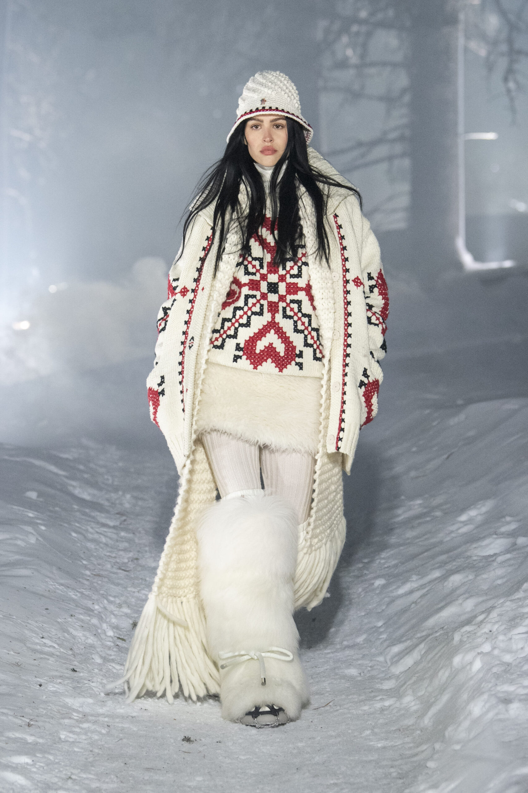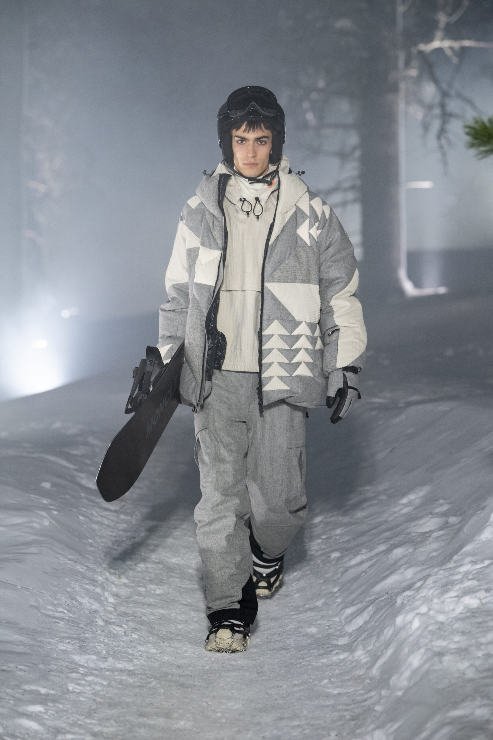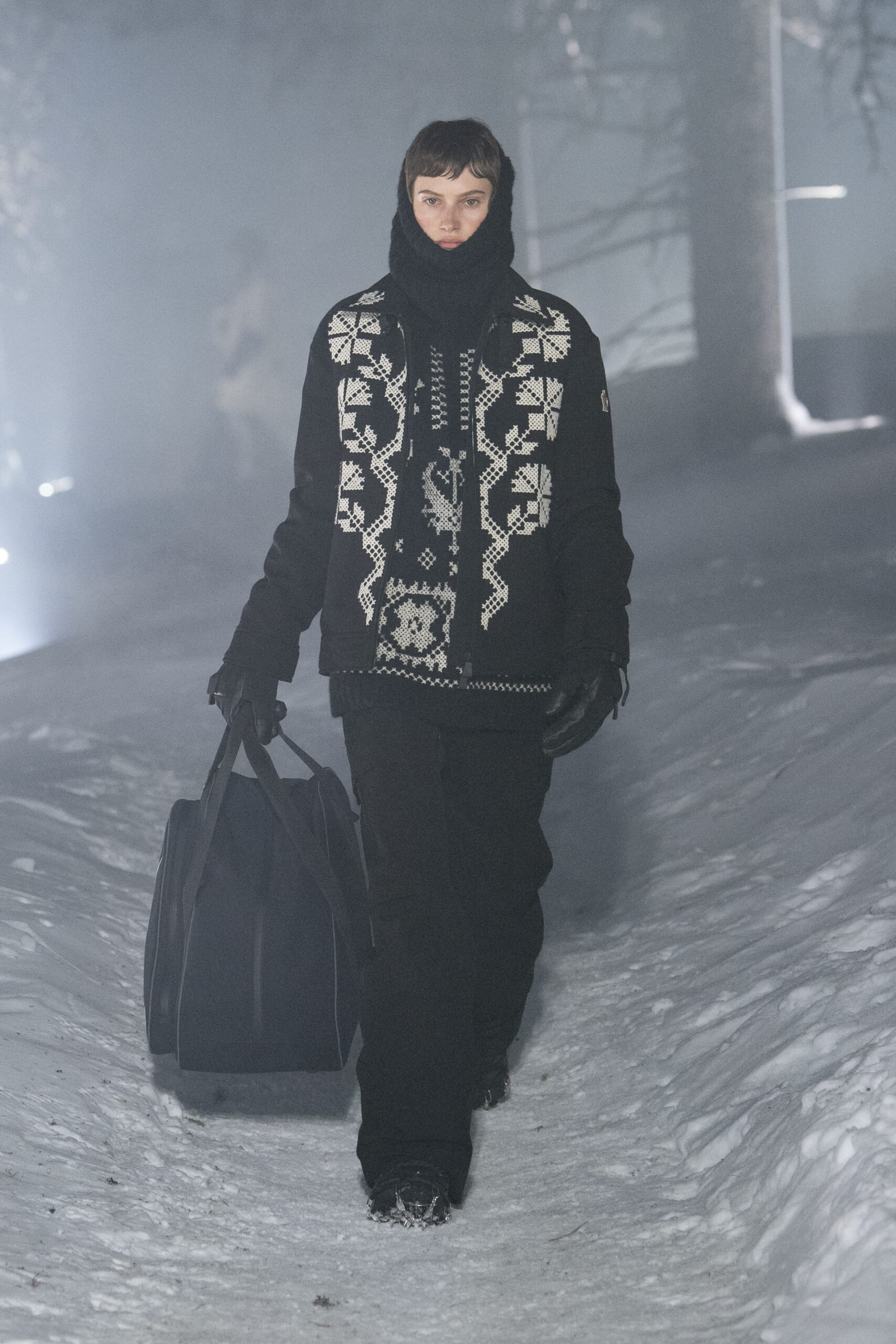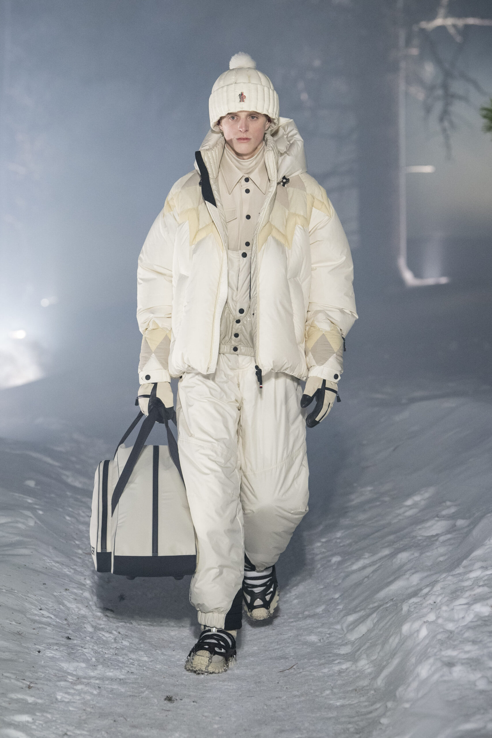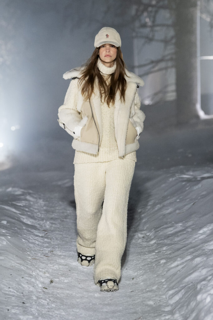 Les détails techniques, tels que le motif géométrique en intarsia rappelant le matelassage traditionnel de Moncler, le matelassage imitant le tricot Aran, et l’usage de laine vierge et d’alpaga pour plus de volume et de douceur, révèlent une sophistication dans l’artisanat et une attention méticuleuse portée à chaque pièce. La fonctionnalité est également au cœur de cette collection, avec des pièces conçues pour s’adapter à tous les aspects de la vie en montagne, assurant non seulement performance mais aussi confort et style, que ce soit sur les pistes ou lors de moments de détente après-ski.