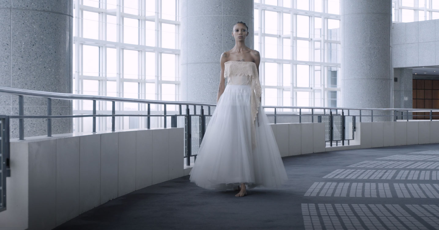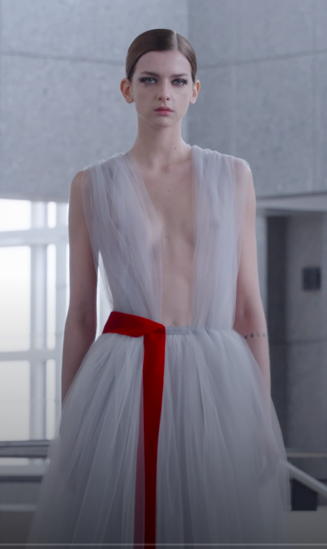 En contrepoint, un soutien-gorge brodé de miroirs se marie avec du tulle de soie organique « bois de rose », créant une silhouette légère comme une aile de papillon. Une touche de velours rouge structure la silhouette de la ballerine, offrant une réflexion sur la présence de cette couleur.