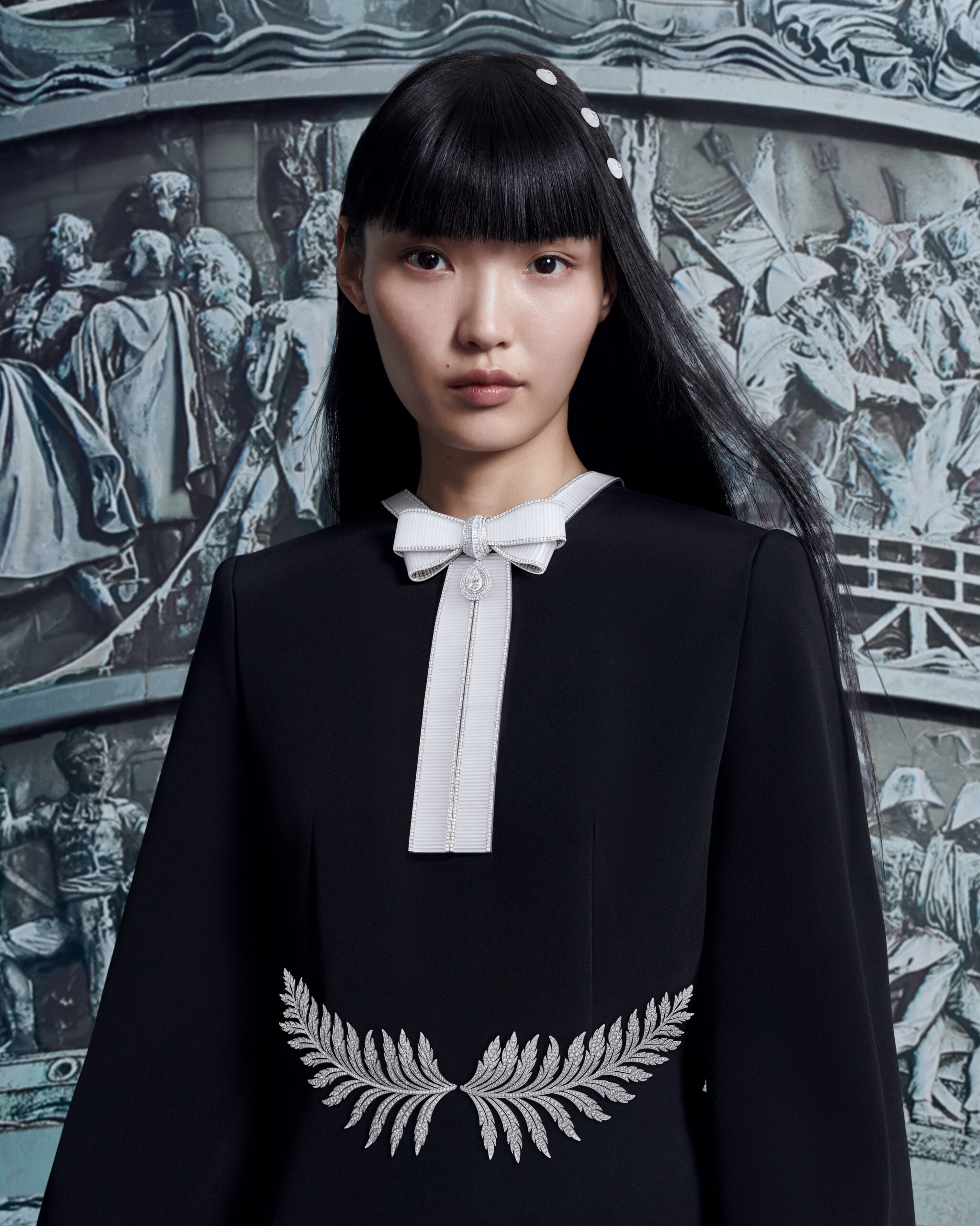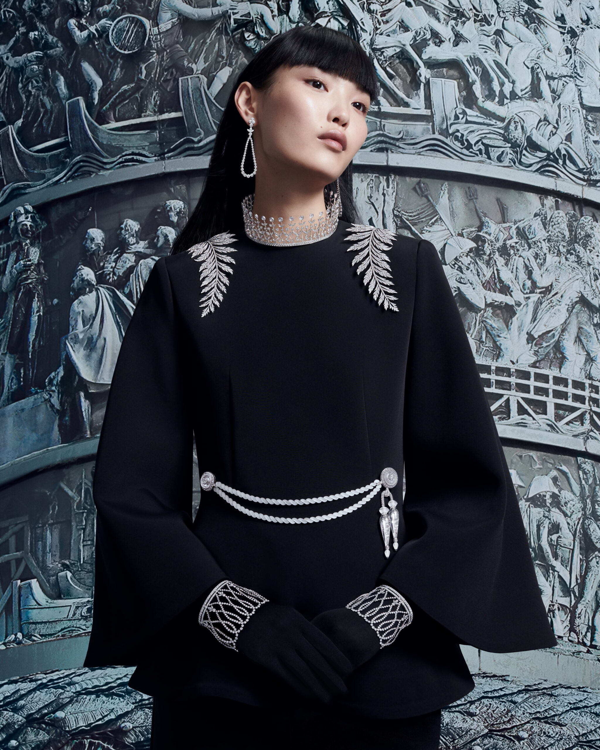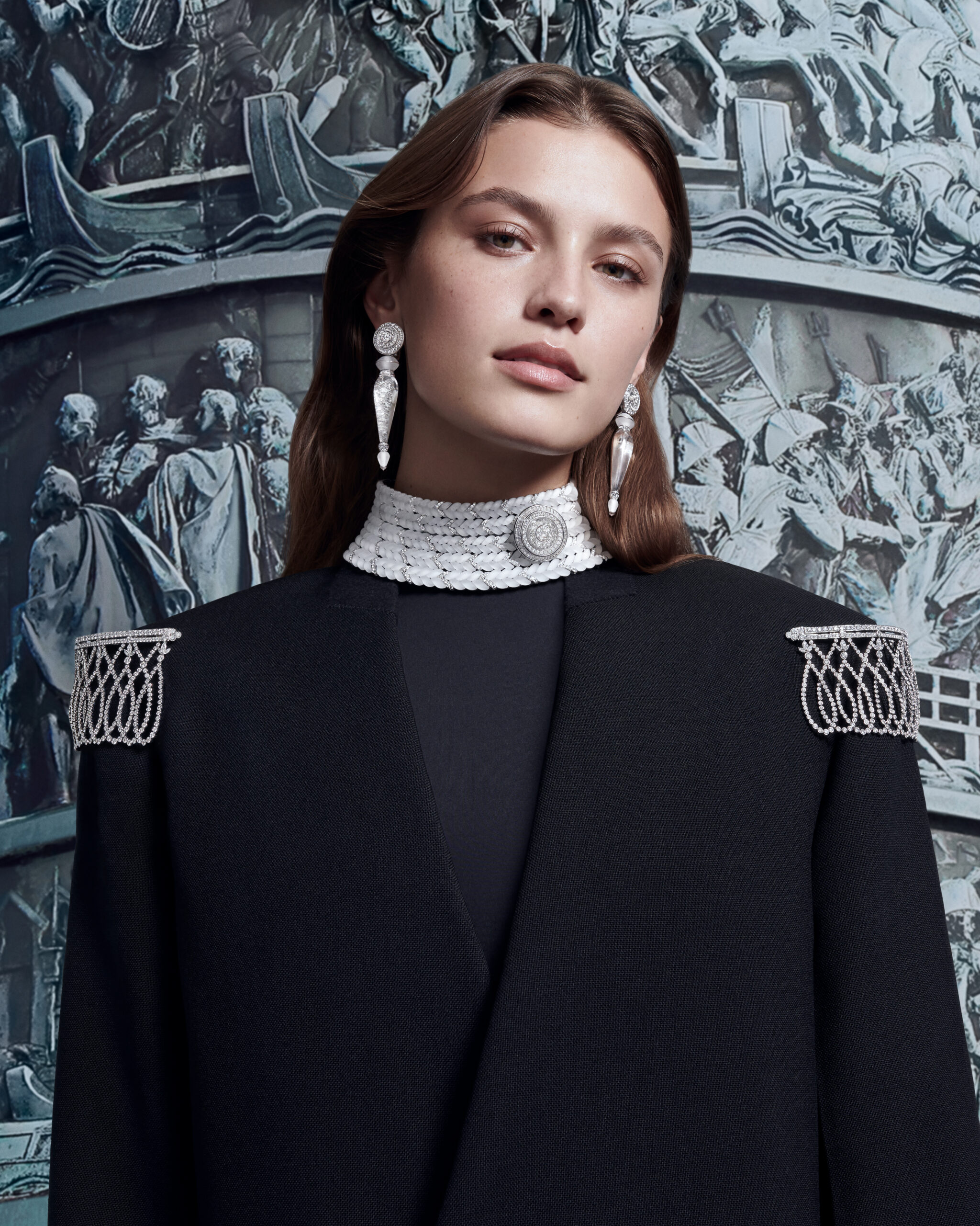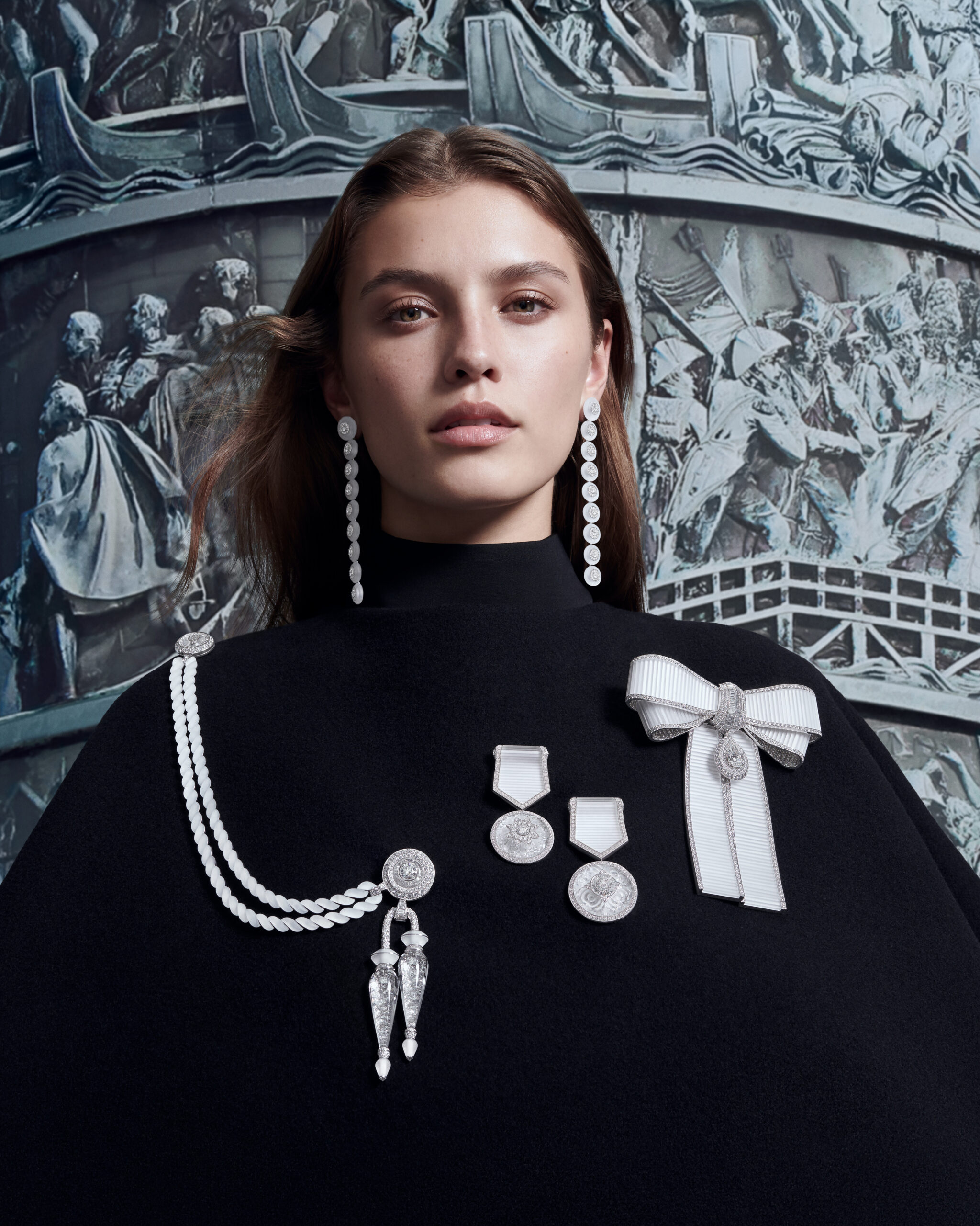 La collection se distingue par l’utilisation de médailles, boutons, broderies et aiguillettes, éléments traditionnels de l’apparat, métamorphosés ici en utilisant du cristal de roche et des diamants. Ce travail virtuose crée 24 pièces de haute joaillerie qui redéfinissent la couture, ouvrant la voie à une nouvelle interprétation du luxe.