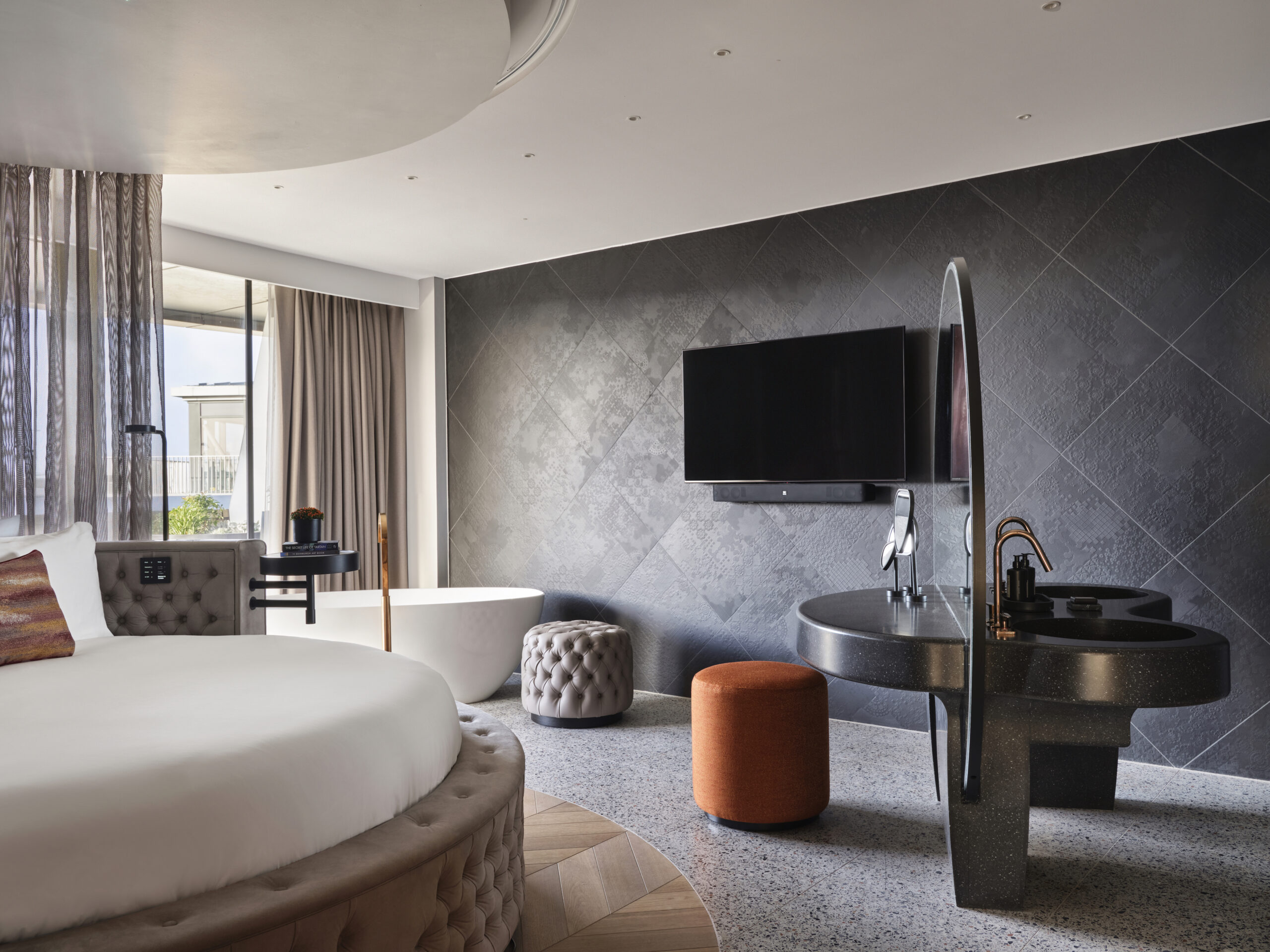 La Extreme Wow Suite de l’hôtel offre un luxe sans précédent avec son salon spacieux, sa salle à manger élégante, et une terrasse offrant une vue panoramique sur la ville. La suite est équipée d’un lit king-size rond, d’un dressing, d’une salle de bains avec baignoire et sauna privé, et d’une coiffeuse.
