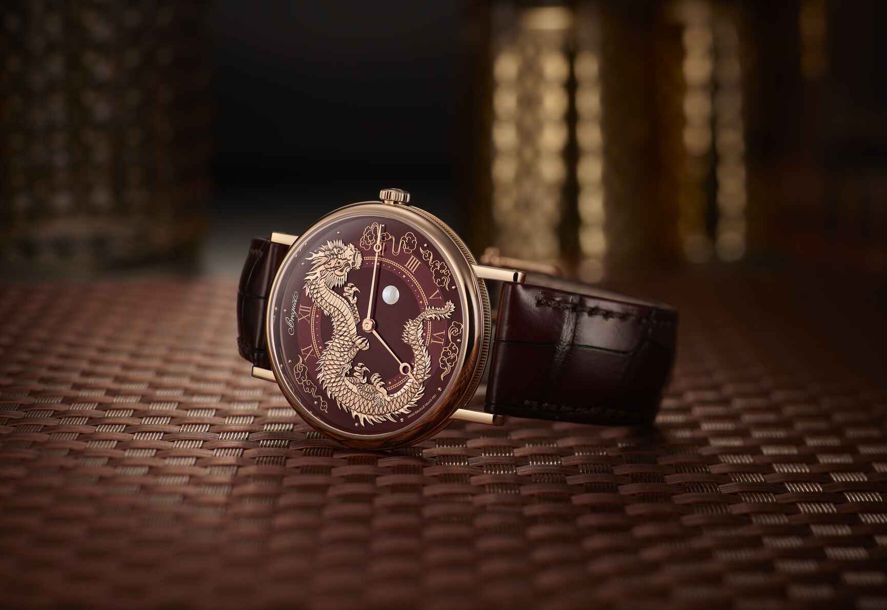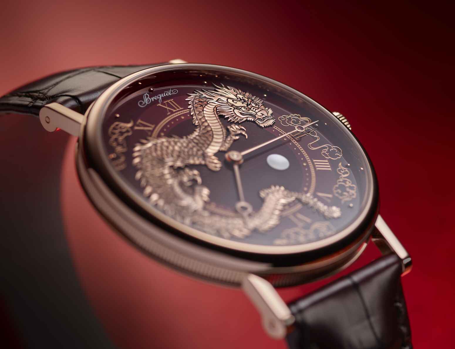 Limitée à 8 pièces, la Classique Dragon 7145 est animée par le calibre 502.3, l’un des mouvements les plus plats de Breguet. Le cadran rouge vermeil, en émail « grand feu », met en avant un dragon en or rose gravé à la main, veillant sur une perle en nacre. Les chiffres romains et les détails en or rose complètent harmonieusement l’esthétique de la montre.