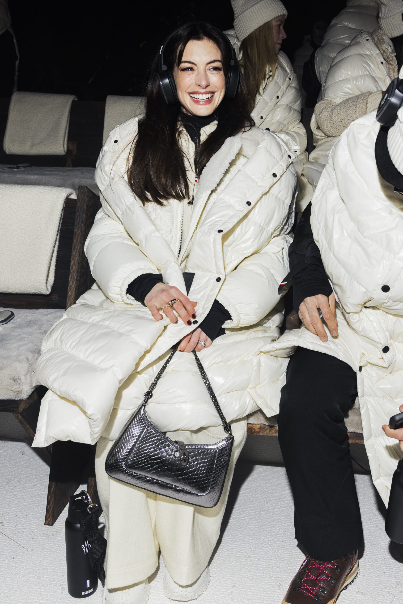 ST MORITZ, SWITZERLAND – FEBRUARY 03: Anne Hathaway attends the Moncler Grenoble Fall Winter 2024 Fashion Show on February 03, 2024 in St Moritz, Switzerland. (Photo by Daniele Venturelli/Getty Images for Moncler)