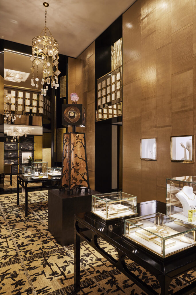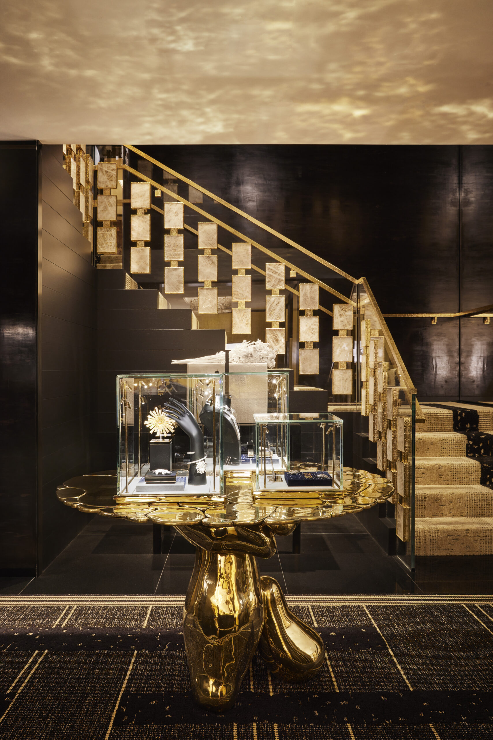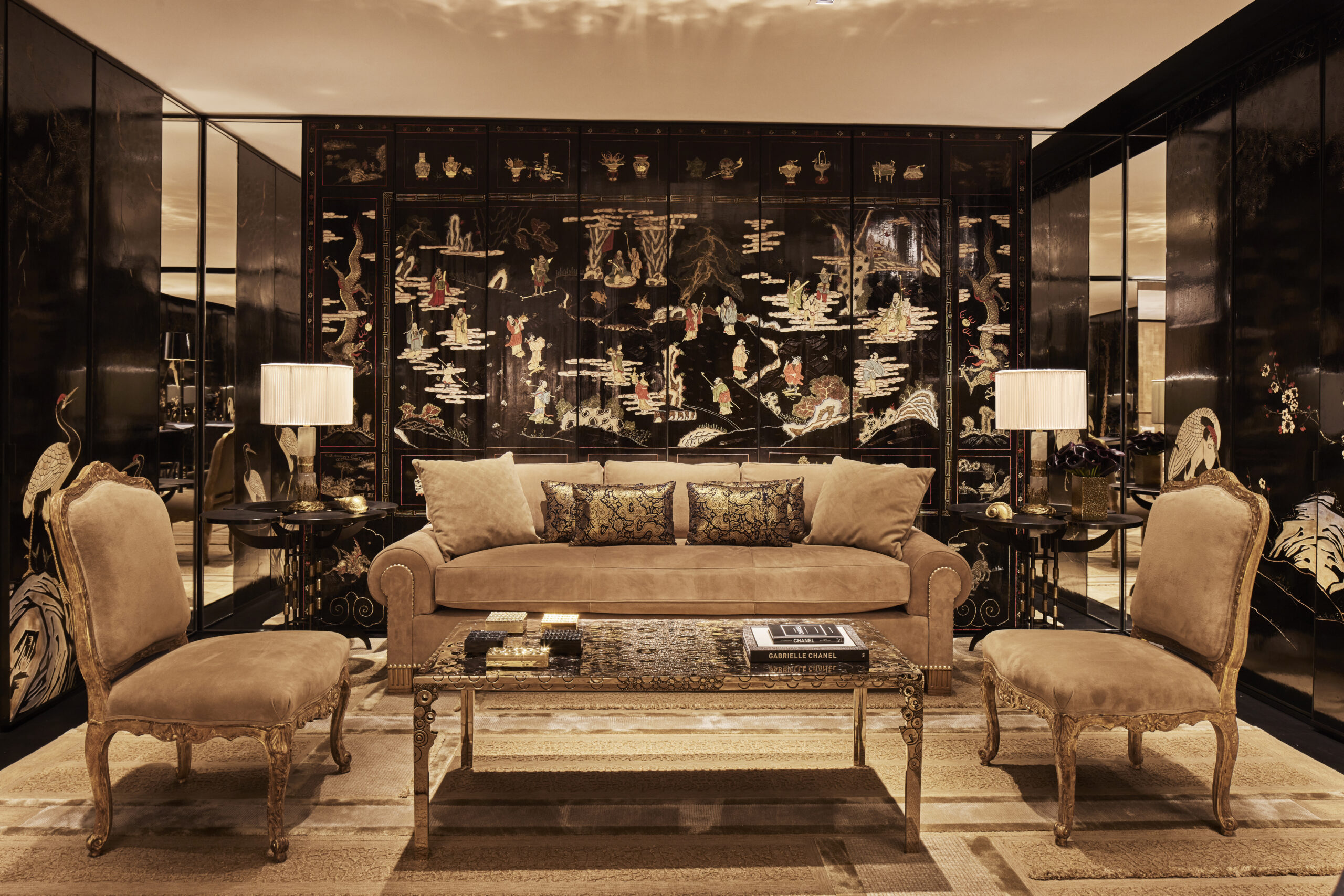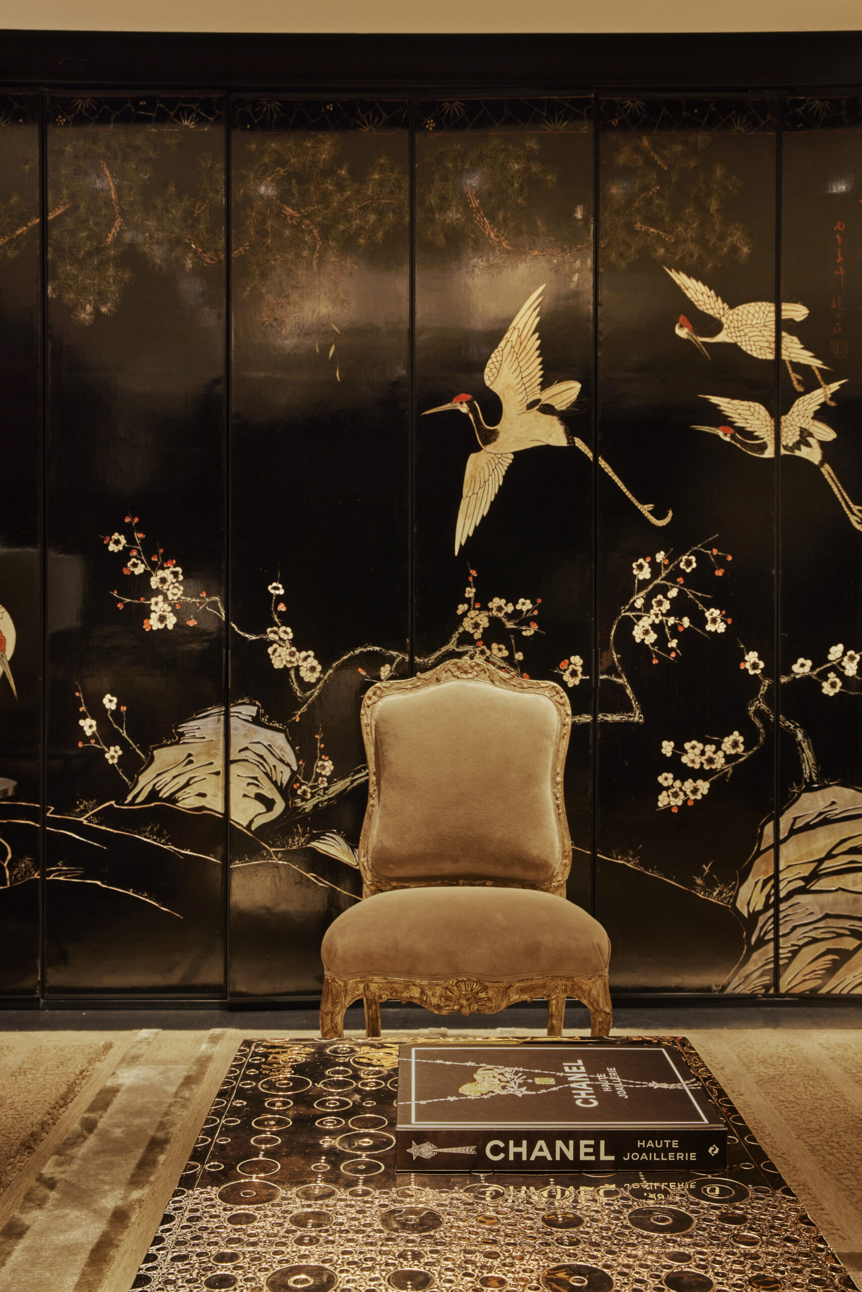 L’intérieur reflète une palette délicate de noir et d’or, agrémentée de cristal de roche, matériau favori de Gabrielle Chanel, et d’une collection exceptionnelle d’art contemporain, d’antiquités et de mobilier sur mesure. Les salons de joaillerie fine, conçus avec une attention méticuleuse aux détails, sont ornés de finitions murales style coromandel et d’un miroir doré de l’époque régence, évoquant l’ambiance raffinée de l’appartement de Mademoiselle Chanel.