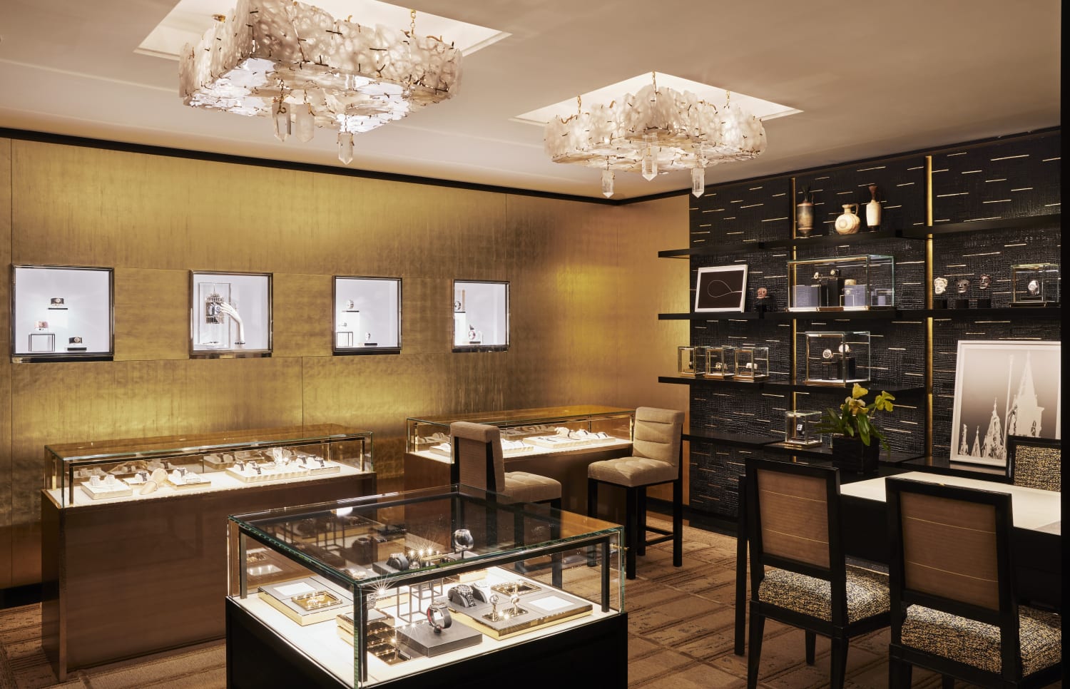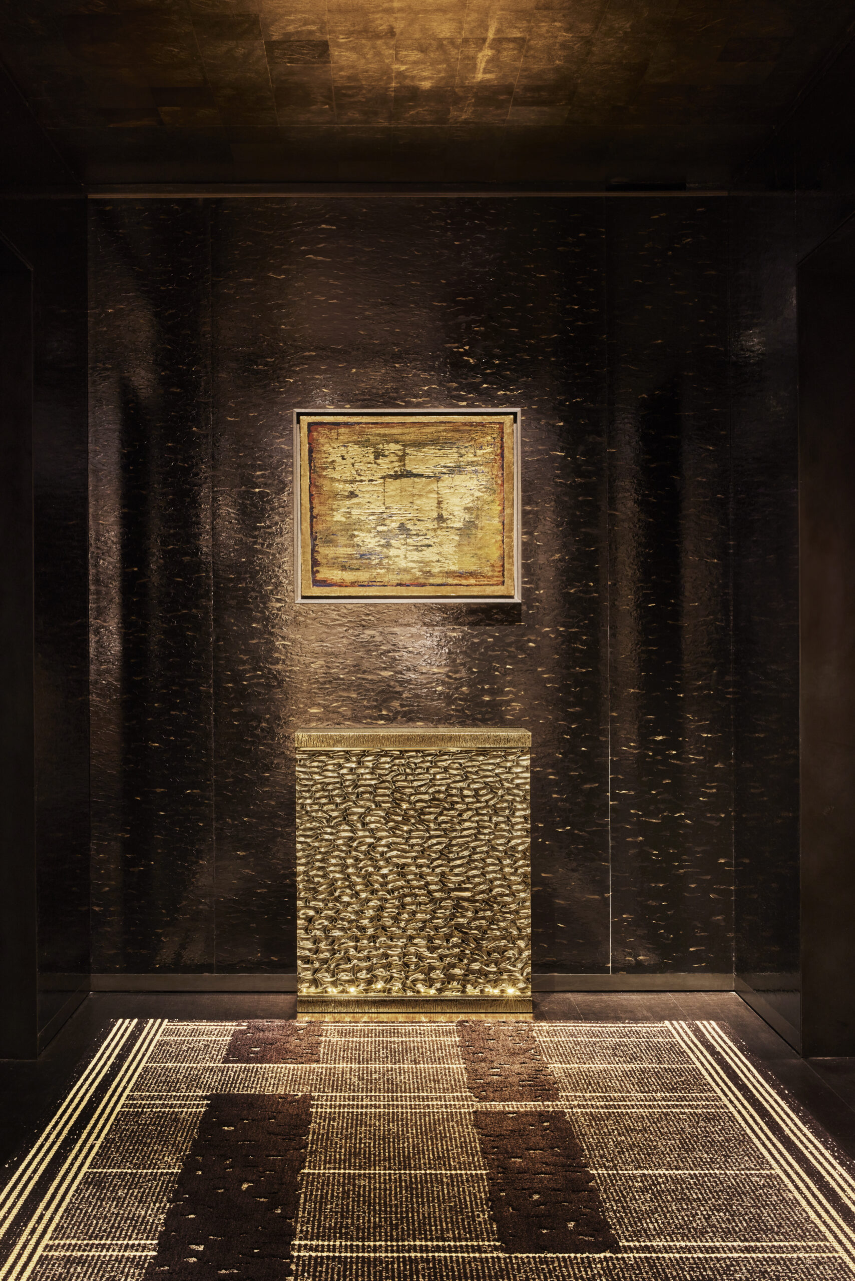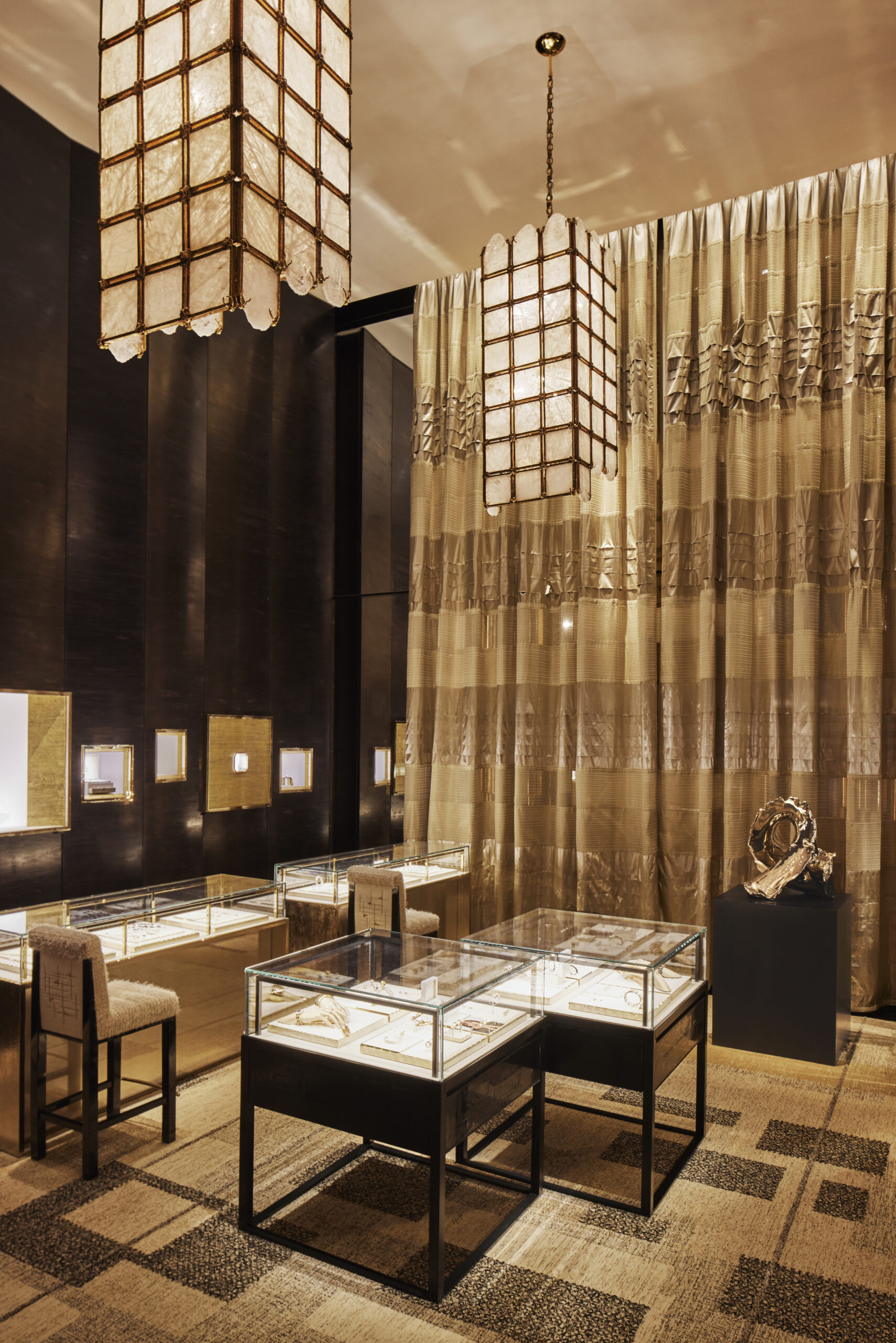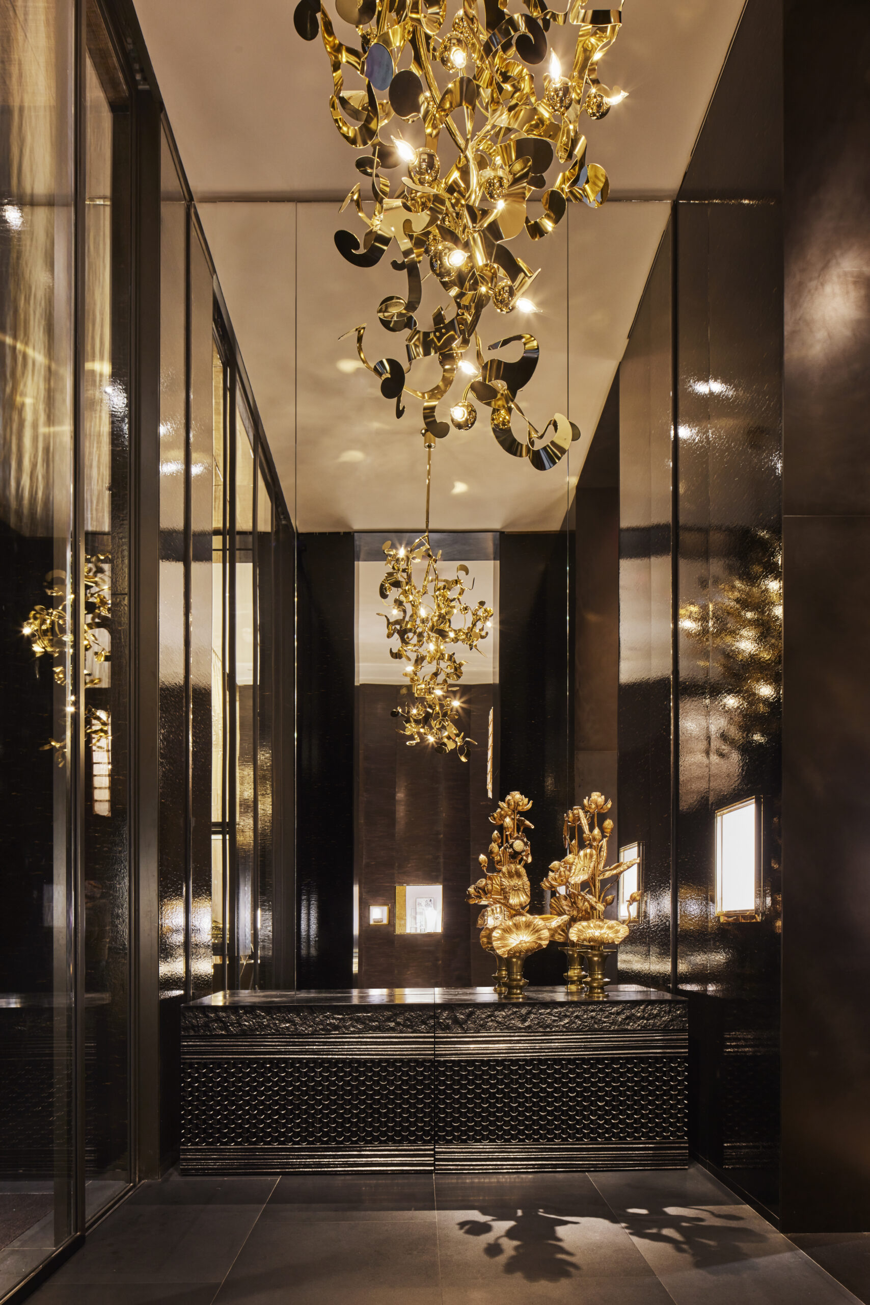 L’intérieur reflète une palette délicate de noir et d’or, agrémentée de cristal de roche, matériau favori de Gabrielle Chanel, et d’une collection exceptionnelle d’art contemporain, d’antiquités et de mobilier sur mesure. Les salons de joaillerie fine, conçus avec une attention méticuleuse aux détails, sont ornés de finitions murales style coromandel et d’un miroir doré de l’époque régence, évoquant l’ambiance raffinée de l’appartement de Mademoiselle Chanel.