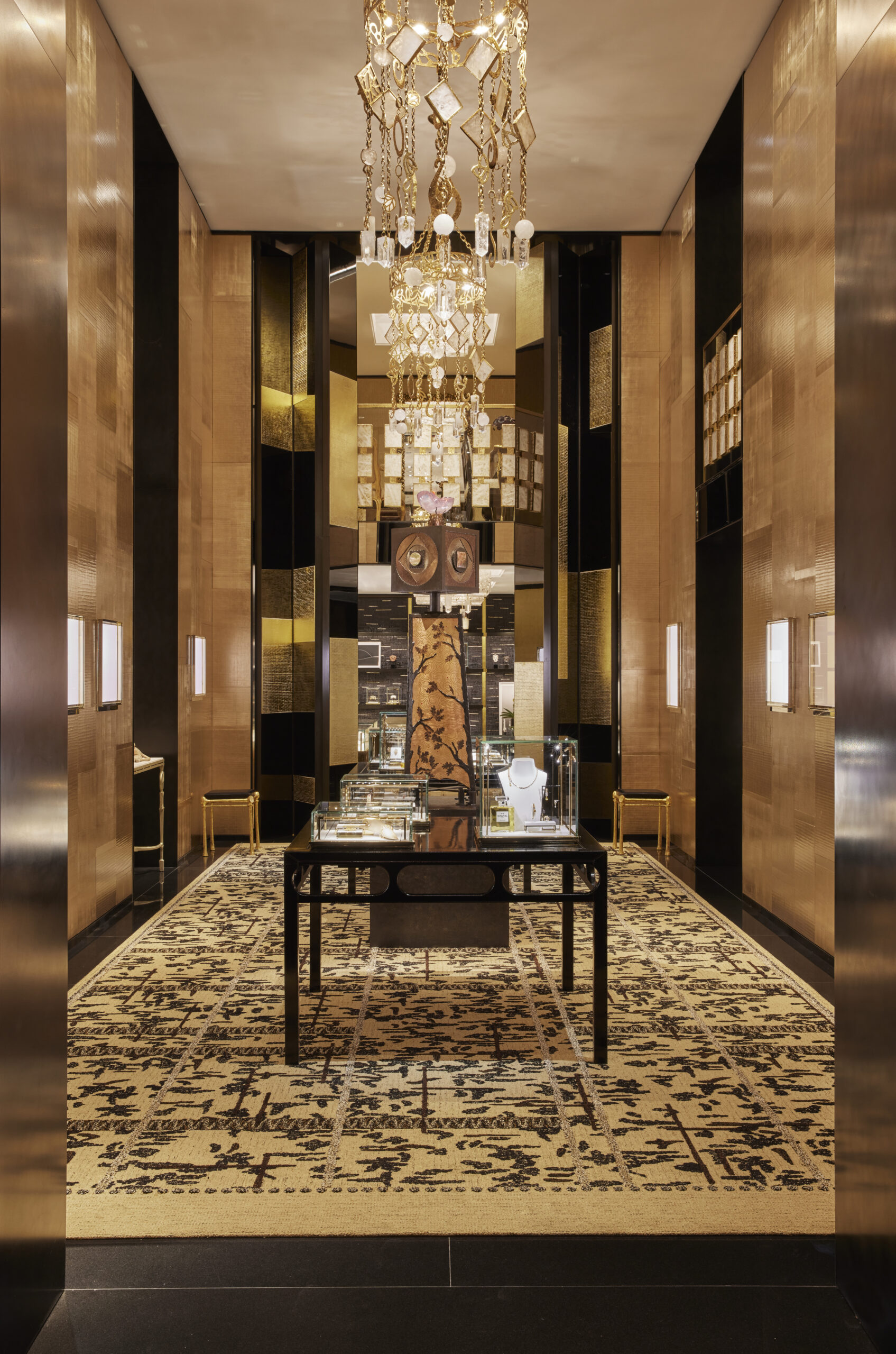 La nouvelle boutique s’inspire profondément de Gabrielle Chanel, de son numéro porte-bonheur, le 5, son amour pour l’art, la décoration, et l’ambiance unique de son appartement parisien au 31 Rue Cambon. En harmonie avec l’architecture Beaux-Arts du Crown Building historique, la façade de la boutique arbore un élégant granit noir et des écrans en bronze doré, derrière une façade en fer et verre.