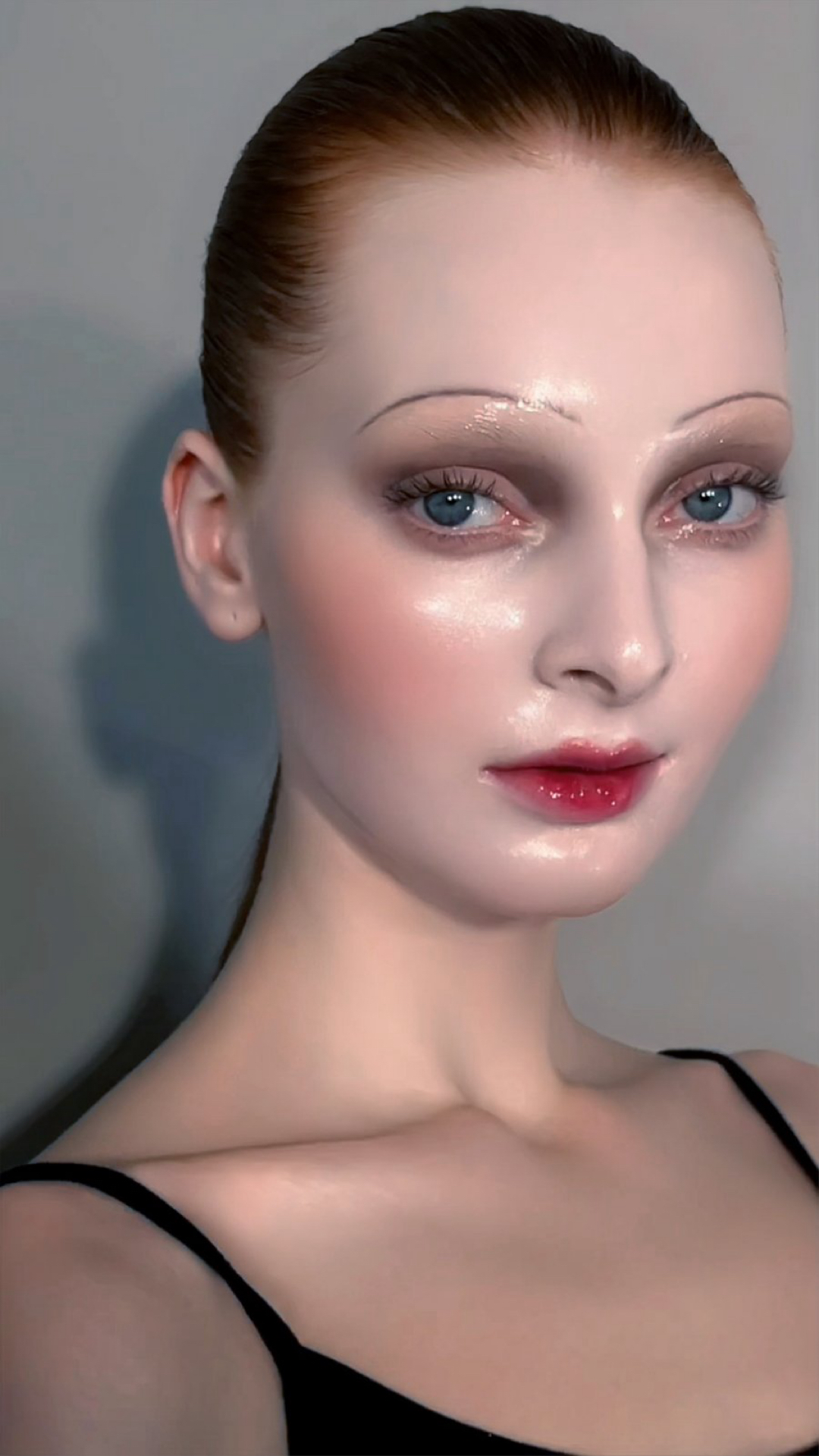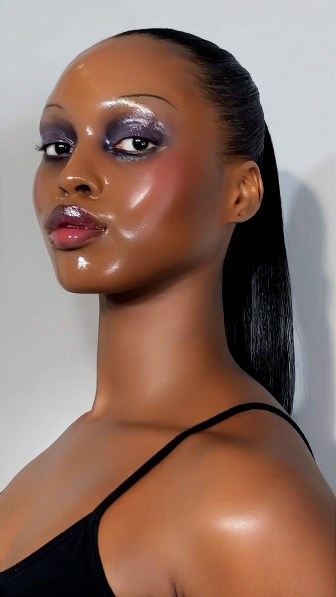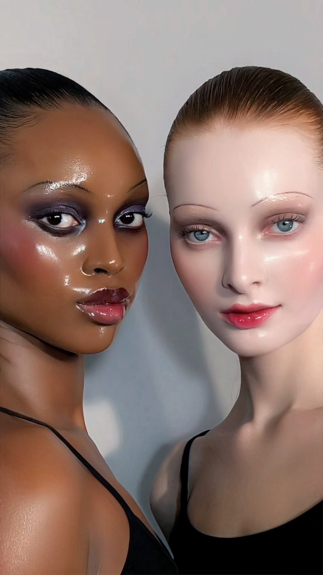 Le maquillage du défilé offre une interprétation moderne de la peau en verre de porcelaine. Les sourcils sont décolorés et remplacés par des arcs fins, dessinés avec des ombres aux tons neutres. Les yeux sont le point focal, avec des variations d’un œil pictural dans une gamme étonnante de tons de bijoux, de pastels ou de charbons sombres. Les lèvres sont audacieuses, avec des nuances subversives de rouge sang et de noir recouvertes de gloss transparent. La peau est recouverte d’un glacis hyper brillant, créant une texture lisse et réfléchissante, en accord avec la vision artistique de la collection.