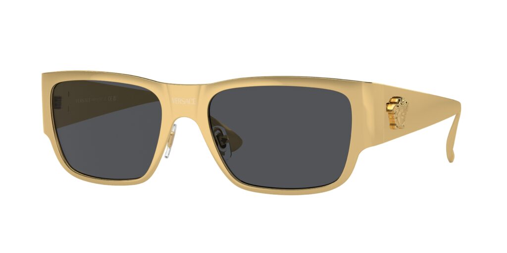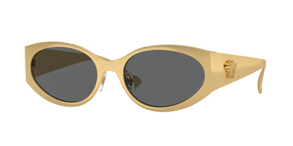 - VE2265 : Monture 100 % métal avec pont orné du logo Versace, en argent ou en or.