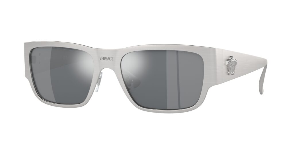 - VE2262 : Lunettes de soleil carrées avec des branches ornées de la Méduse en relief, disponibles en argent avec des verres miroirs ou en or avec des verres gris foncé.