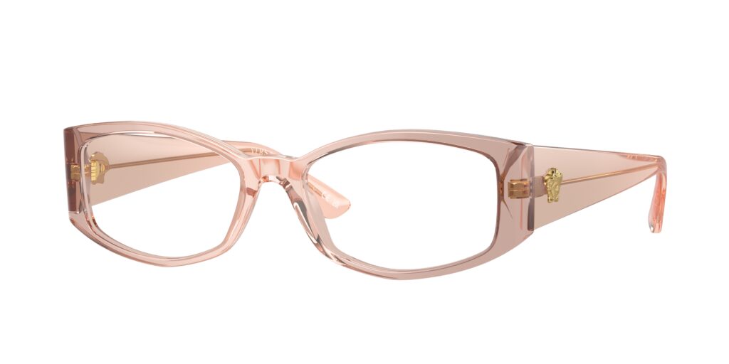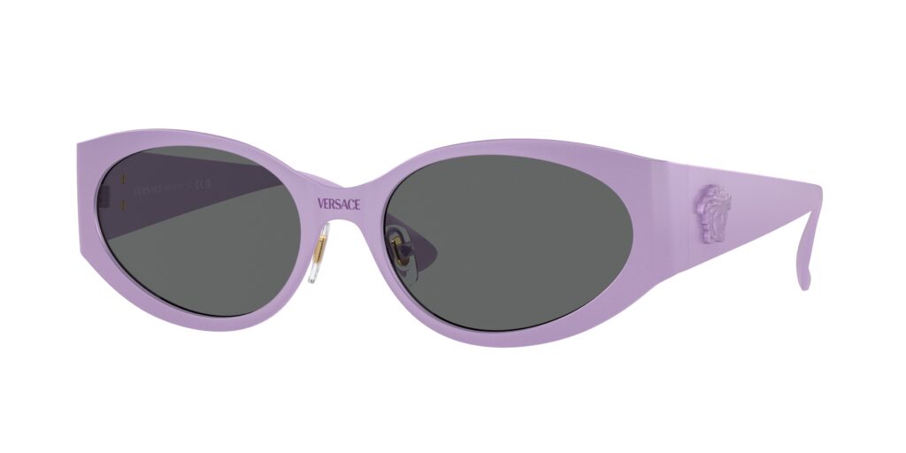 - VE2263 : Monture 100 % métal avec le logo Versace gravé sur le pont et la Méduse en relief sur les branches, en violet ou en or.