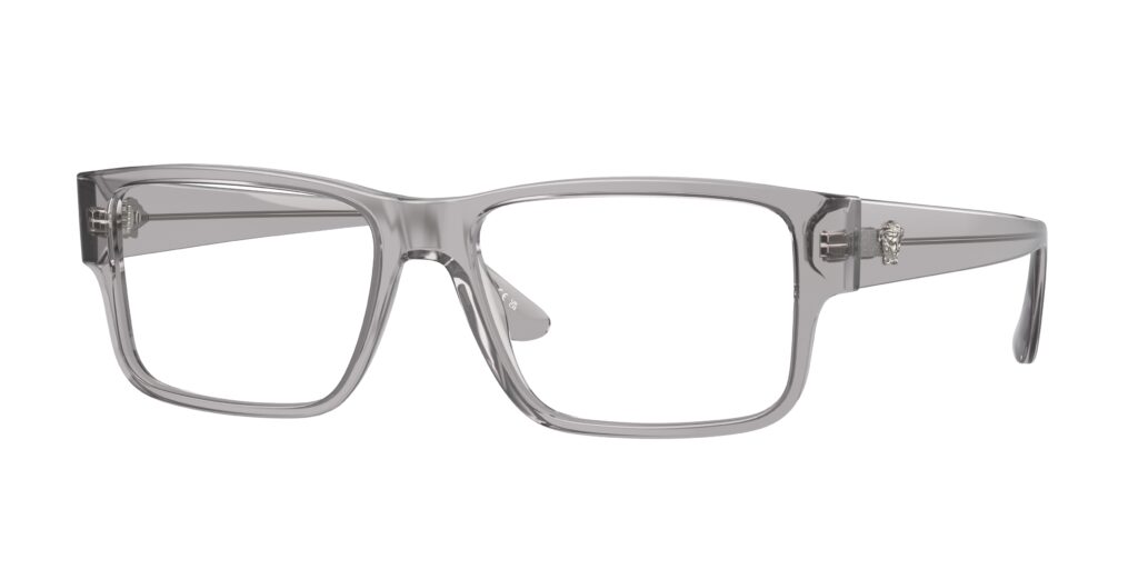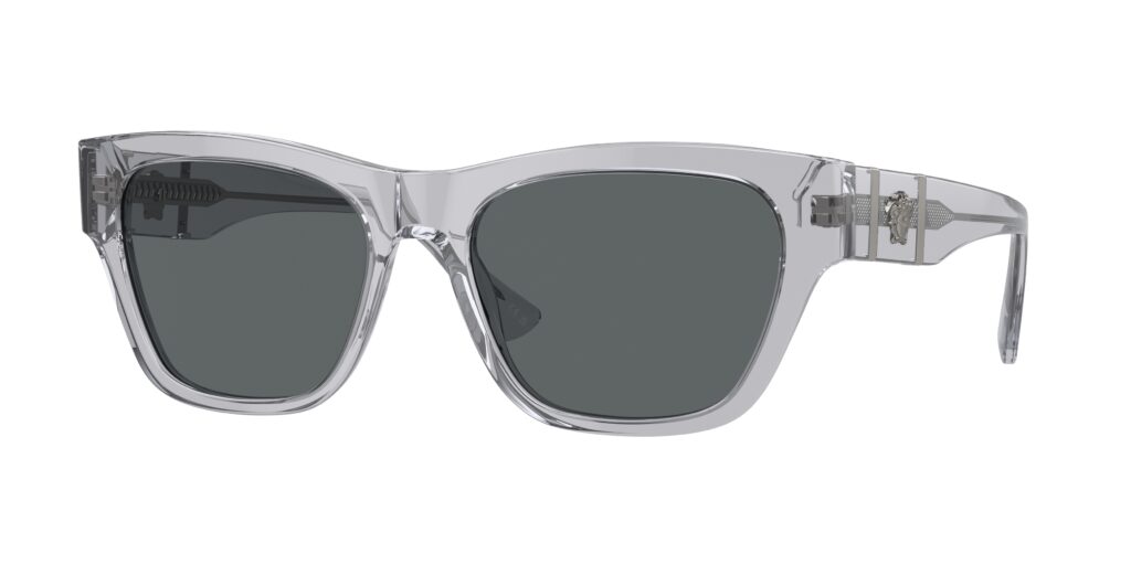 - VE4457 : Monture carrée en acétate recyclé avec un détail Méduse, en gris transparent ou en noir.