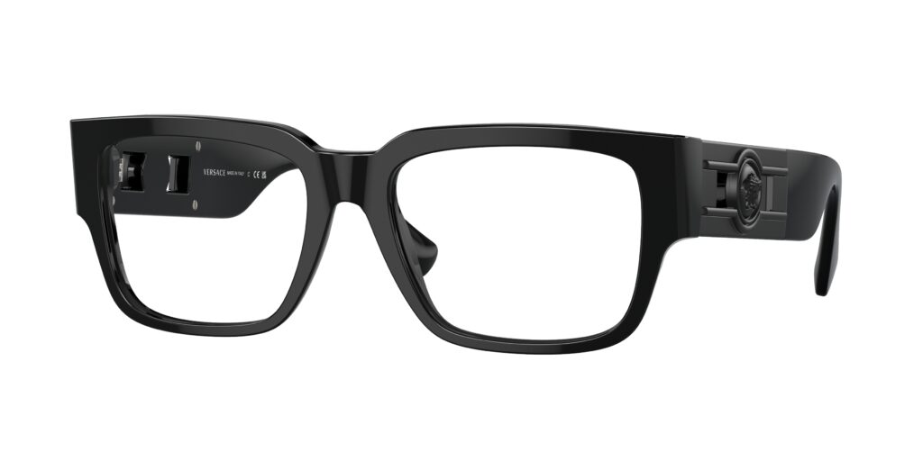 - VE3342 : Monture rectangulaire en acétate recyclé avec des manchons réglables et une Méduse en relief, en gris transparent ou en noir classique.
