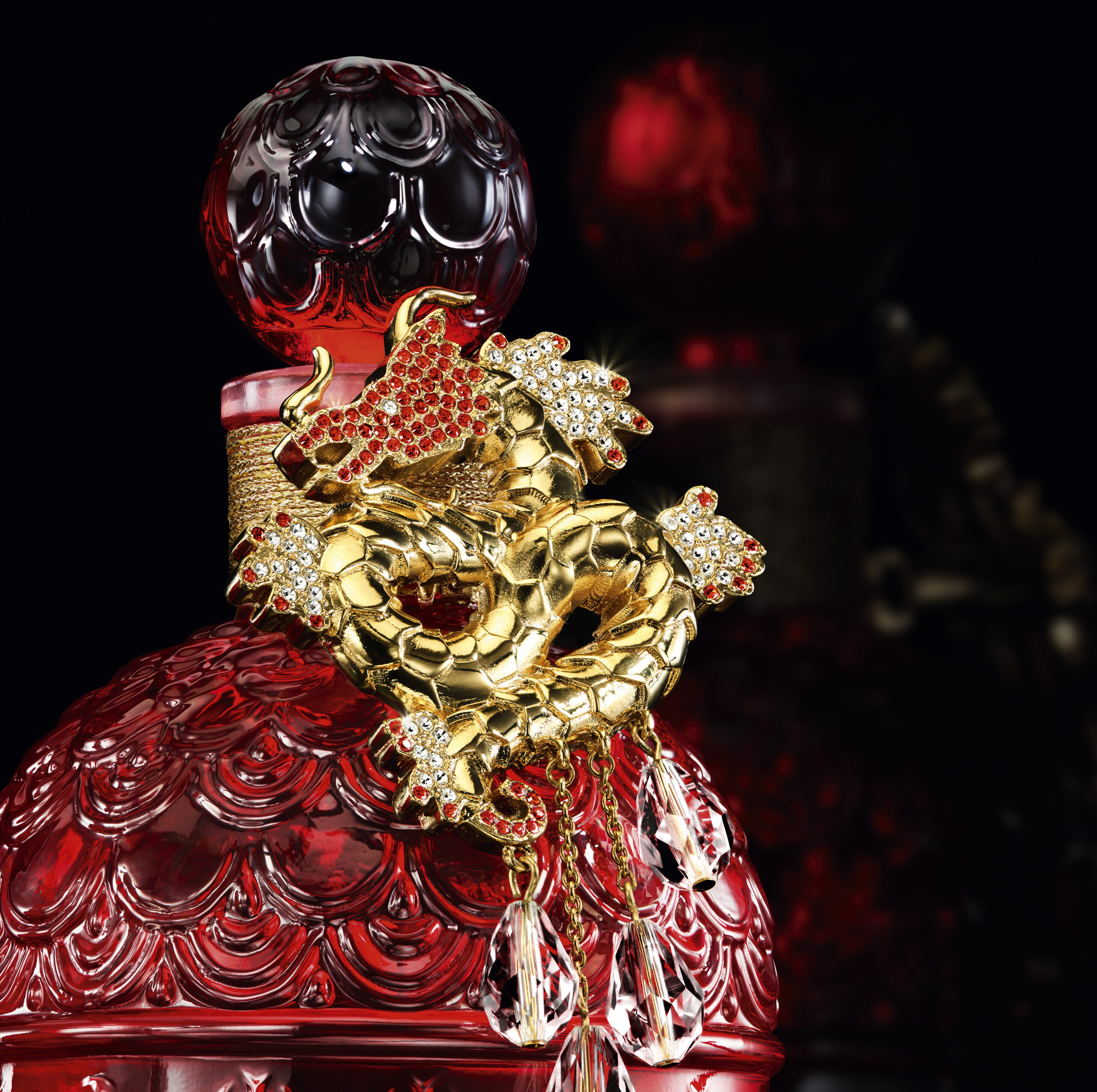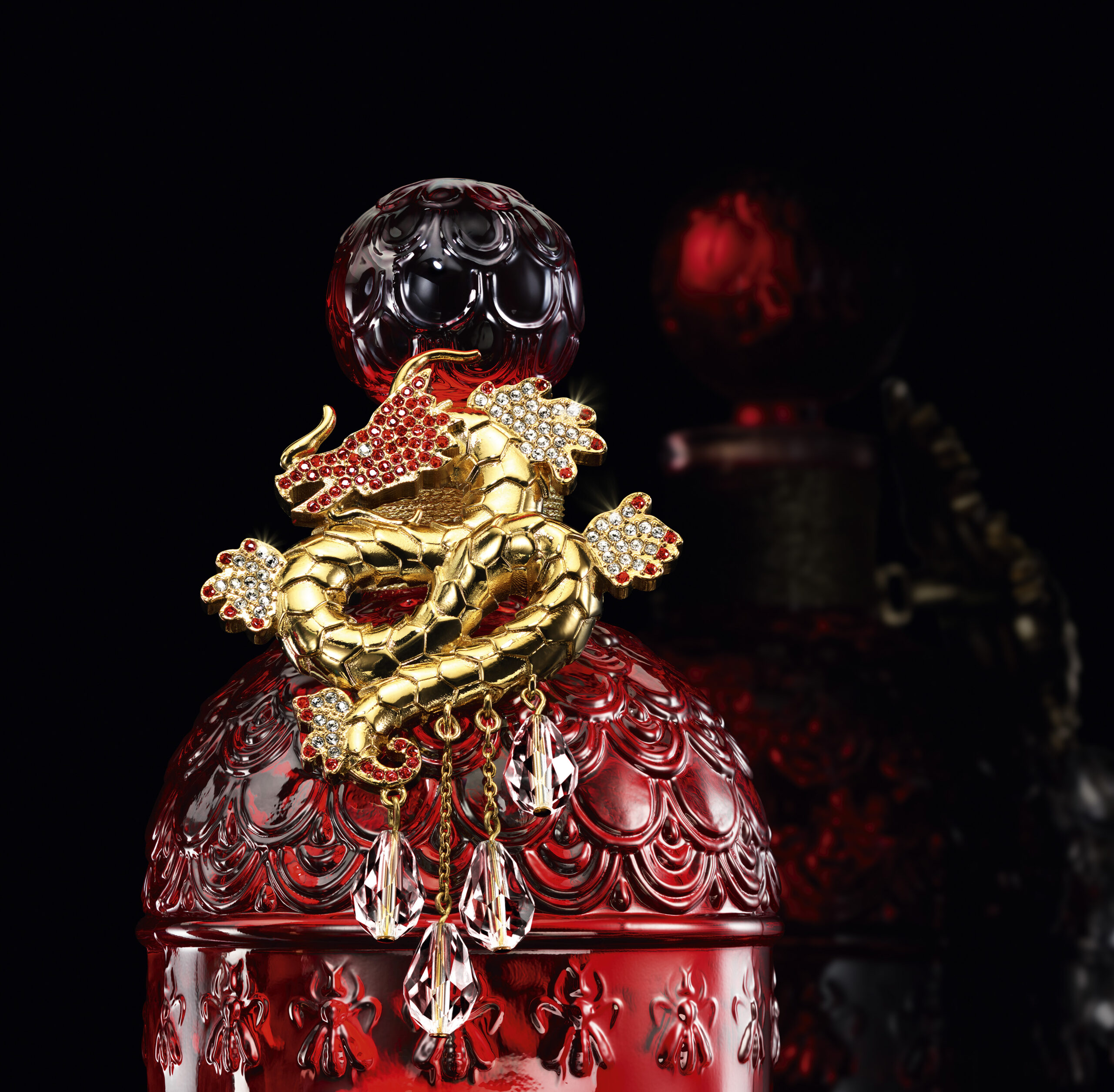 Habillé de rouge, couleur porte-bonheur en Chine, le flacon se pare d’un somptueux dragon doré imaginé par Francesco Truscelli, joaillier parisien. Ce dragon, symbole impérial et créature légendaire, est réalisé en or fin 24 carats et orné de 142 cristaux Swarovski® scintillants.