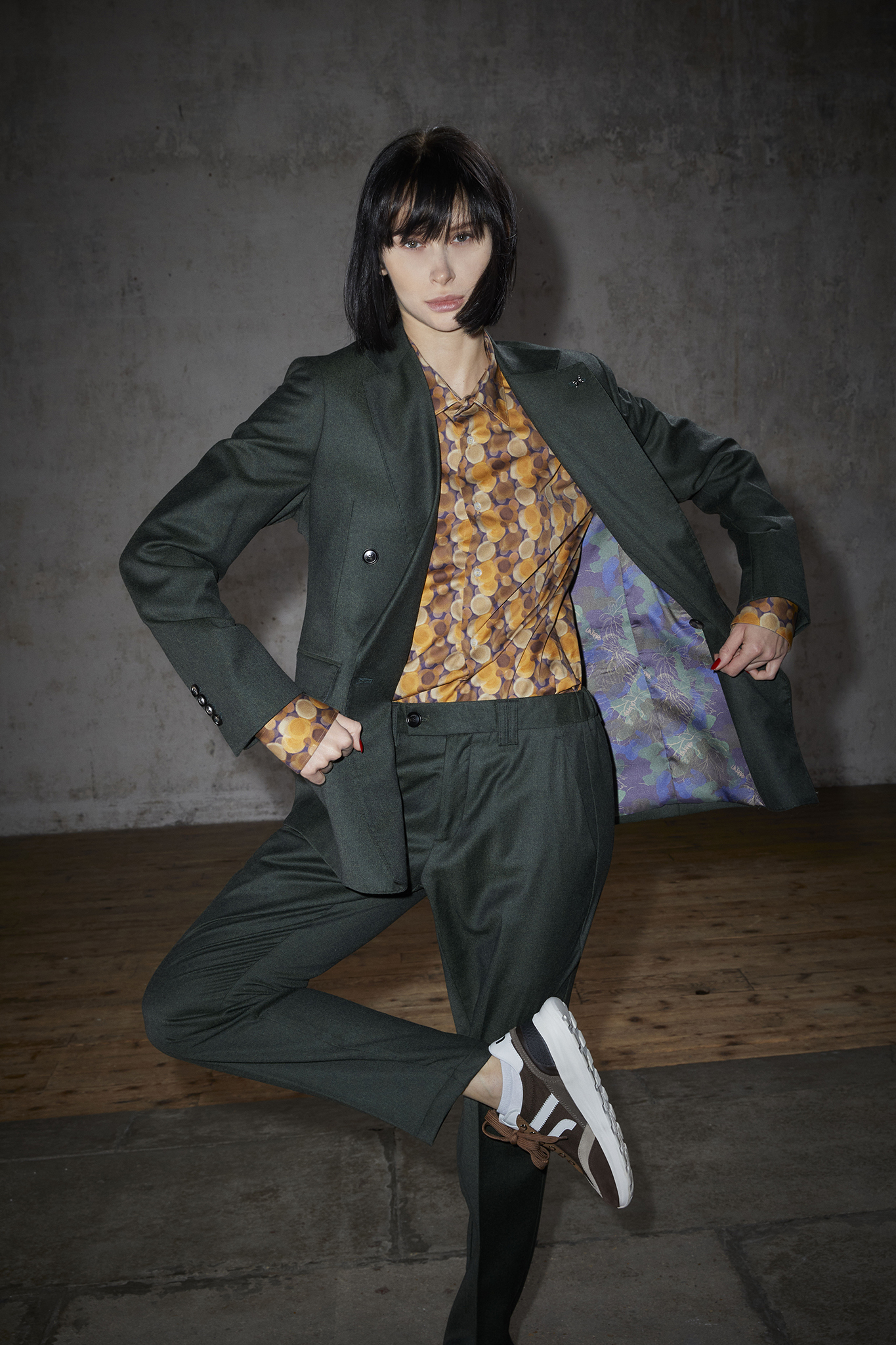 La palette de couleurs reflète l’équilibre entre tradition et modernité. Des tons neutres de gris, anthracite et gravier constituent la base, tandis que des touches de pain d’épice et de jaune curcuma apportent une chaleur vibrante. Des nuances profondes de pourpre, de mûre et de bleu nuit ajoutent une touche d’intensité à la collection.