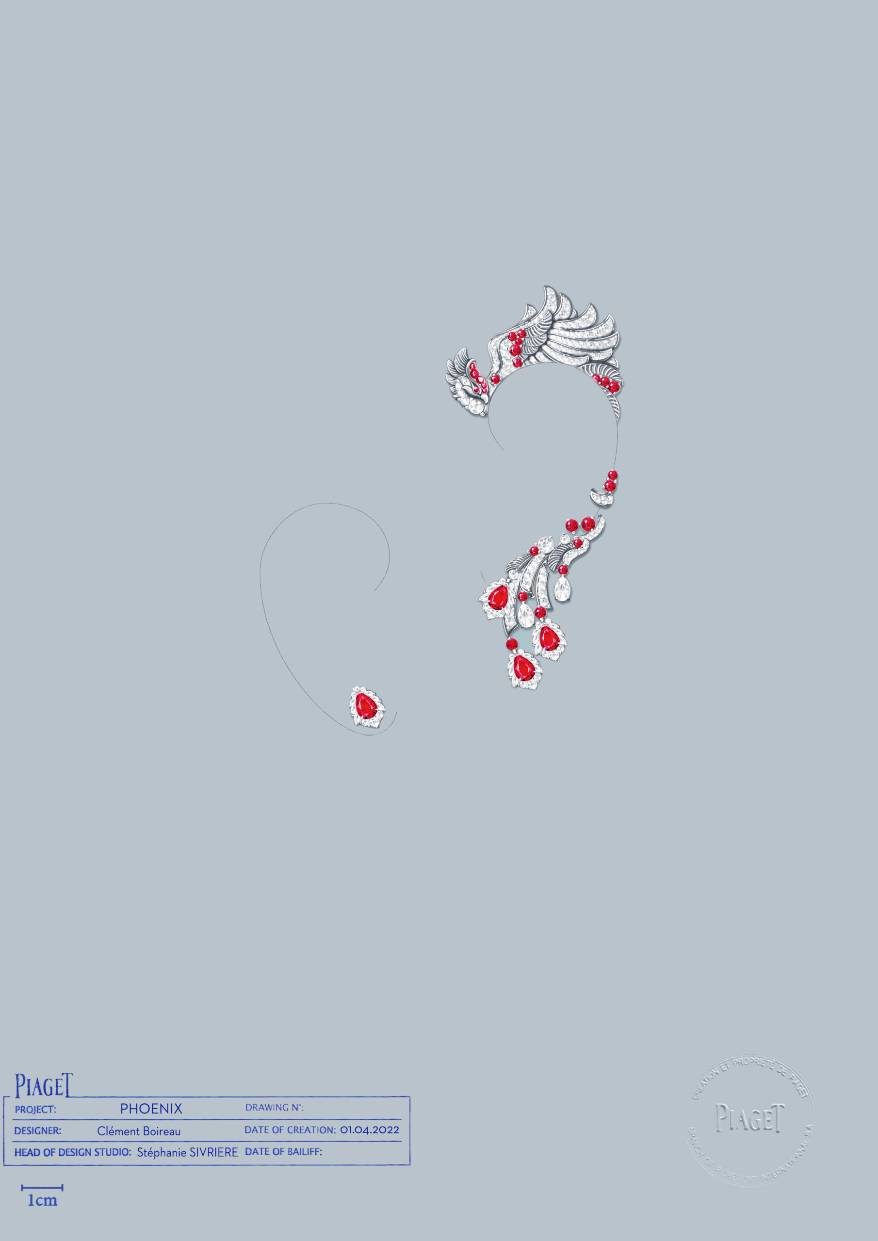 Piaget présente également des bijoux Phénix, notamment des montres joaillières et des boucles d’oreilles, reflétant une féminité somptueuse. Les pièces utilisent des diamants taille marquise et brillant, des rubis et de l’or blanc, incarnant l’élégance et la grâce du Phénix.
