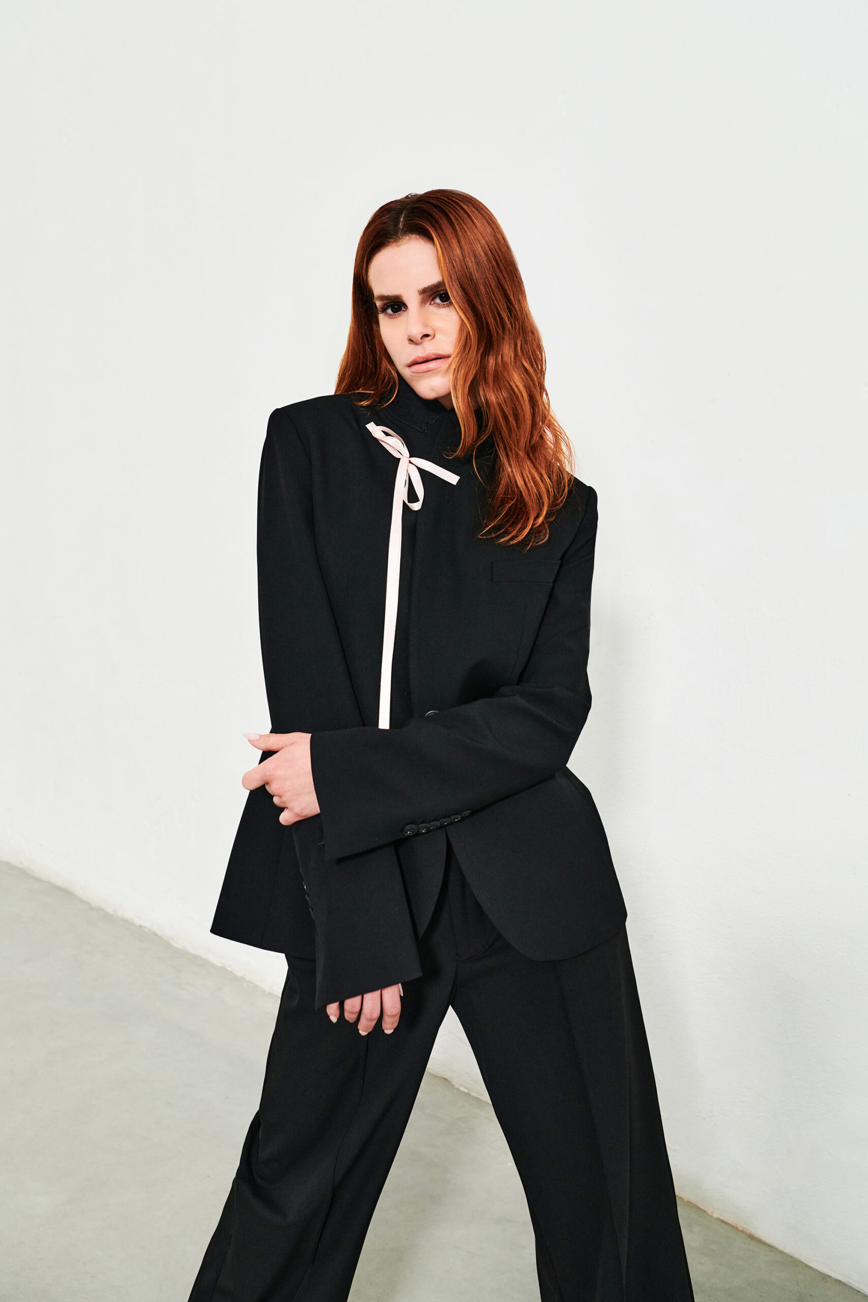 City Dancer n’est pas seulement une collection de vêtements, c’est une déclaration de principes. Patrick McDowell, reconnu pour son approche éthique de la mode, sélectionne avec soin des matériaux recyclés et certifiés durables. Il donne une seconde vie à des tissus vintage trouvés dans les entrepôts, créant ainsi des pièces uniques qui allient passé et présent. Cette réinvention se traduit visuellement par des blousons bombardiers ornés de nœuds roses, des hauts transparents et des blousons noirs asymétriques, tous agrémentés de rubans roses. Ces créations incarnent un équilibre parfait entre charme juvénile et sophistication raffinée.