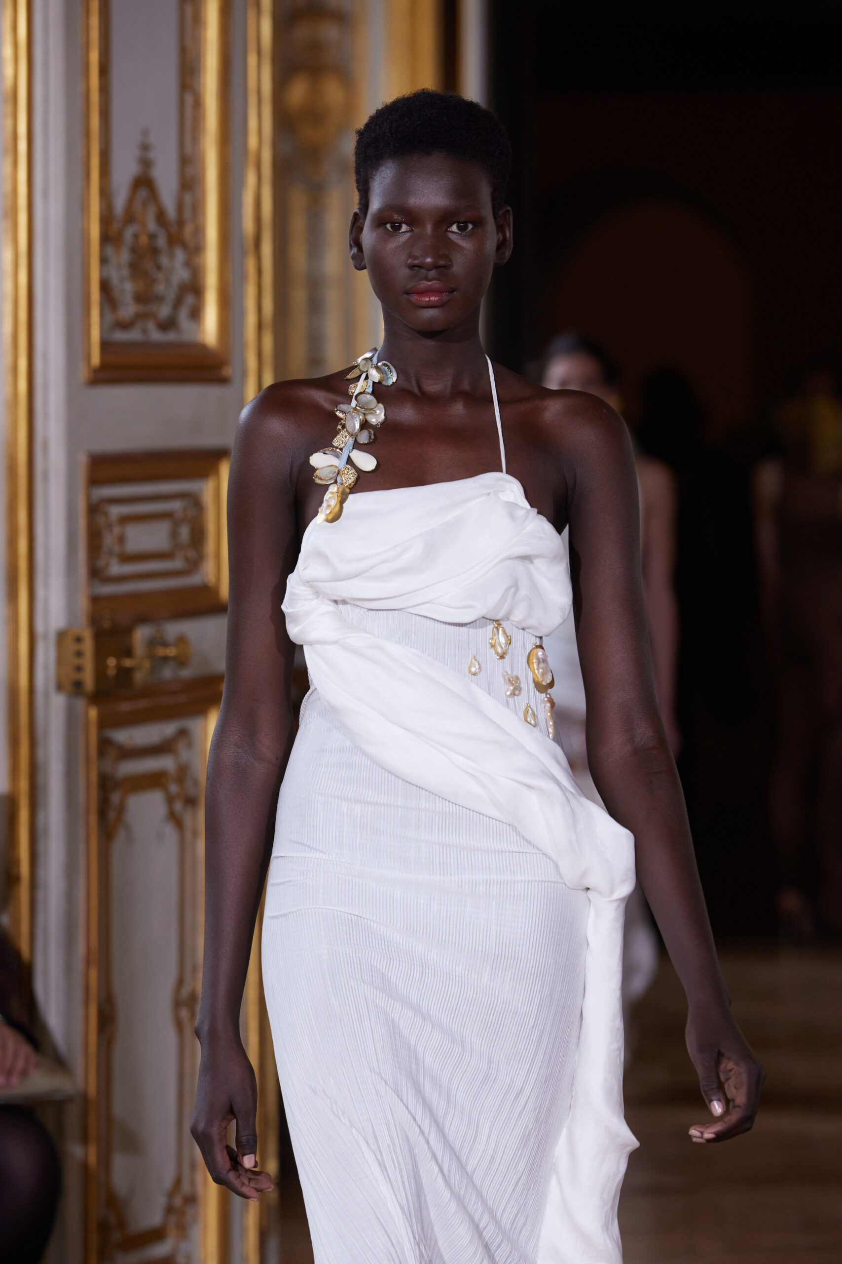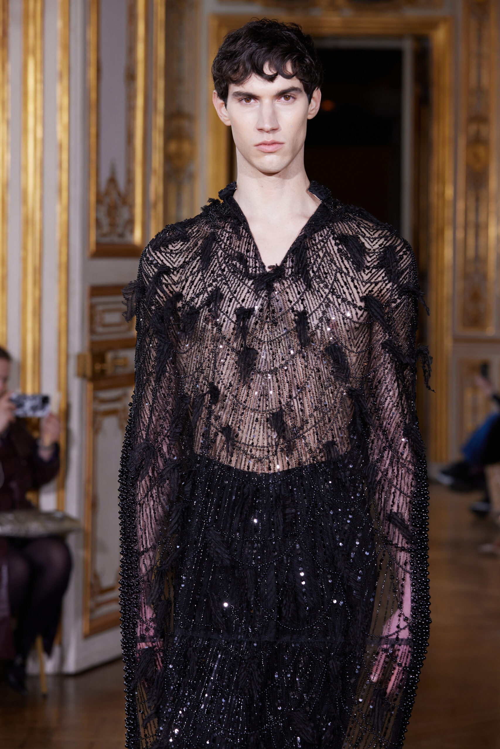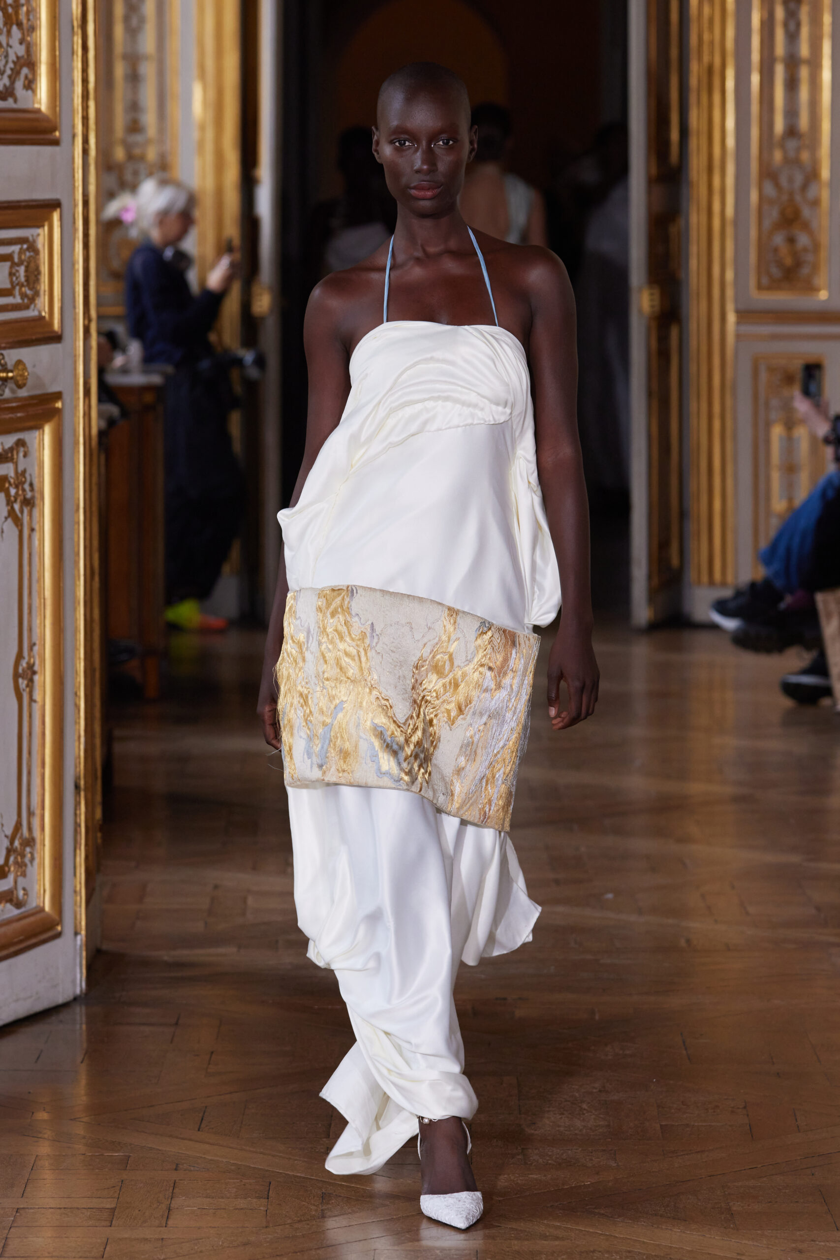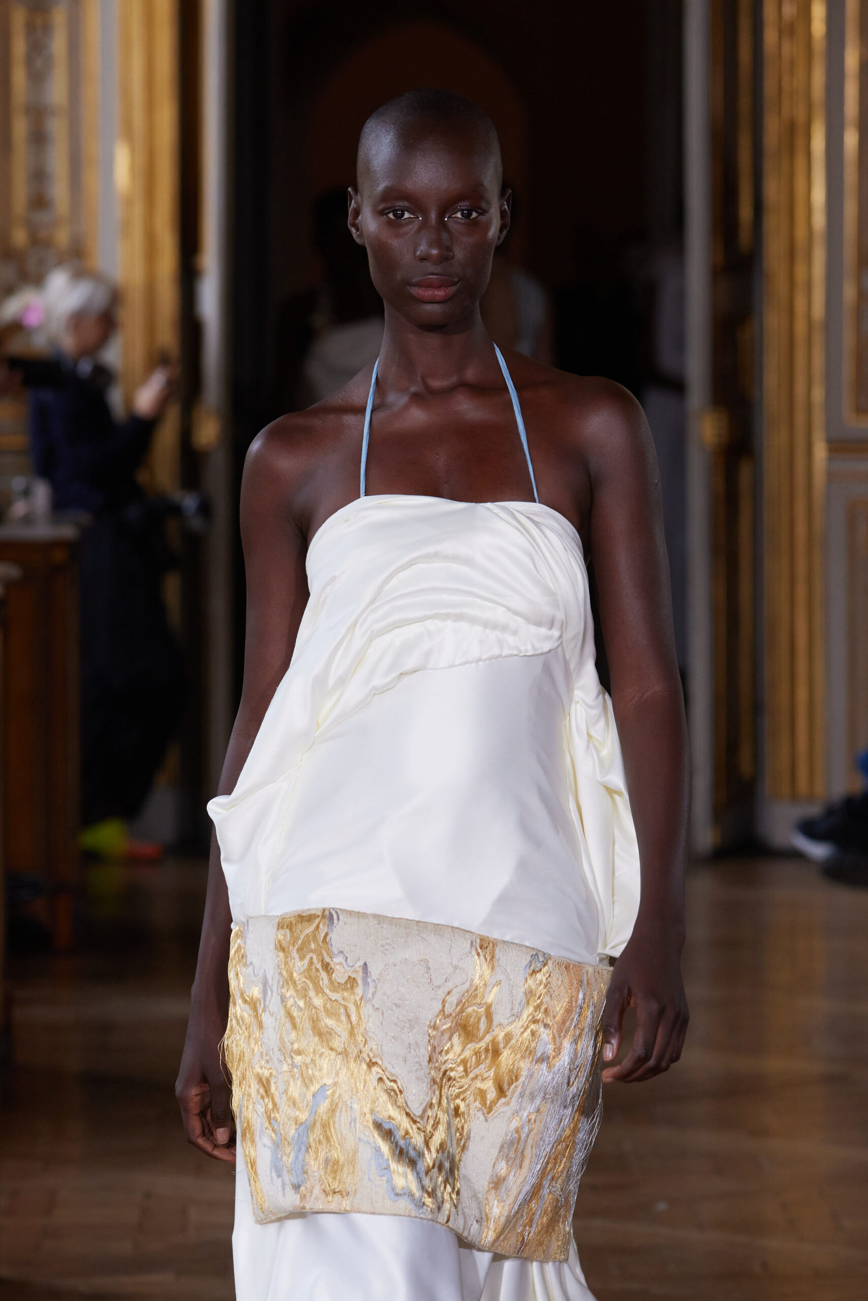 La collection évoque une émotion de légèreté et de fluidité, symbolisée par des créations qui semblent flotter autour du corps, offrant un hommage à la résilience humaine et au mouvement. Les silhouettes émergent telles des visions à travers la brume, portant en elles la marque d’un artisanat qui respecte et honore la nature.