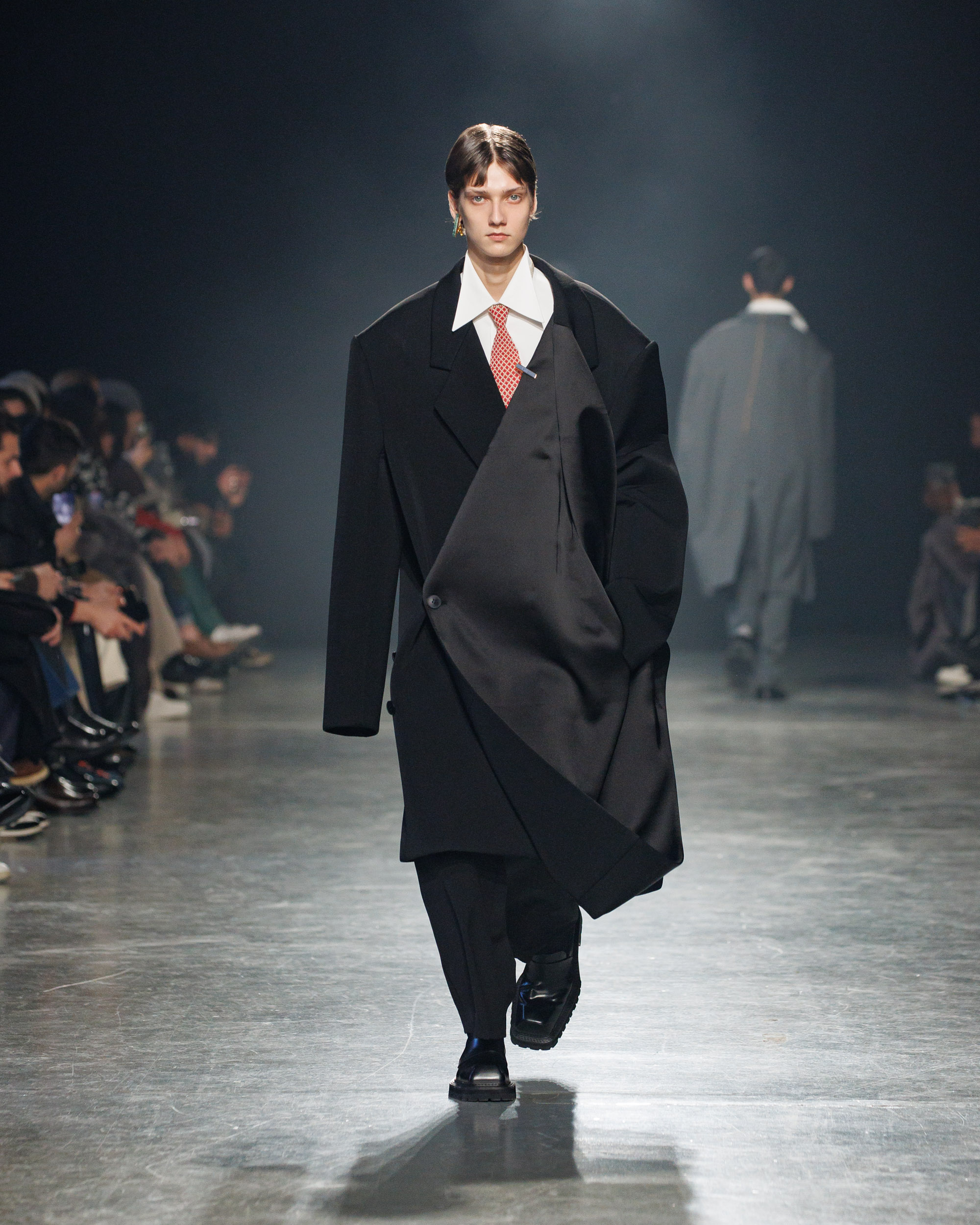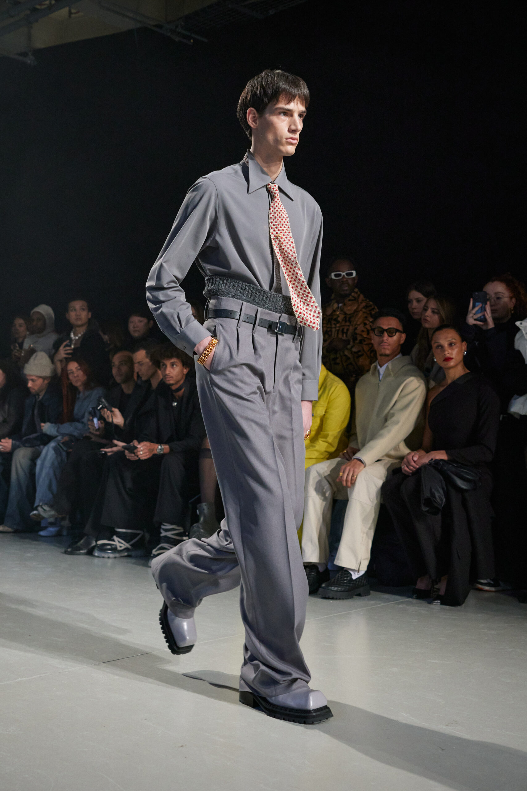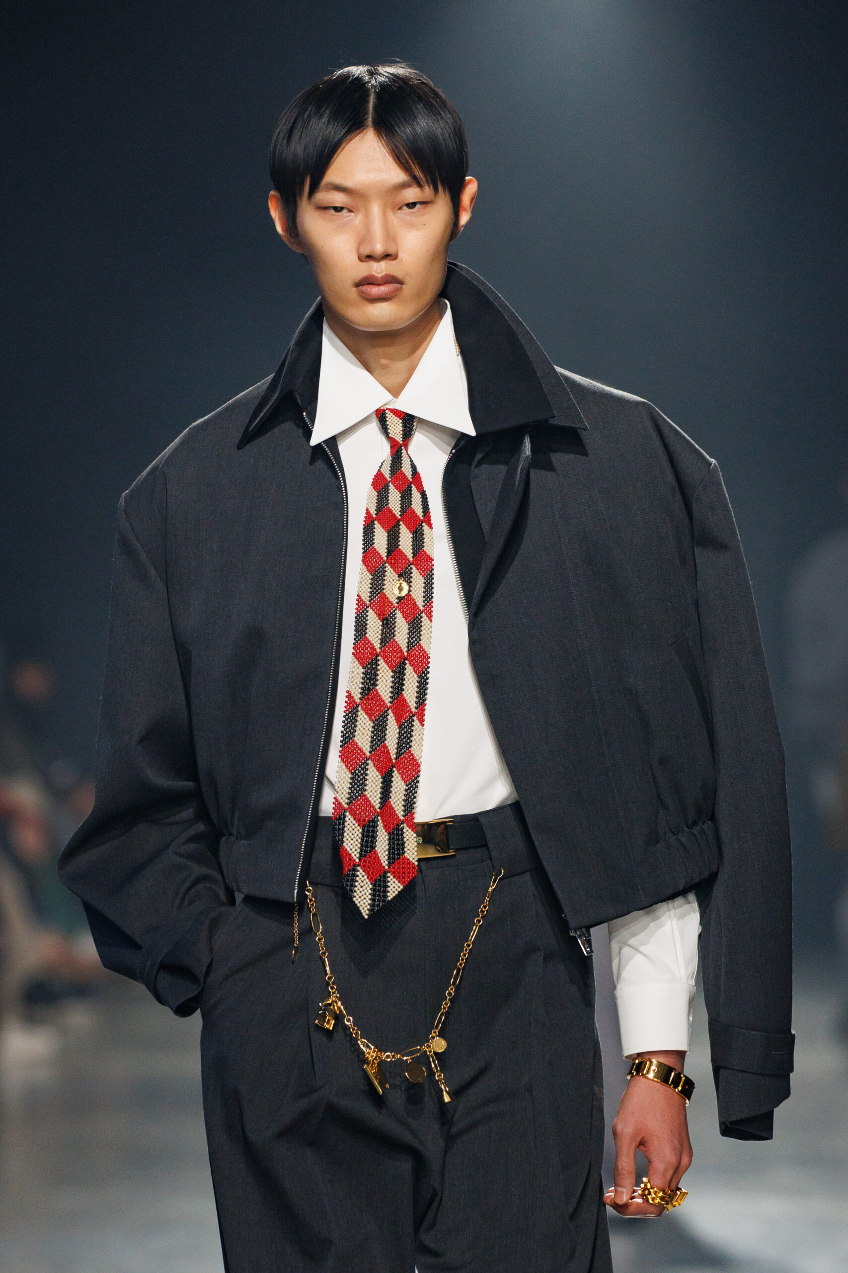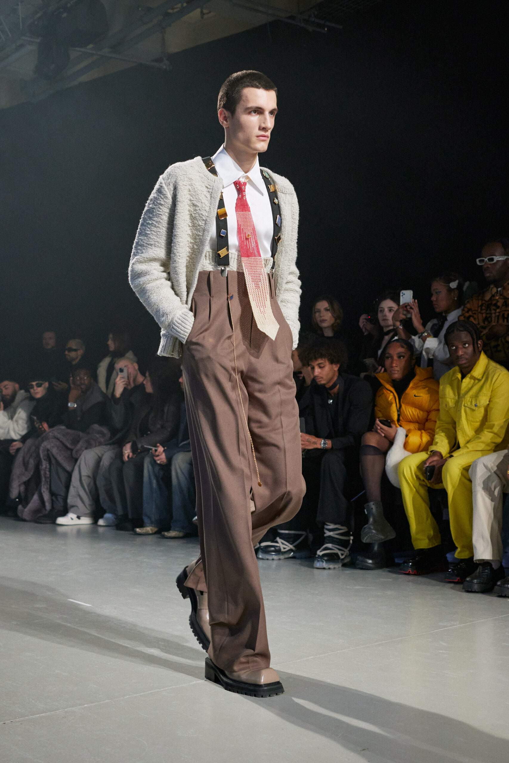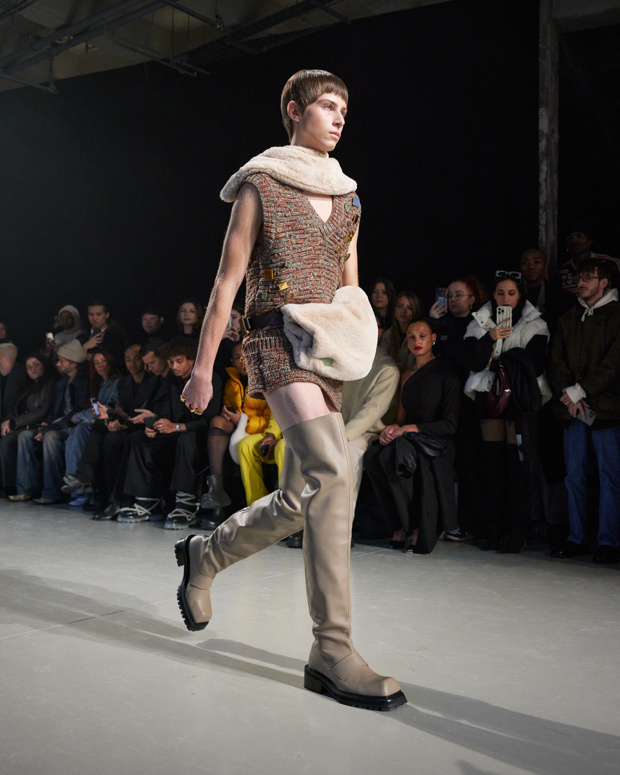 La collection est également marquée par la déconstruction et la juxtaposition des structures de la mode, créant un effet dynamique et provocateur. Ces éléments reflètent l’esprit urgent, rebelle et non-conformiste de cette génération.