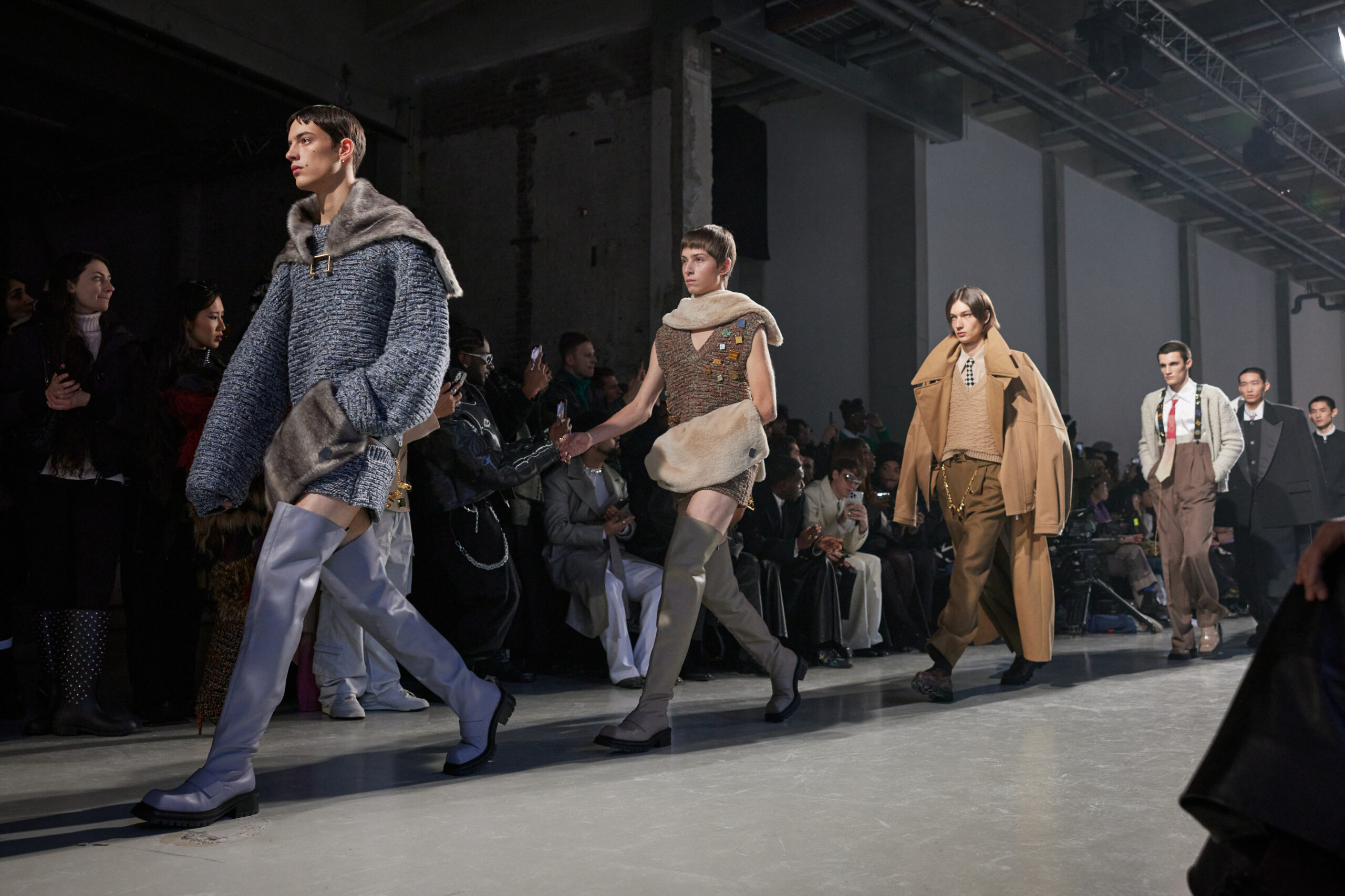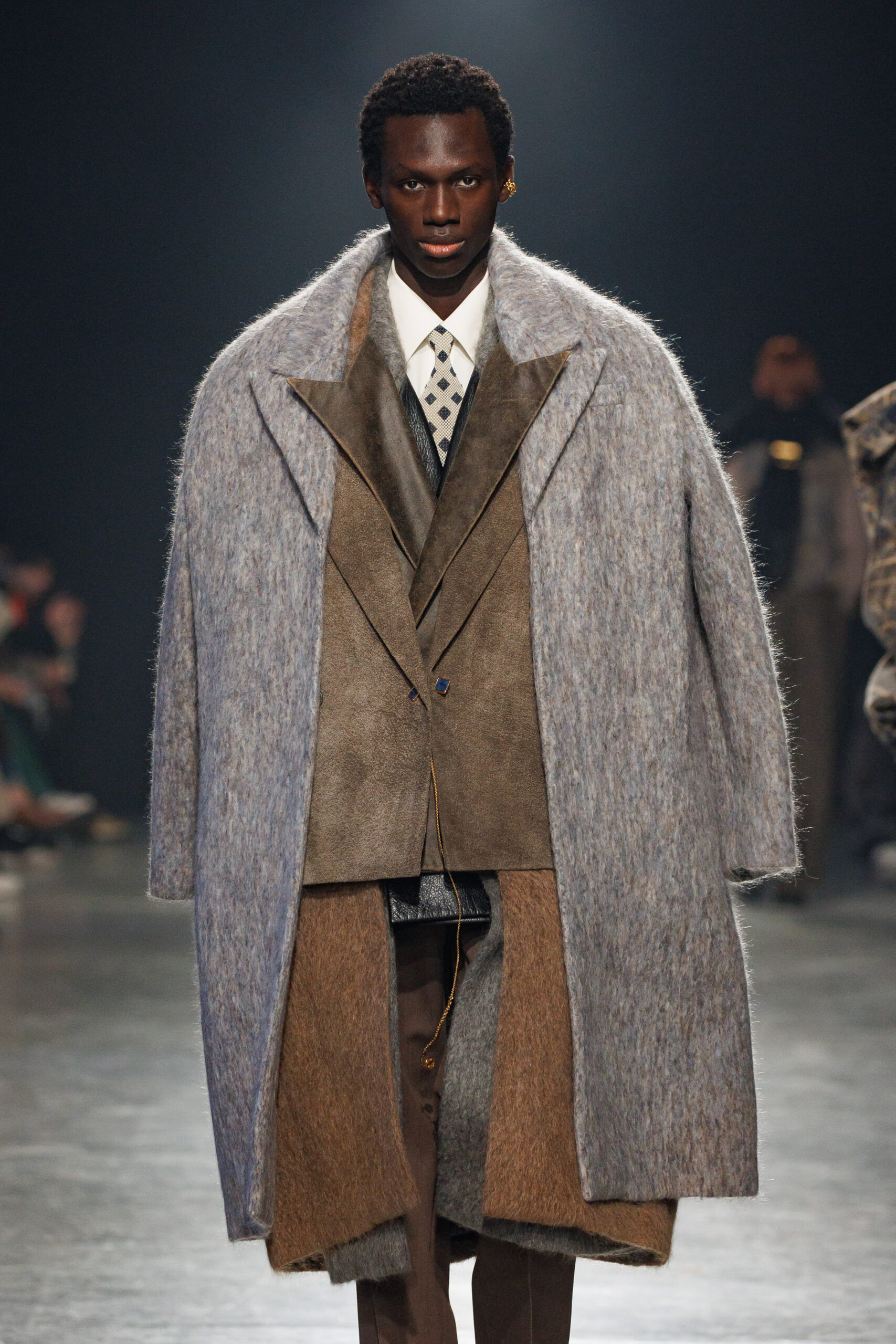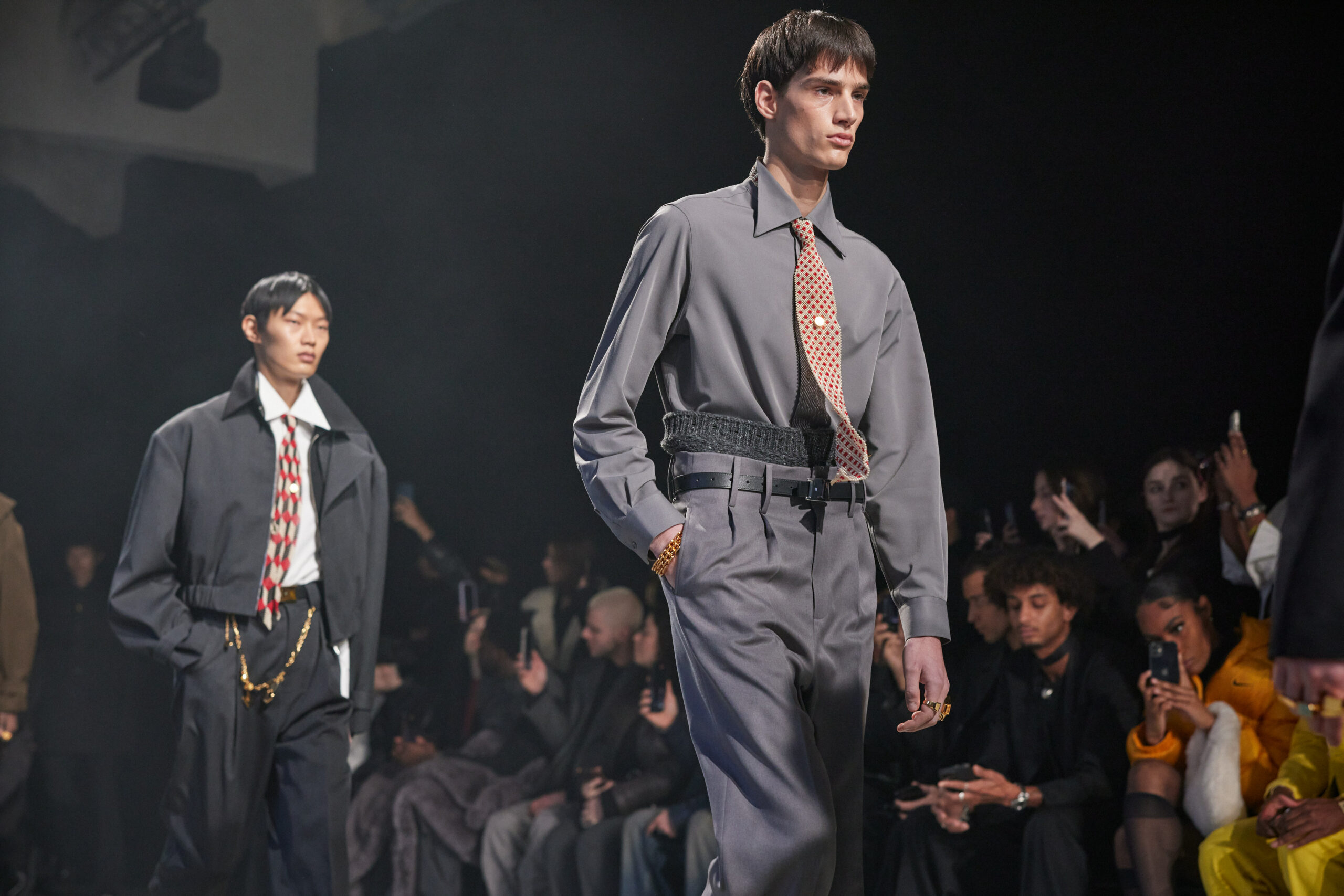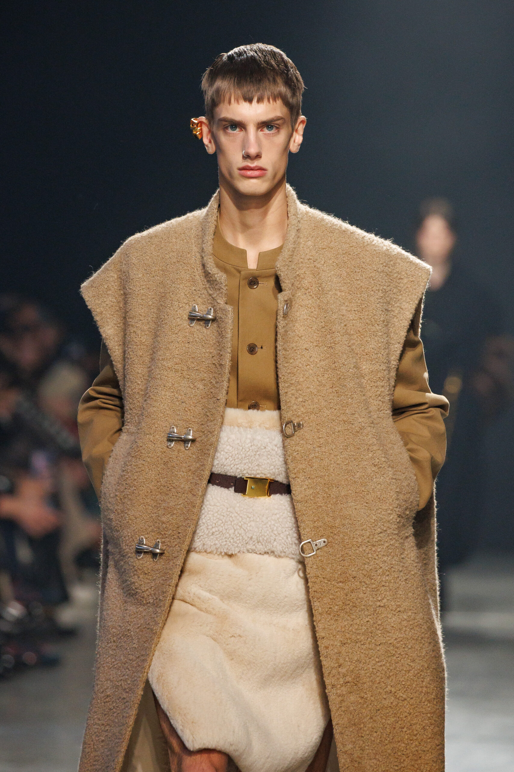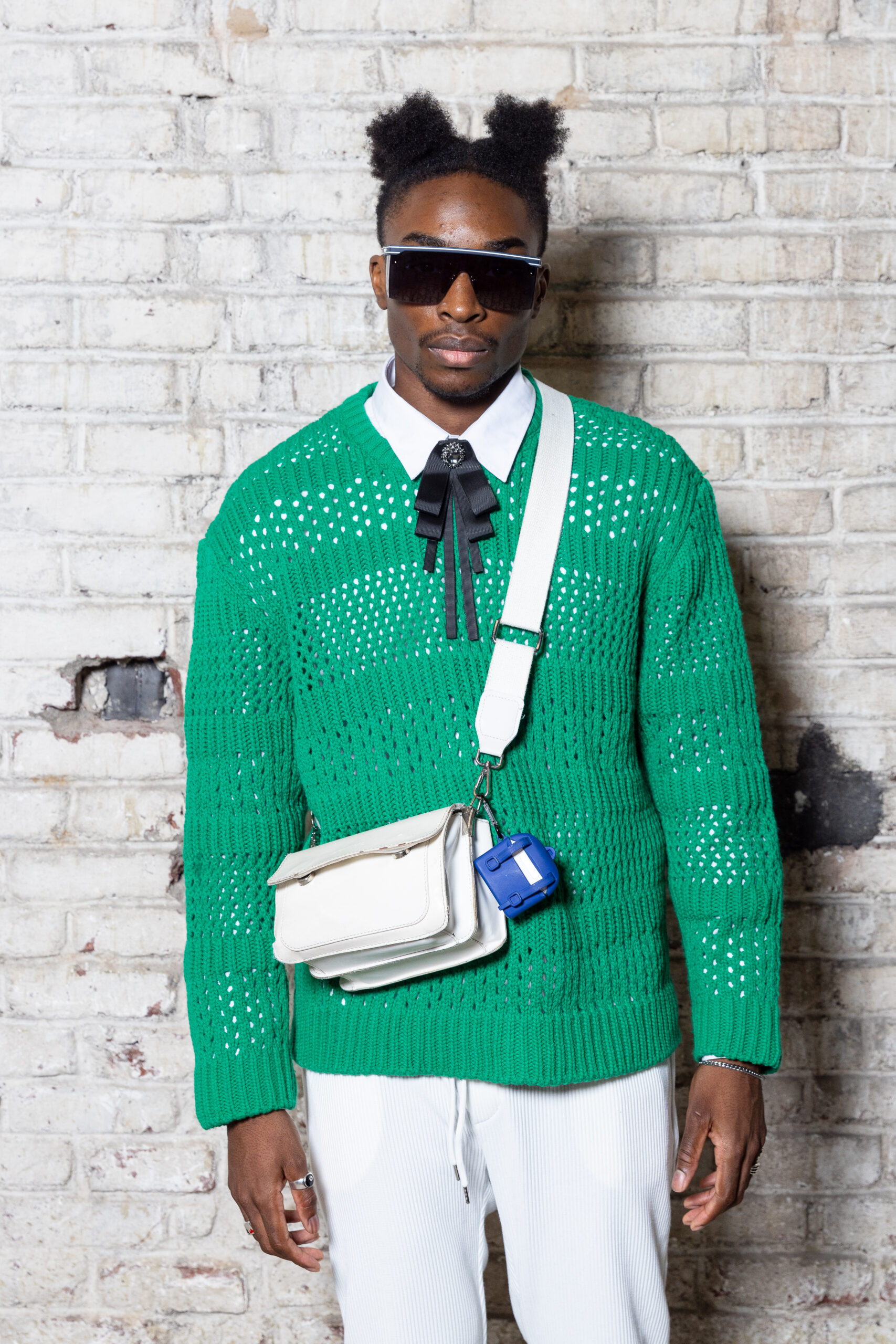 La collection est également marquée par la déconstruction et la juxtaposition des structures de la mode, créant un effet dynamique et provocateur. Ces éléments reflètent l’esprit urgent, rebelle et non-conformiste de cette génération.