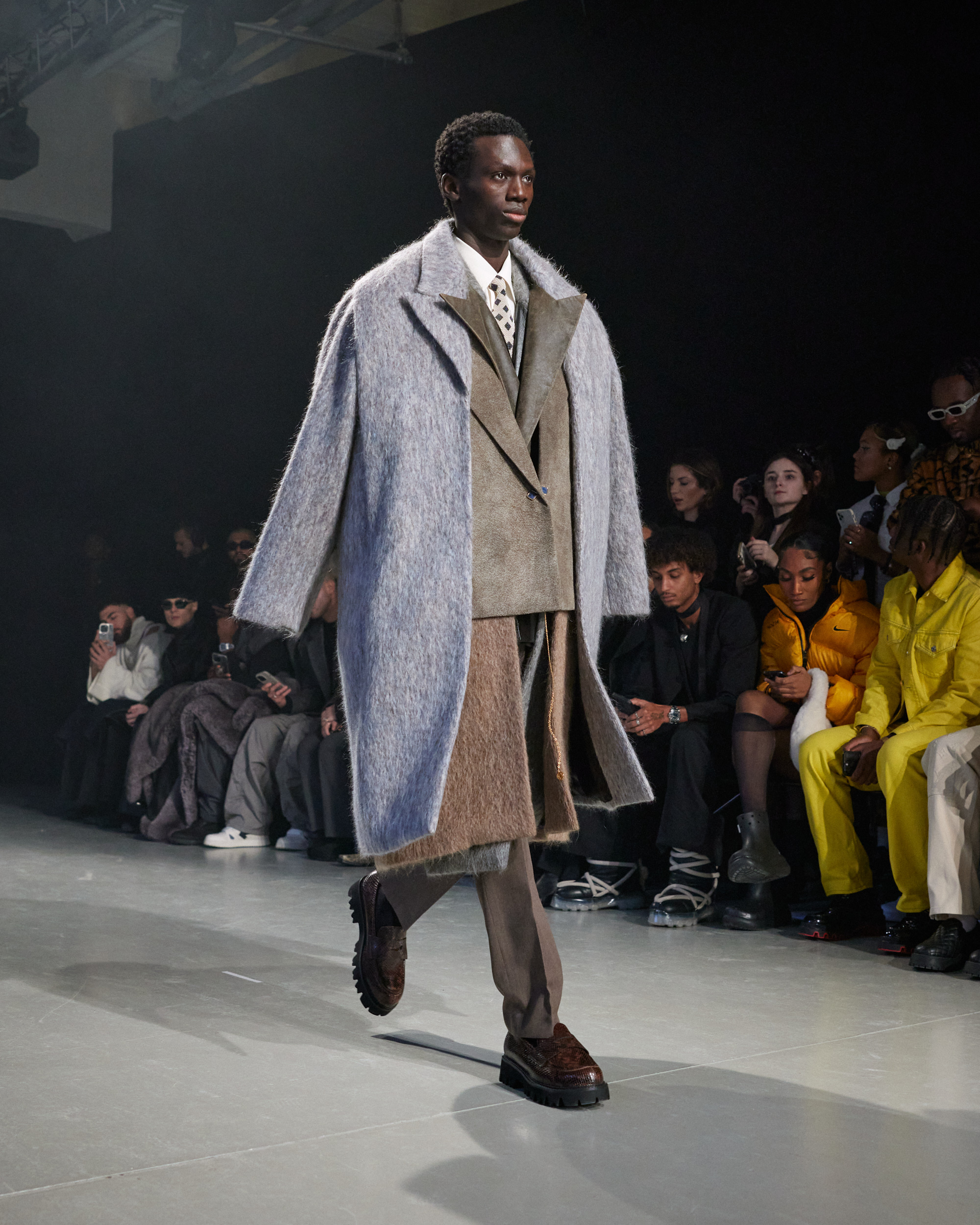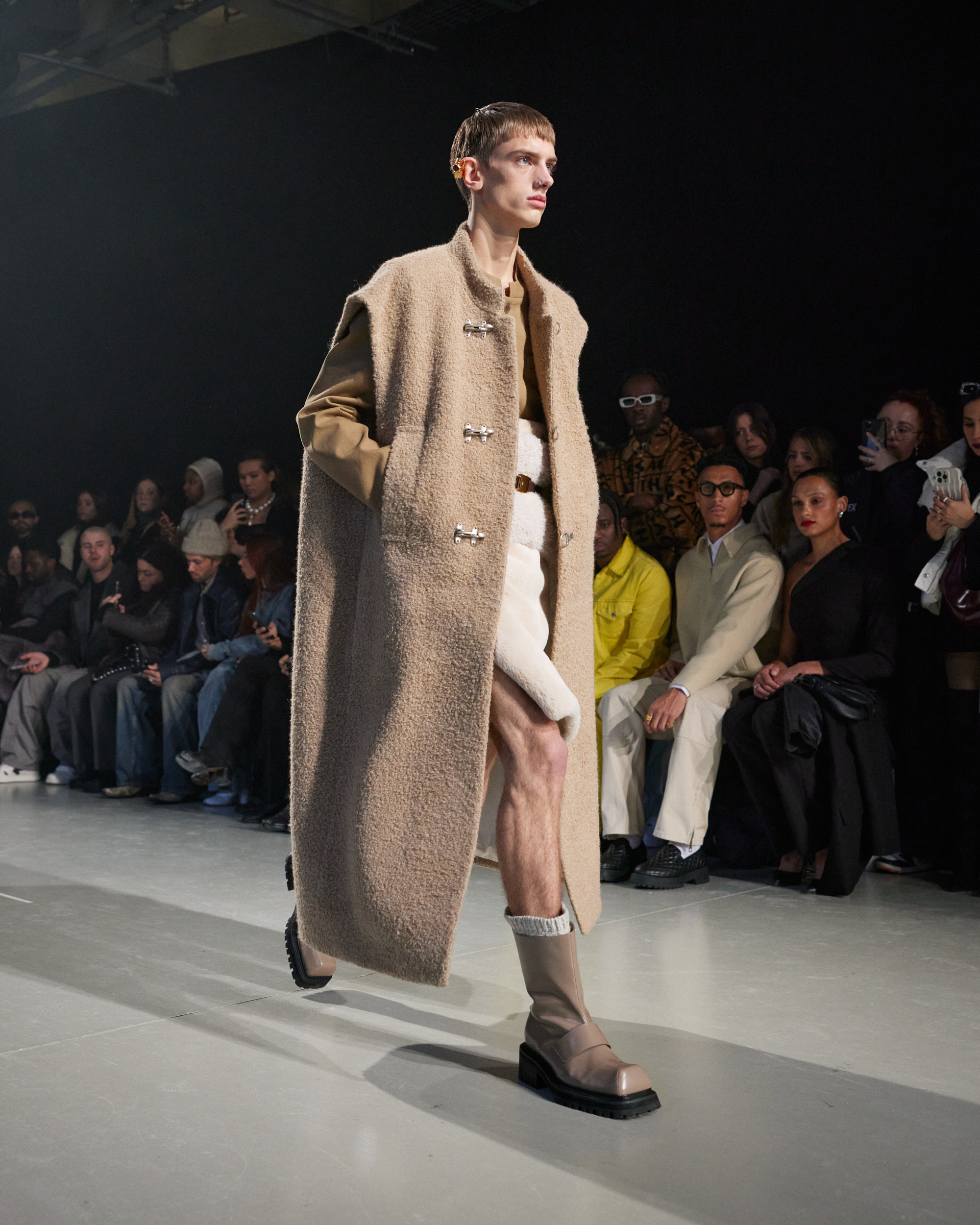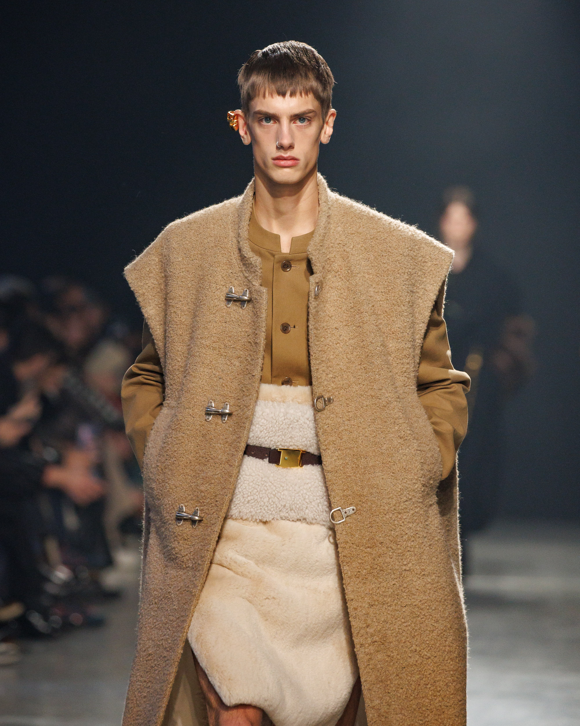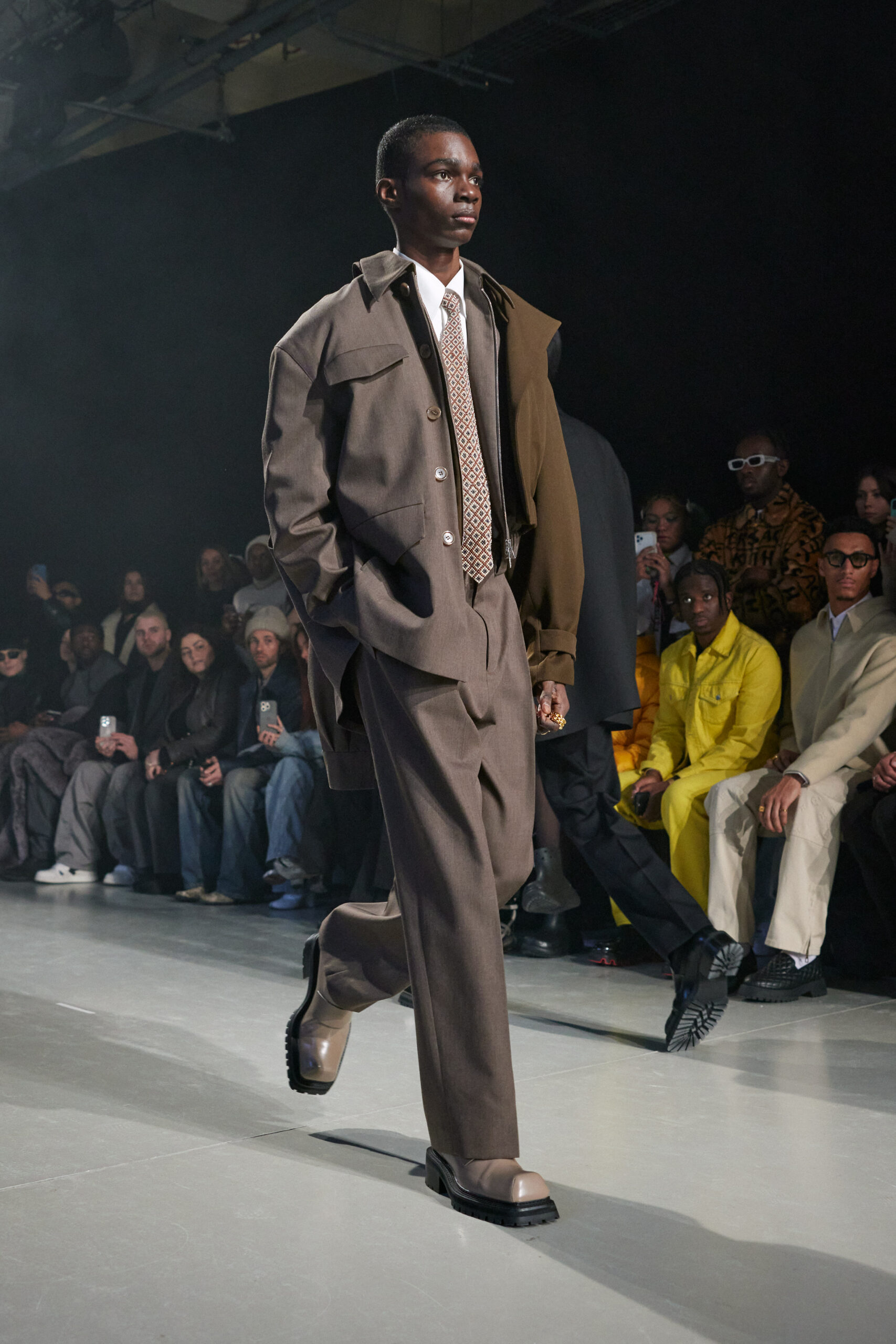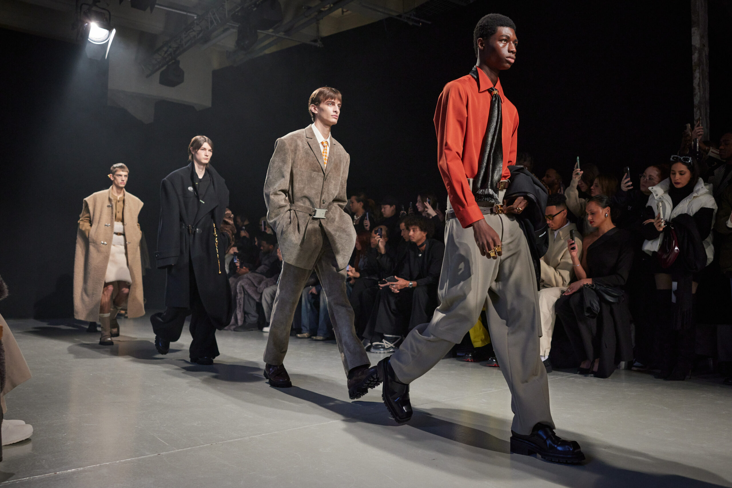La collection est également marquée par la déconstruction et la juxtaposition des structures de la mode, créant un effet dynamique et provocateur. Ces éléments reflètent l’esprit urgent, rebelle et non-conformiste de cette génération.