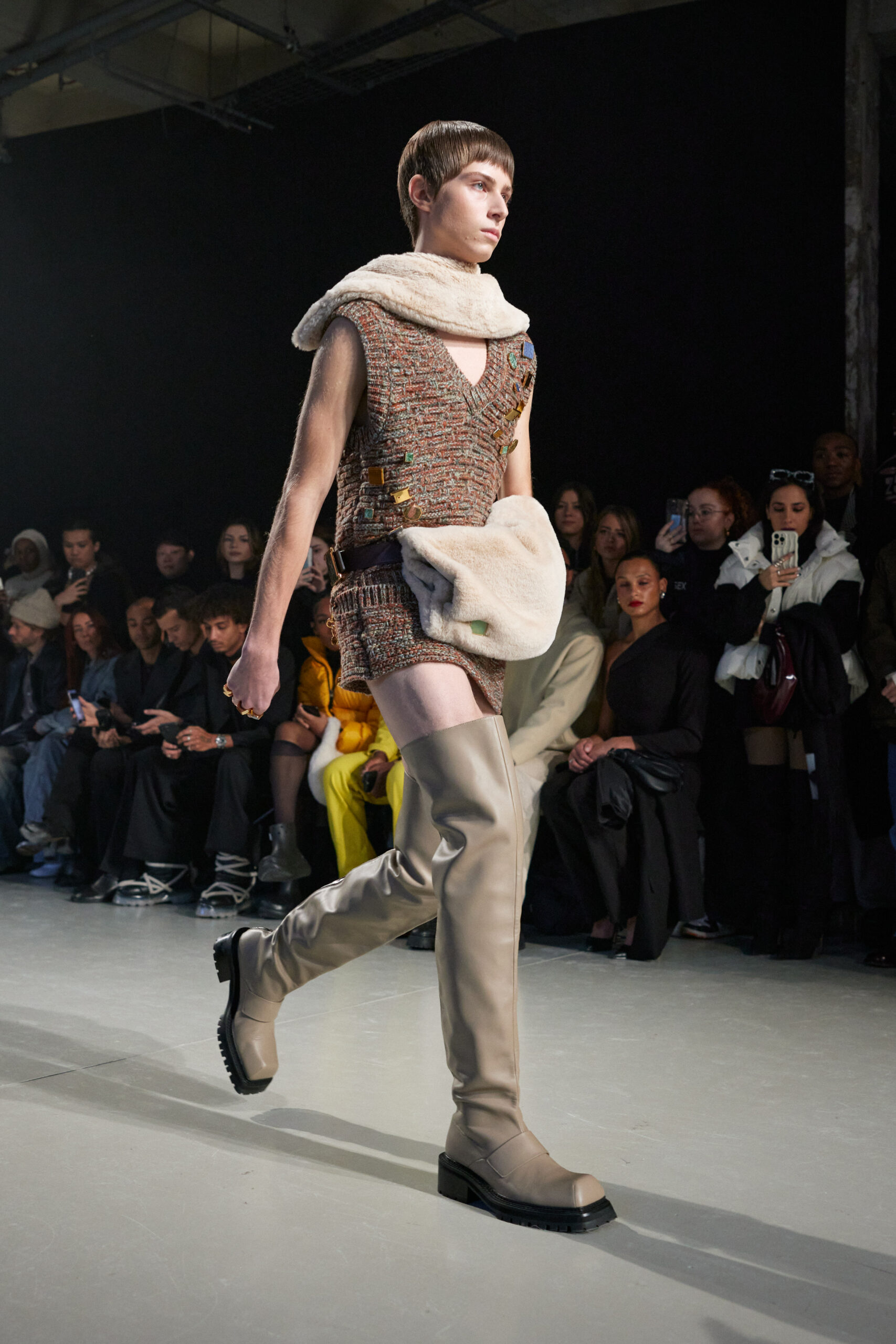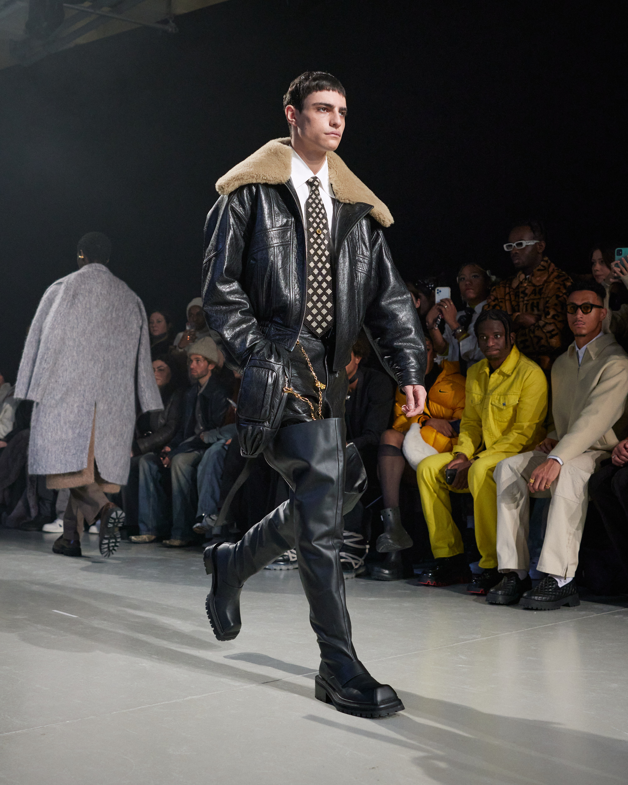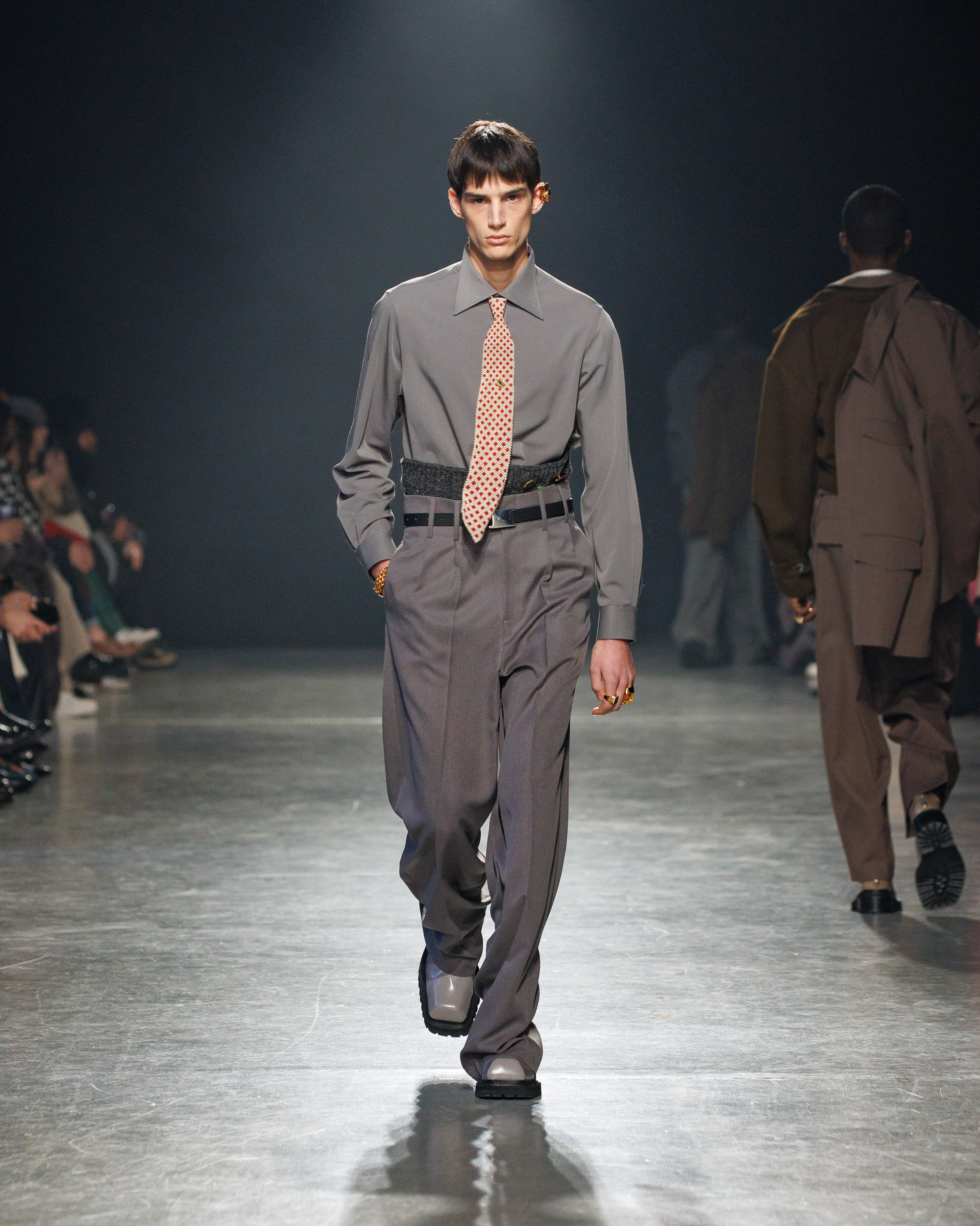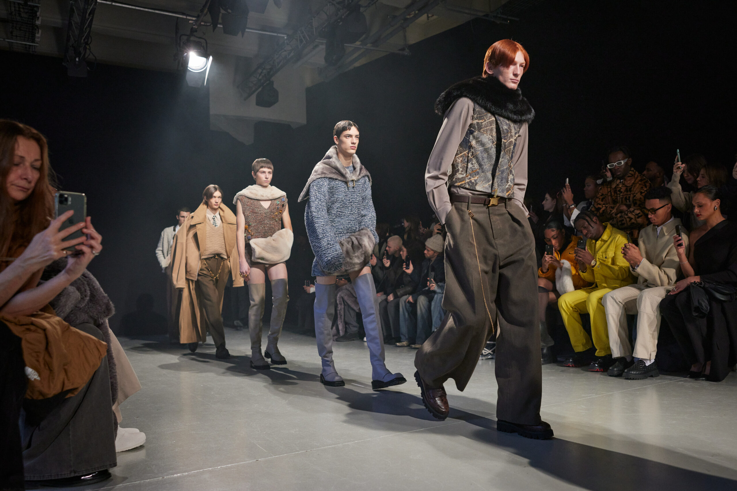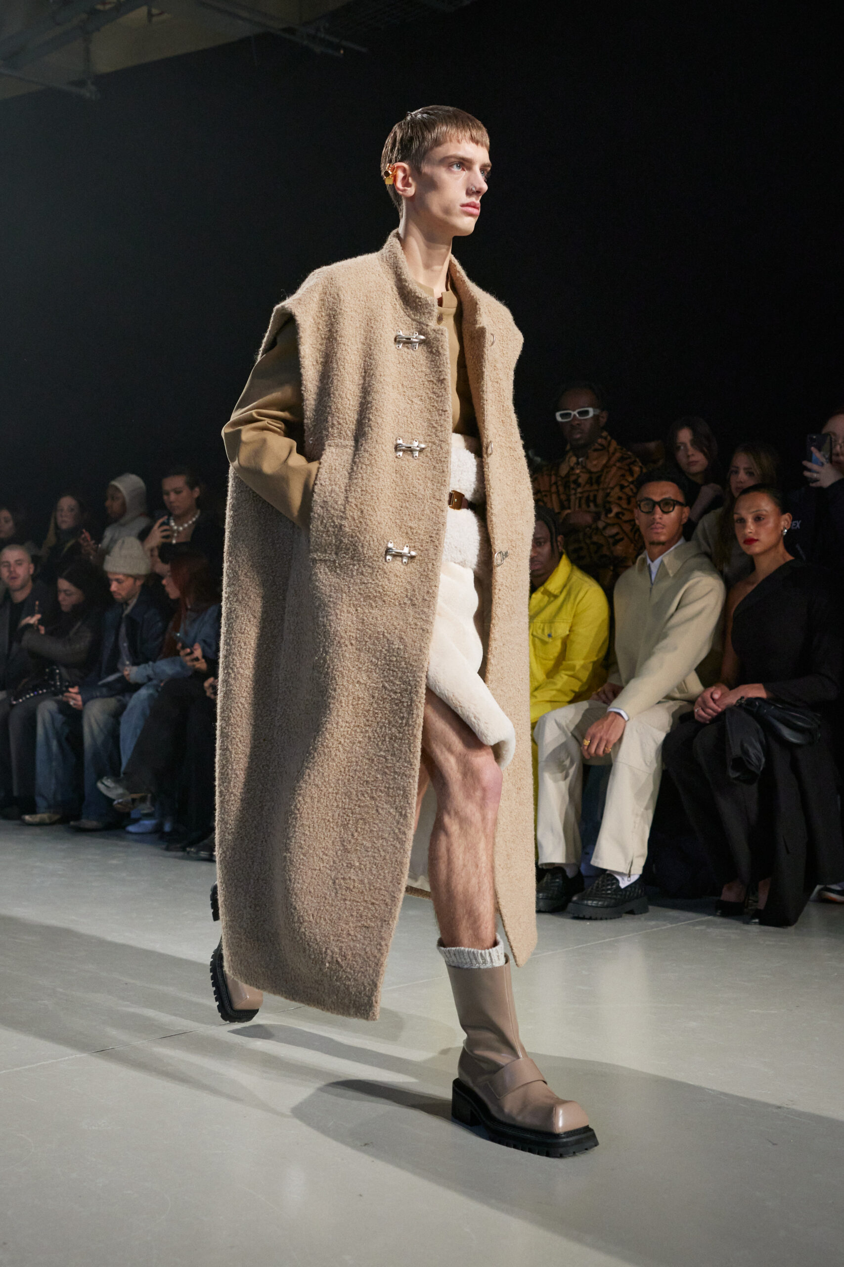 La collection est également marquée par la déconstruction et la juxtaposition des structures de la mode, créant un effet dynamique et provocateur. Ces éléments reflètent l’esprit urgent, rebelle et non-conformiste de cette génération.
