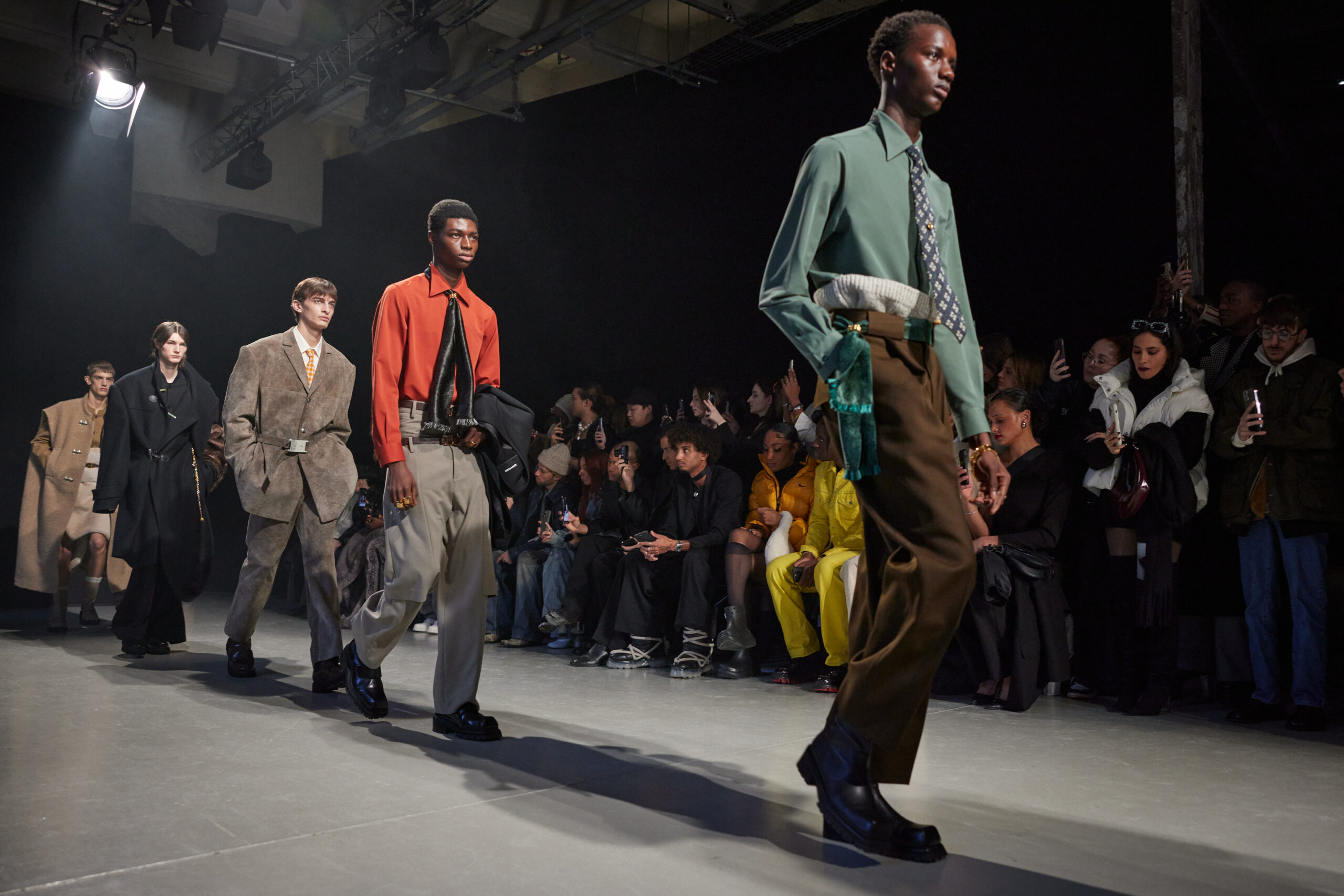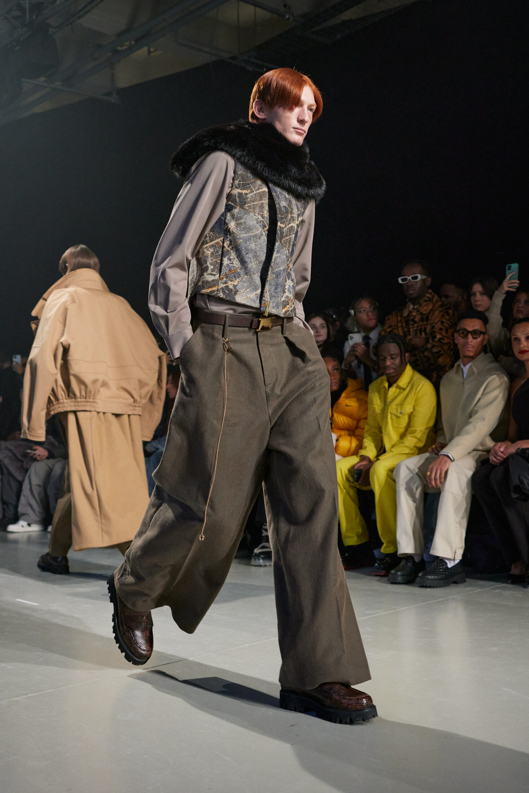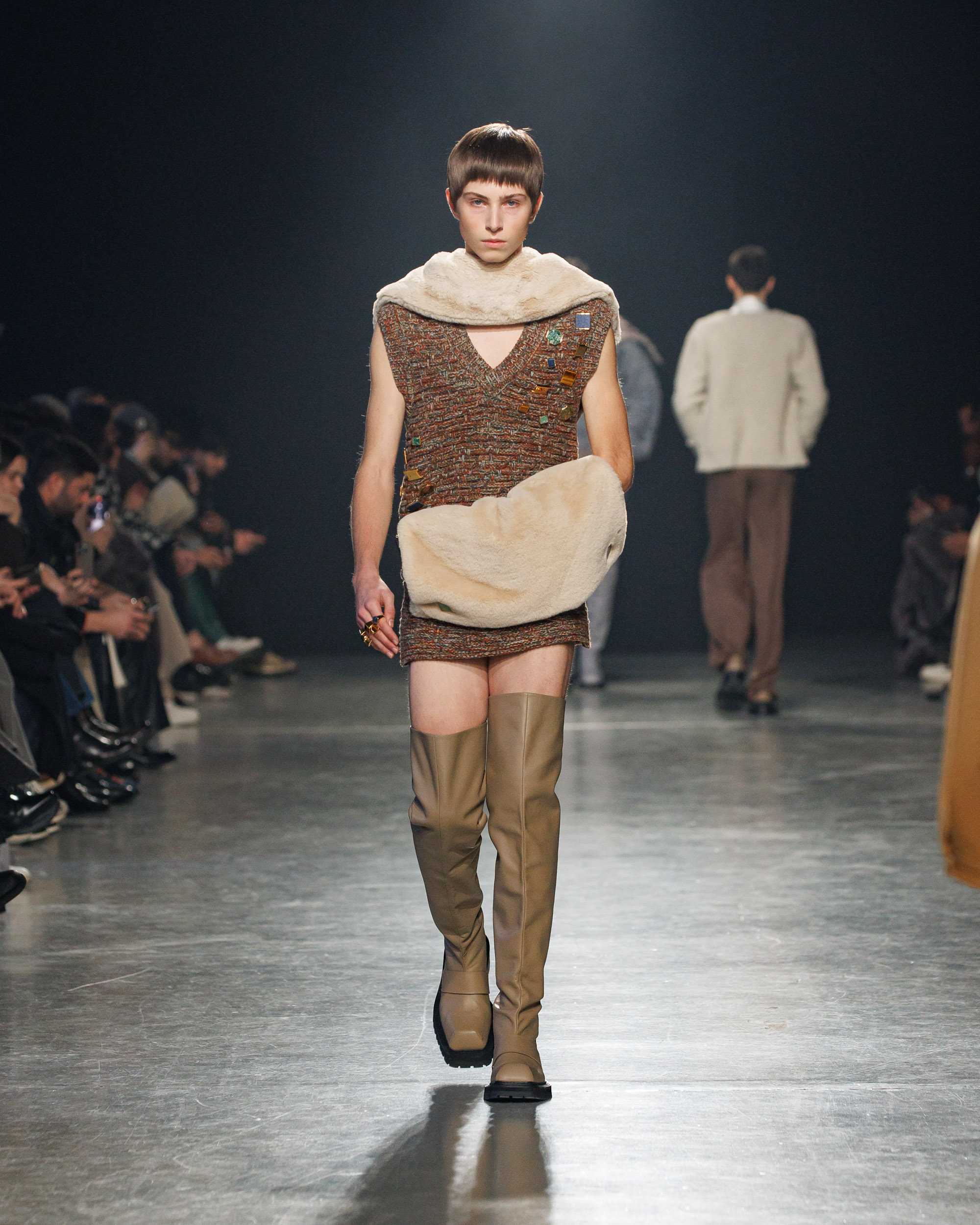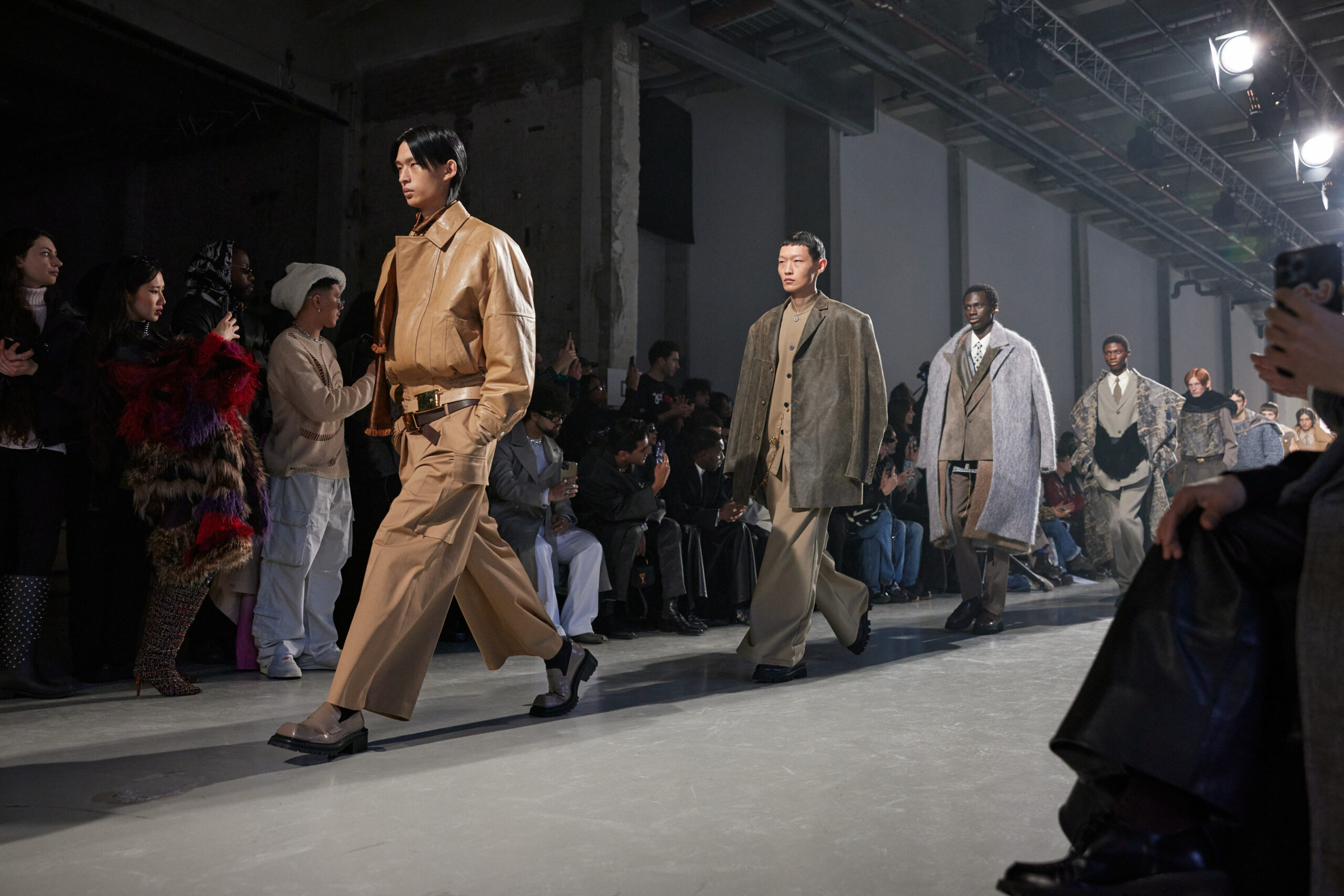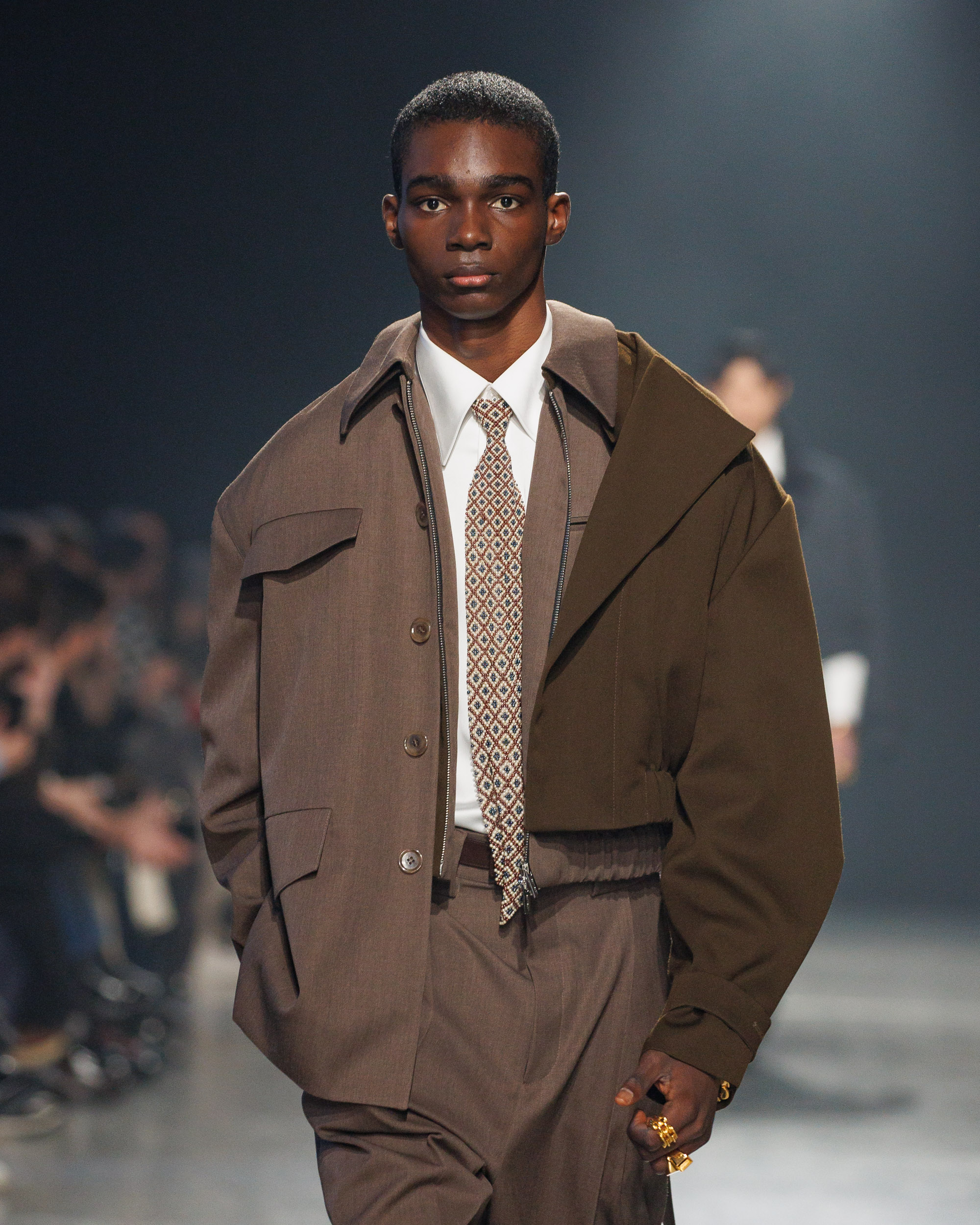 La collection est également marquée par la déconstruction et la juxtaposition des structures de la mode, créant un effet dynamique et provocateur. Ces éléments reflètent l’esprit urgent, rebelle et non-conformiste de cette génération.