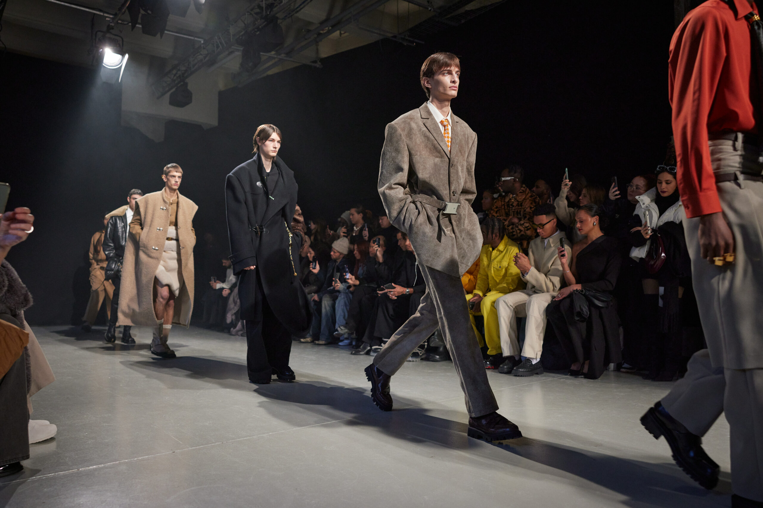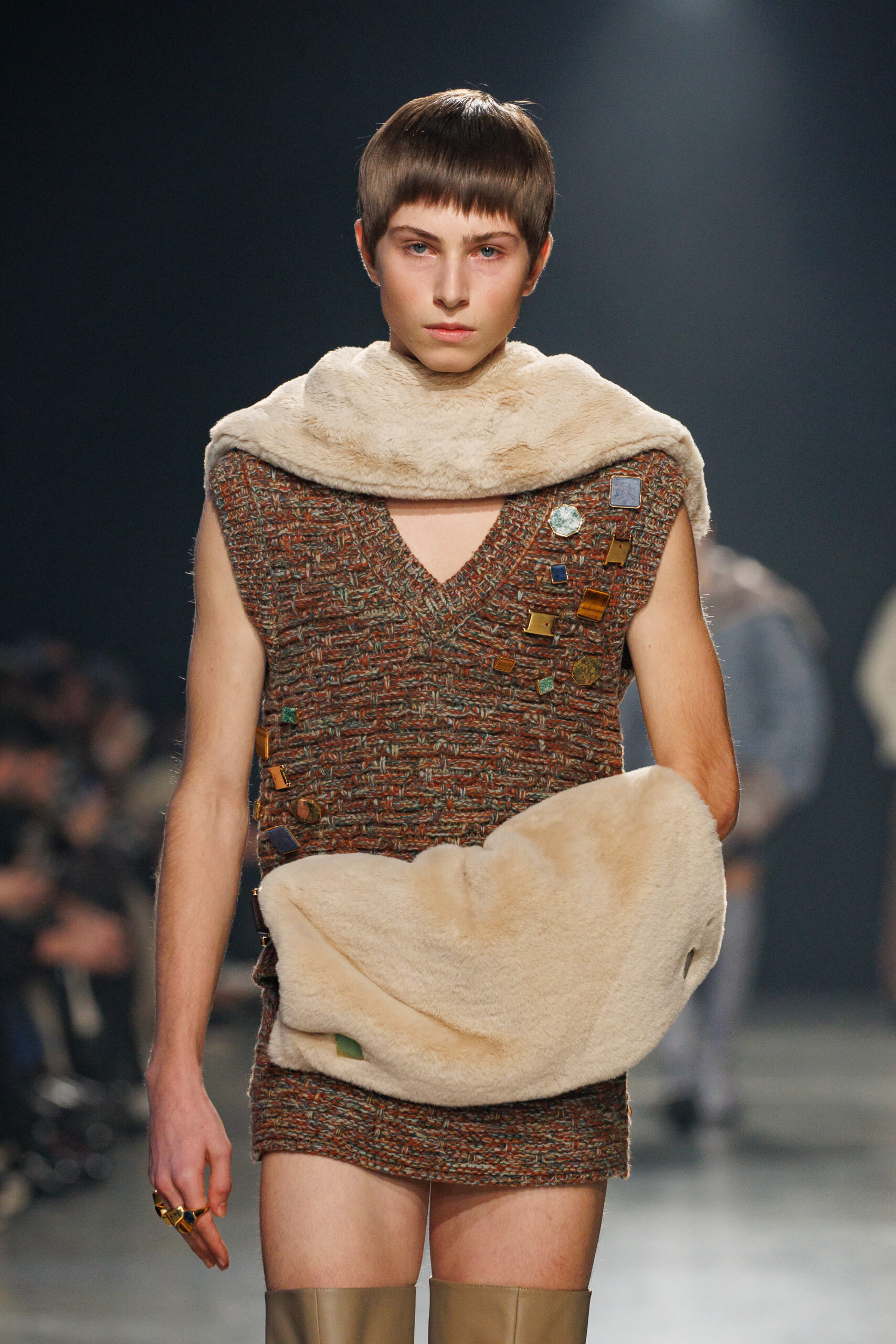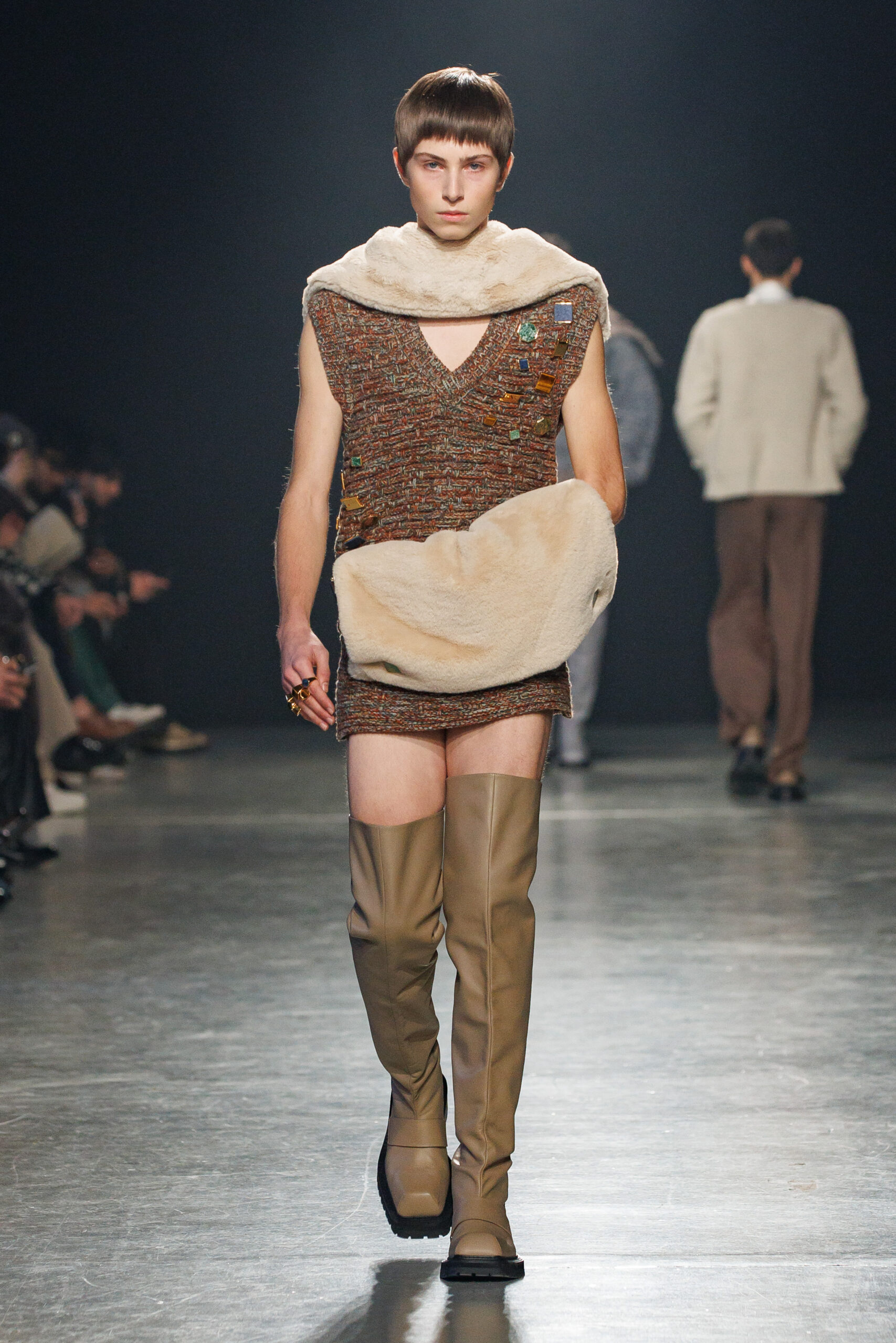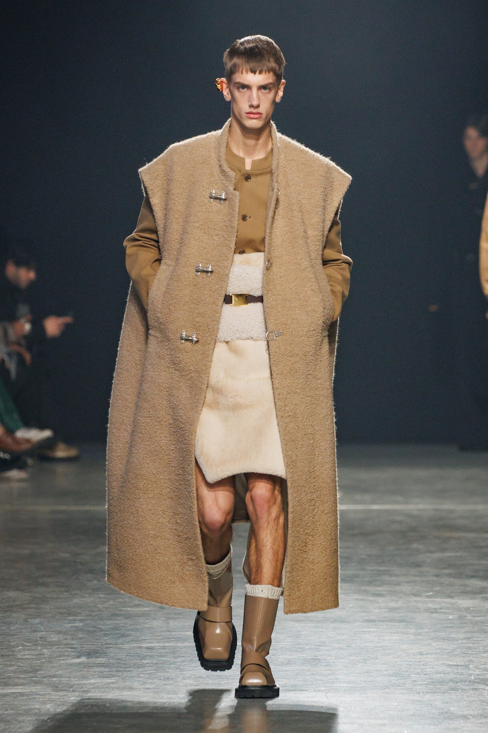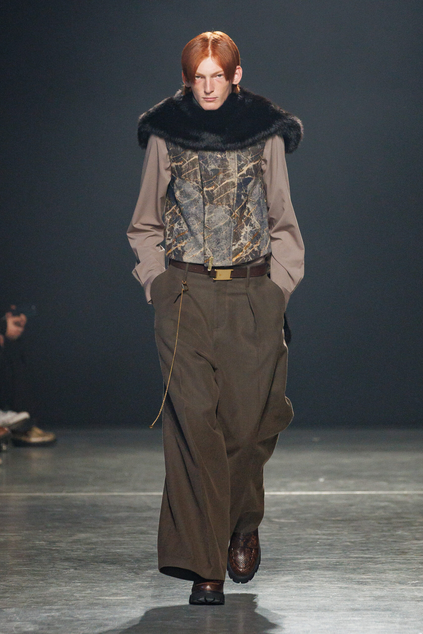 La collection est également marquée par la déconstruction et la juxtaposition des structures de la mode, créant un effet dynamique et provocateur. Ces éléments reflètent l’esprit urgent, rebelle et non-conformiste de cette génération.