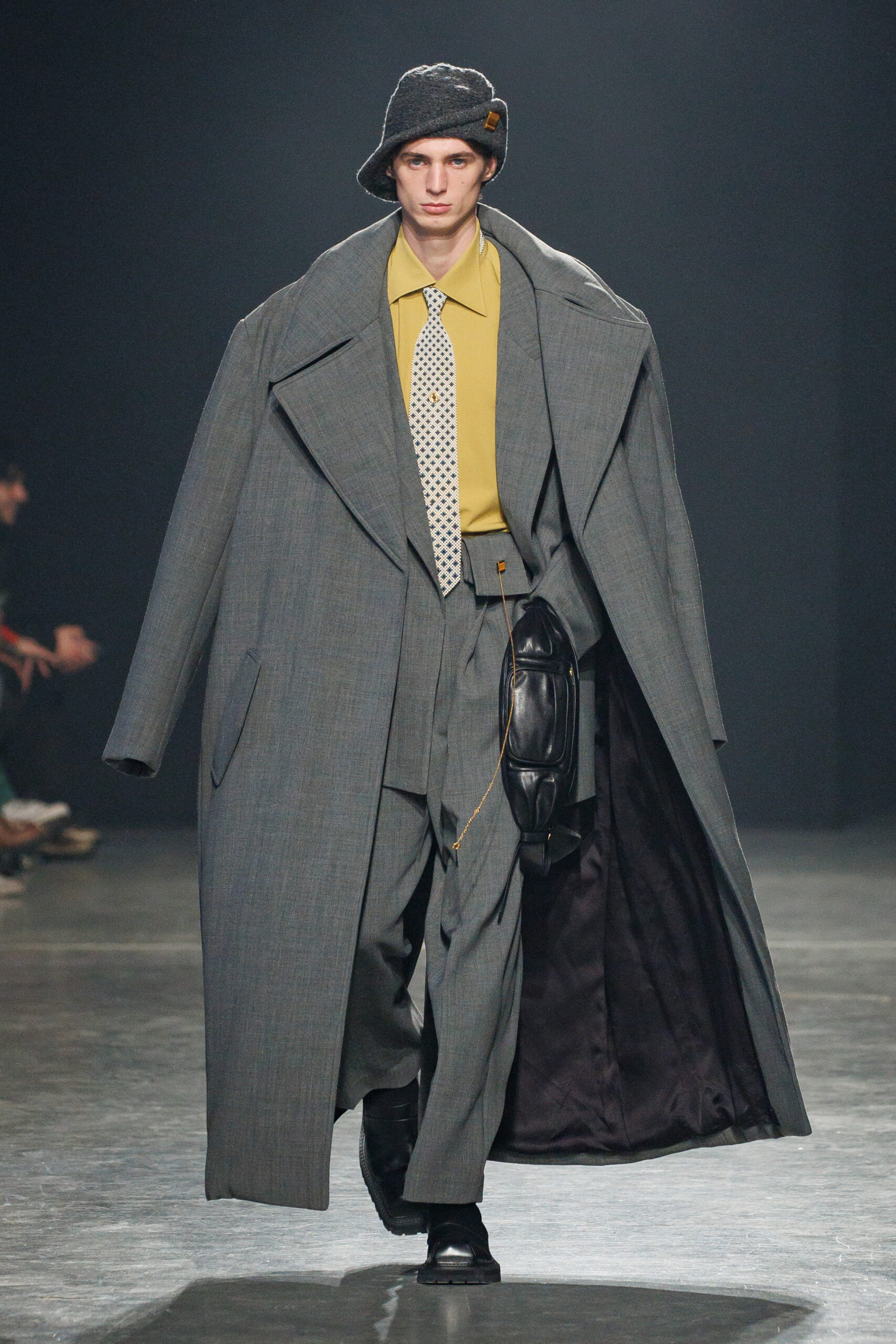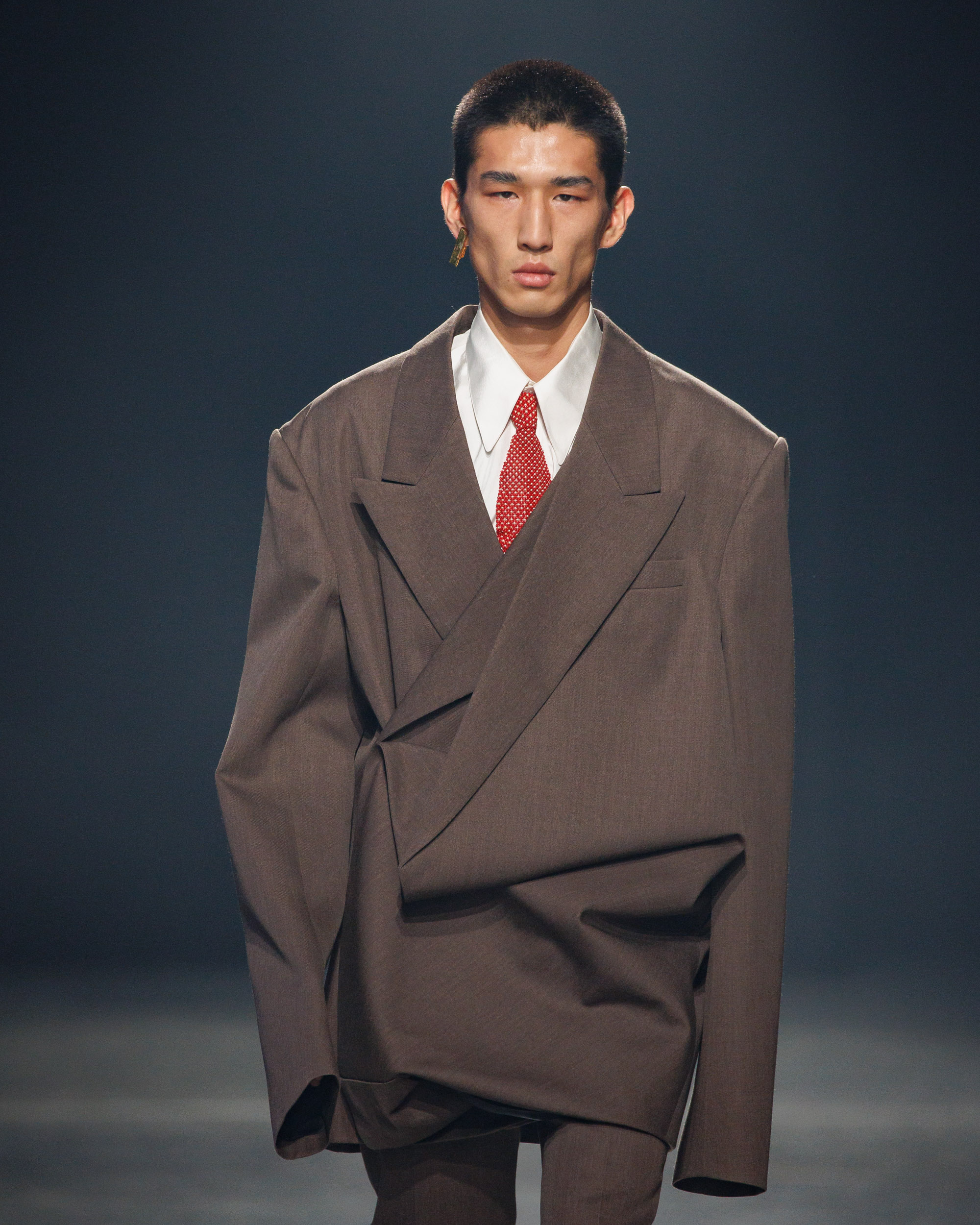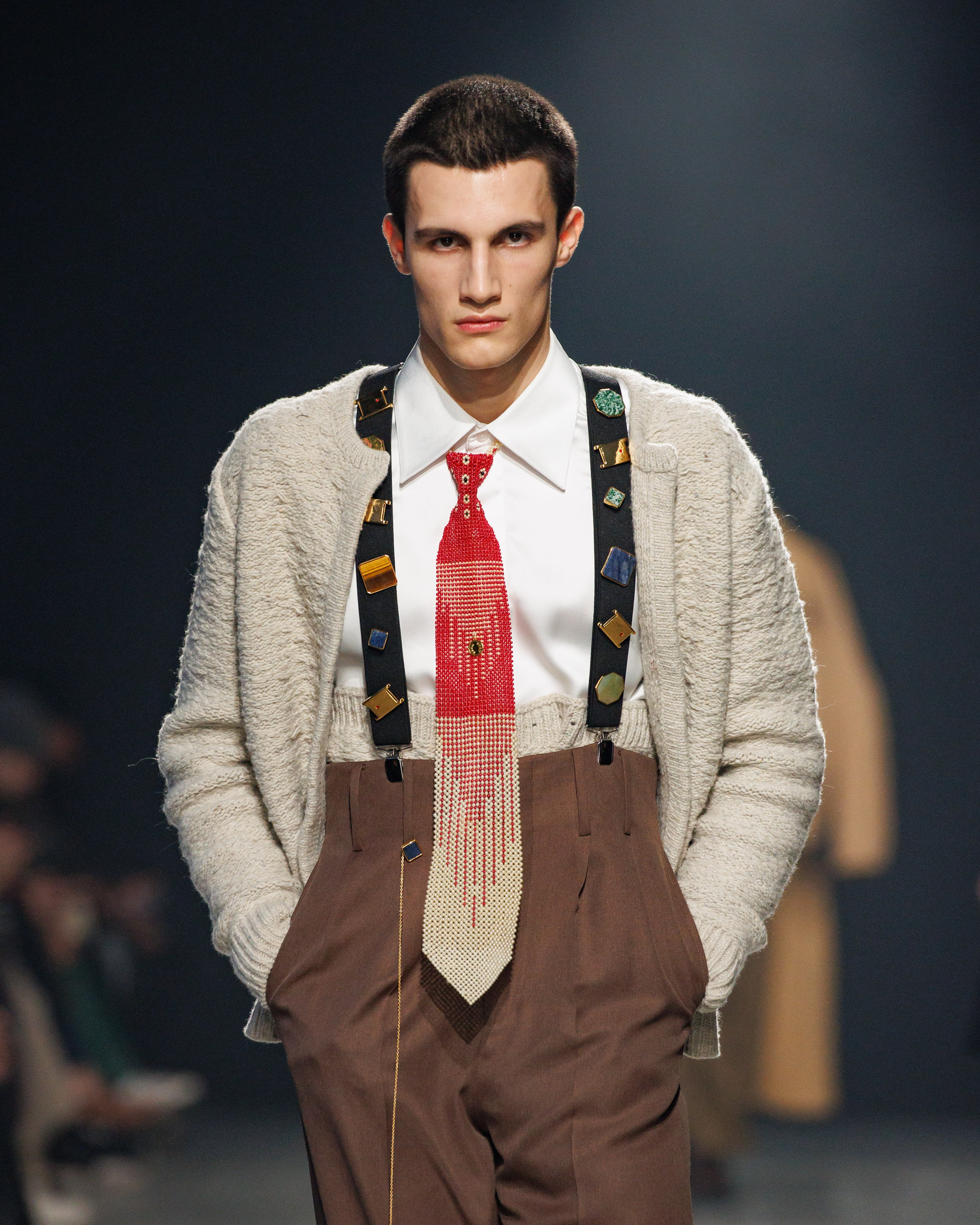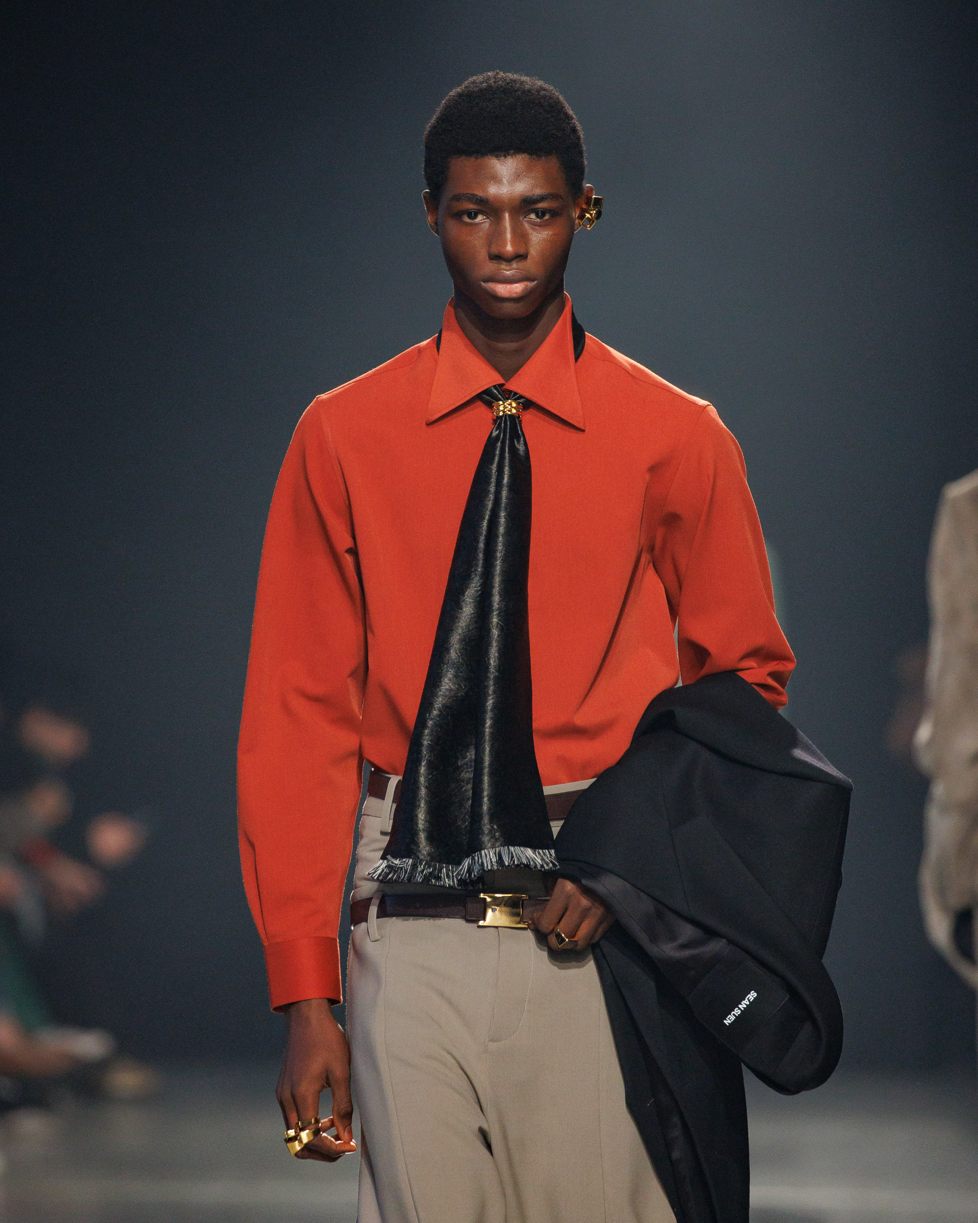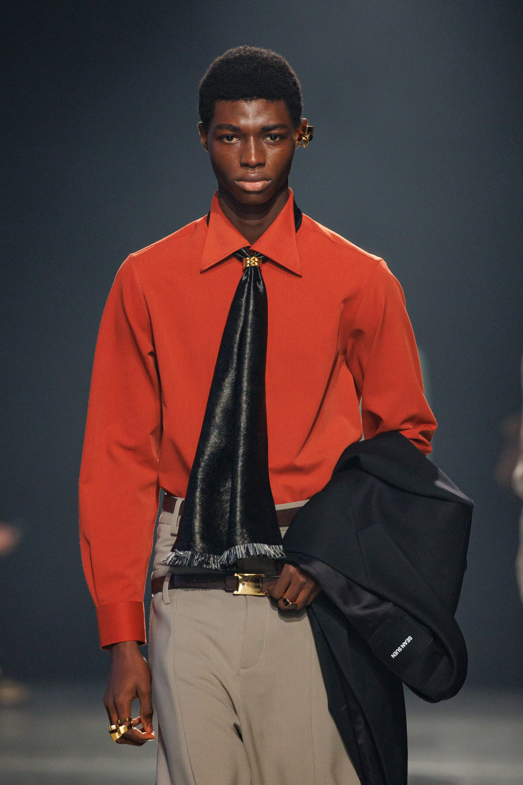 Sean Suen rend hommage aux classiques de son temps en revisitant des pièces emblématiques telles que les costumes en laine, les manteaux oversize et les tricots faits main. Il joue sur les contrastes en associant des couleurs vives et des accessoires masculins élaborés aux tons plus sobres comme le noir, le gris, le marron et le vert.