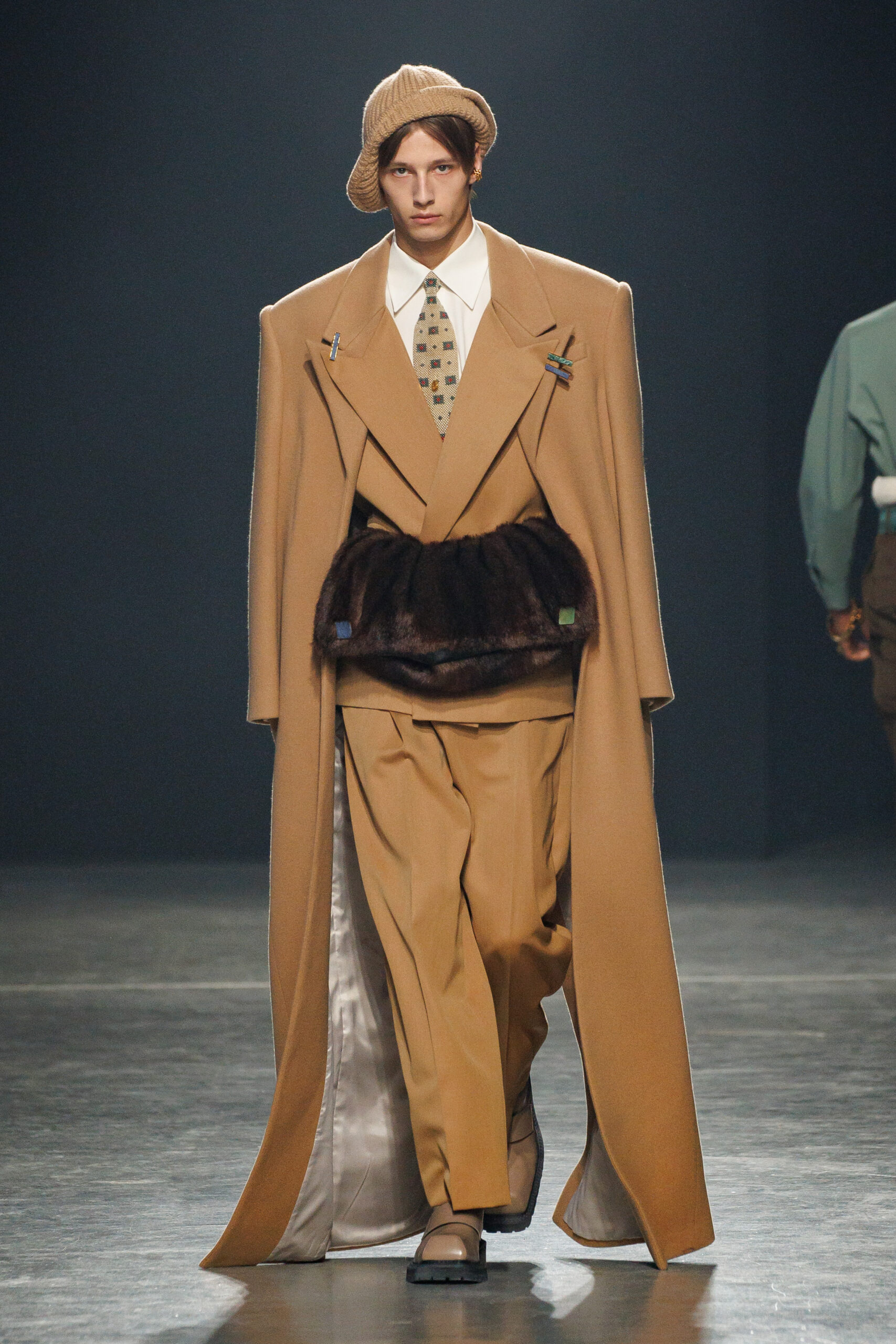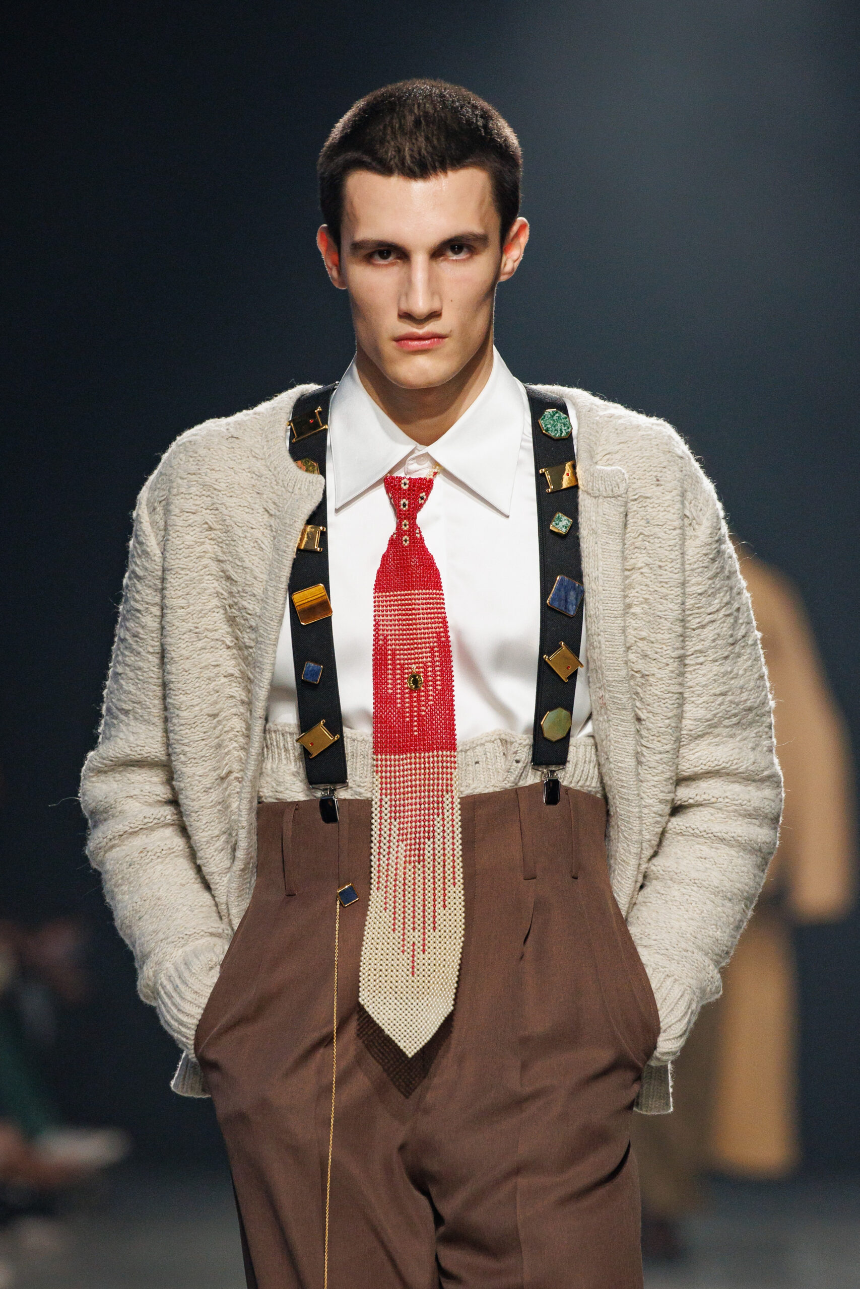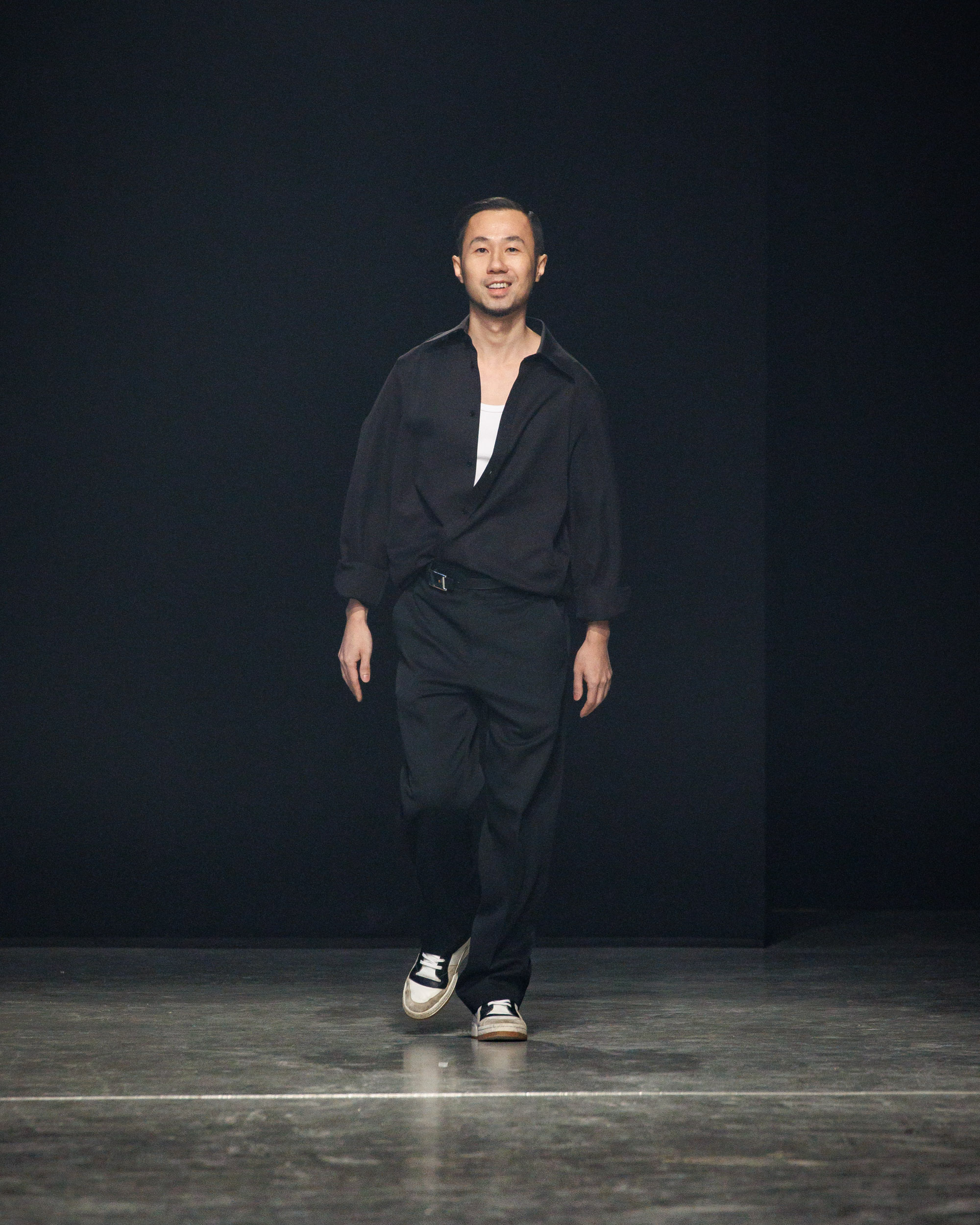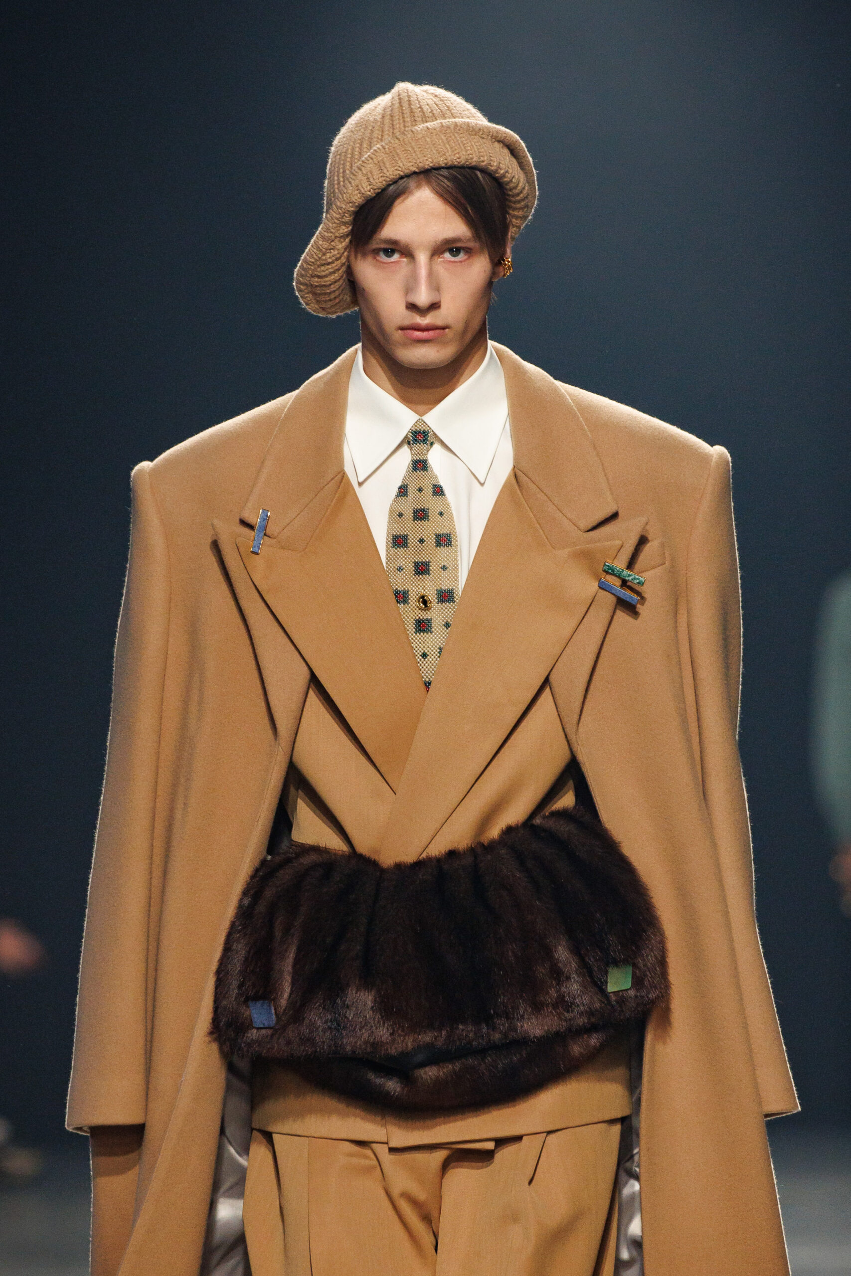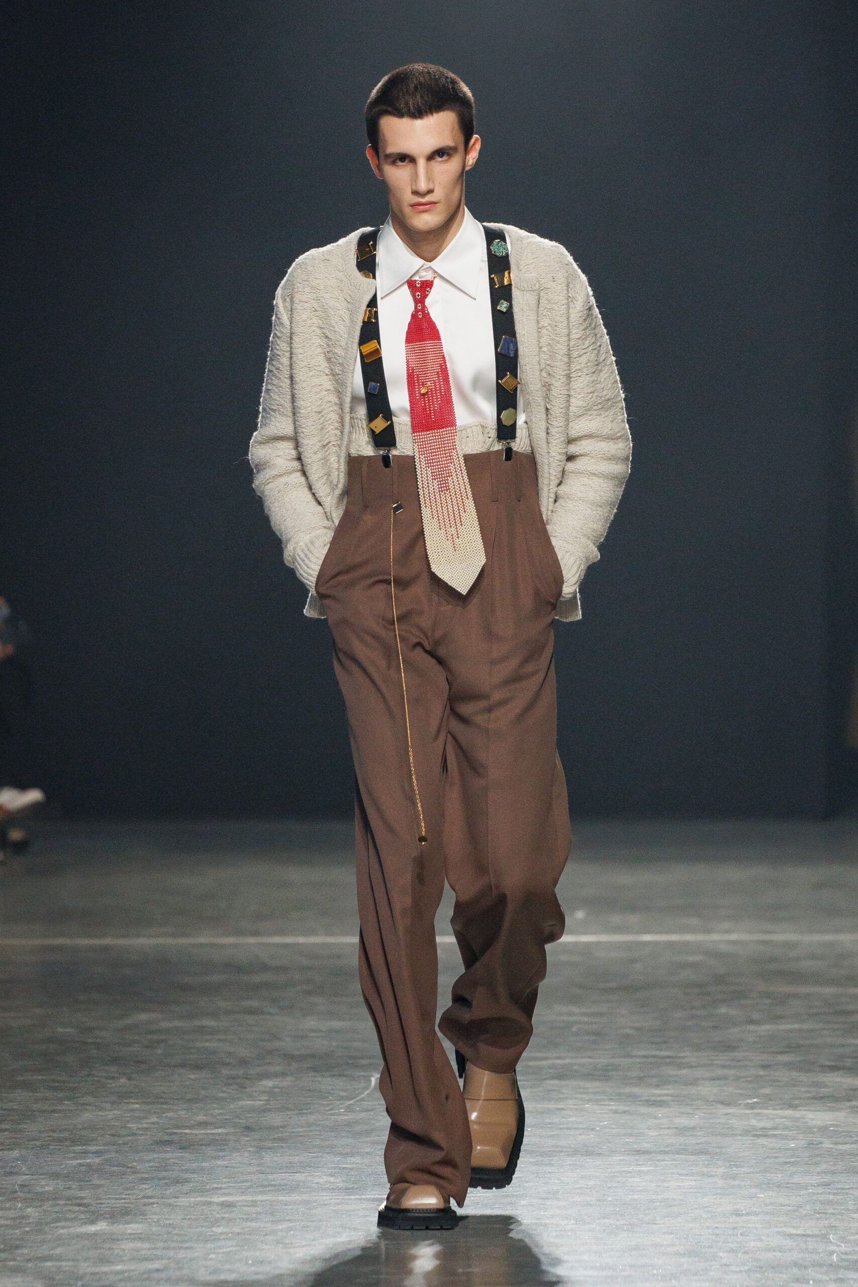 Sean Suen rend hommage aux classiques de son temps en revisitant des pièces emblématiques telles que les costumes en laine, les manteaux oversize et les tricots faits main. Il joue sur les contrastes en associant des couleurs vives et des accessoires masculins élaborés aux tons plus sobres comme le noir, le gris, le marron et le vert.