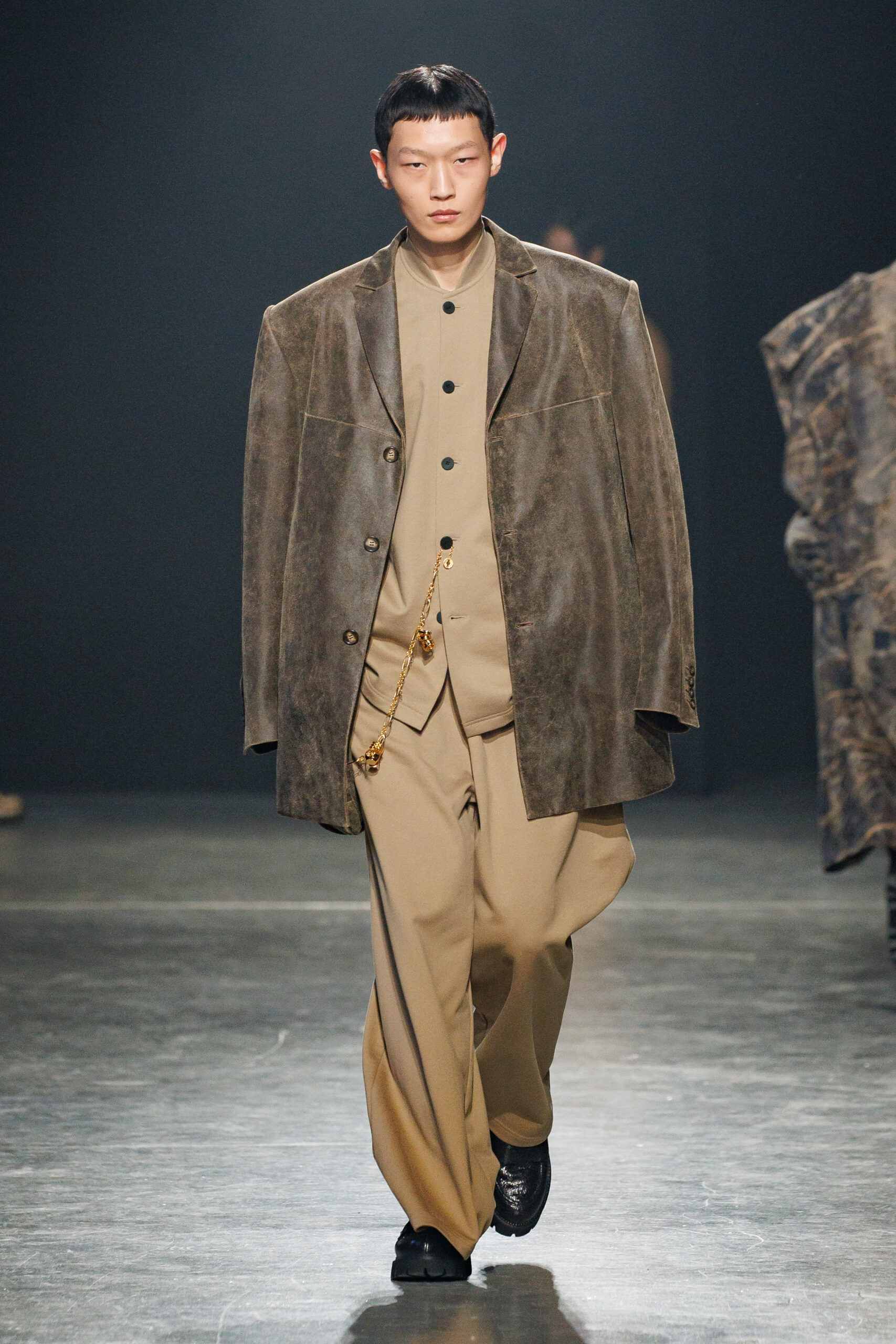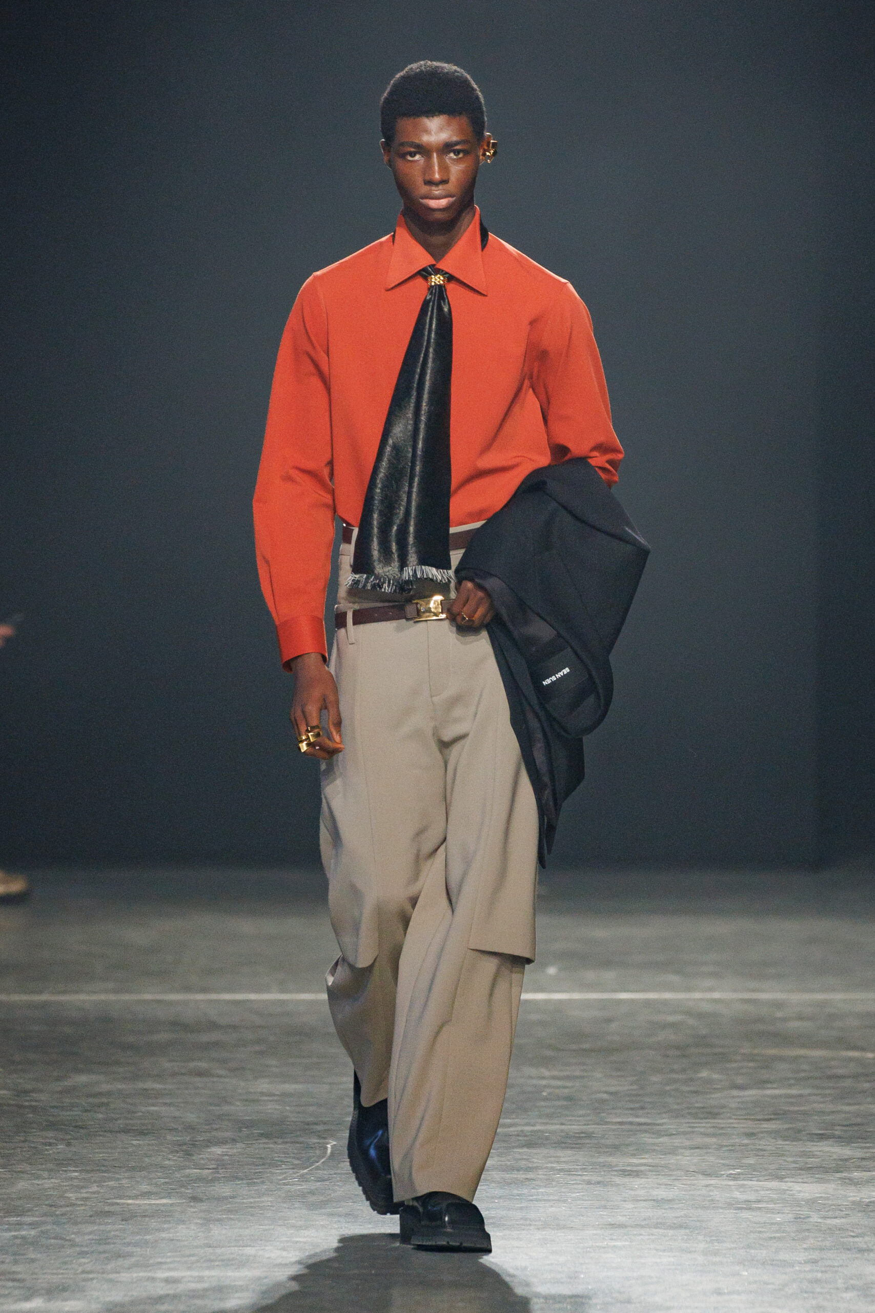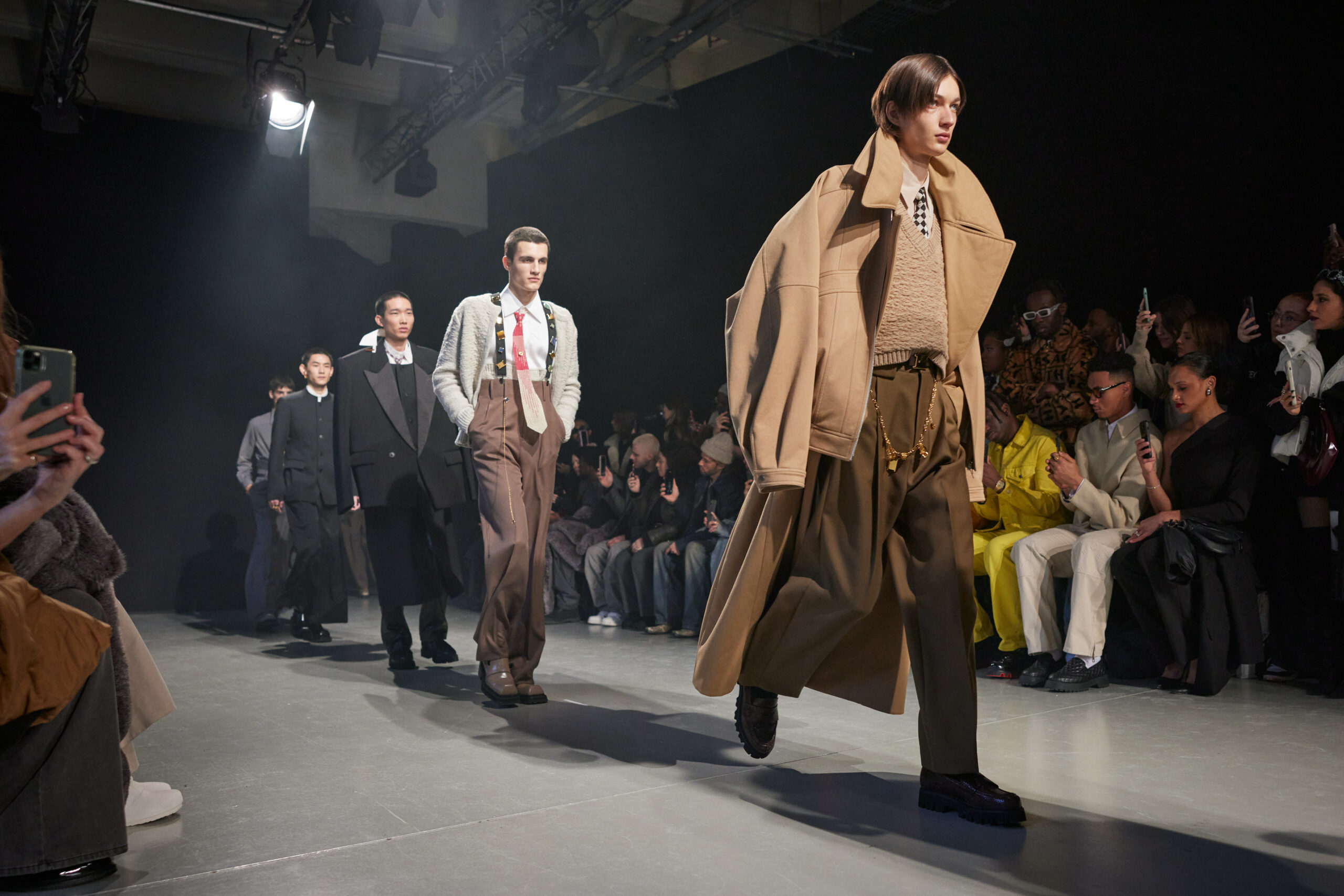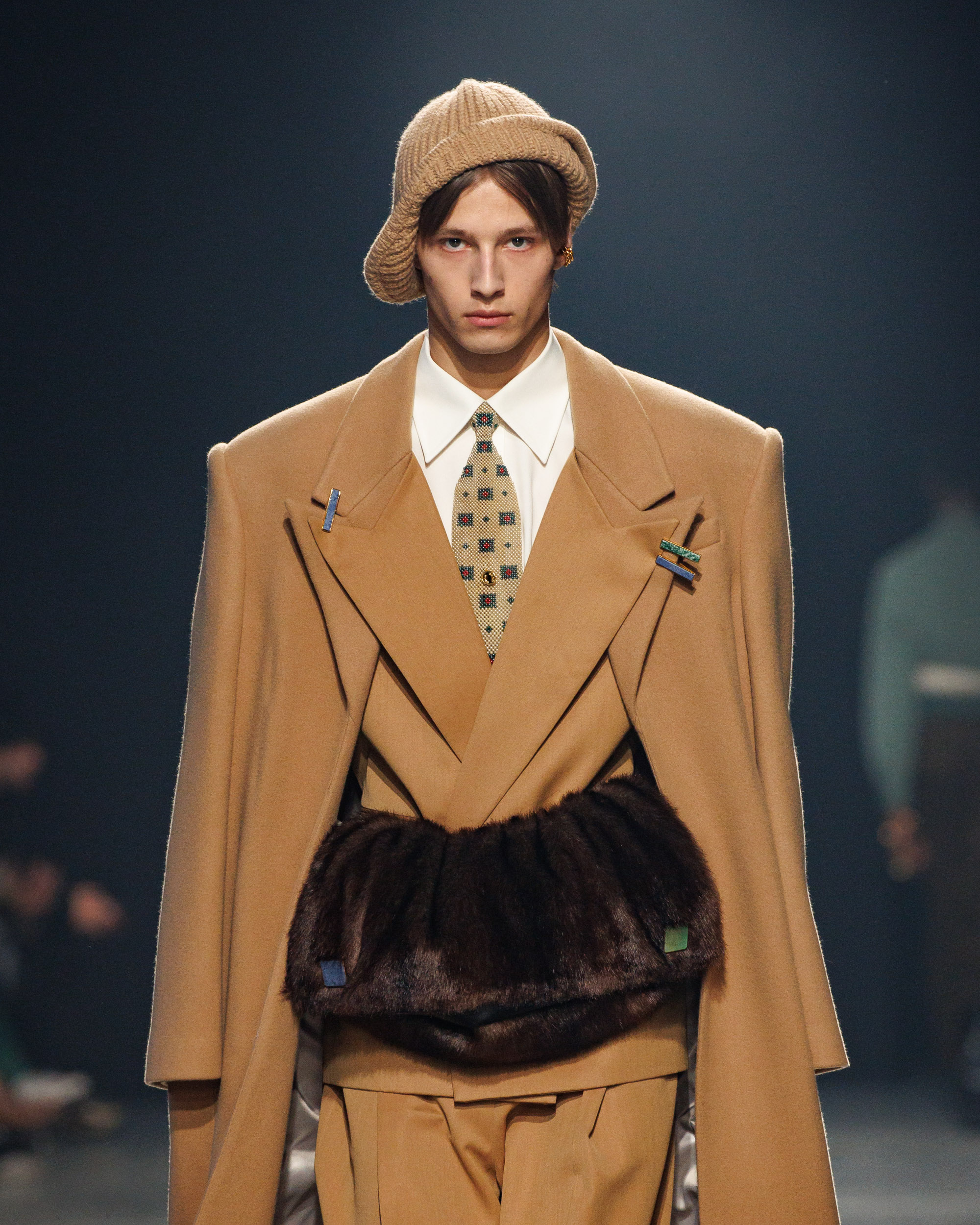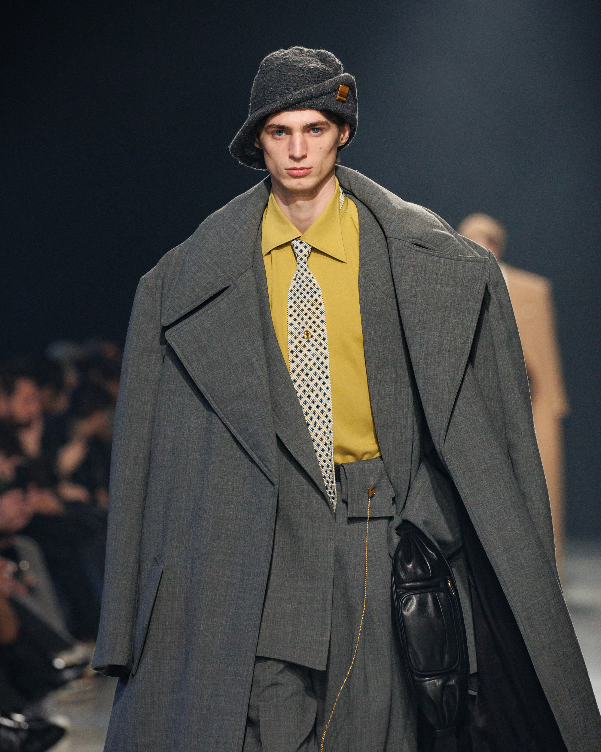 Sean Suen rend hommage aux classiques de son temps en revisitant des pièces emblématiques telles que les costumes en laine, les manteaux oversize et les tricots faits main. Il joue sur les contrastes en associant des couleurs vives et des accessoires masculins élaborés aux tons plus sobres comme le noir, le gris, le marron et le vert.