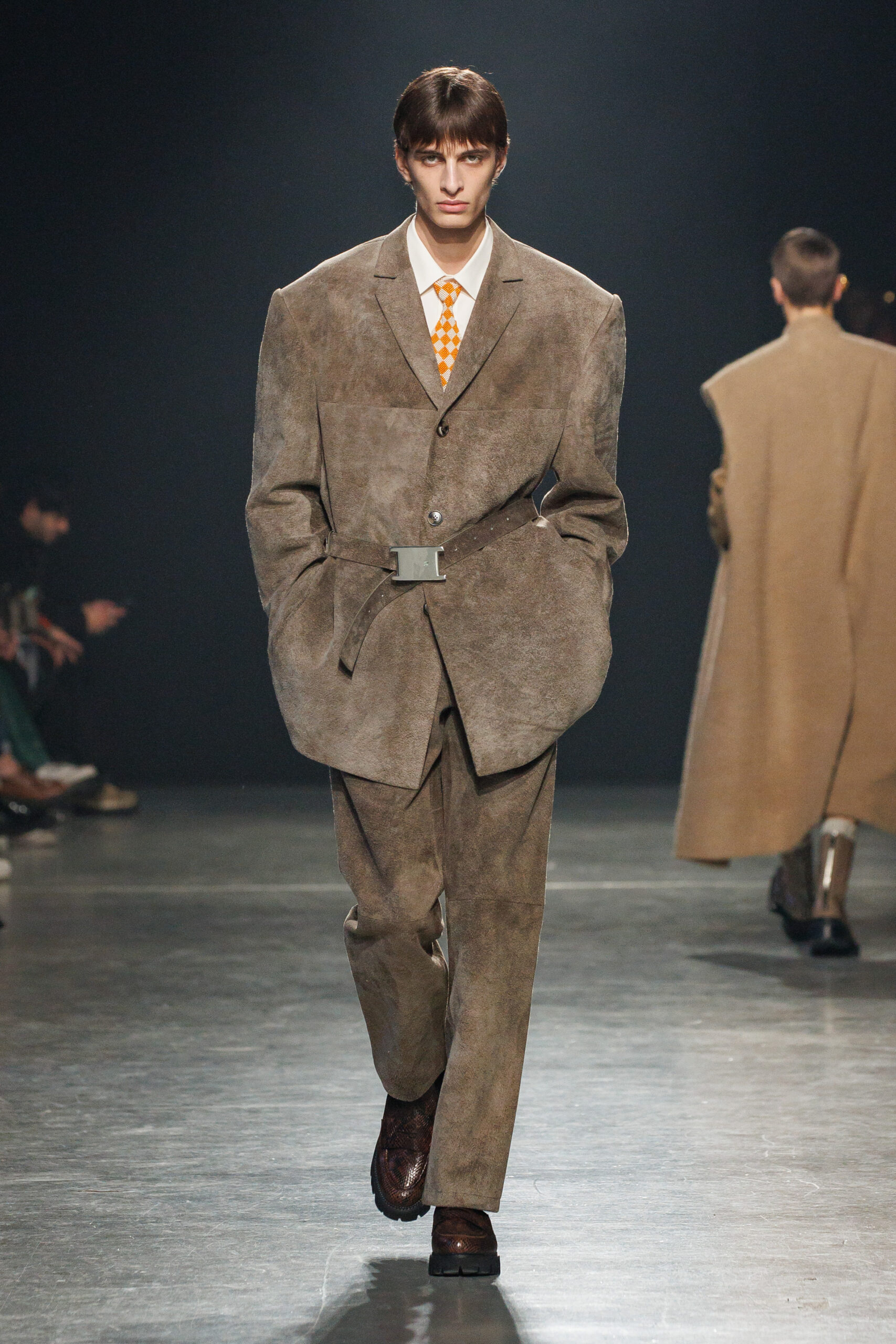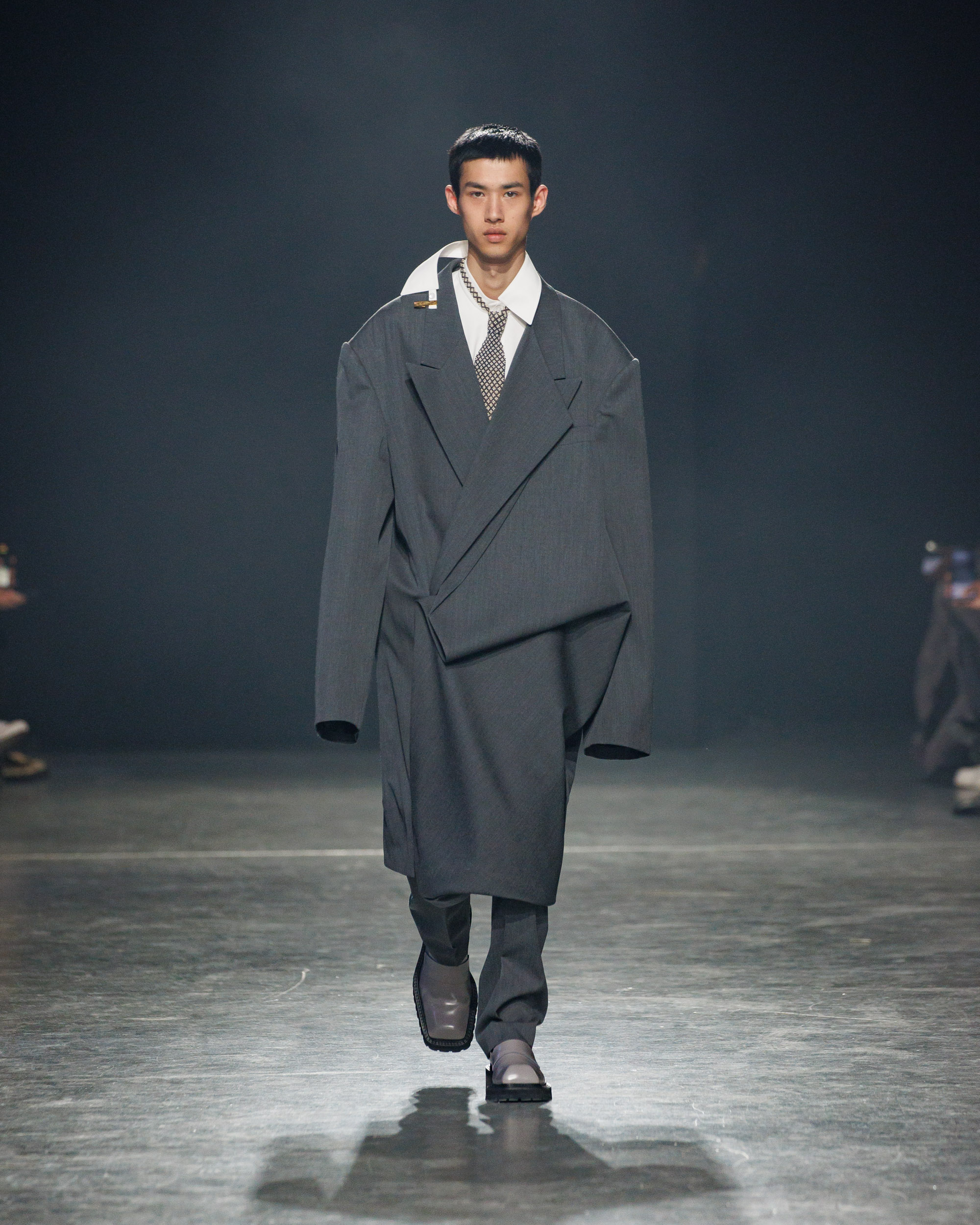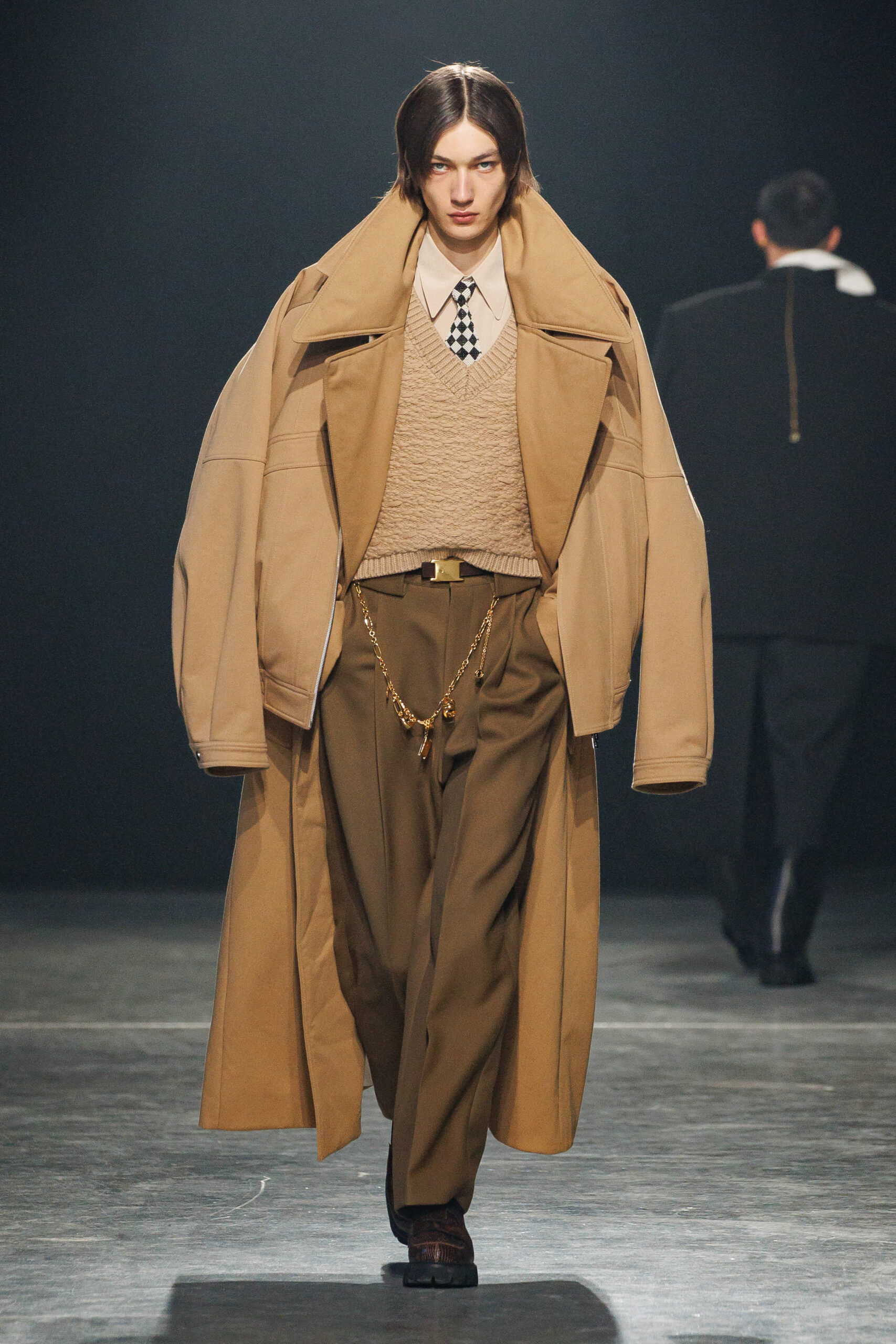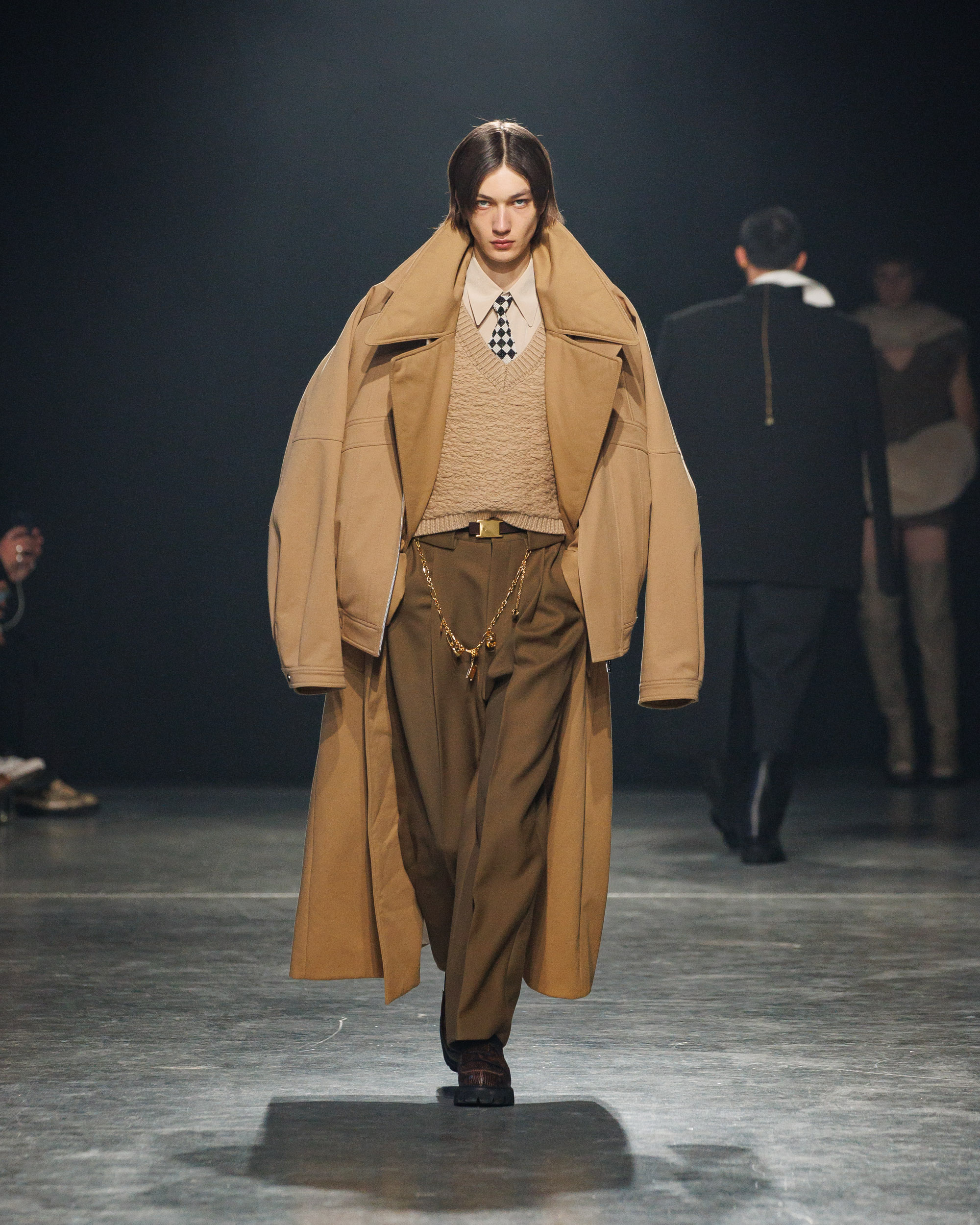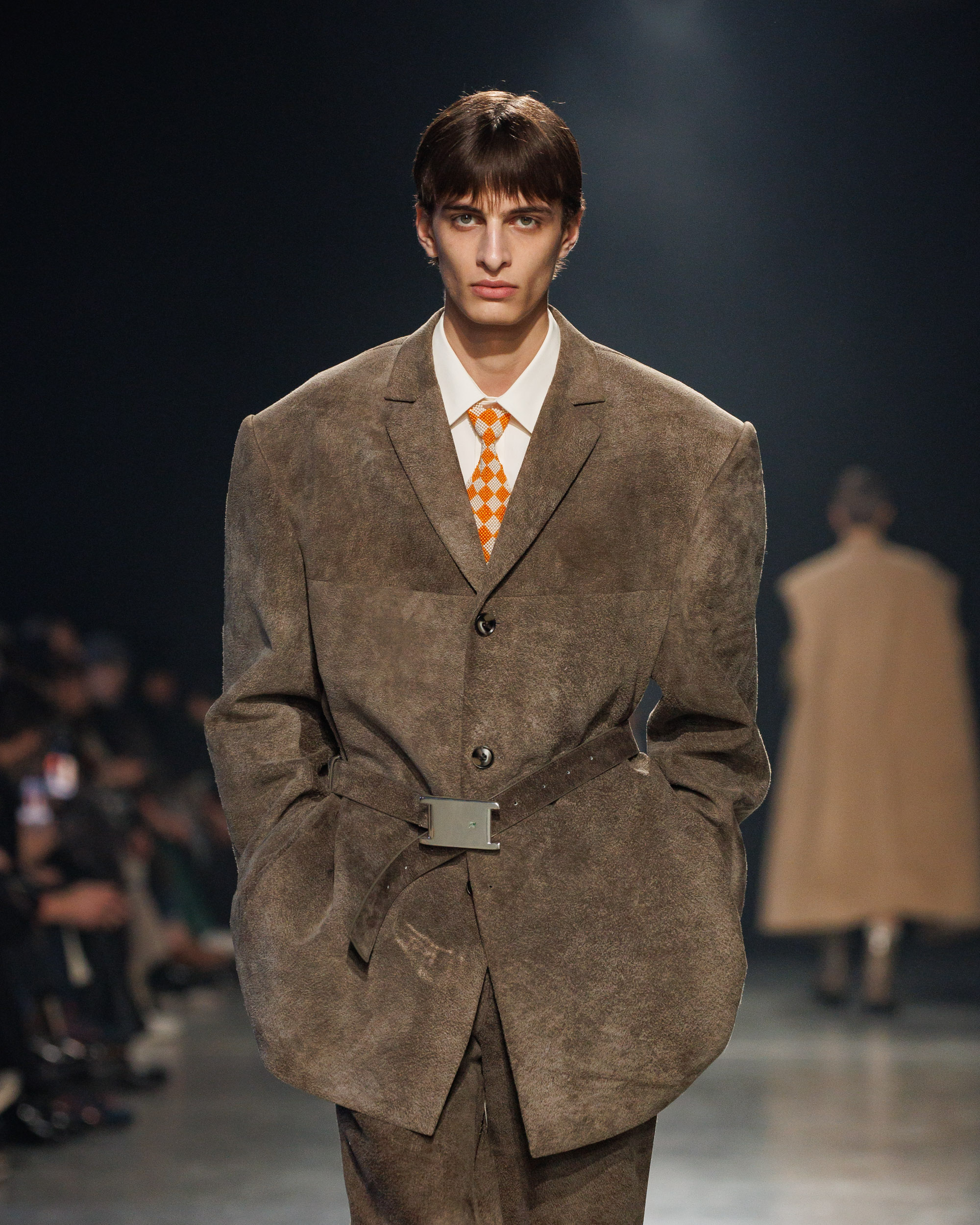 Sean Suen rend hommage aux classiques de son temps en revisitant des pièces emblématiques telles que les costumes en laine, les manteaux oversize et les tricots faits main. Il joue sur les contrastes en associant des couleurs vives et des accessoires masculins élaborés aux tons plus sobres comme le noir, le gris, le marron et le vert.