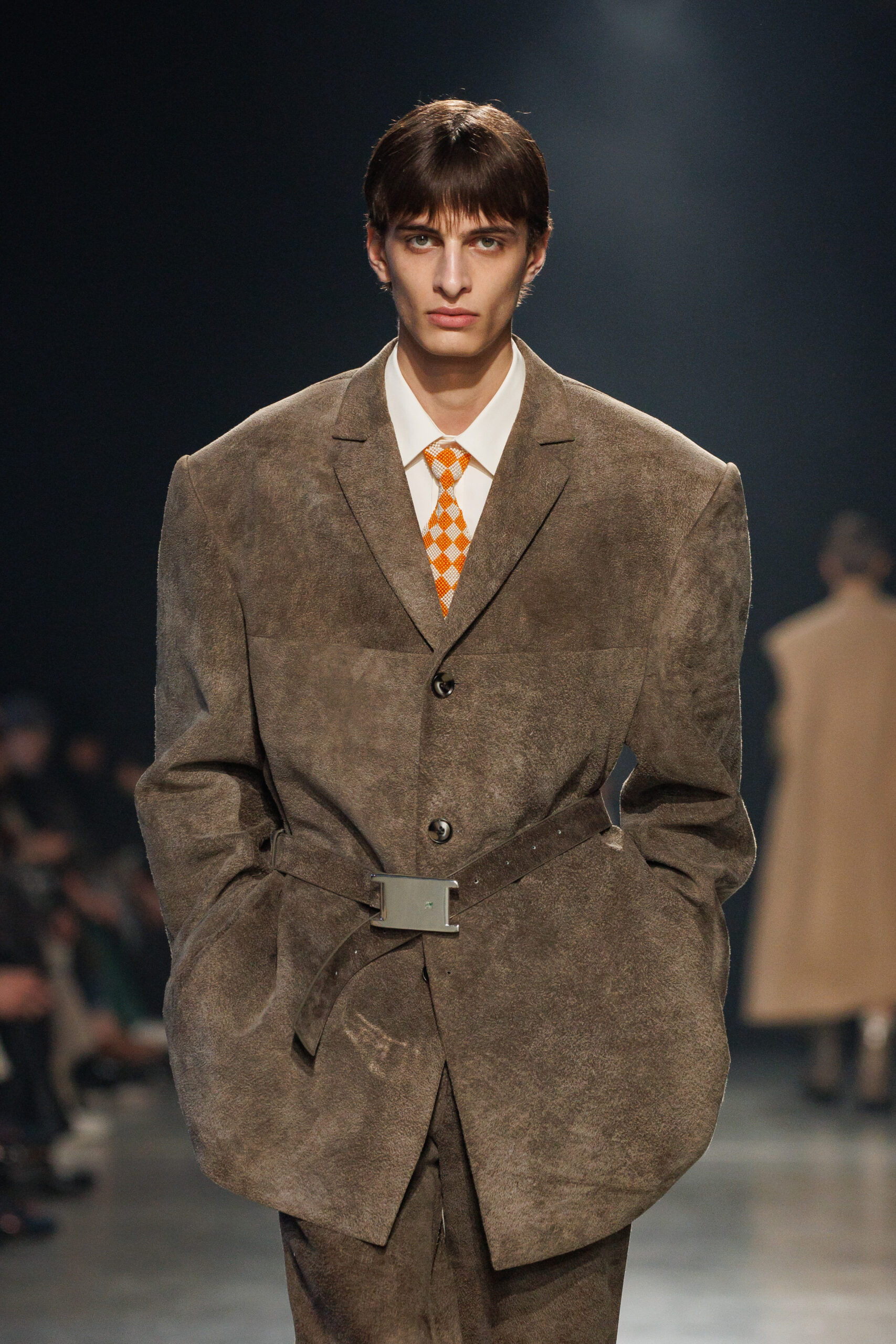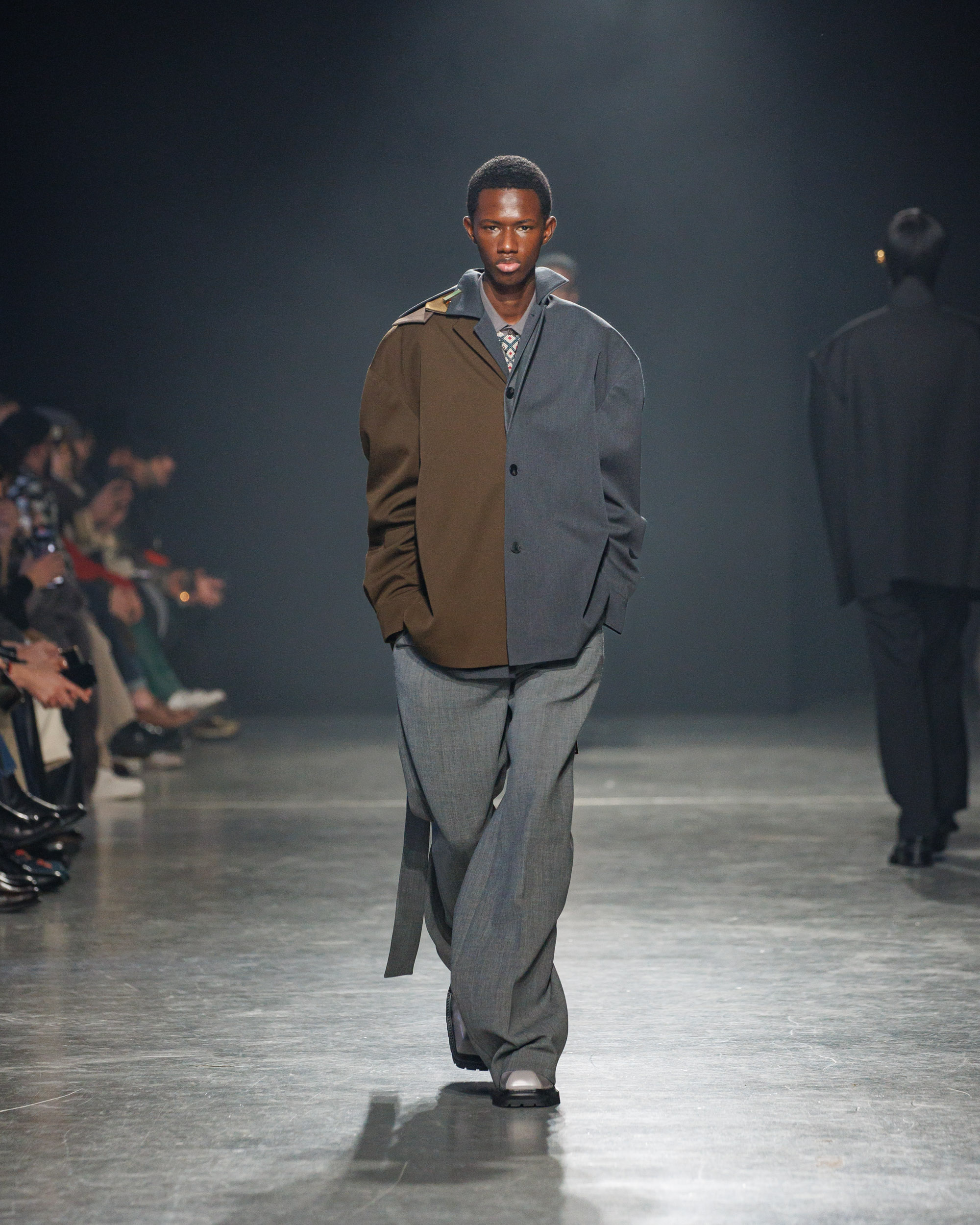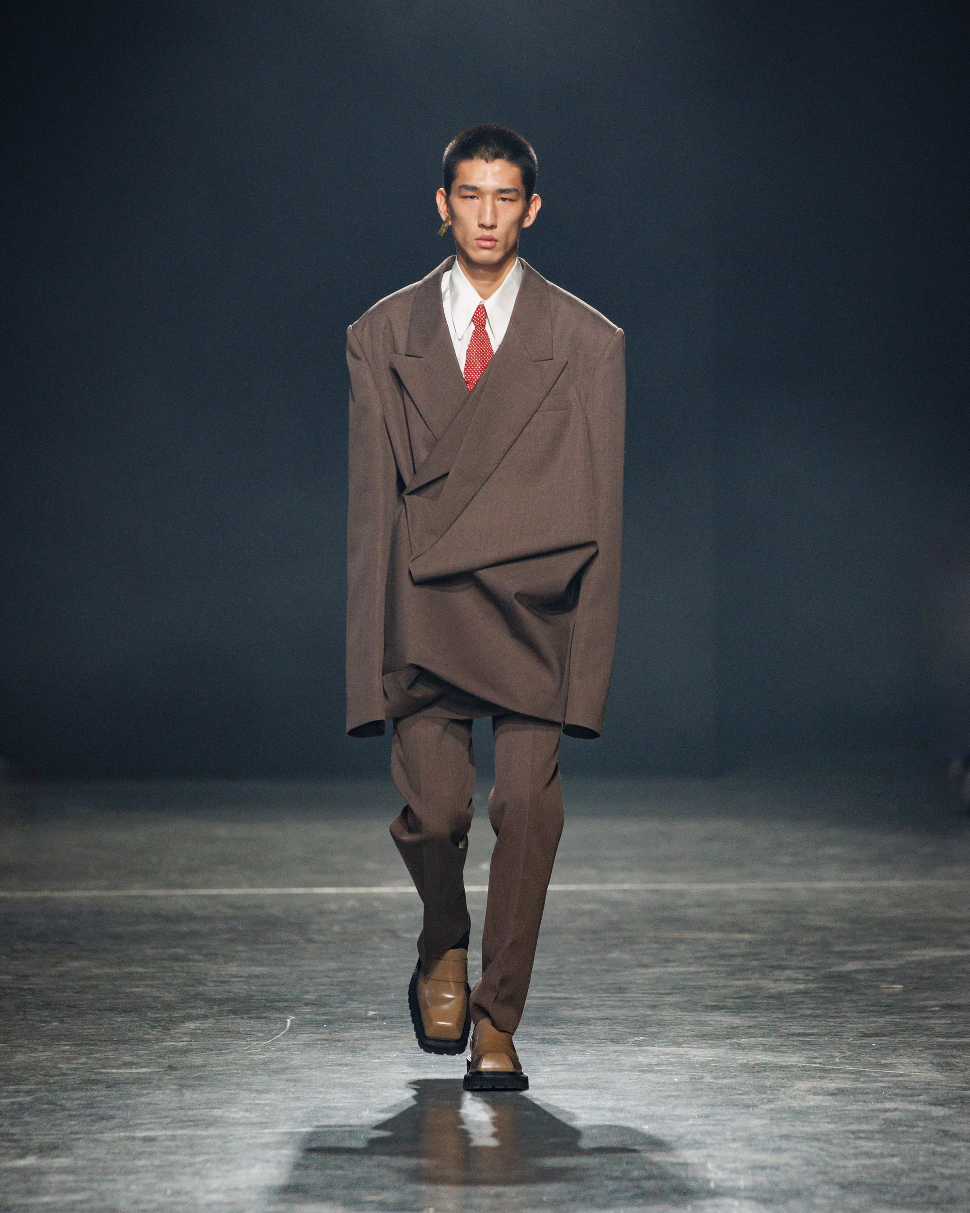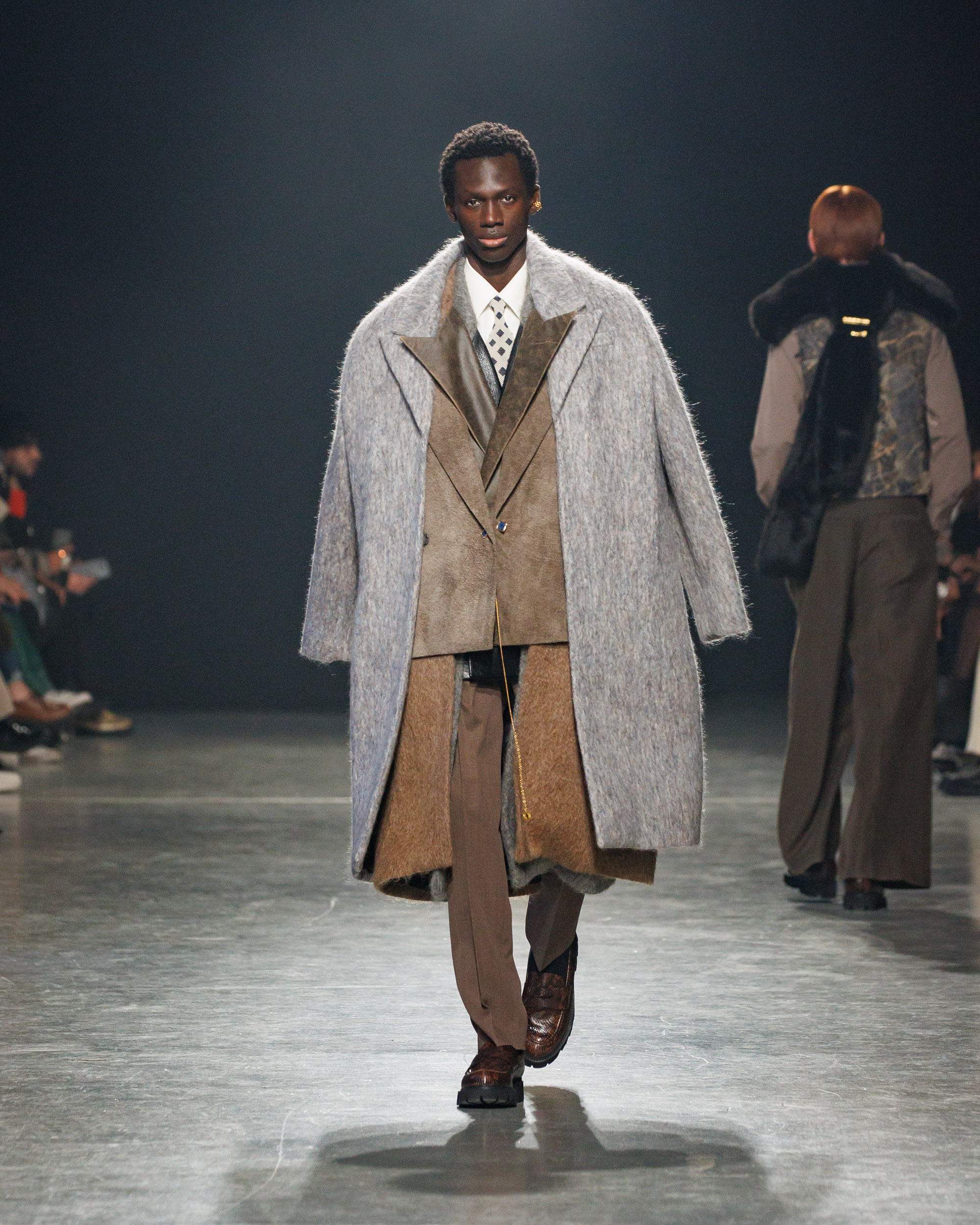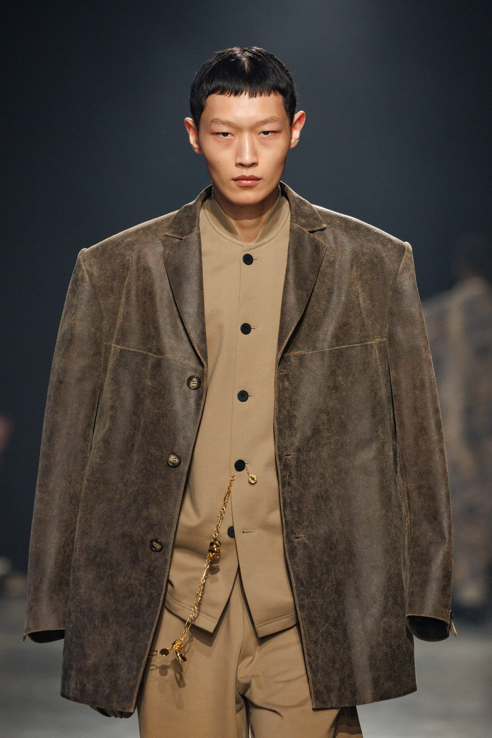Sean Suen rend hommage aux classiques de son temps en revisitant des pièces emblématiques telles que les costumes en laine, les manteaux oversize et les tricots faits main. Il joue sur les contrastes en associant des couleurs vives et des accessoires masculins élaborés aux tons plus sobres comme le noir, le gris, le marron et le vert.
