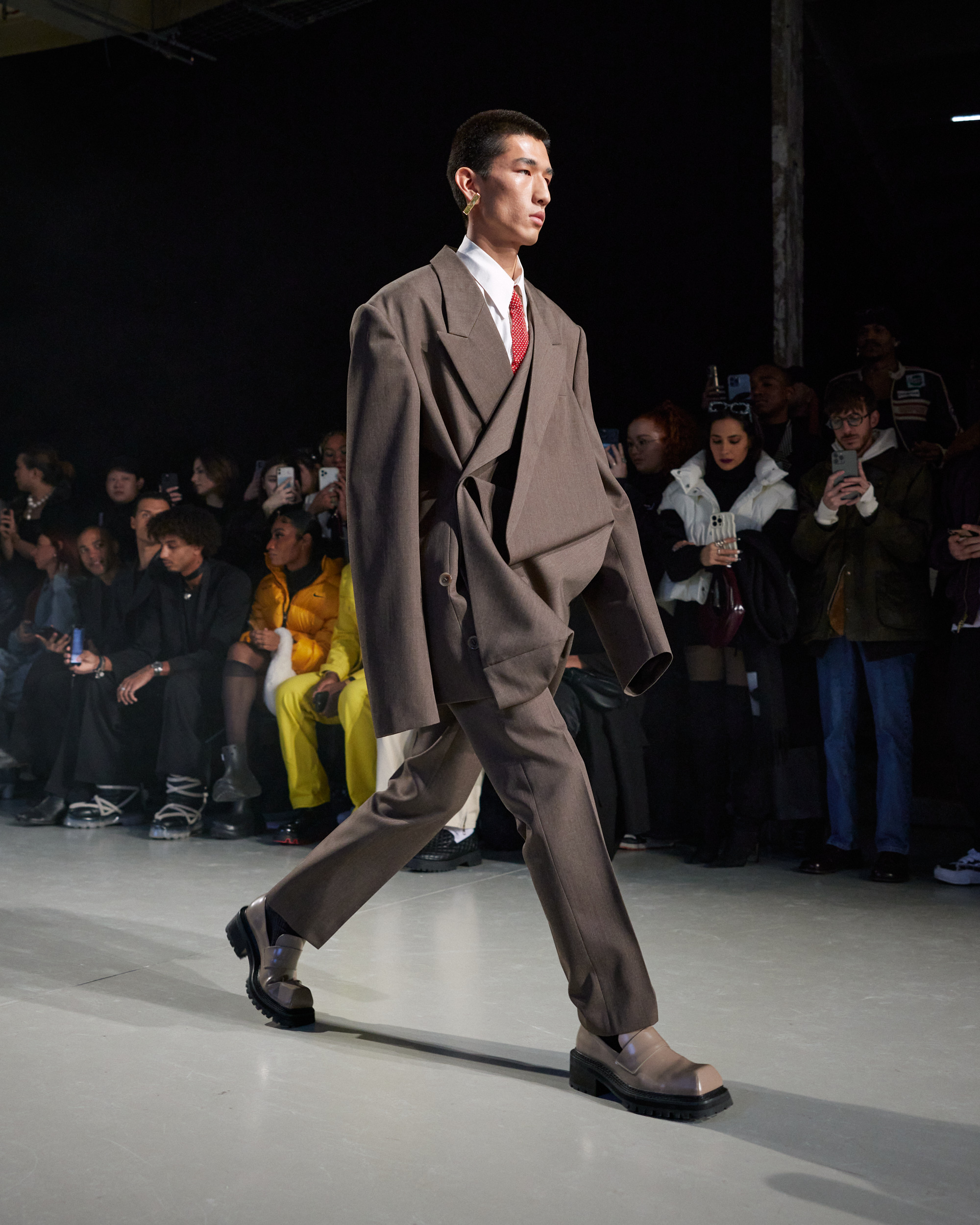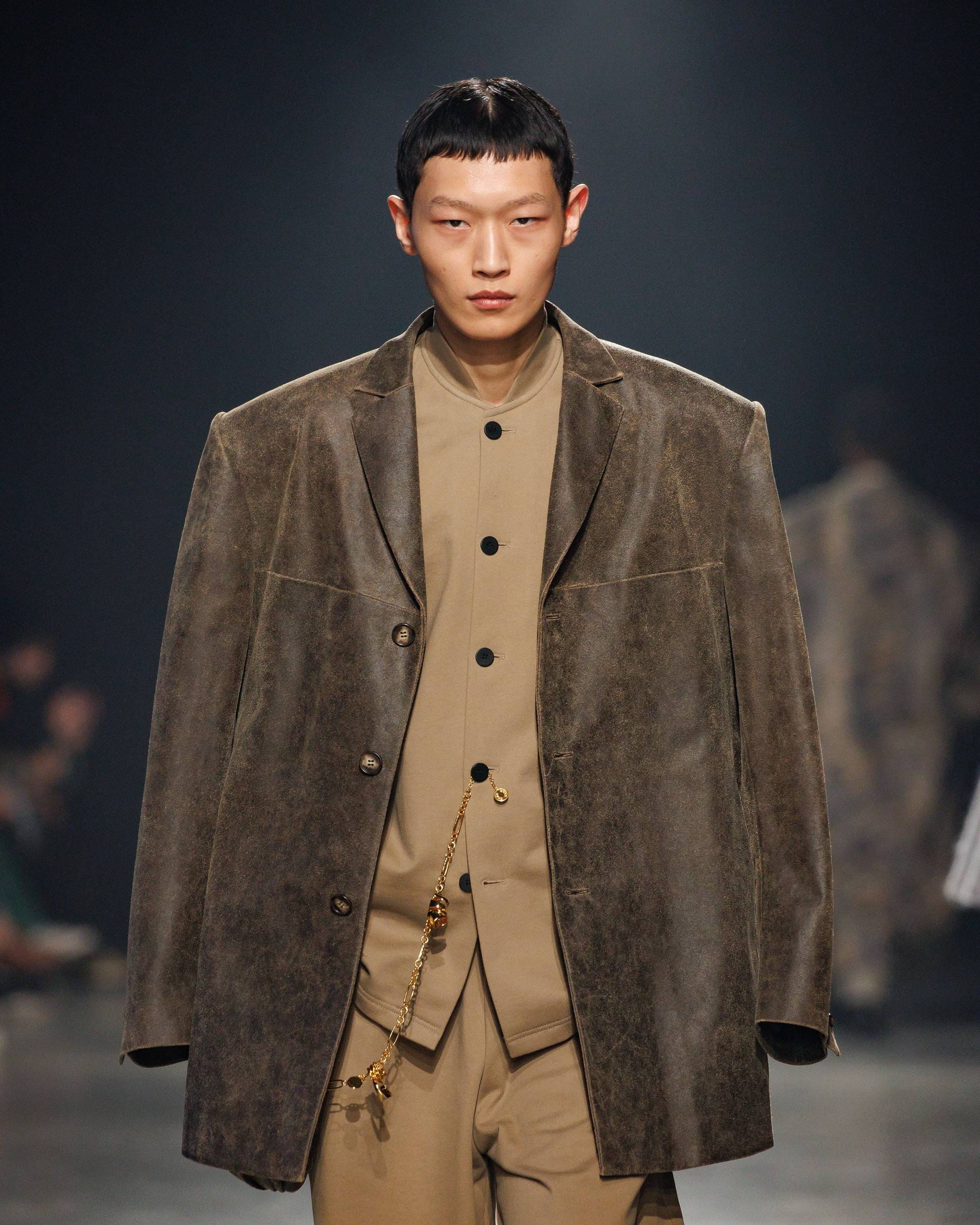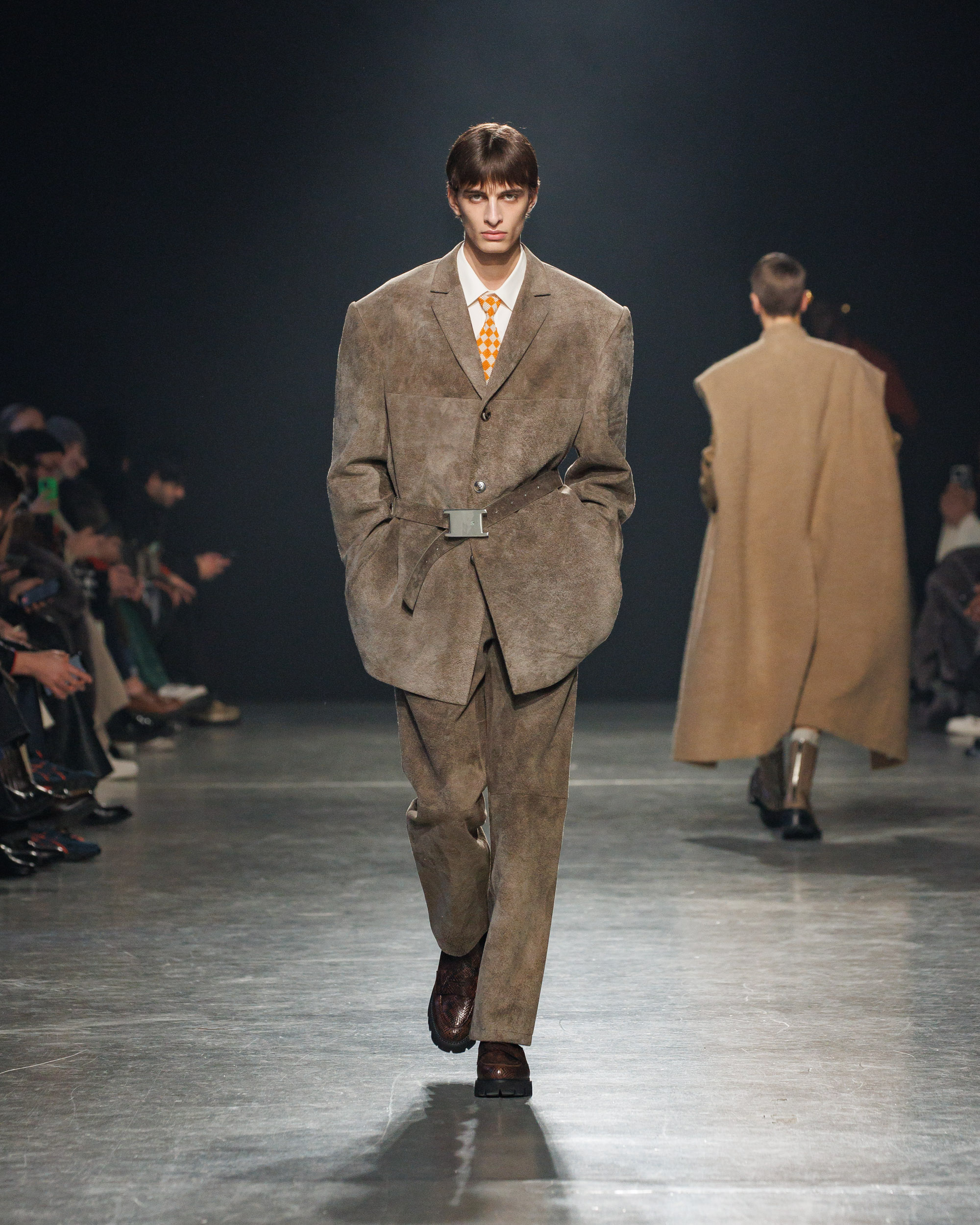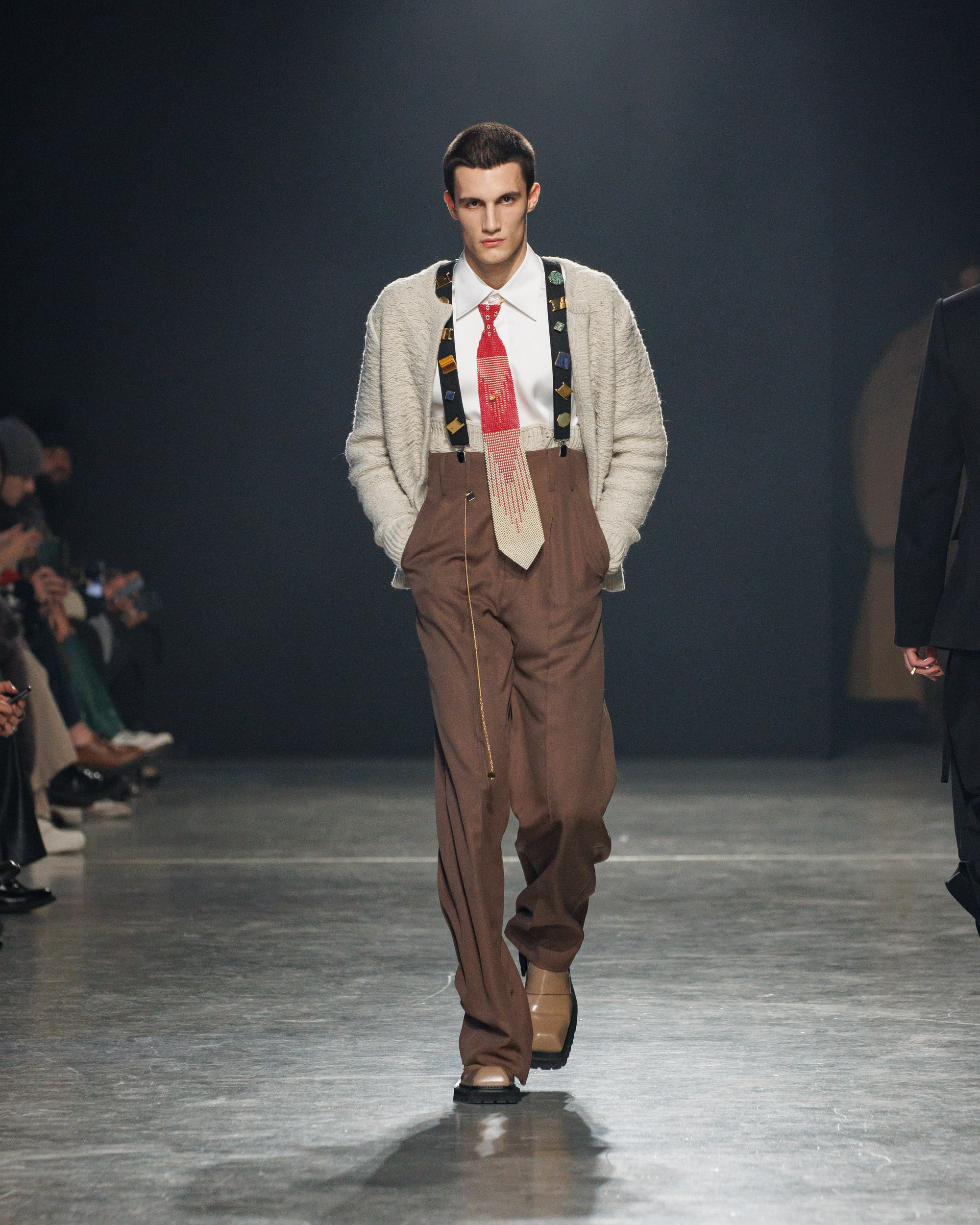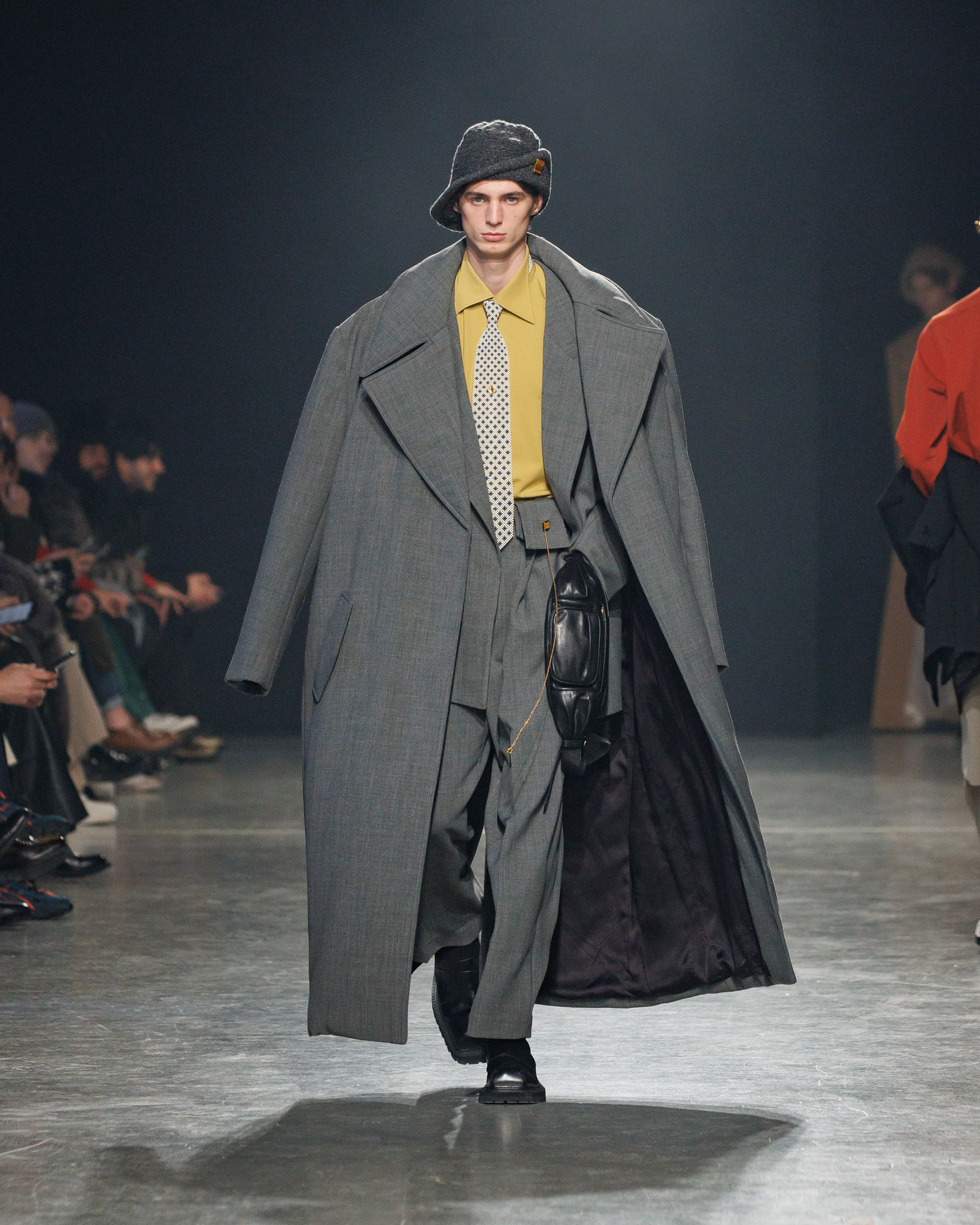 Sean Suen rend hommage aux classiques de son temps en revisitant des pièces emblématiques telles que les costumes en laine, les manteaux oversize et les tricots faits main. Il joue sur les contrastes en associant des couleurs vives et des accessoires masculins élaborés aux tons plus sobres comme le noir, le gris, le marron et le vert.