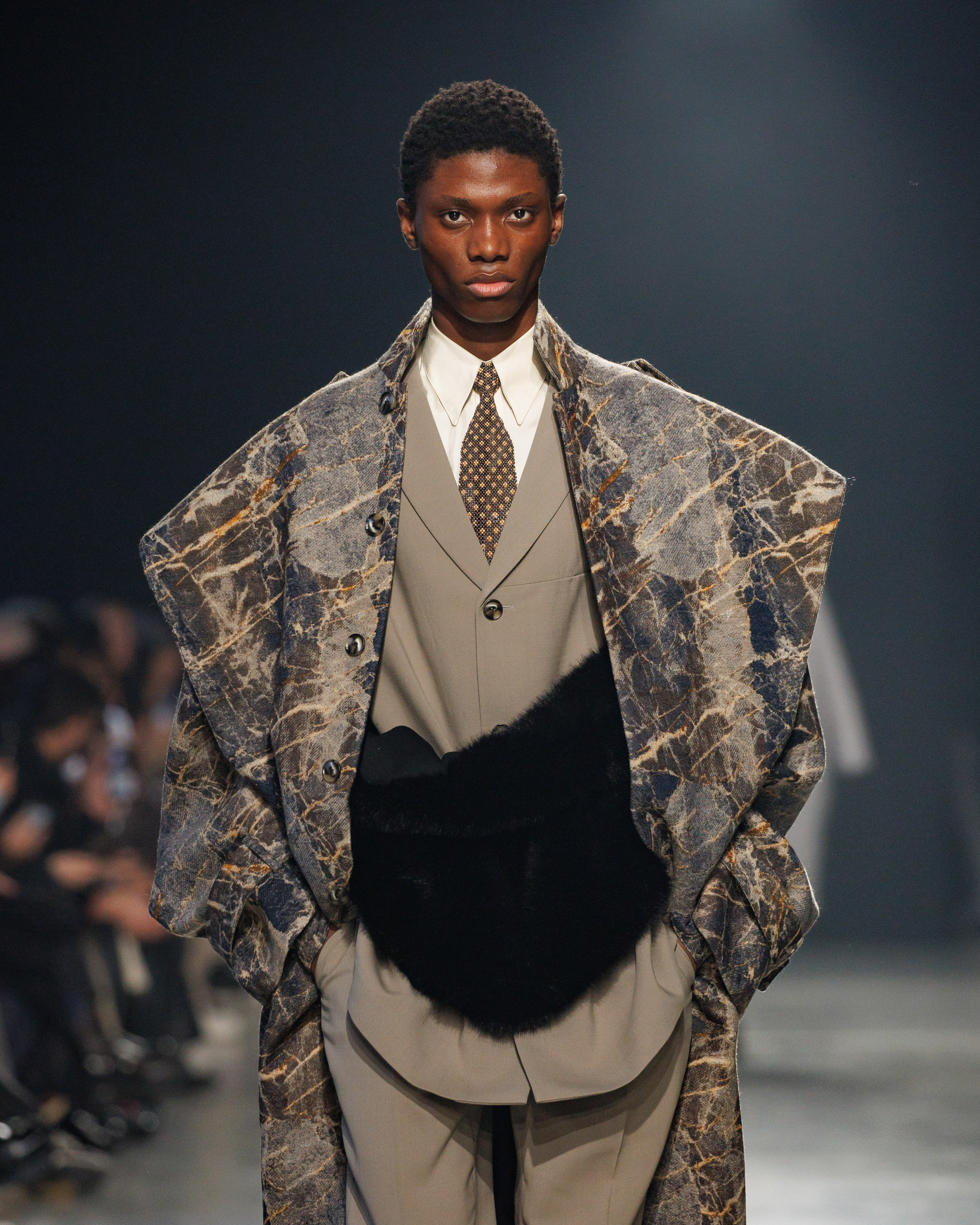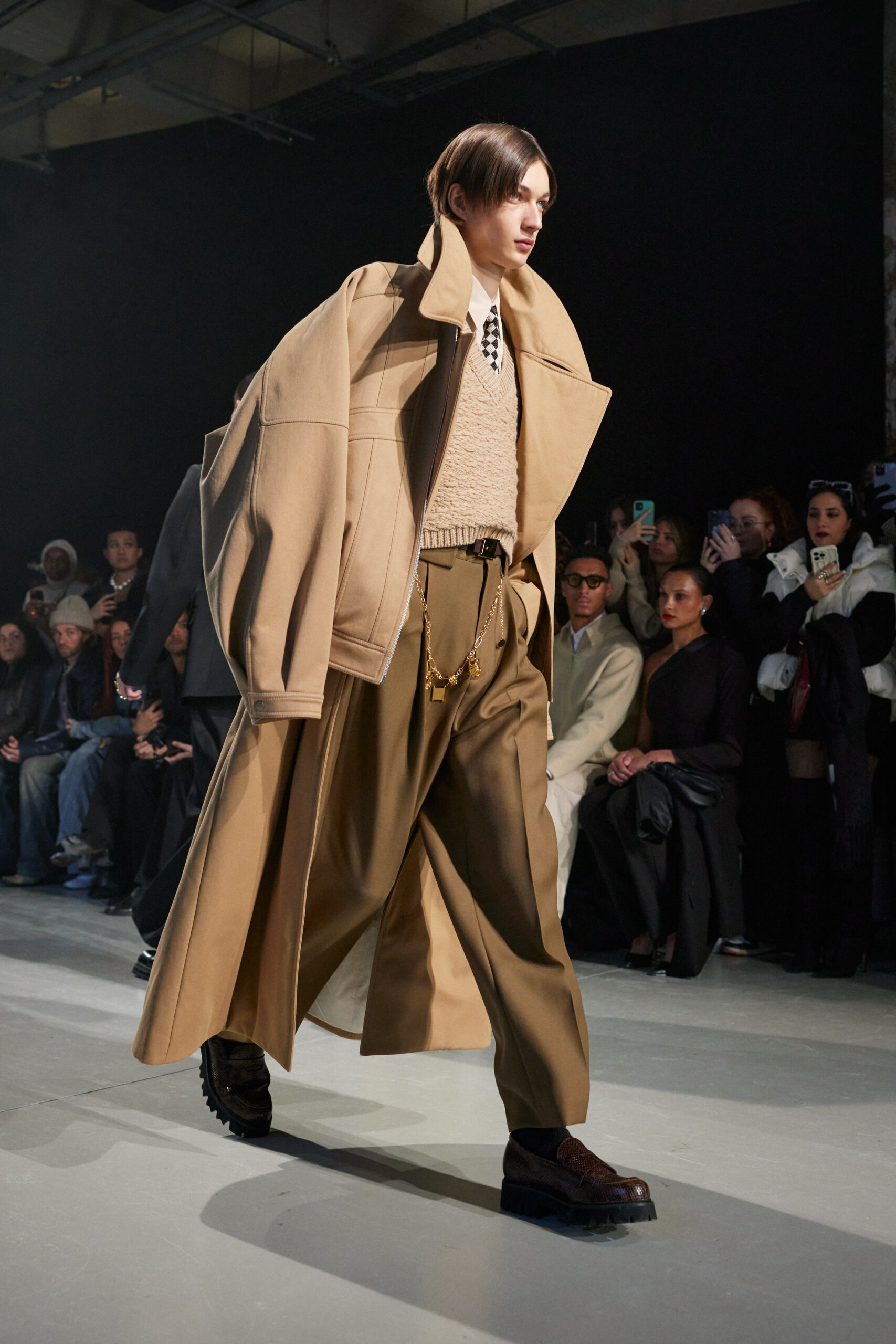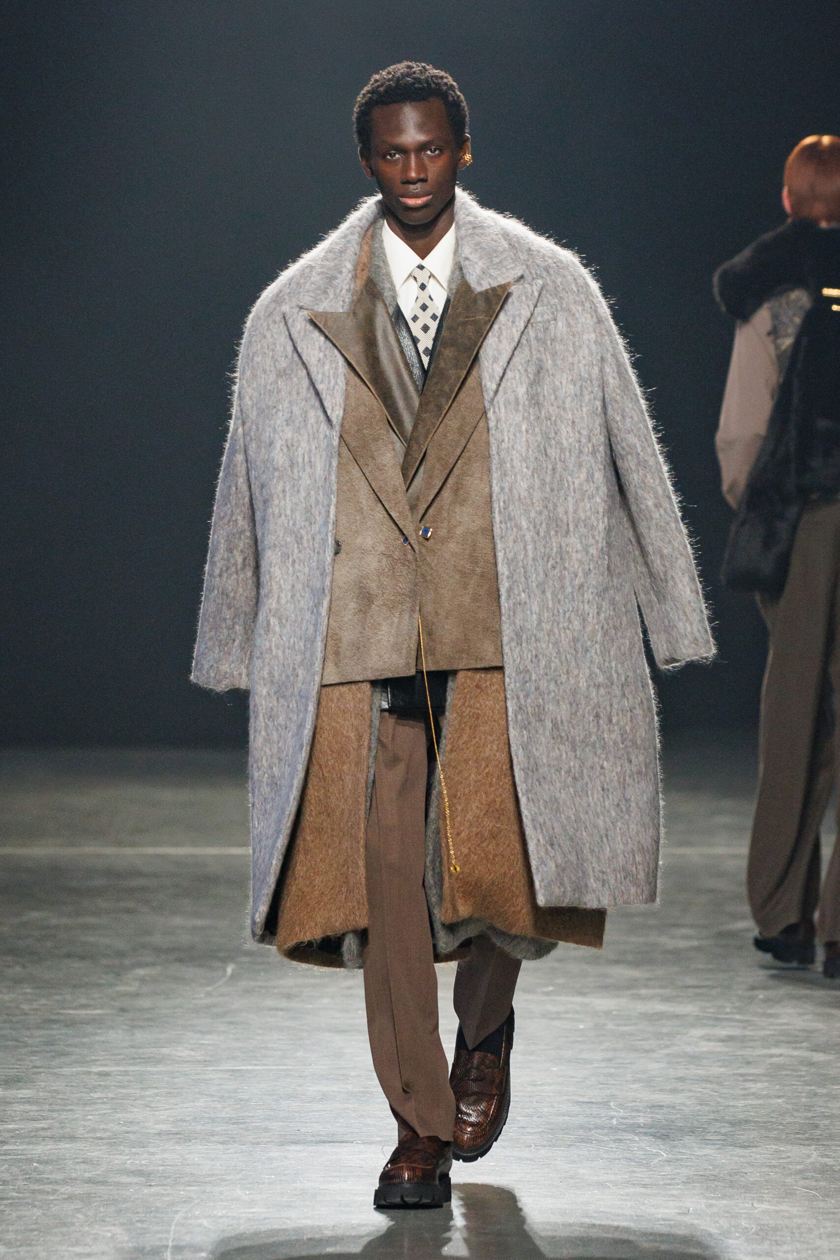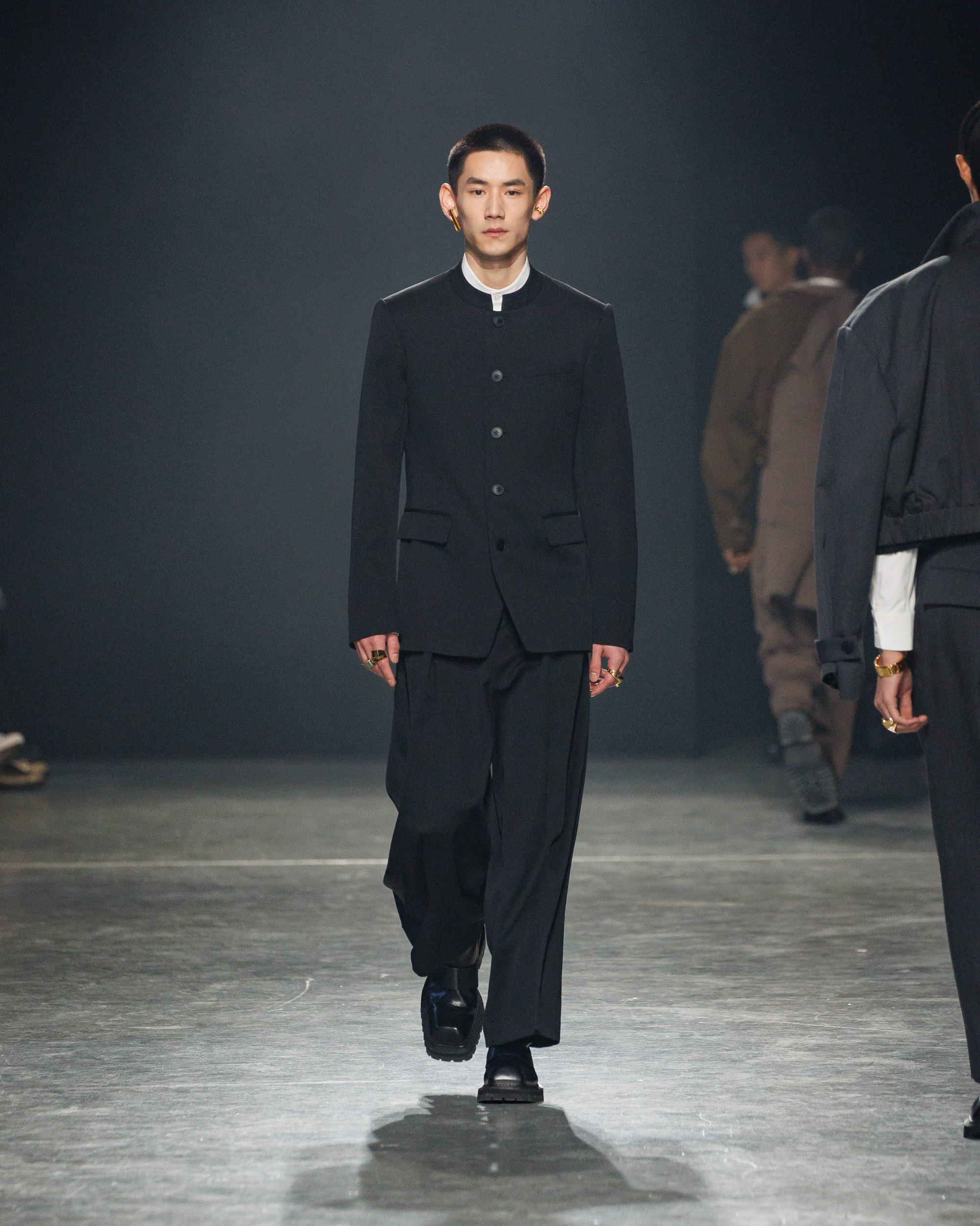 Sean Suen rend hommage aux classiques de son temps en revisitant des pièces emblématiques telles que les costumes en laine, les manteaux oversize et les tricots faits main. Il joue sur les contrastes en associant des couleurs vives et des accessoires masculins élaborés aux tons plus sobres comme le noir, le gris, le marron et le vert.