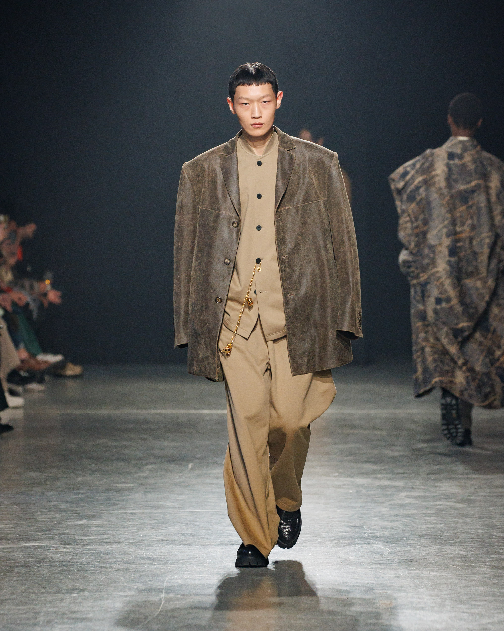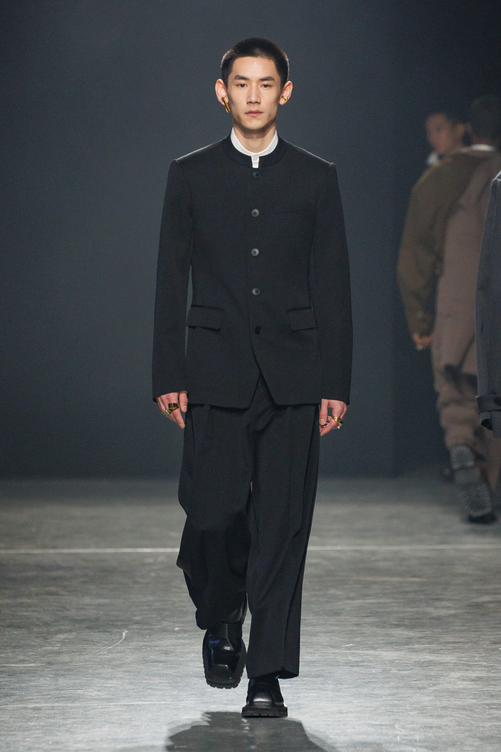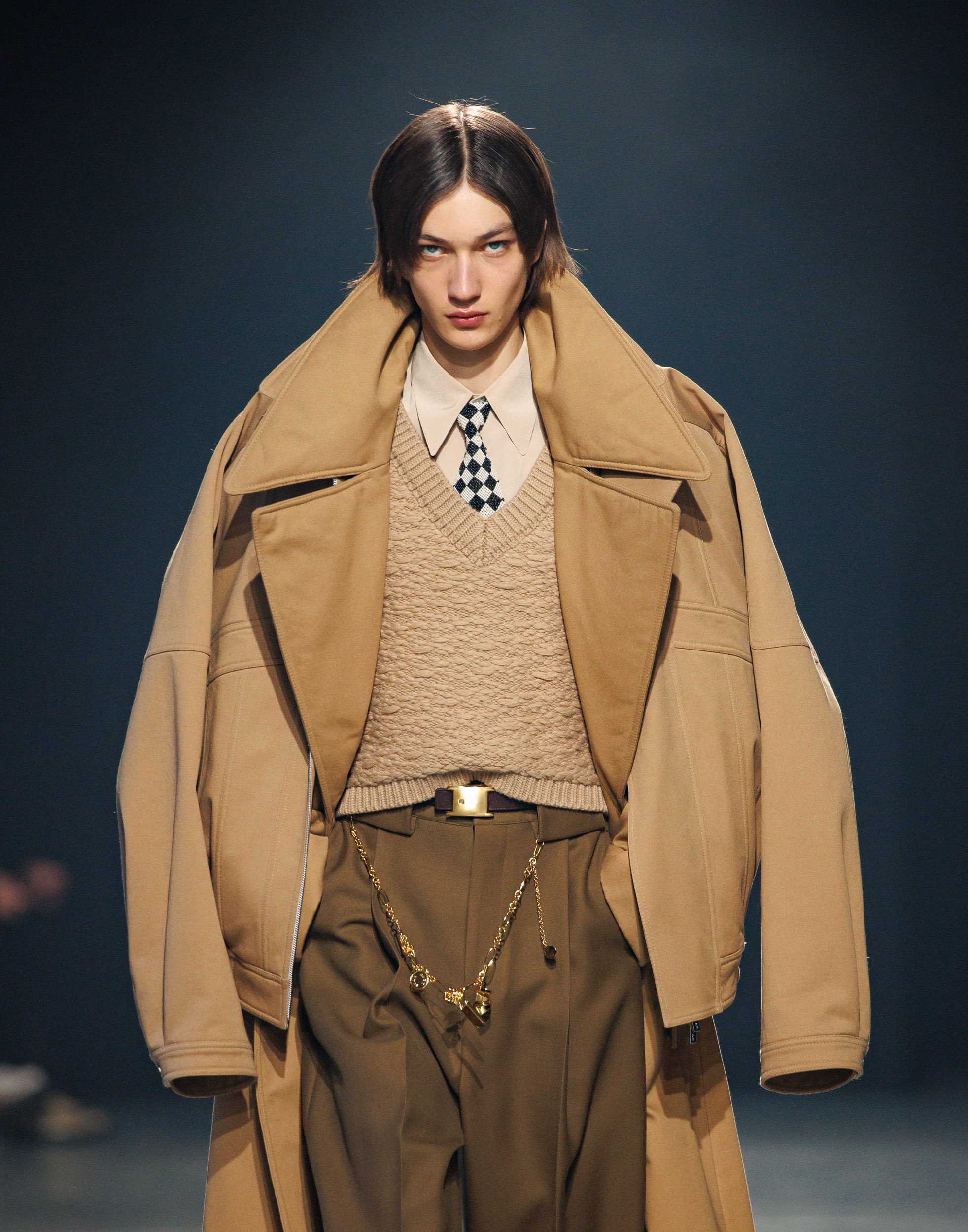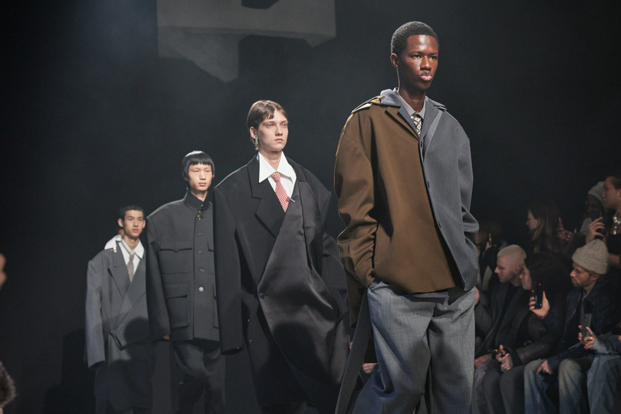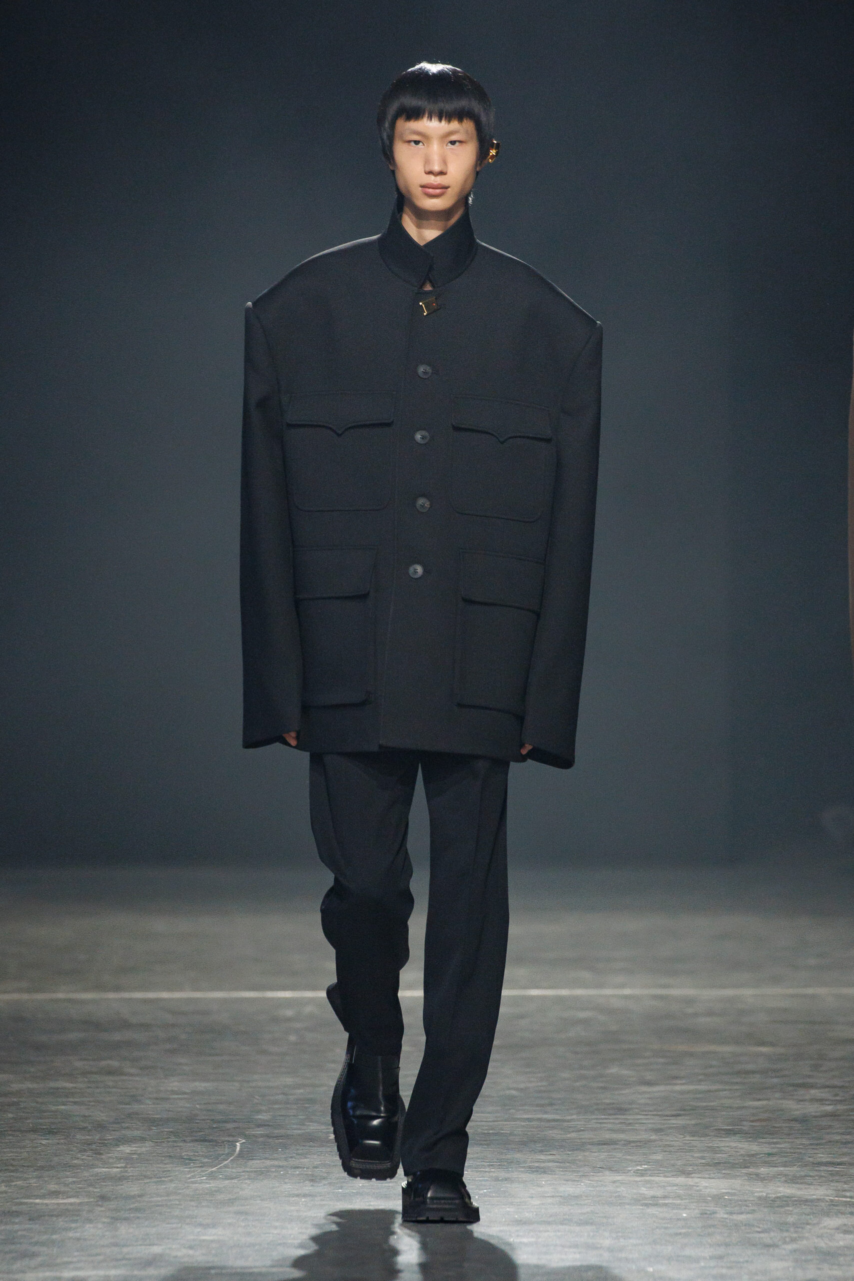 Sean Suen rend hommage aux classiques de son temps en revisitant des pièces emblématiques telles que les costumes en laine, les manteaux oversize et les tricots faits main. Il joue sur les contrastes en associant des couleurs vives et des accessoires masculins élaborés aux tons plus sobres comme le noir, le gris, le marron et le vert.
