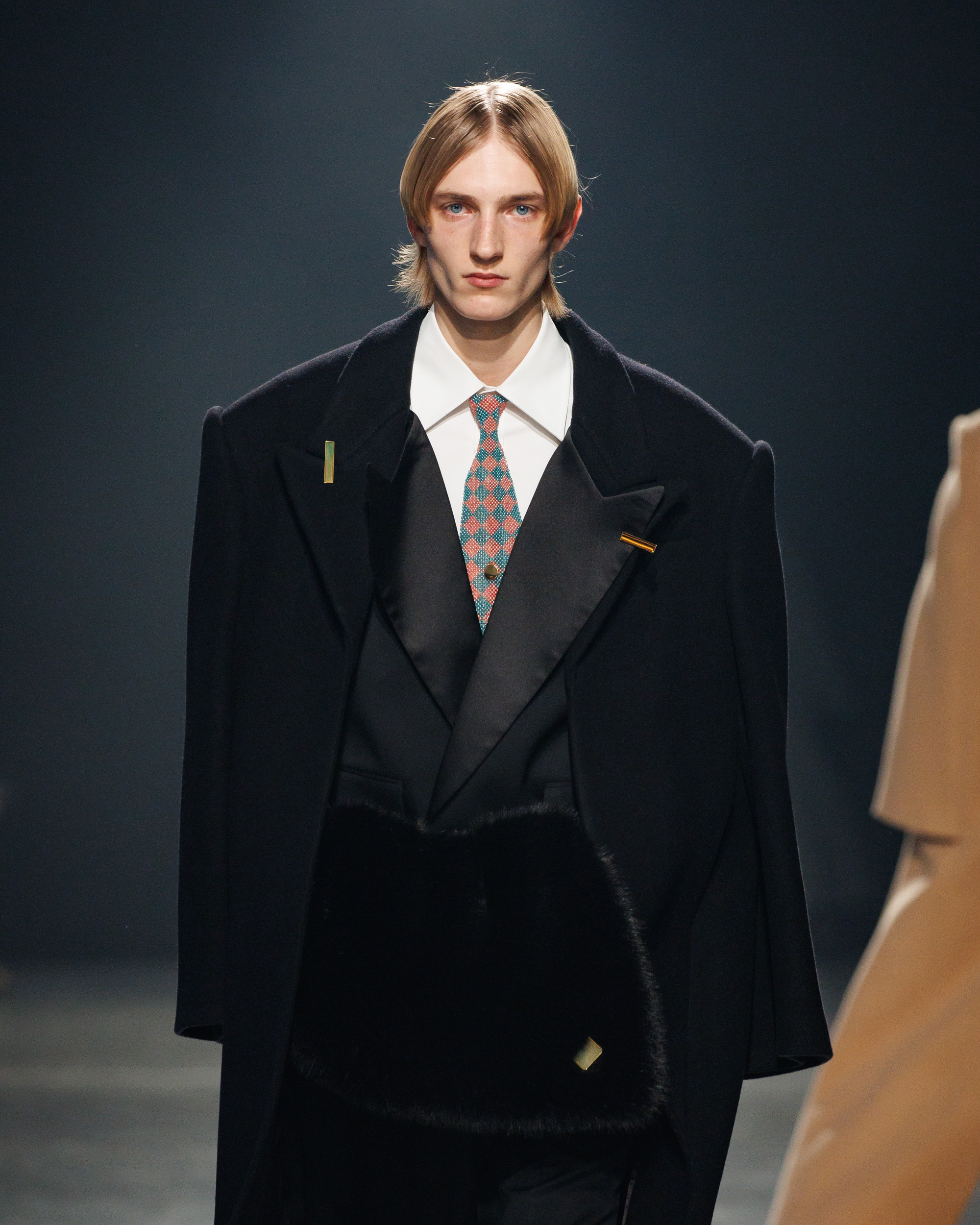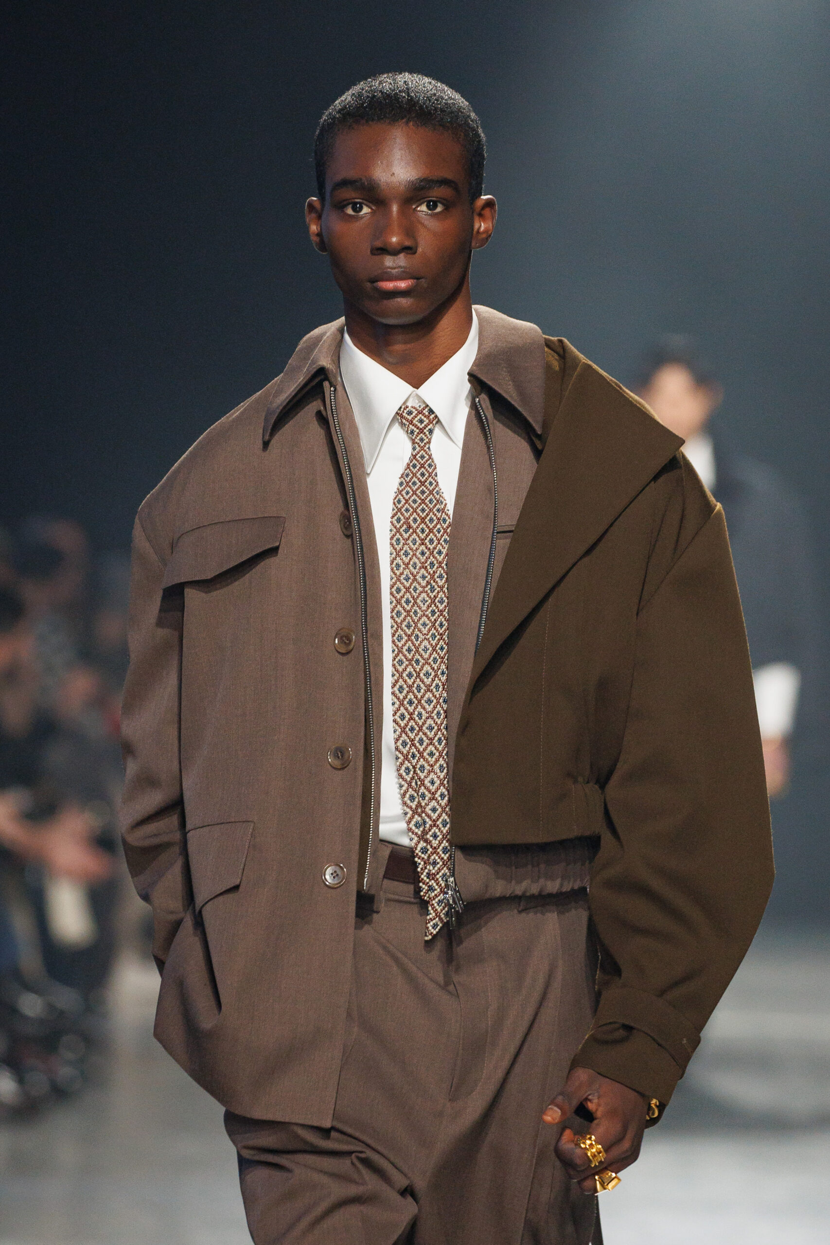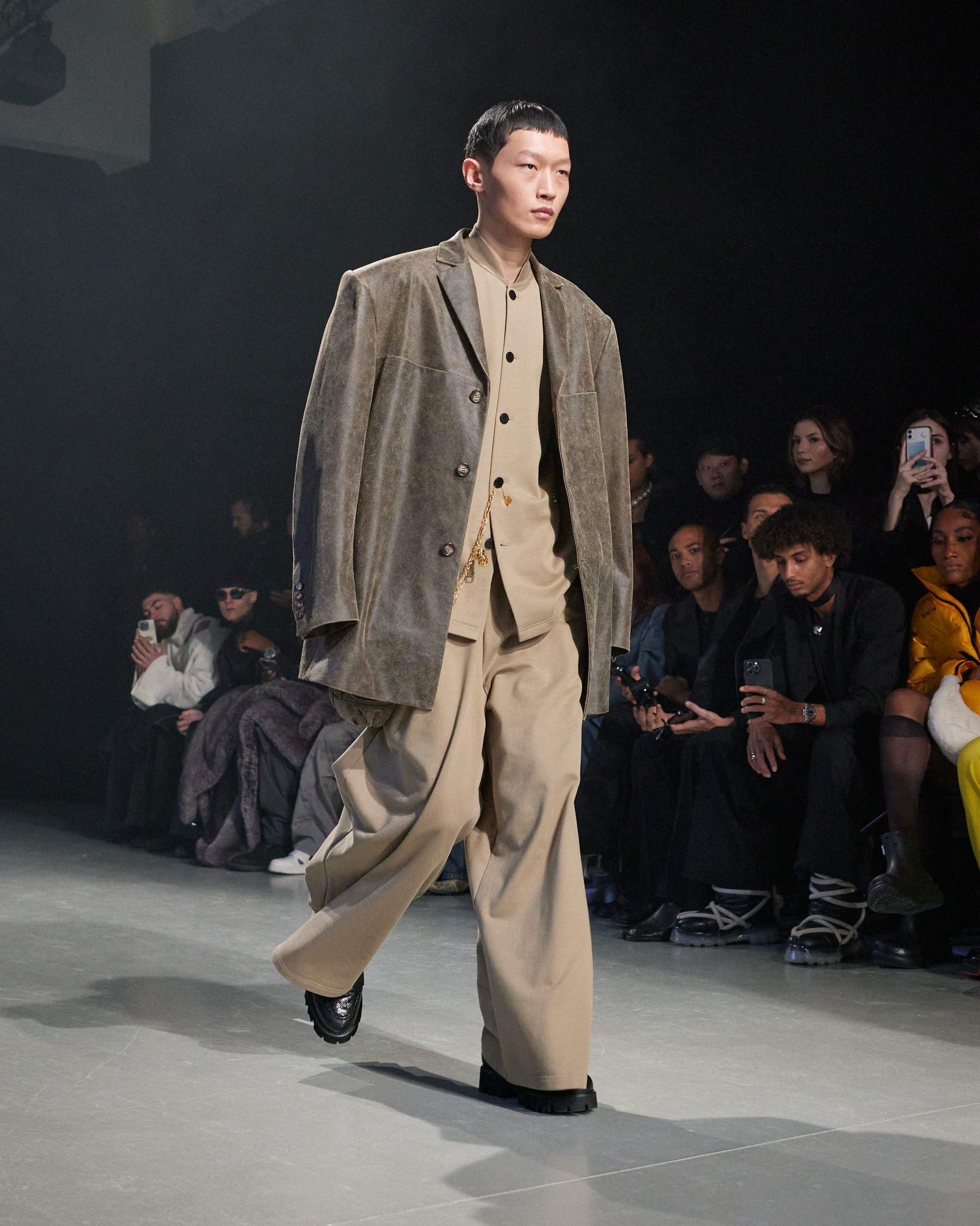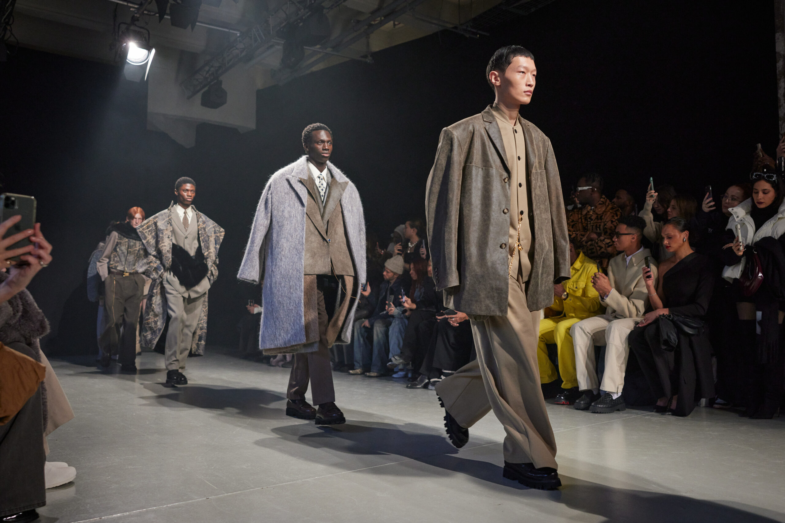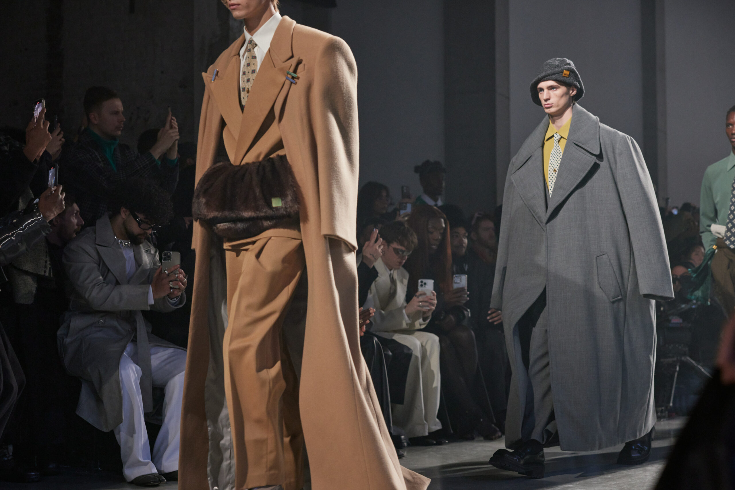 Sean Suen rend hommage aux classiques de son temps en revisitant des pièces emblématiques telles que les costumes en laine, les manteaux oversize et les tricots faits main. Il joue sur les contrastes en associant des couleurs vives et des accessoires masculins élaborés aux tons plus sobres comme le noir, le gris, le marron et le vert.