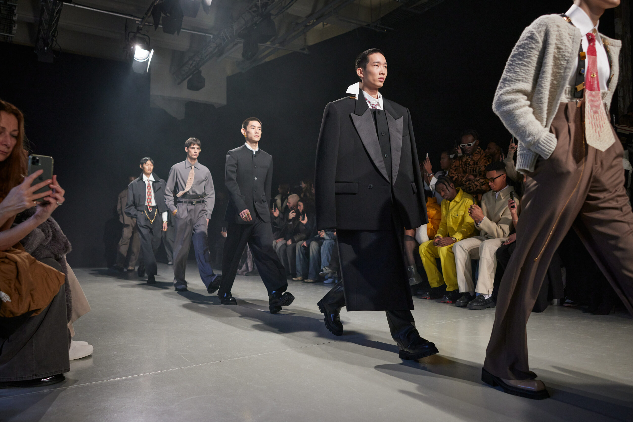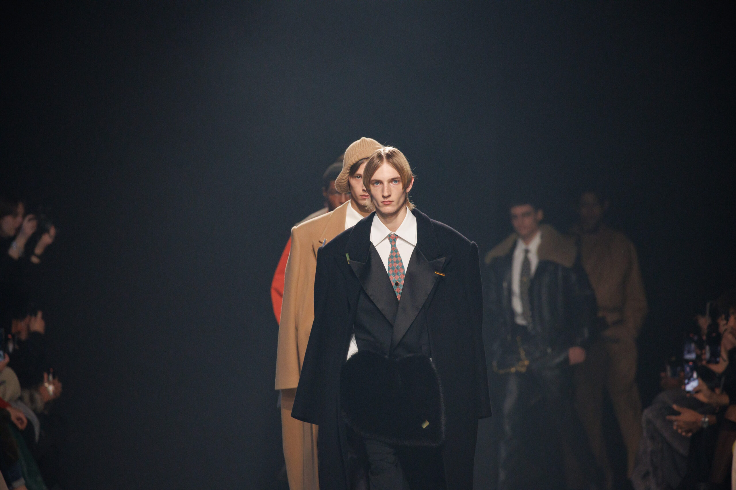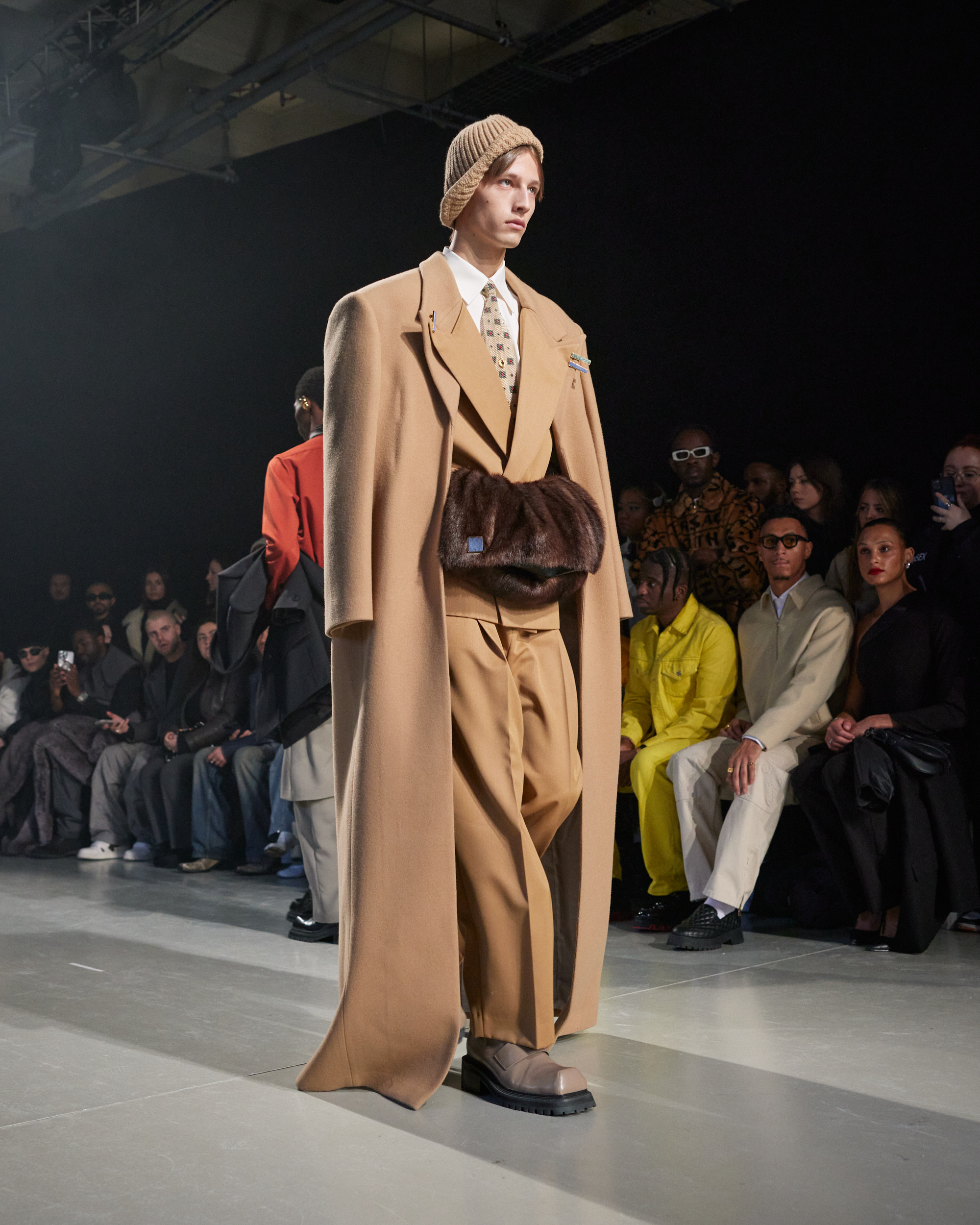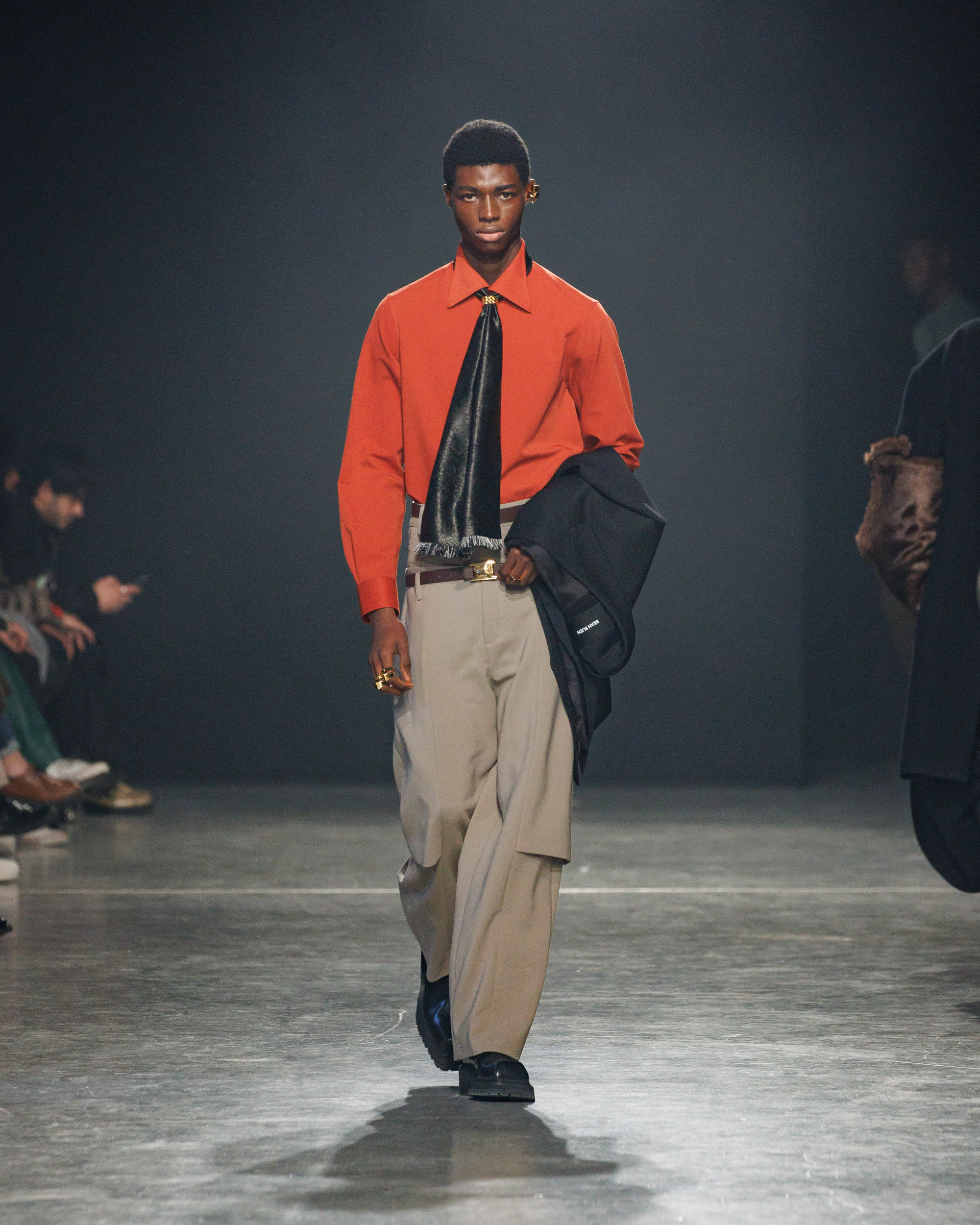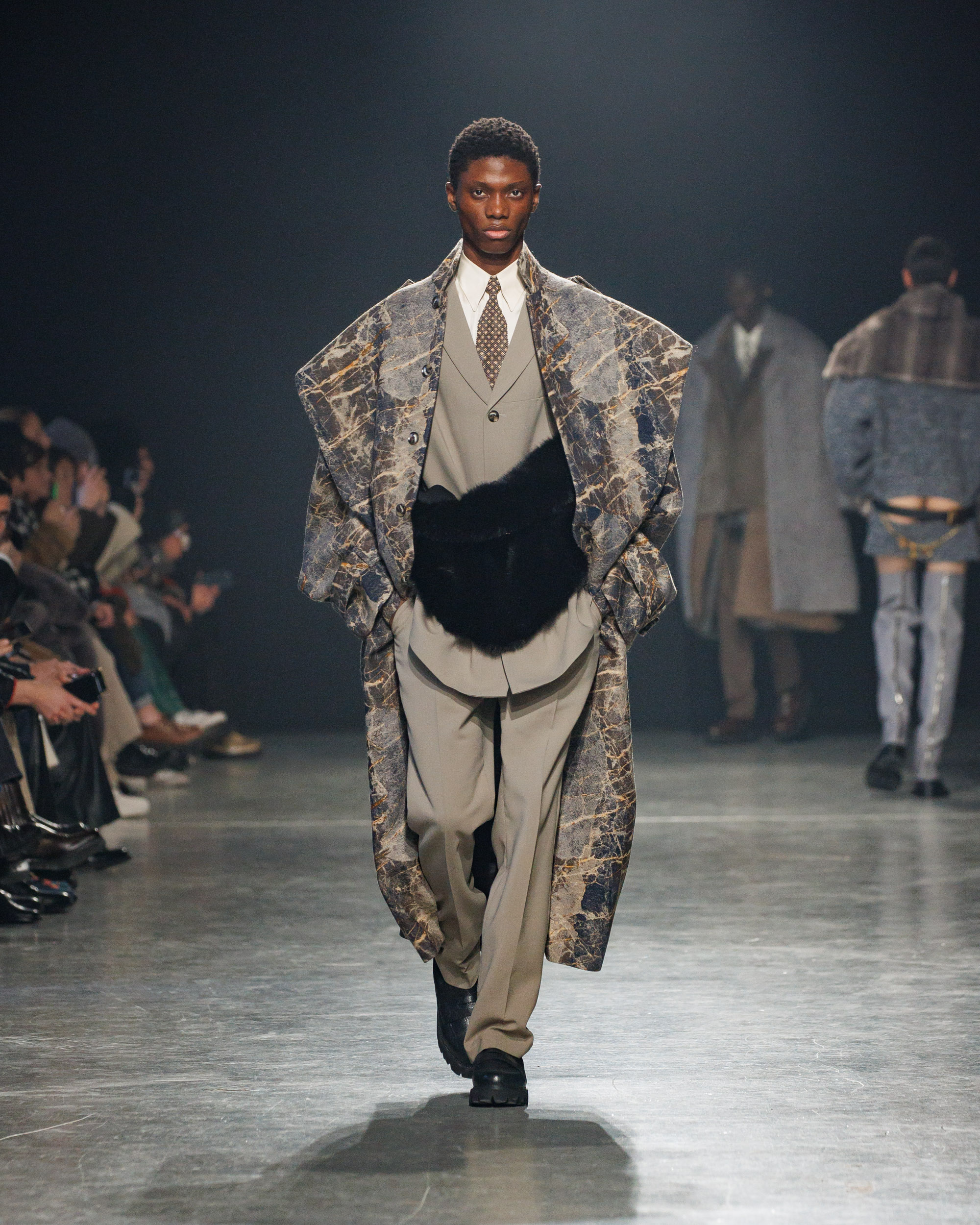 Sean Suen rend hommage aux classiques de son temps en revisitant des pièces emblématiques telles que les costumes en laine, les manteaux oversize et les tricots faits main. Il joue sur les contrastes en associant des couleurs vives et des accessoires masculins élaborés aux tons plus sobres comme le noir, le gris, le marron et le vert.