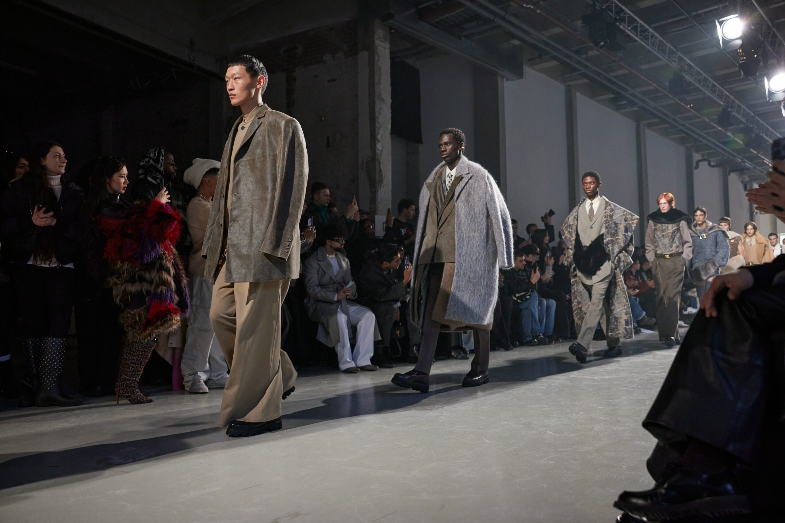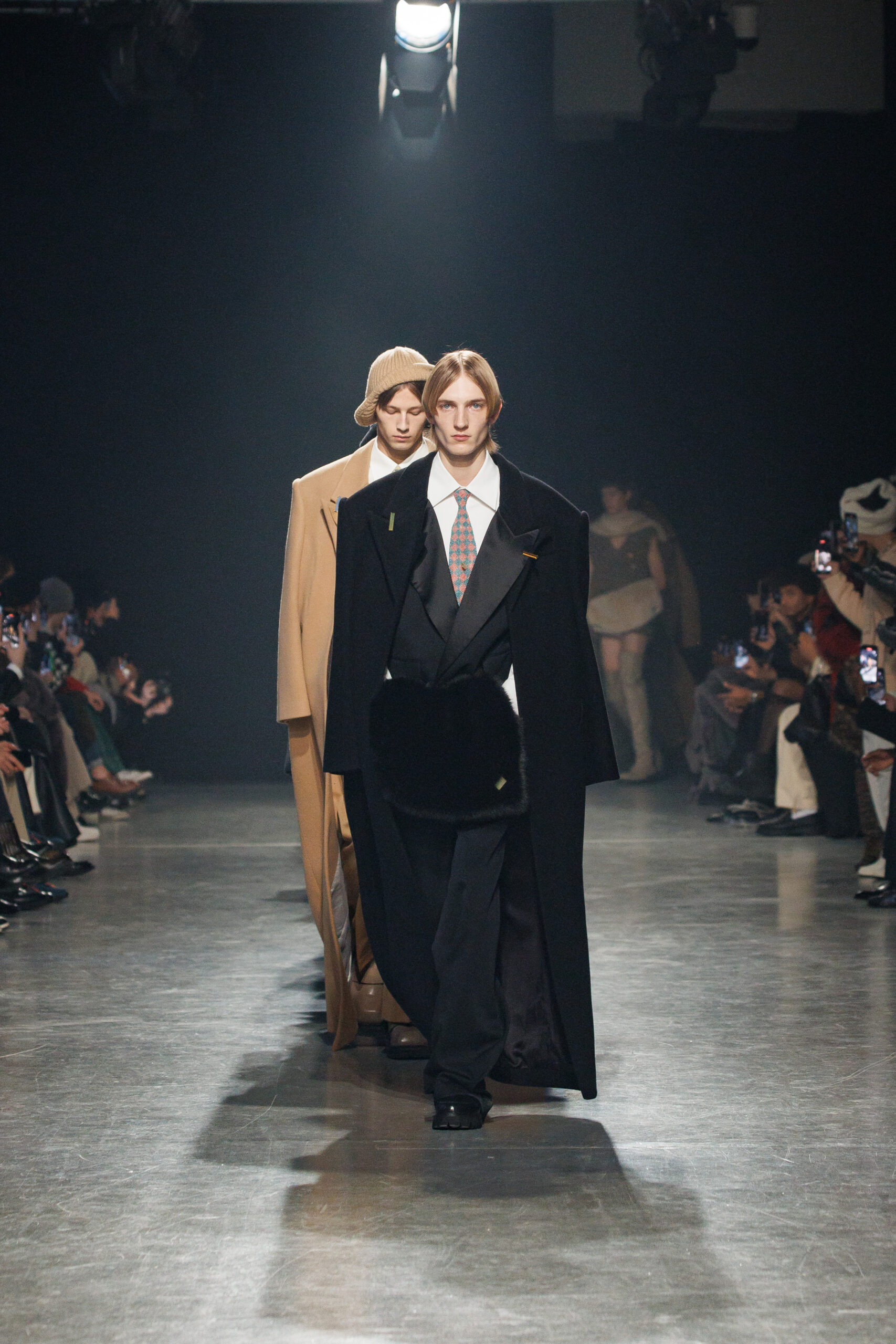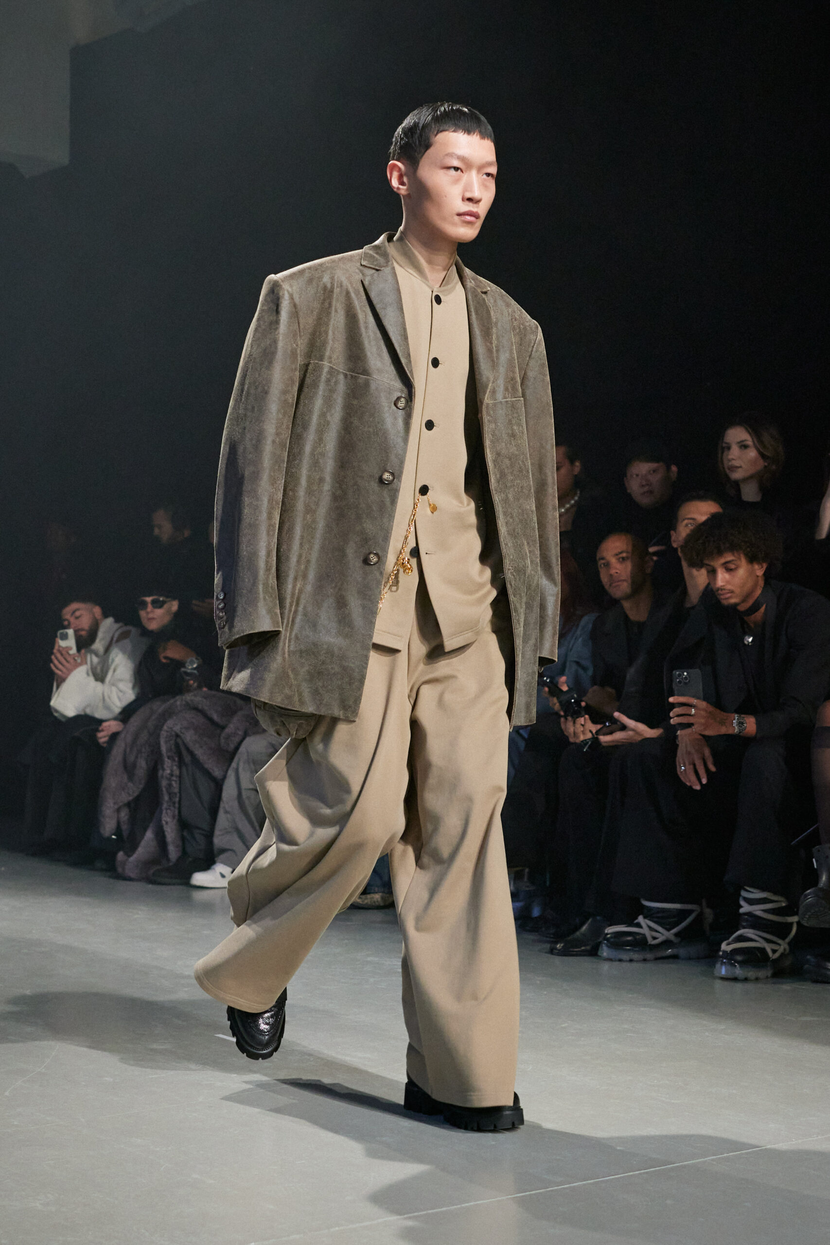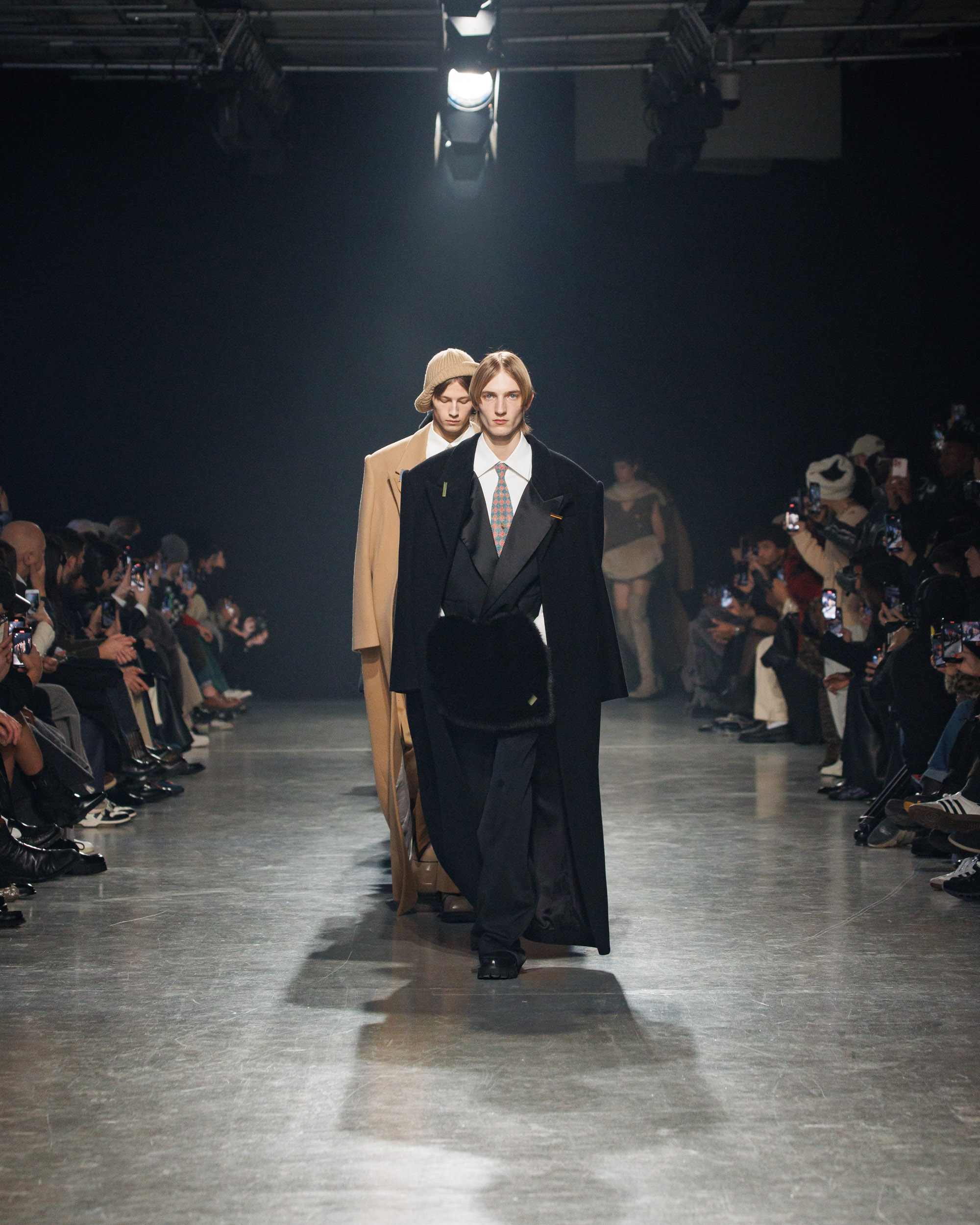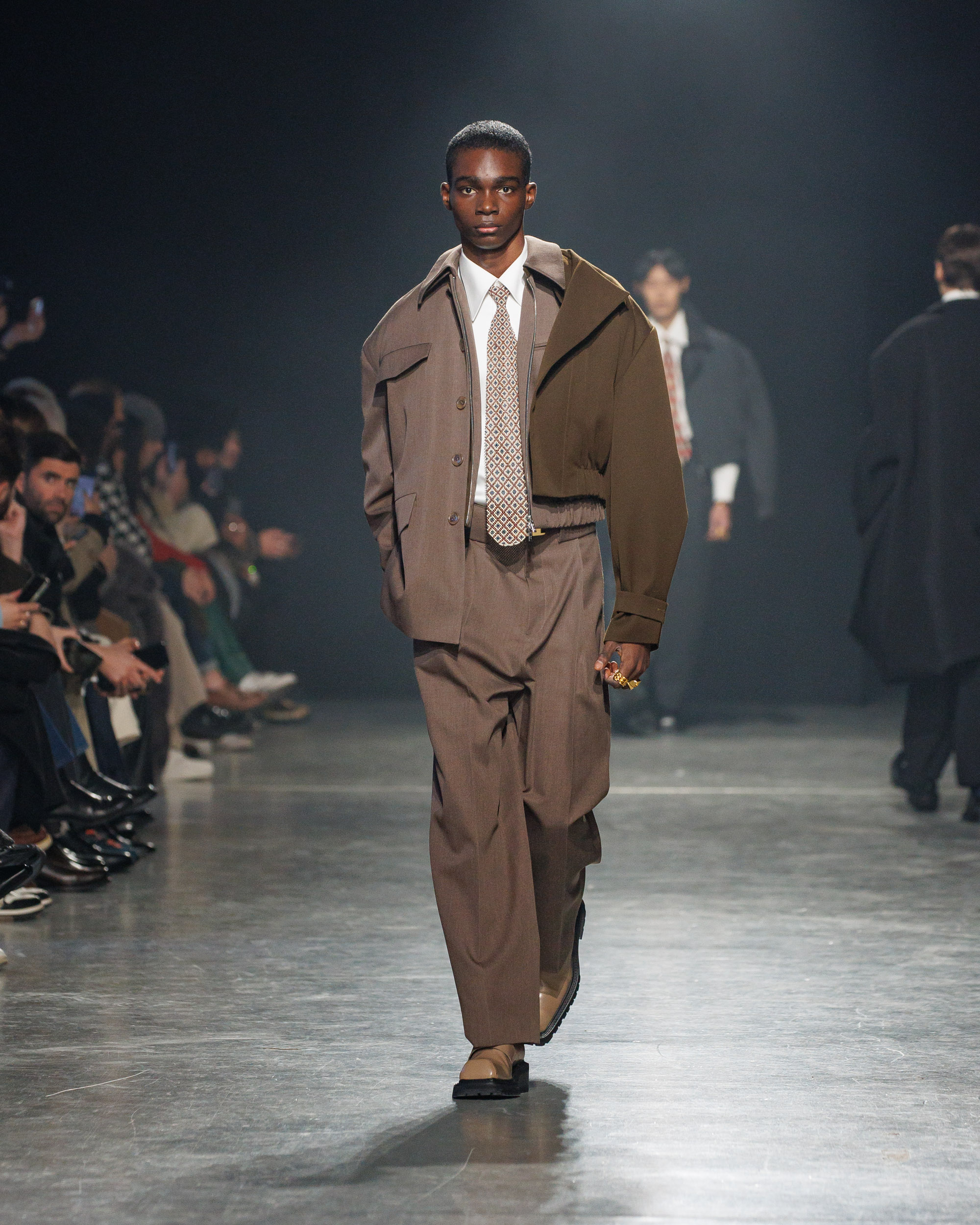 Sean Suen rend hommage aux classiques de son temps en revisitant des pièces emblématiques telles que les costumes en laine, les manteaux oversize et les tricots faits main. Il joue sur les contrastes en associant des couleurs vives et des accessoires masculins élaborés aux tons plus sobres comme le noir, le gris, le marron et le vert.