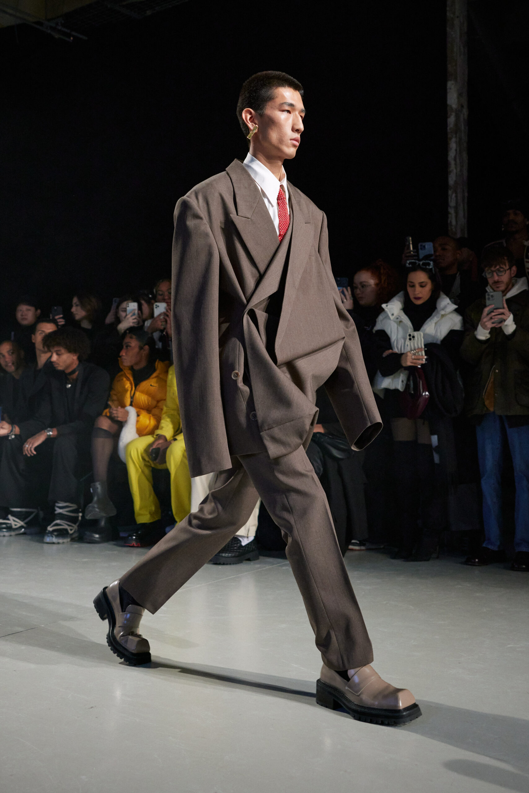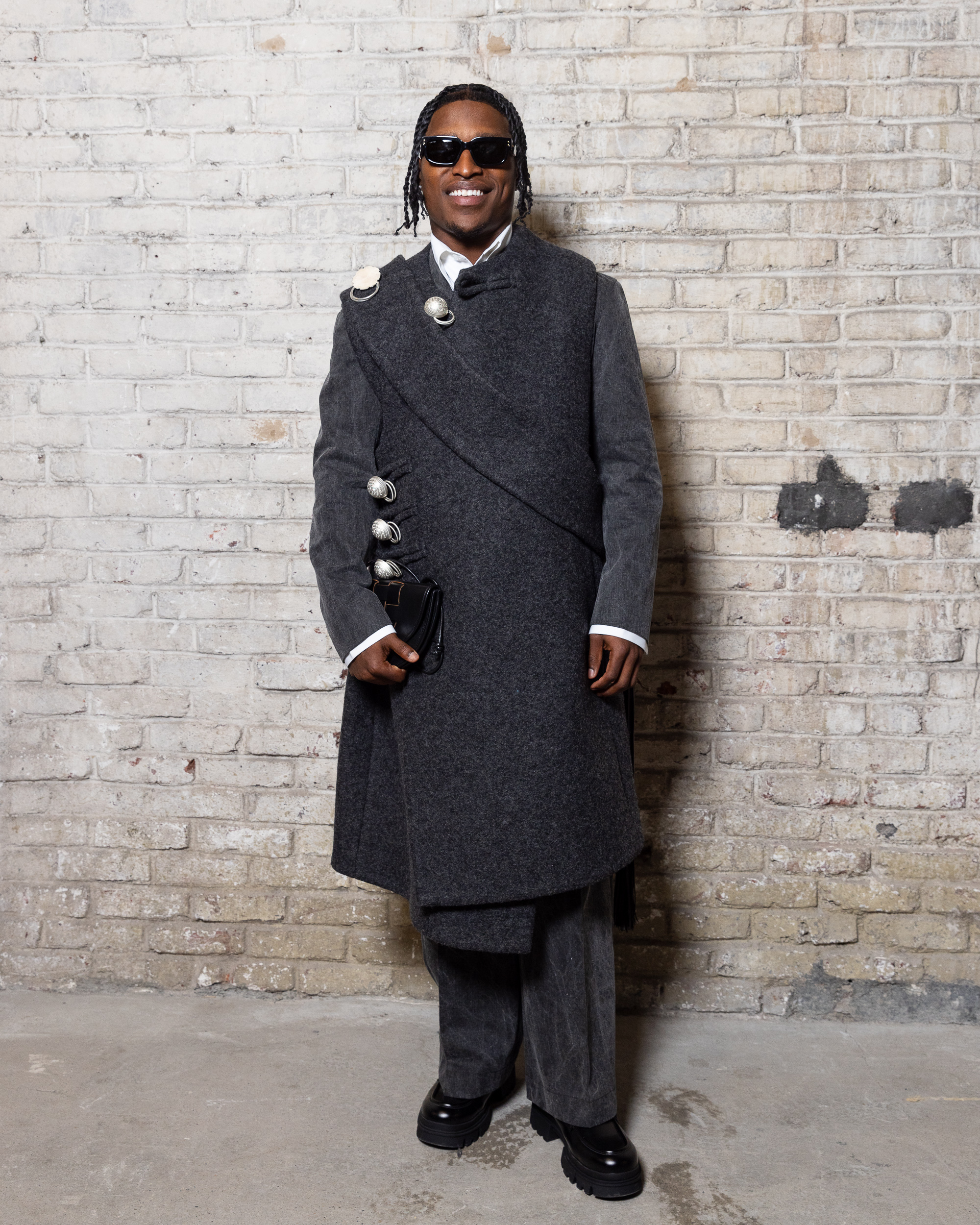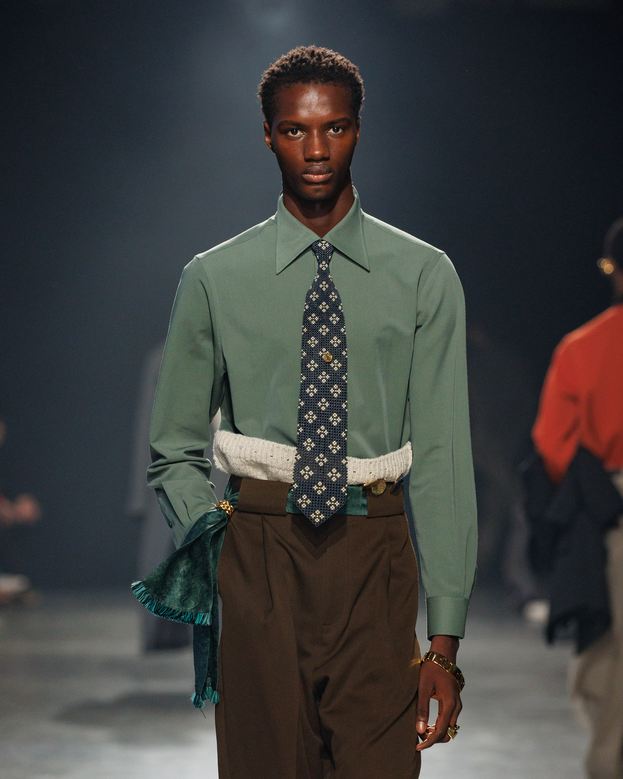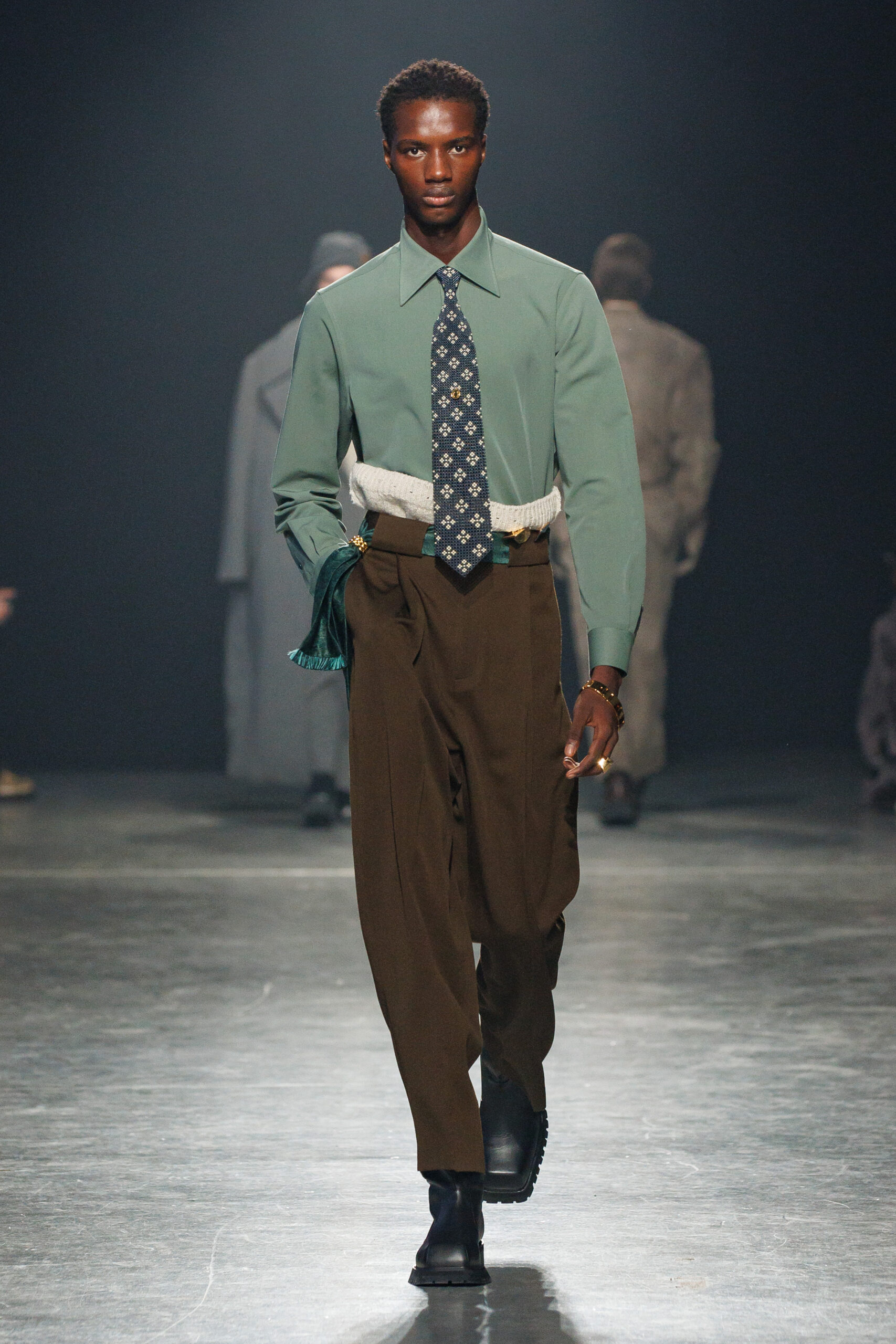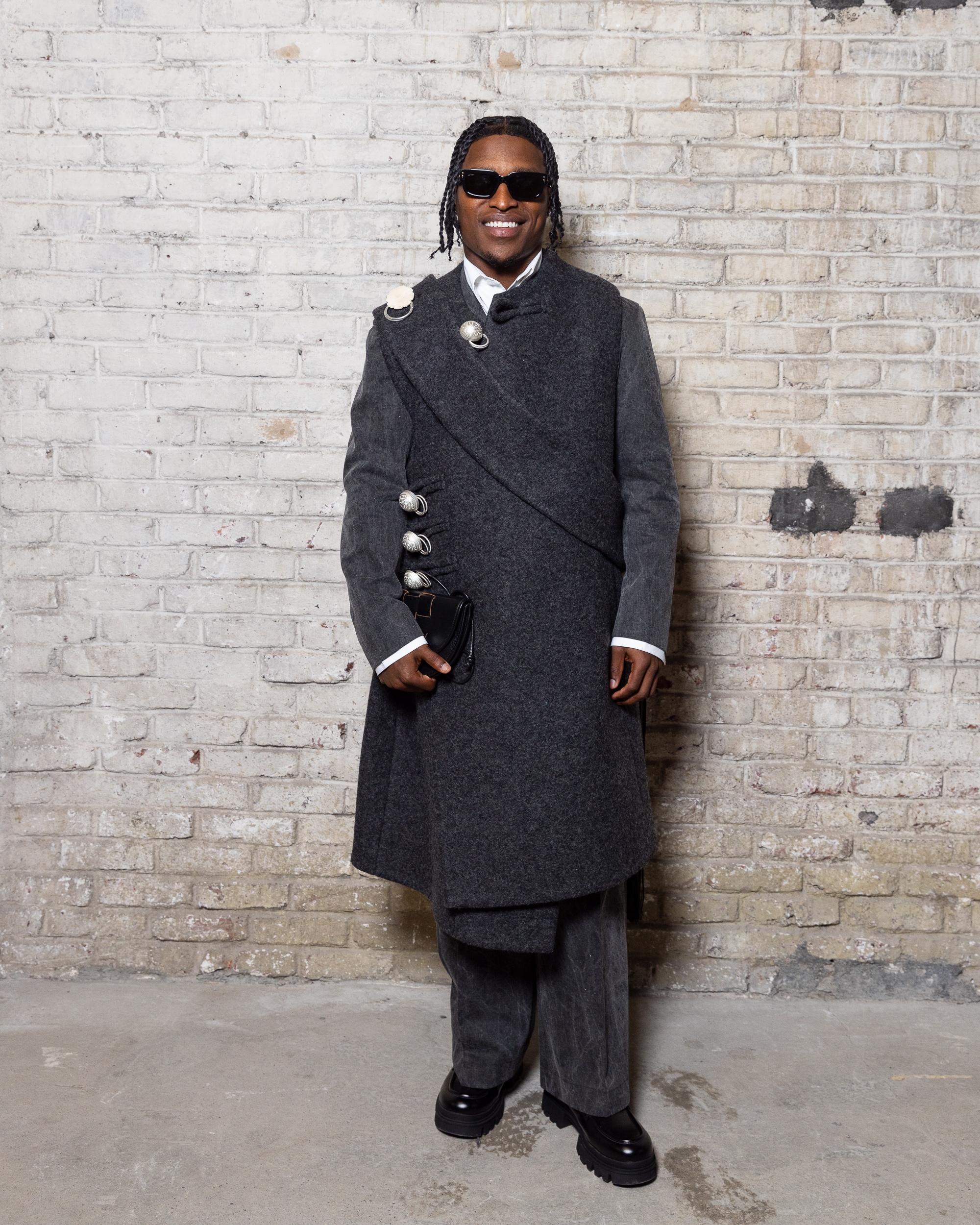 Sean Suen rend hommage aux classiques de son temps en revisitant des pièces emblématiques telles que les costumes en laine, les manteaux oversize et les tricots faits main. Il joue sur les contrastes en associant des couleurs vives et des accessoires masculins élaborés aux tons plus sobres comme le noir, le gris, le marron et le vert.