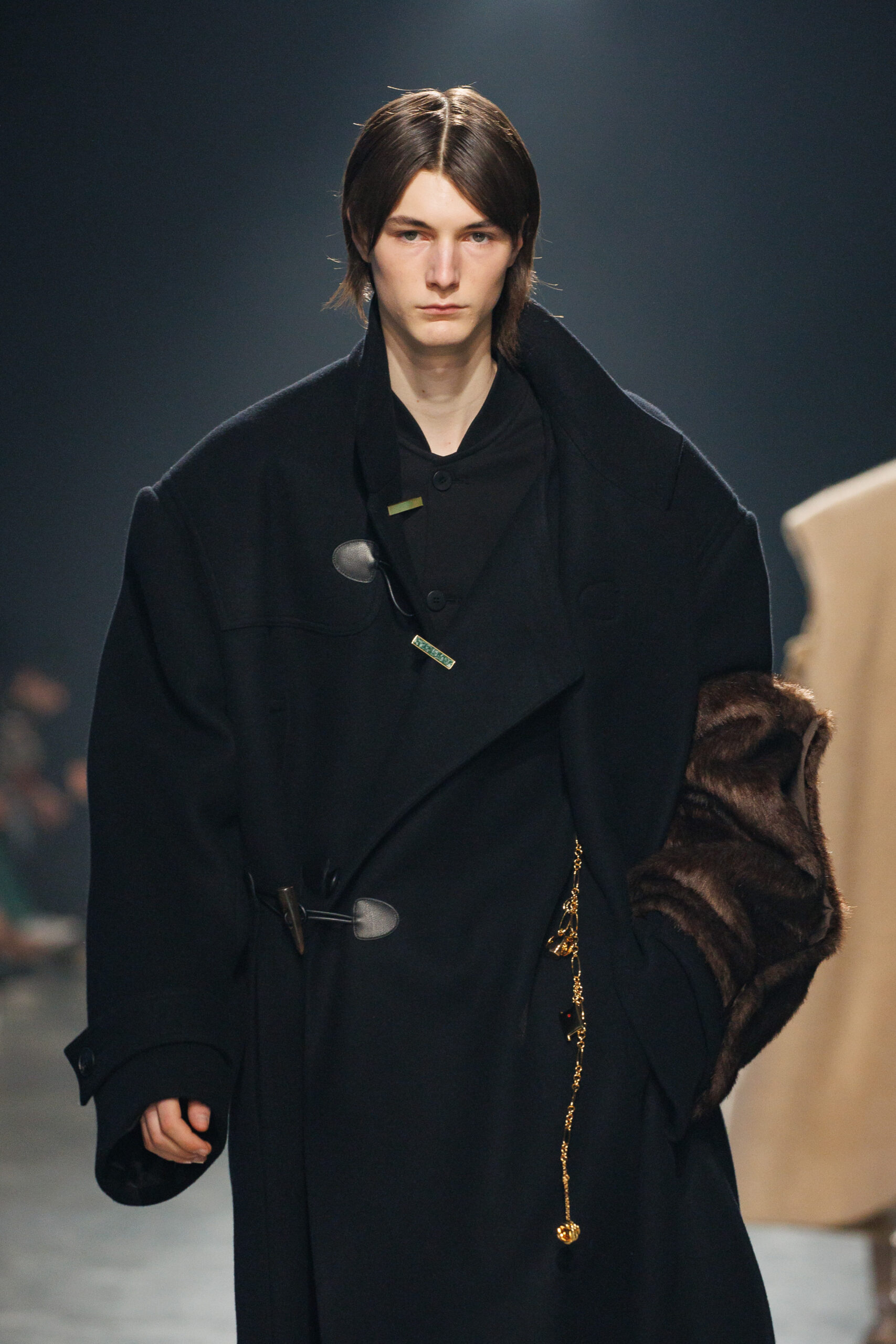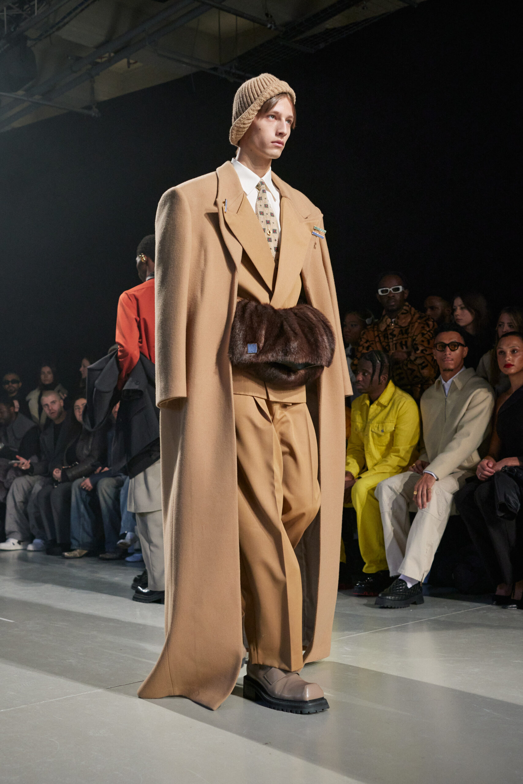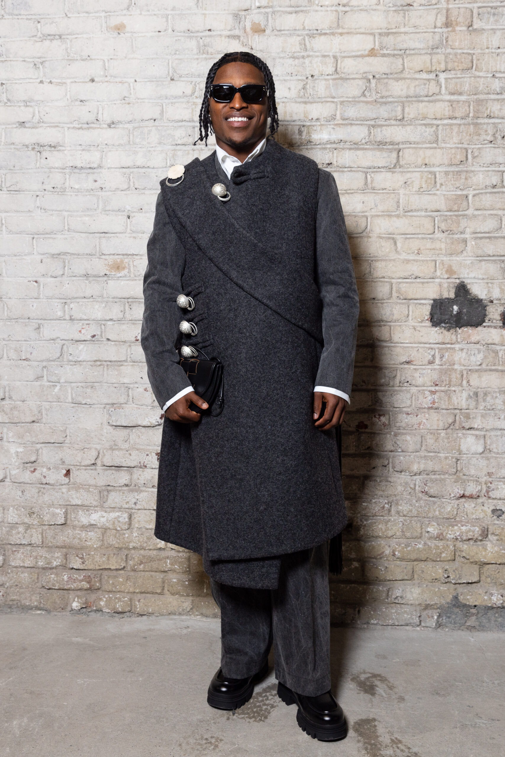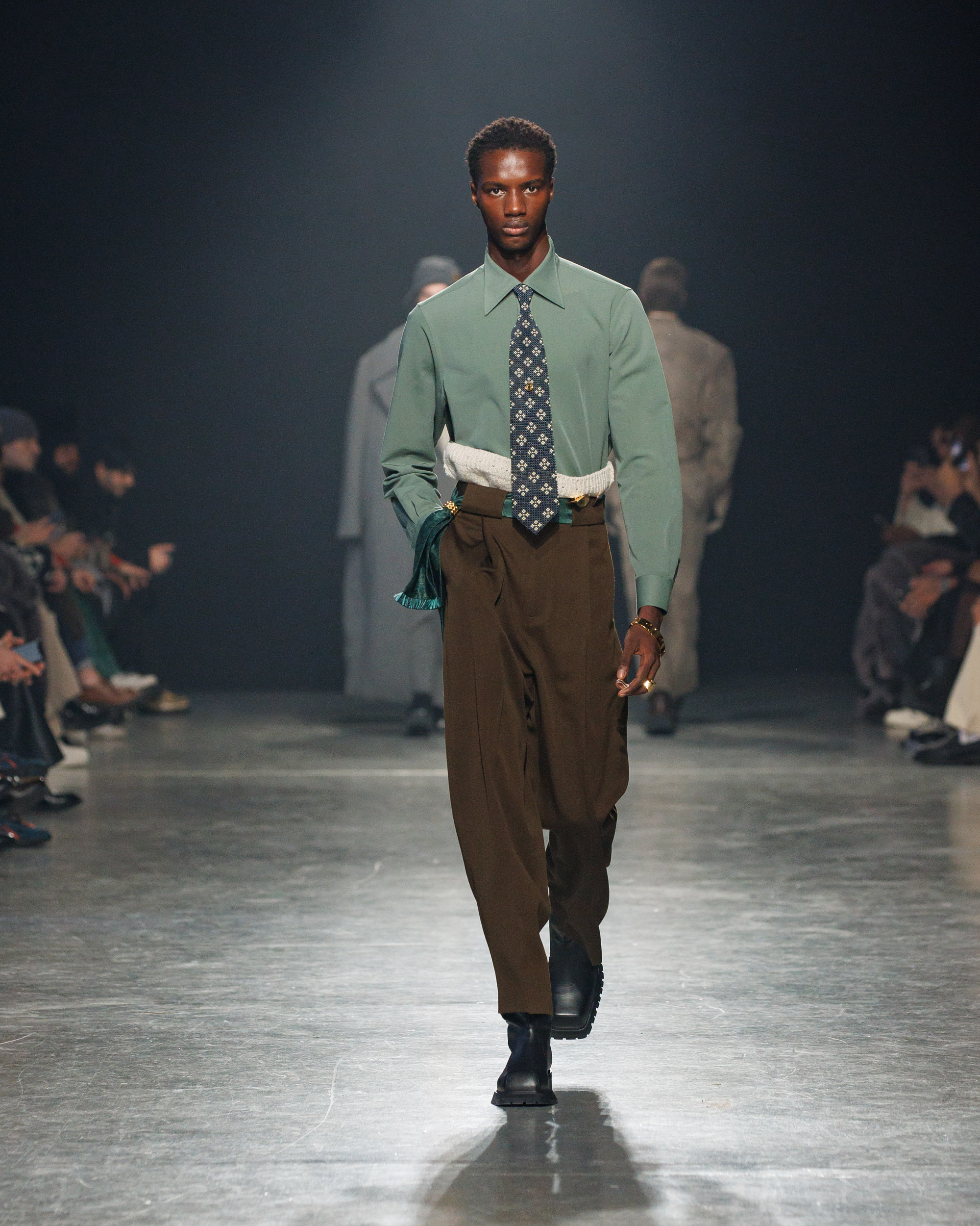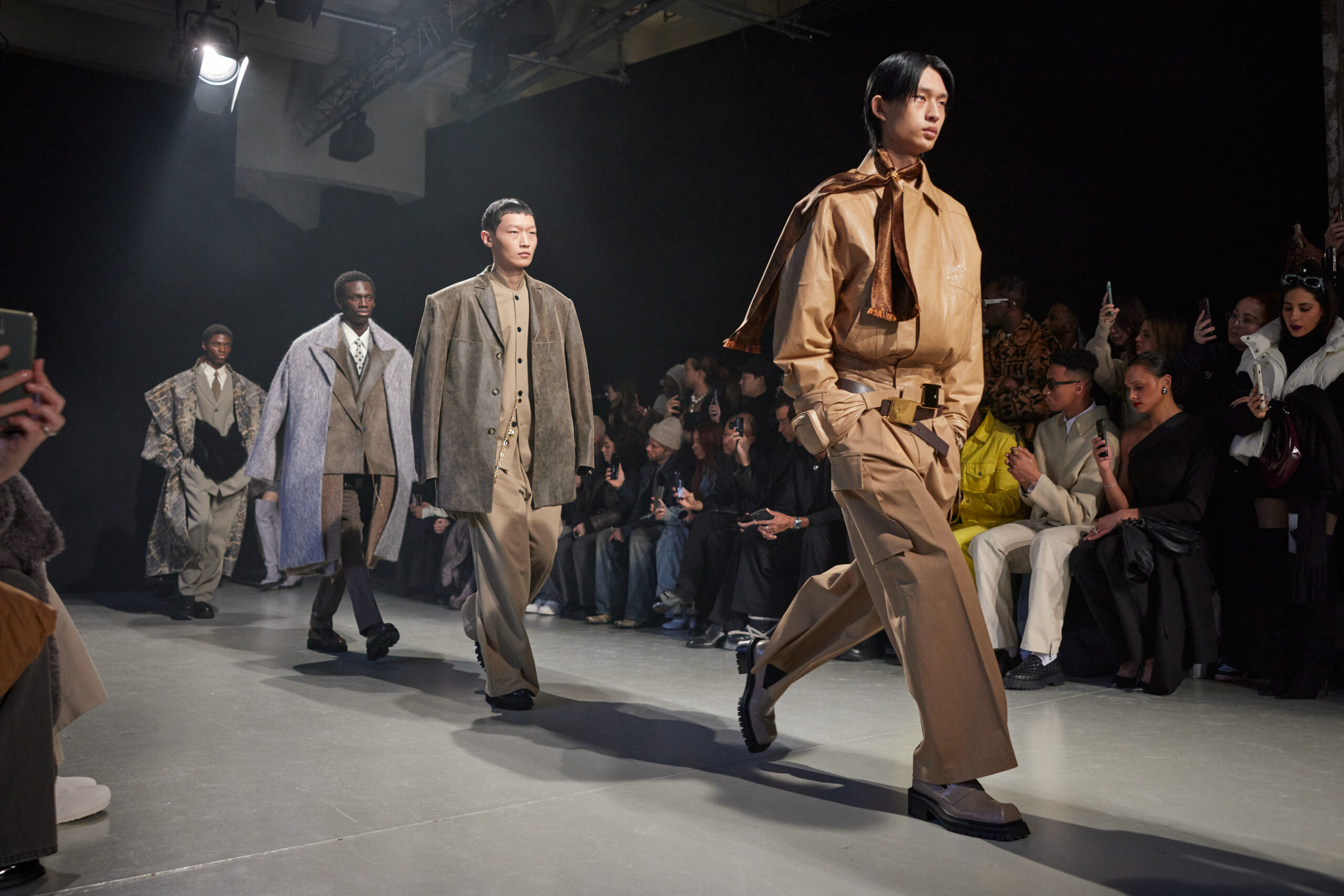Sean Suen rend hommage aux classiques de son temps en revisitant des pièces emblématiques telles que les costumes en laine, les manteaux oversize et les tricots faits main. Il joue sur les contrastes en associant des couleurs vives et des accessoires masculins élaborés aux tons plus sobres comme le noir, le gris, le marron et le vert.