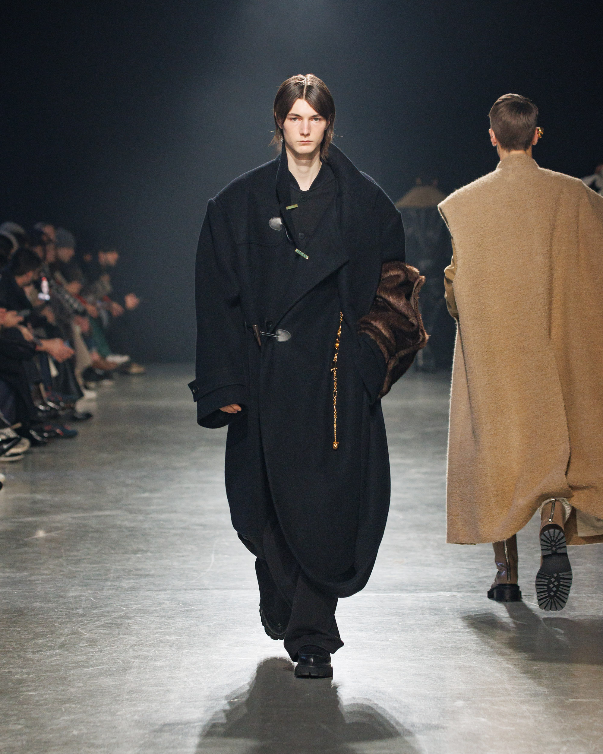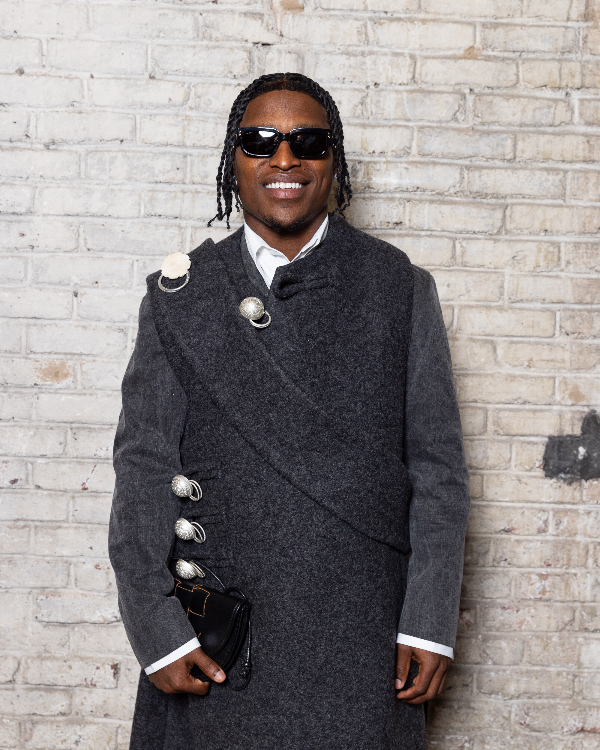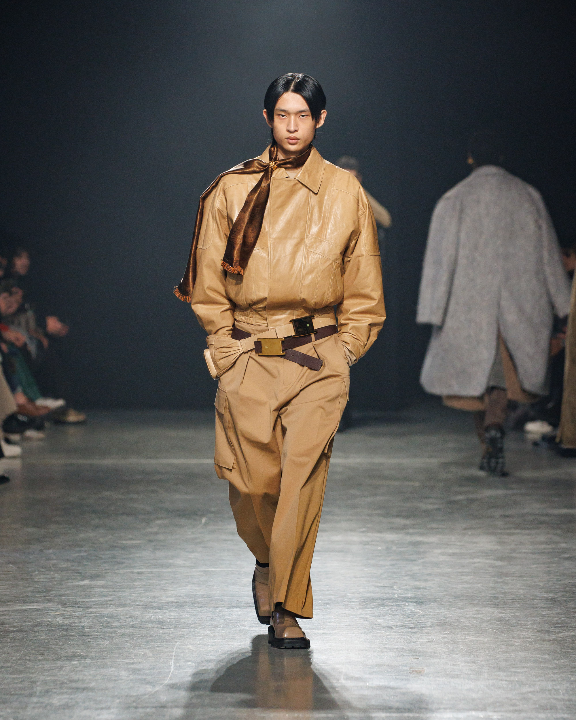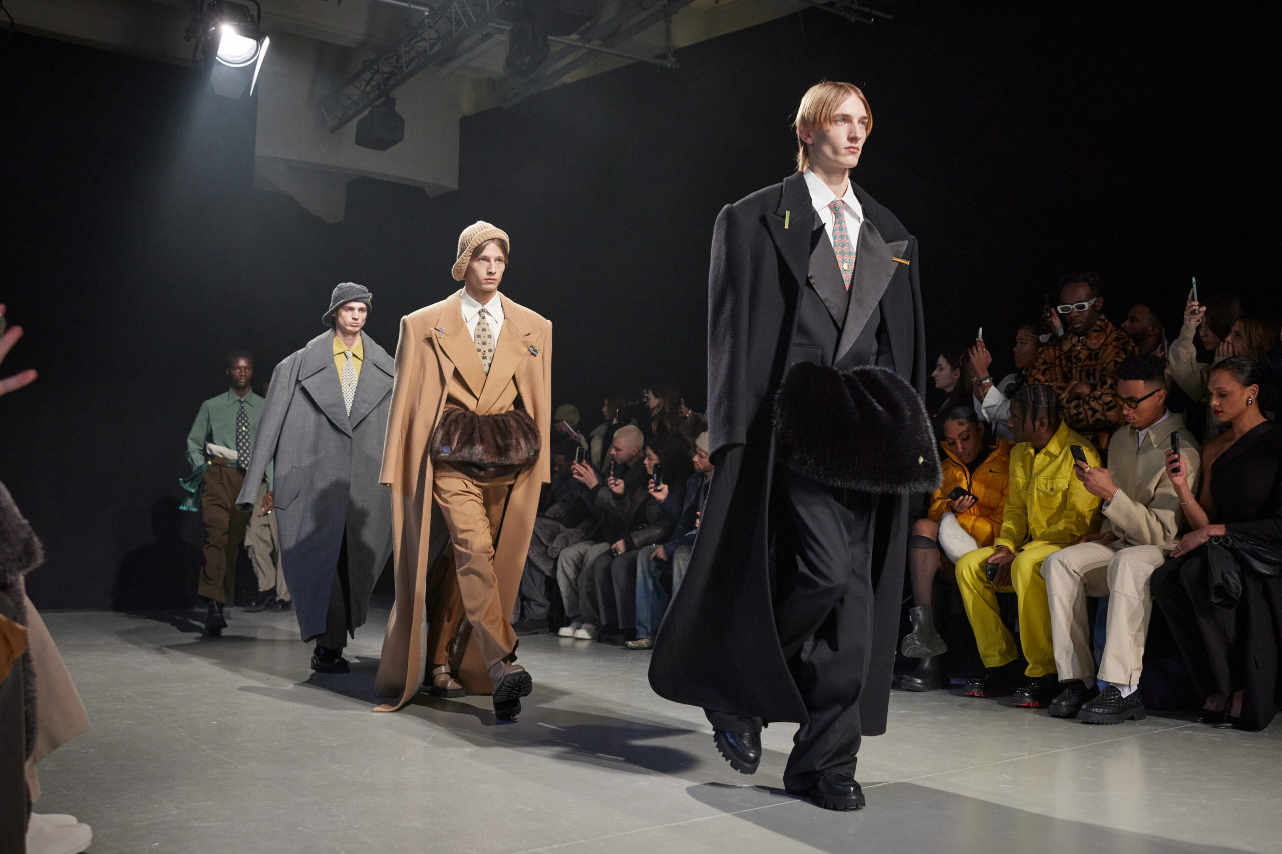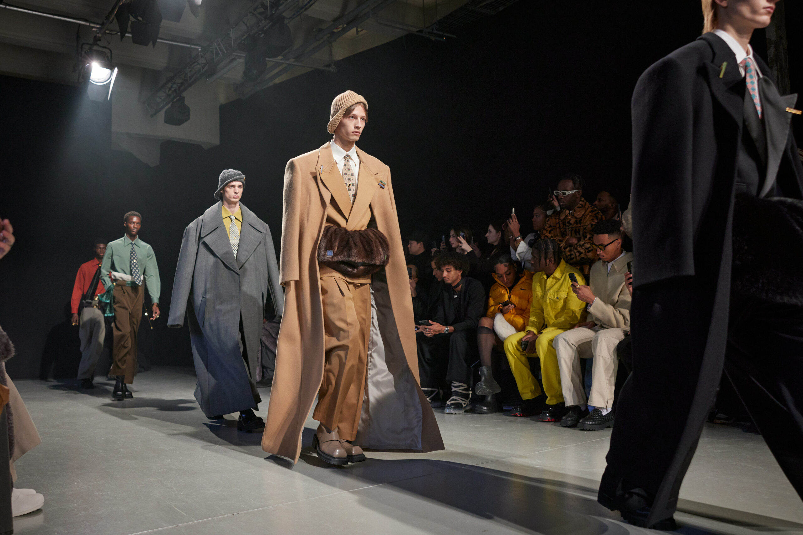 Sean Suen rend hommage aux classiques de son temps en revisitant des pièces emblématiques telles que les costumes en laine, les manteaux oversize et les tricots faits main. Il joue sur les contrastes en associant des couleurs vives et des accessoires masculins élaborés aux tons plus sobres comme le noir, le gris, le marron et le vert.