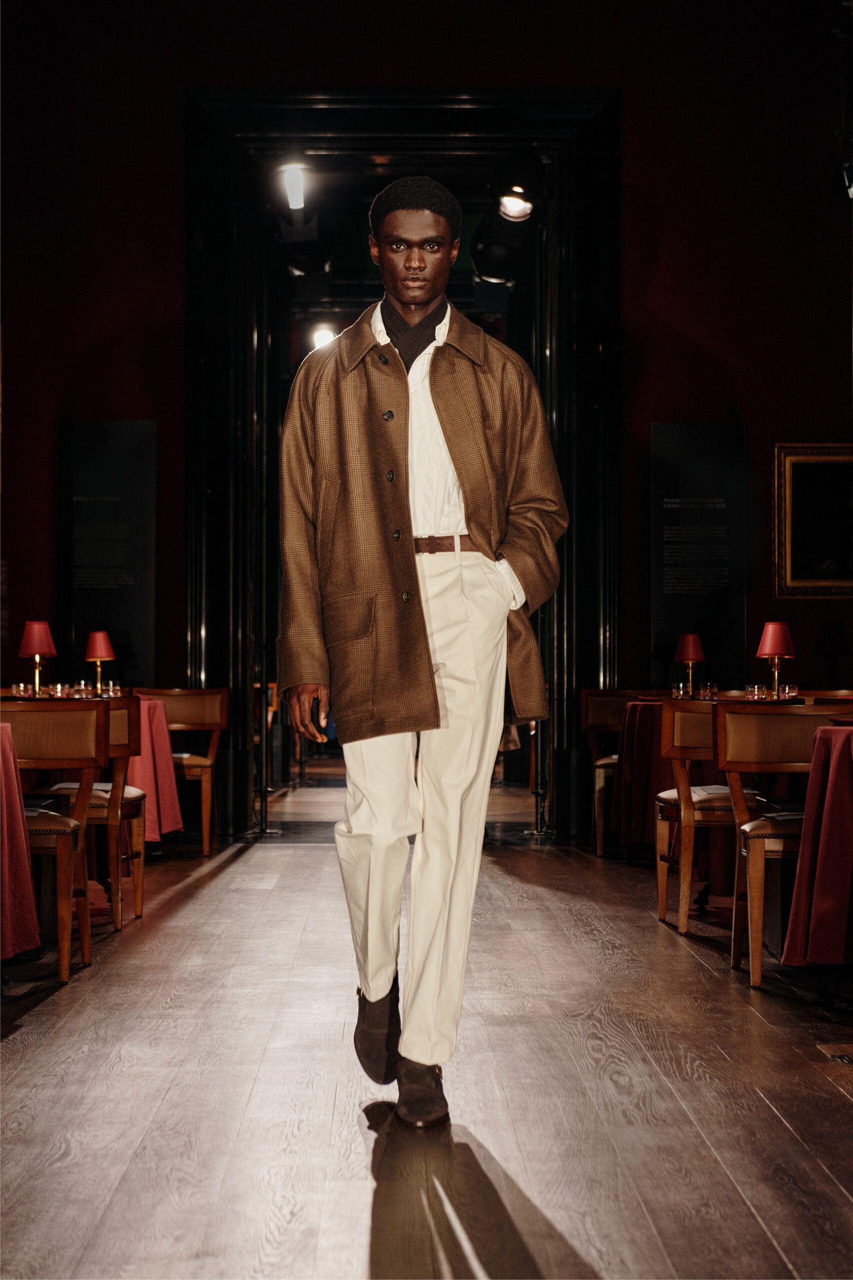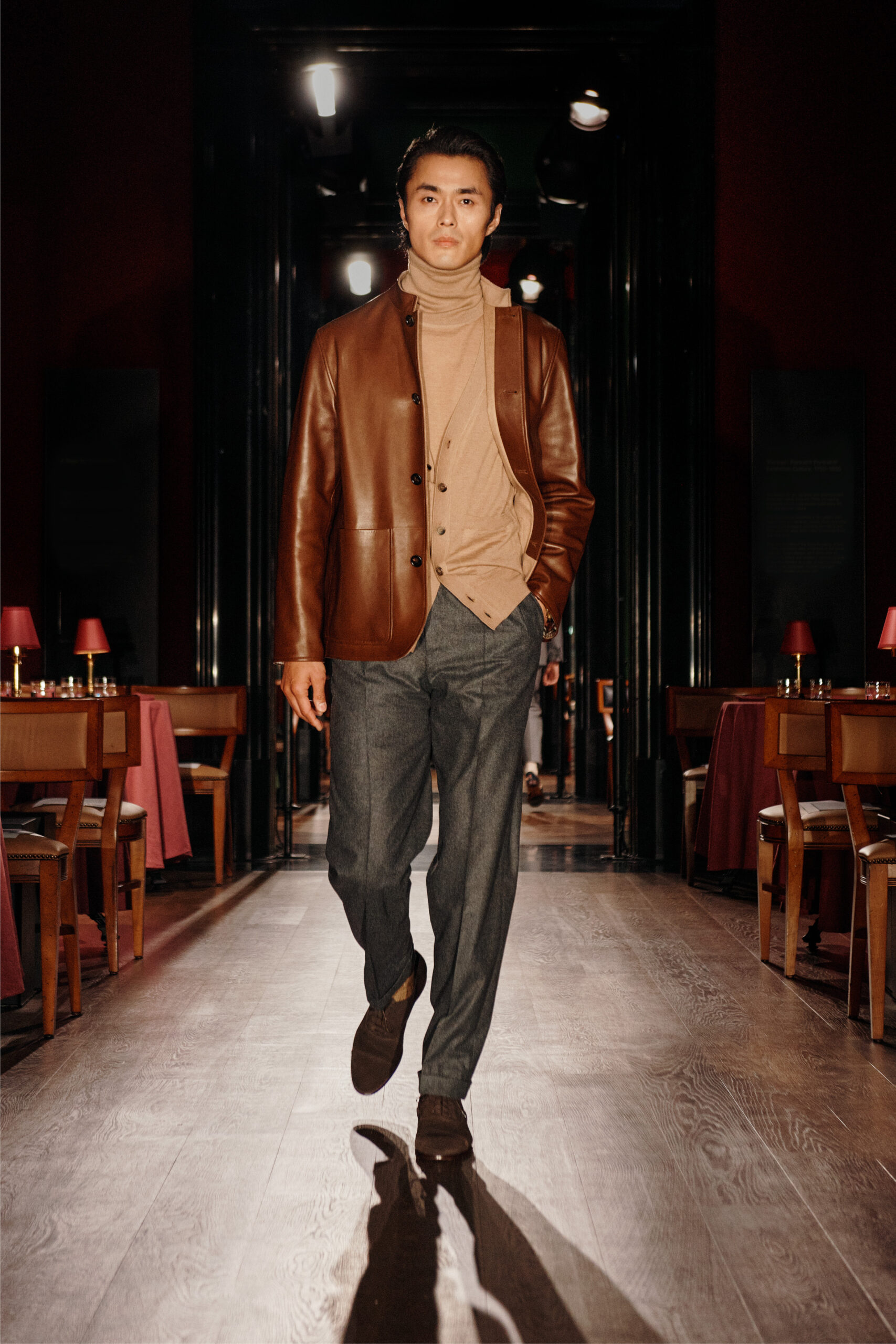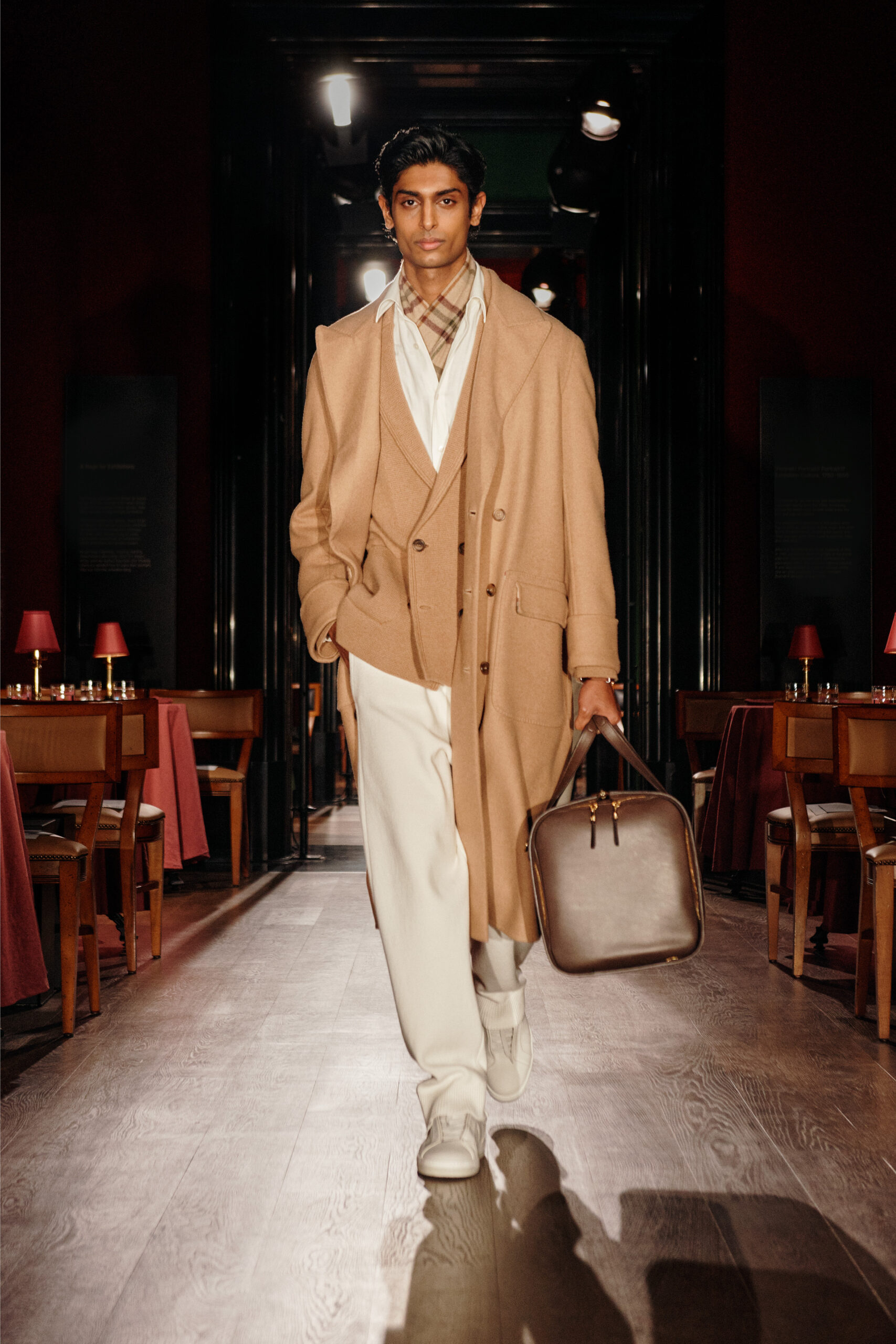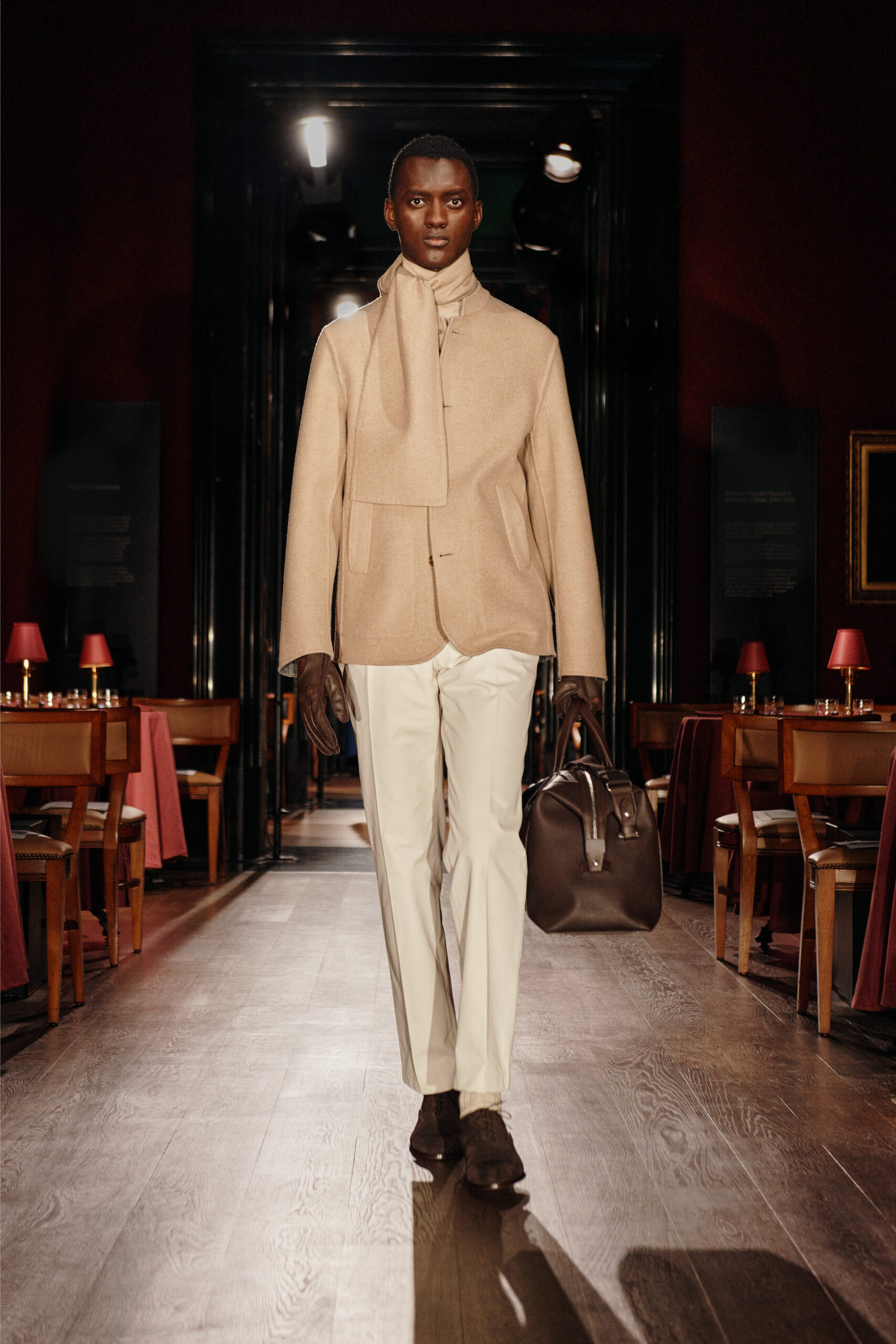 L’outerwear fait une déclaration audacieuse avec le manteau de voiture – une signature de la maison, conçu pour les voyageurs exigeants. Les pièces décontractées luxueuses, telles que les vestes de conduite réversibles ou les twinsets en tricot, arborent des tons aristocratiques de toffee, brun chocolat et crème.