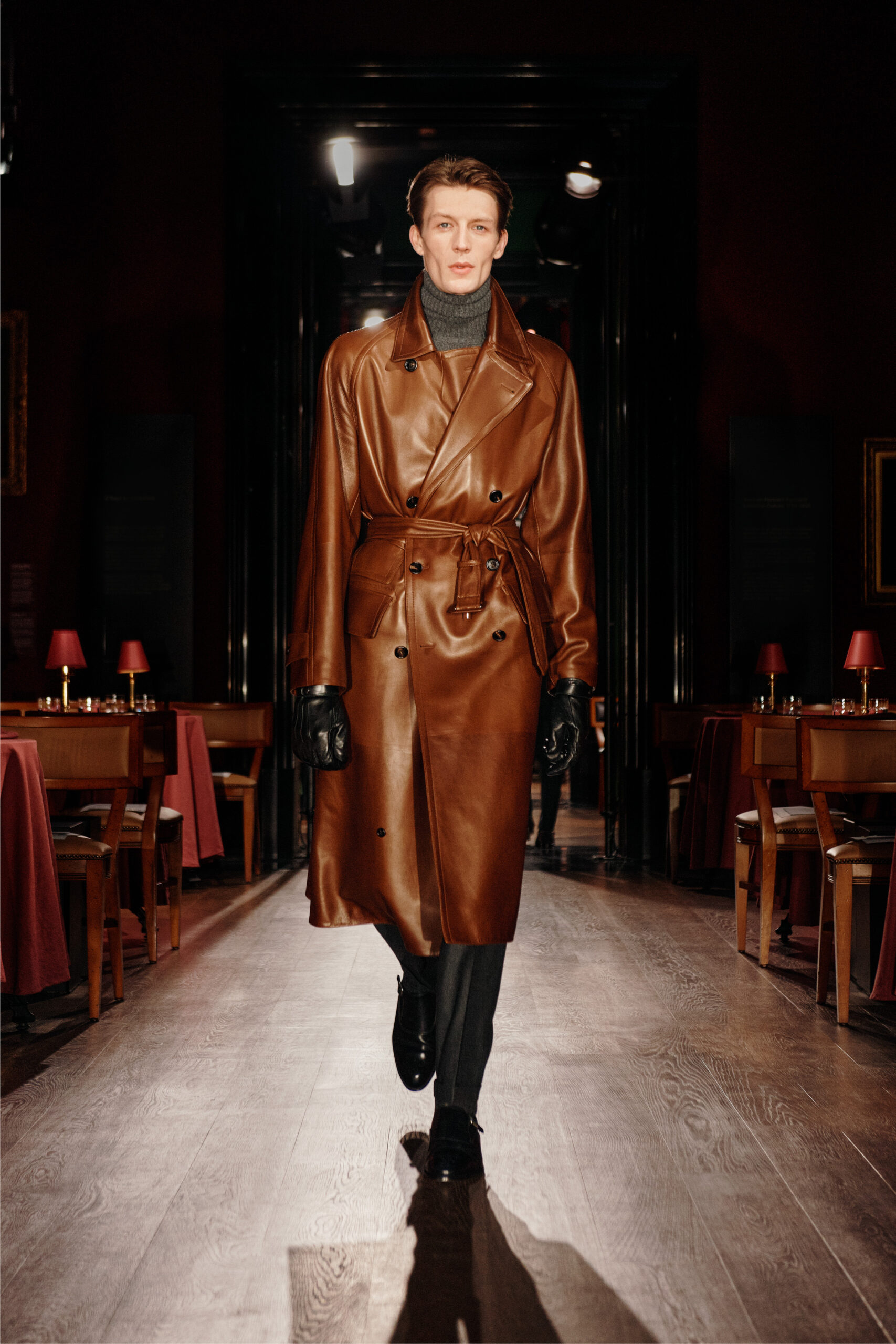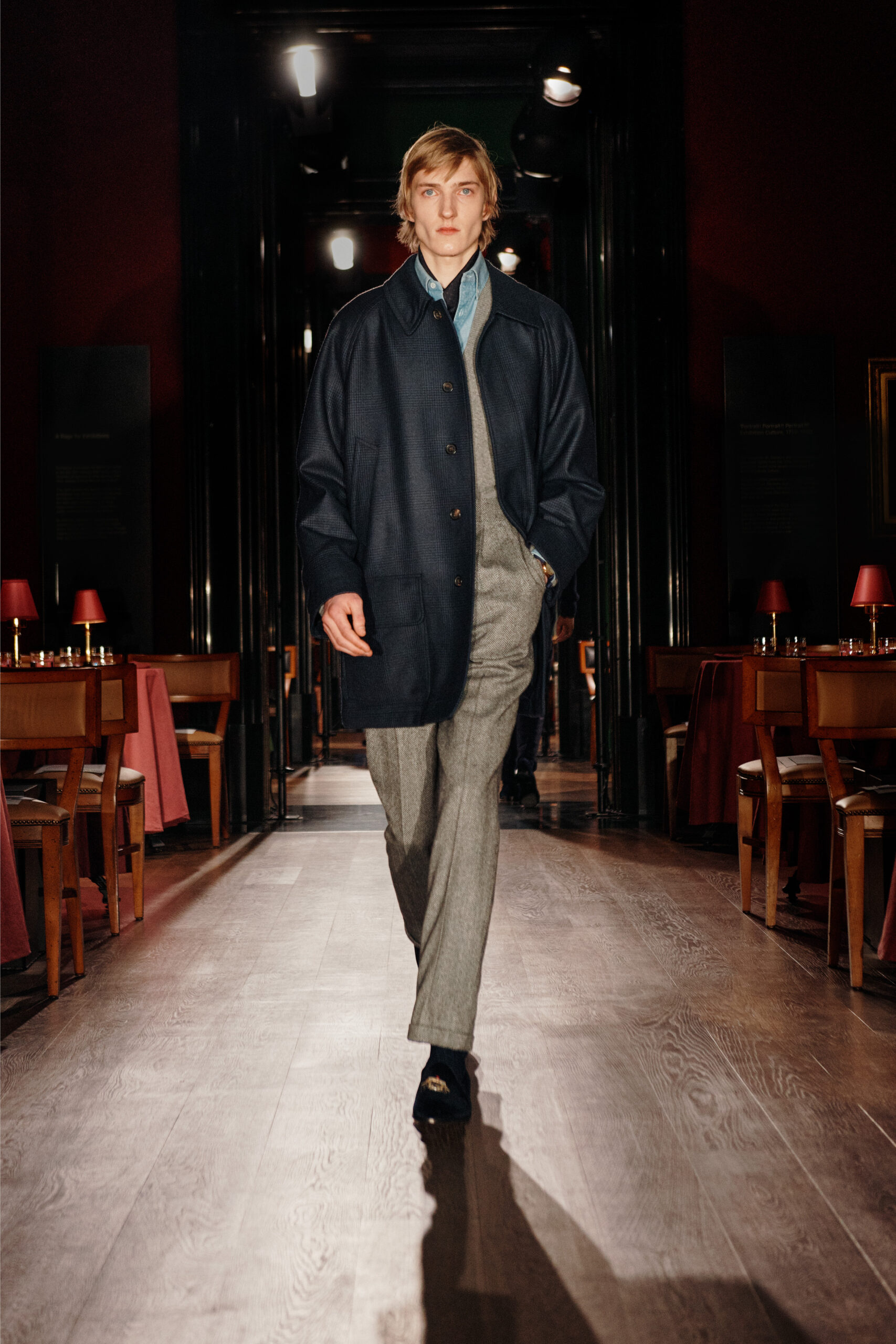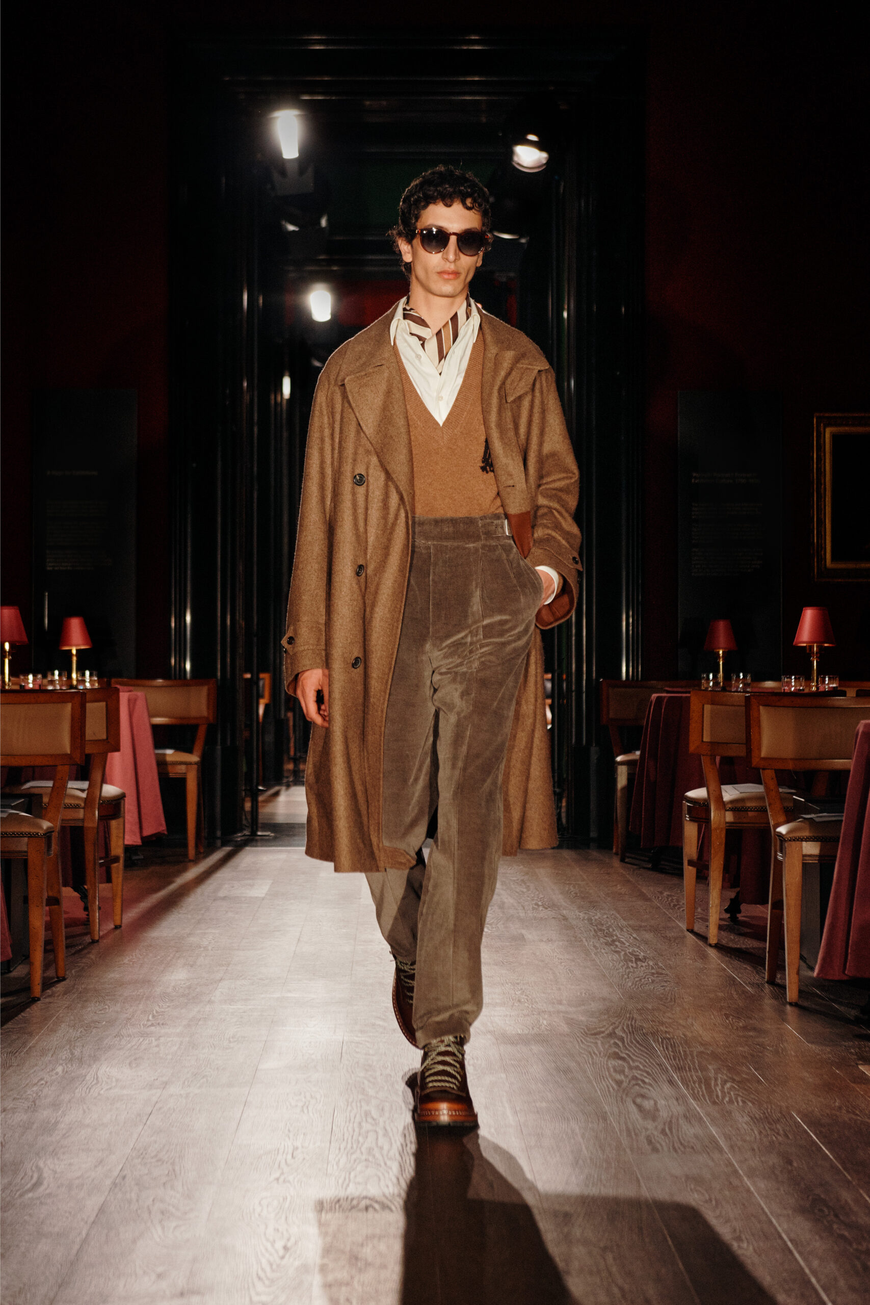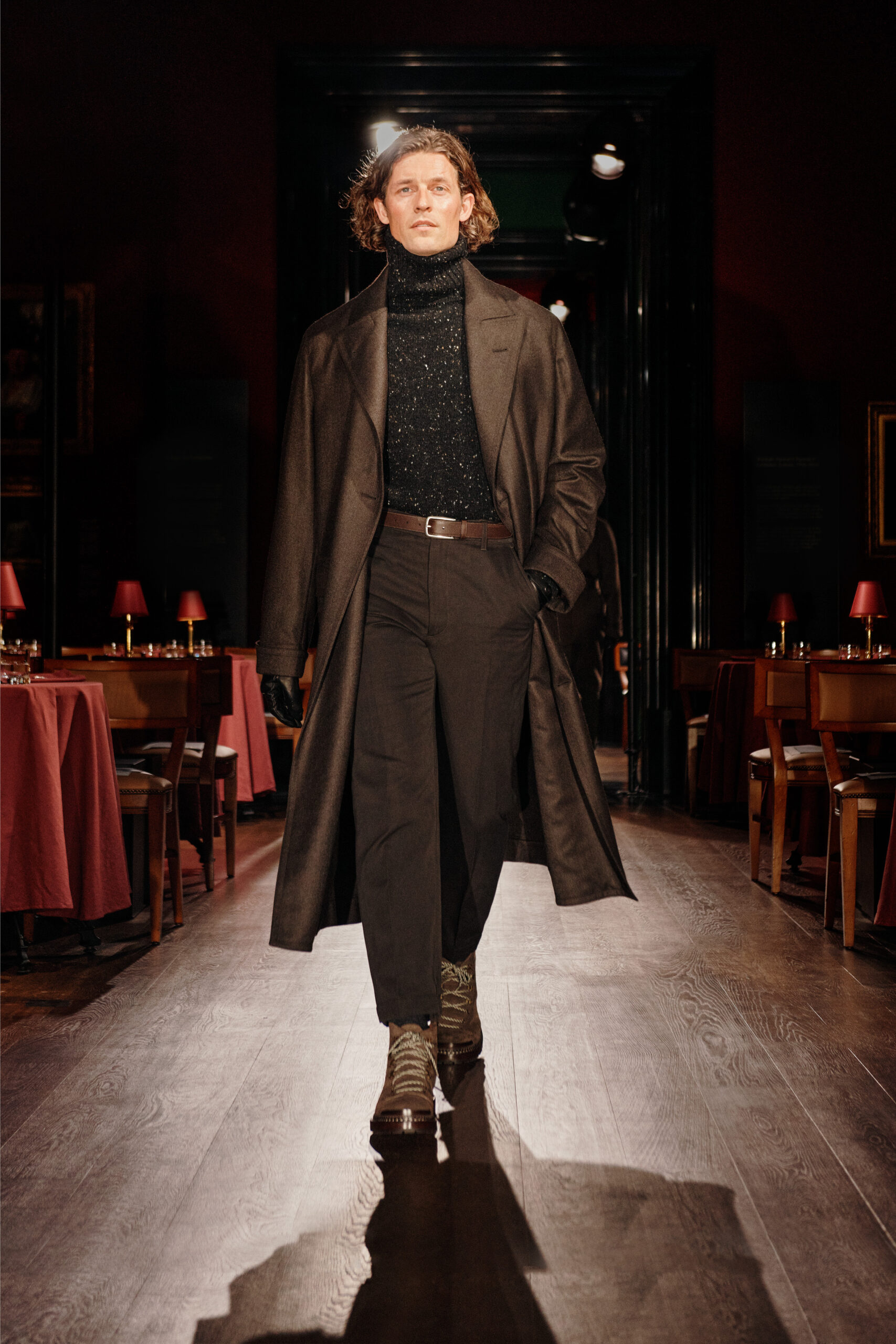 L’outerwear fait une déclaration audacieuse avec le manteau de voiture – une signature de la maison, conçu pour les voyageurs exigeants. Les pièces décontractées luxueuses, telles que les vestes de conduite réversibles ou les twinsets en tricot, arborent des tons aristocratiques de toffee, brun chocolat et crème.