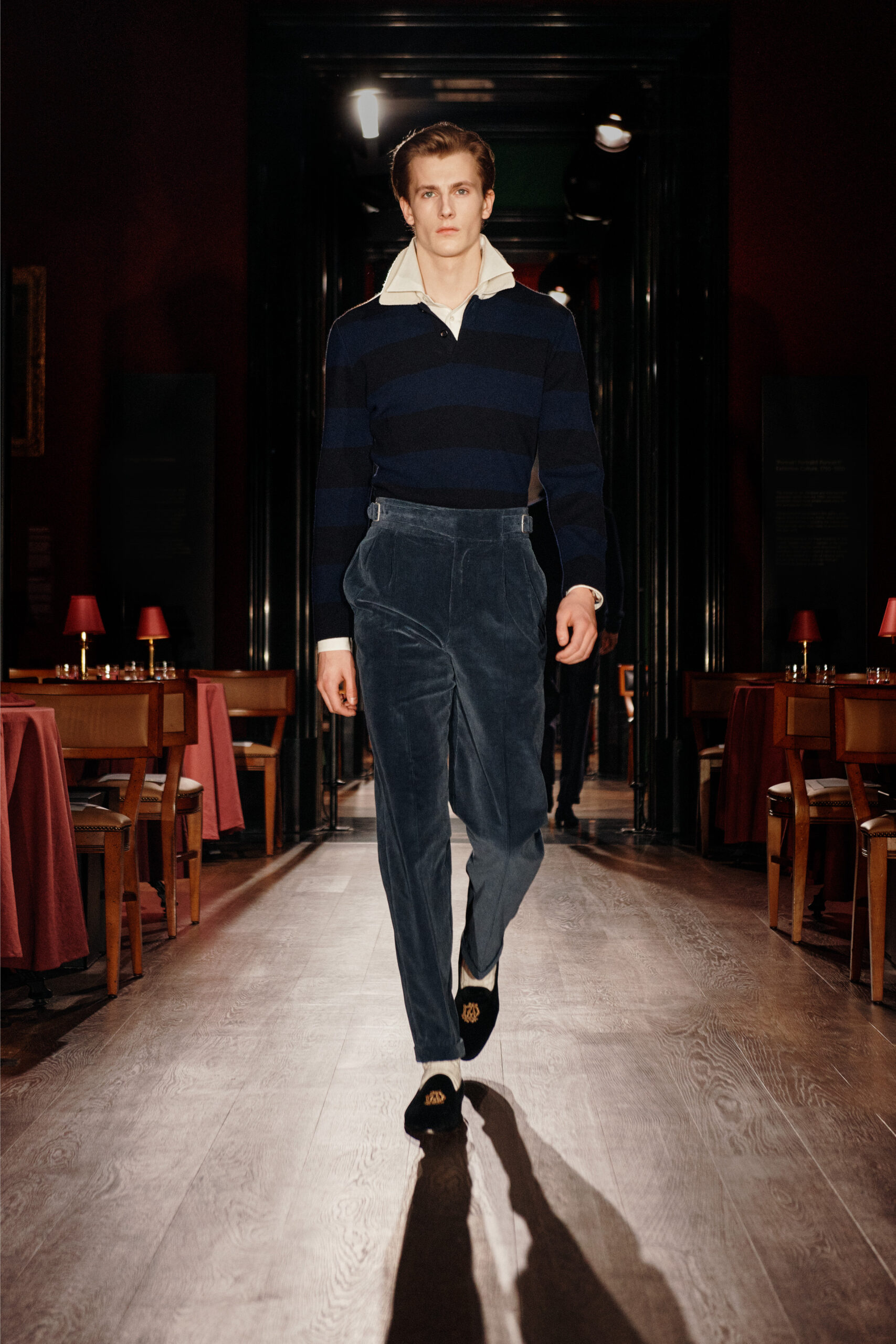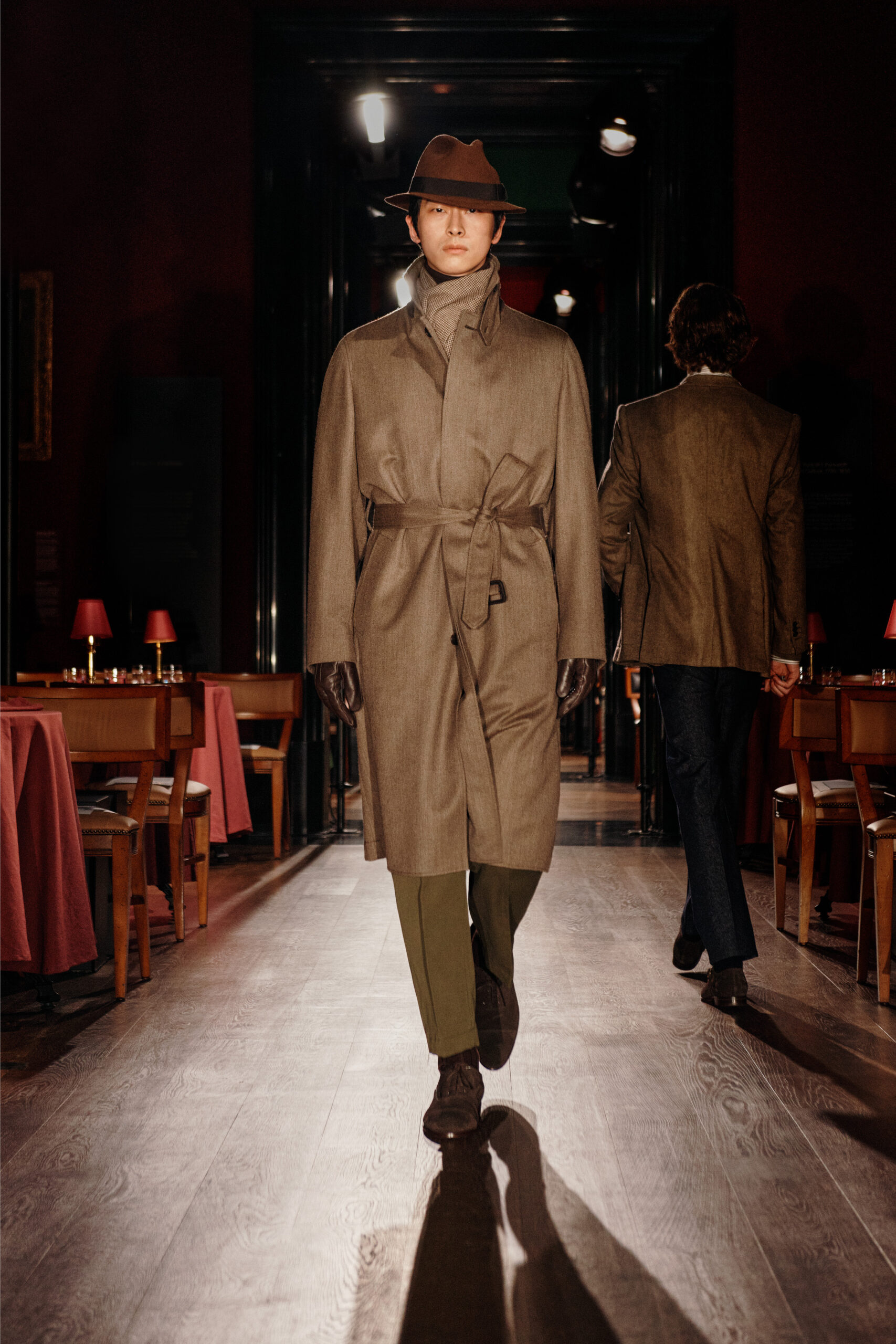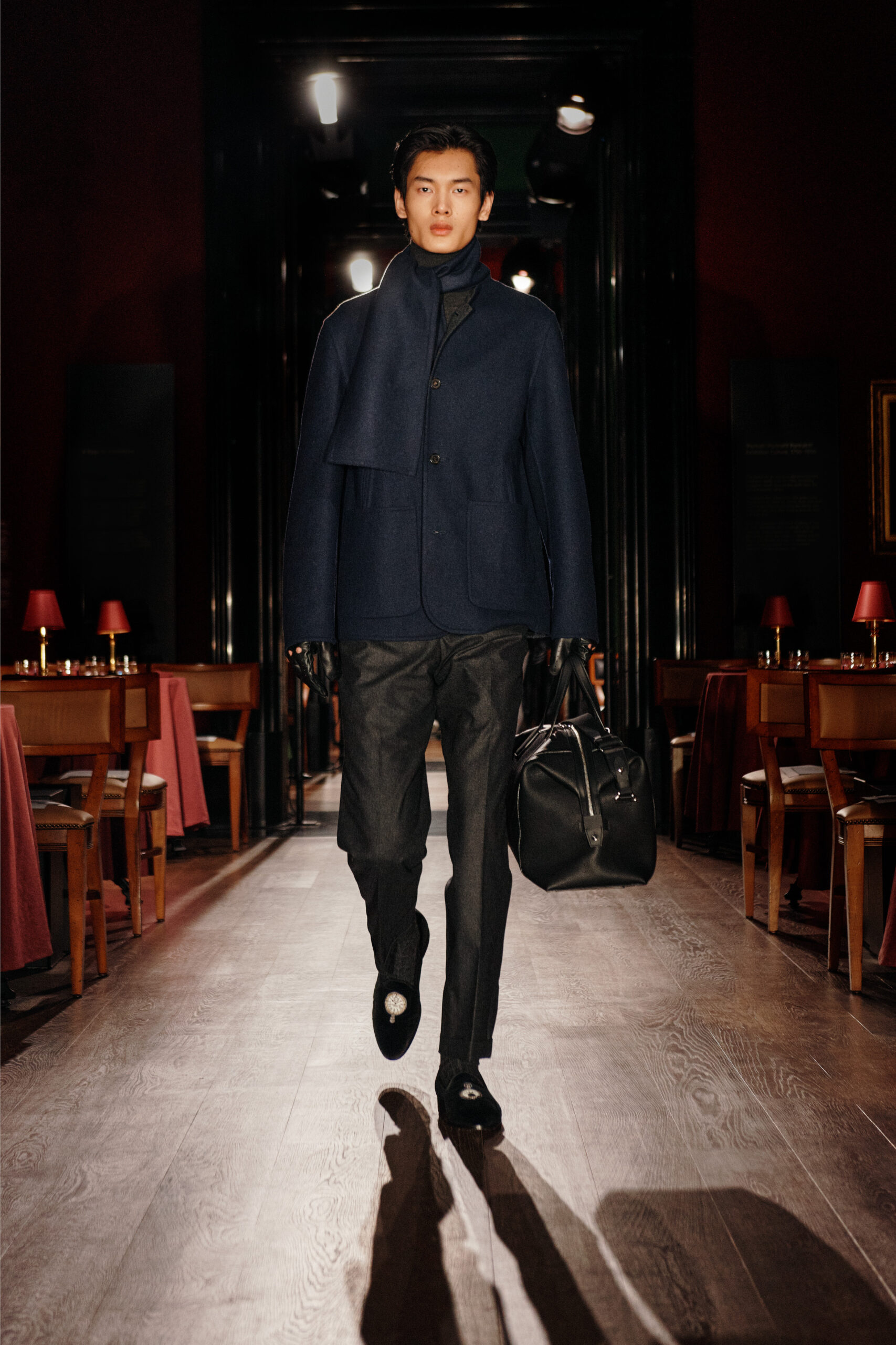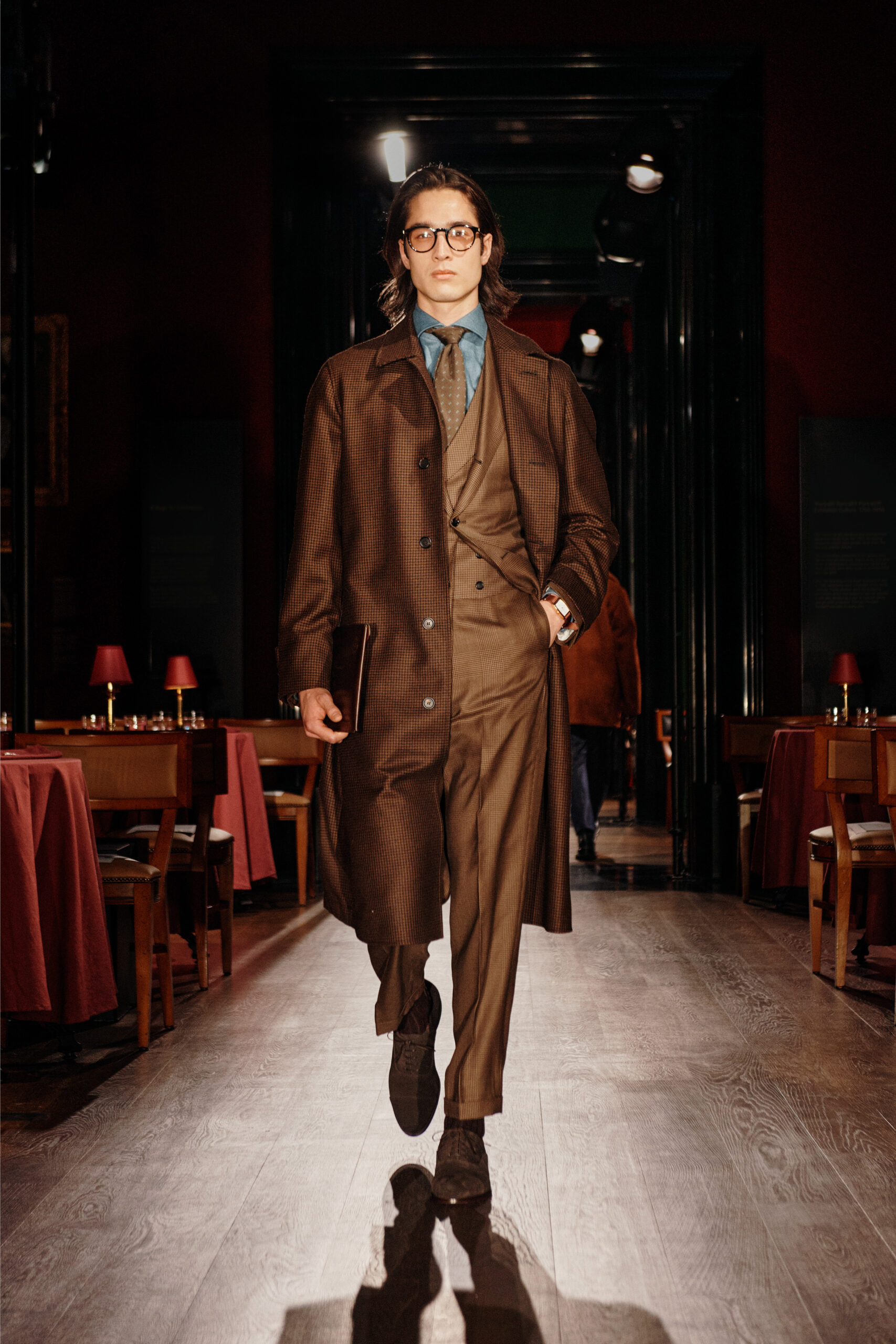 L’outerwear fait une déclaration audacieuse avec le manteau de voiture – une signature de la maison, conçu pour les voyageurs exigeants. Les pièces décontractées luxueuses, telles que les vestes de conduite réversibles ou les twinsets en tricot, arborent des tons aristocratiques de toffee, brun chocolat et crème.