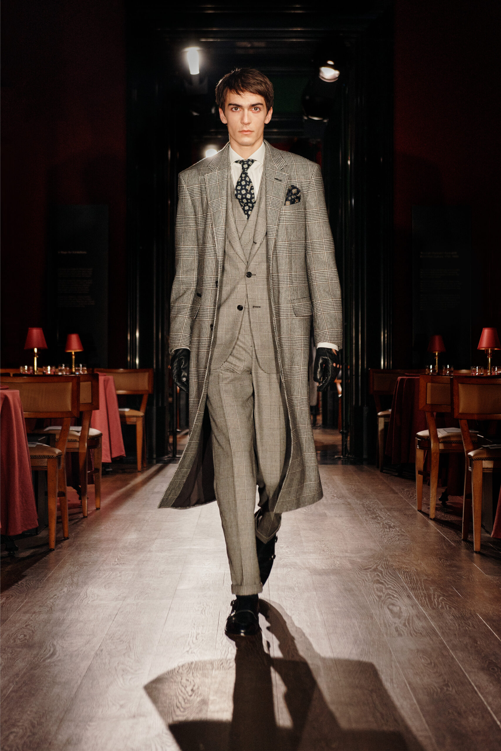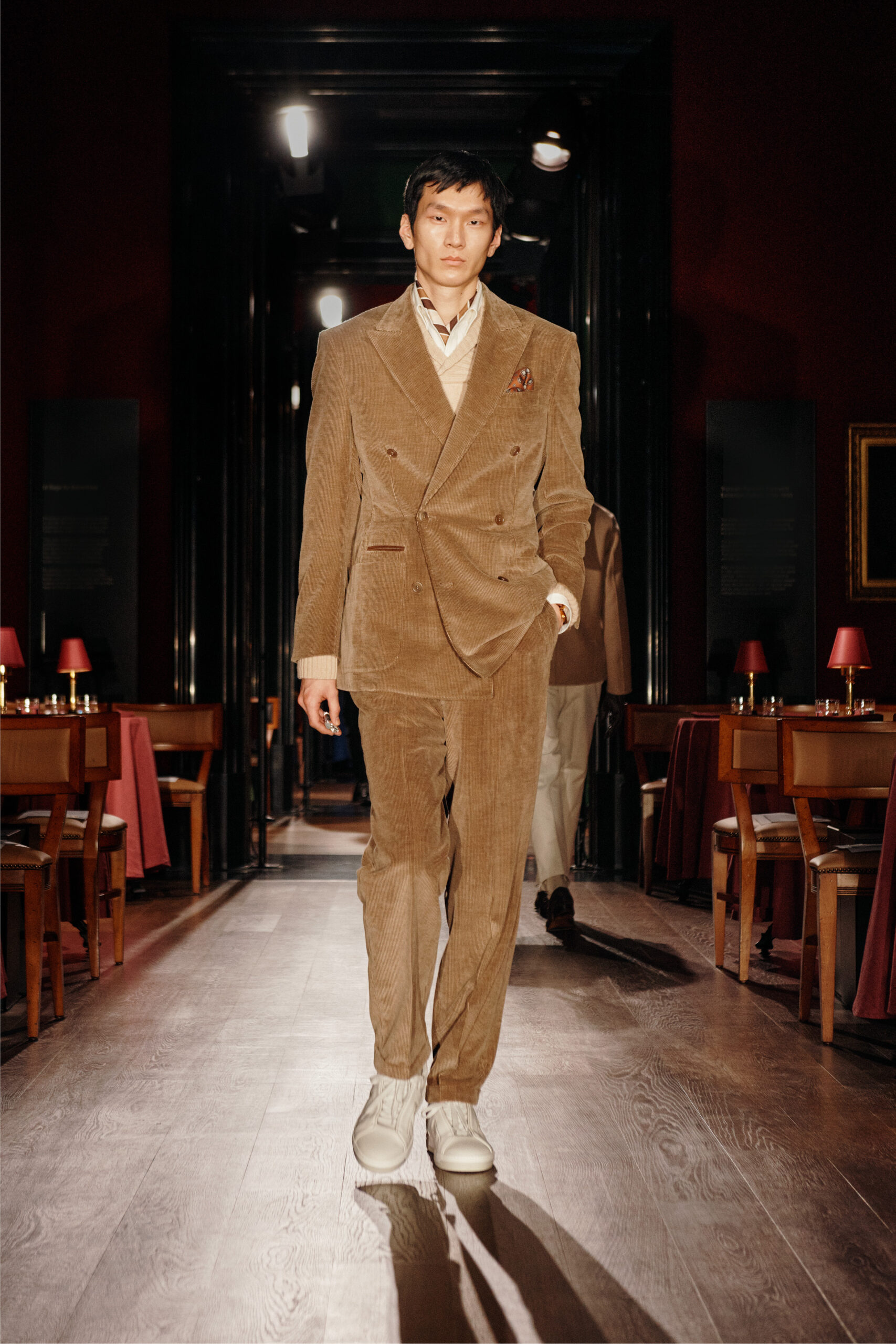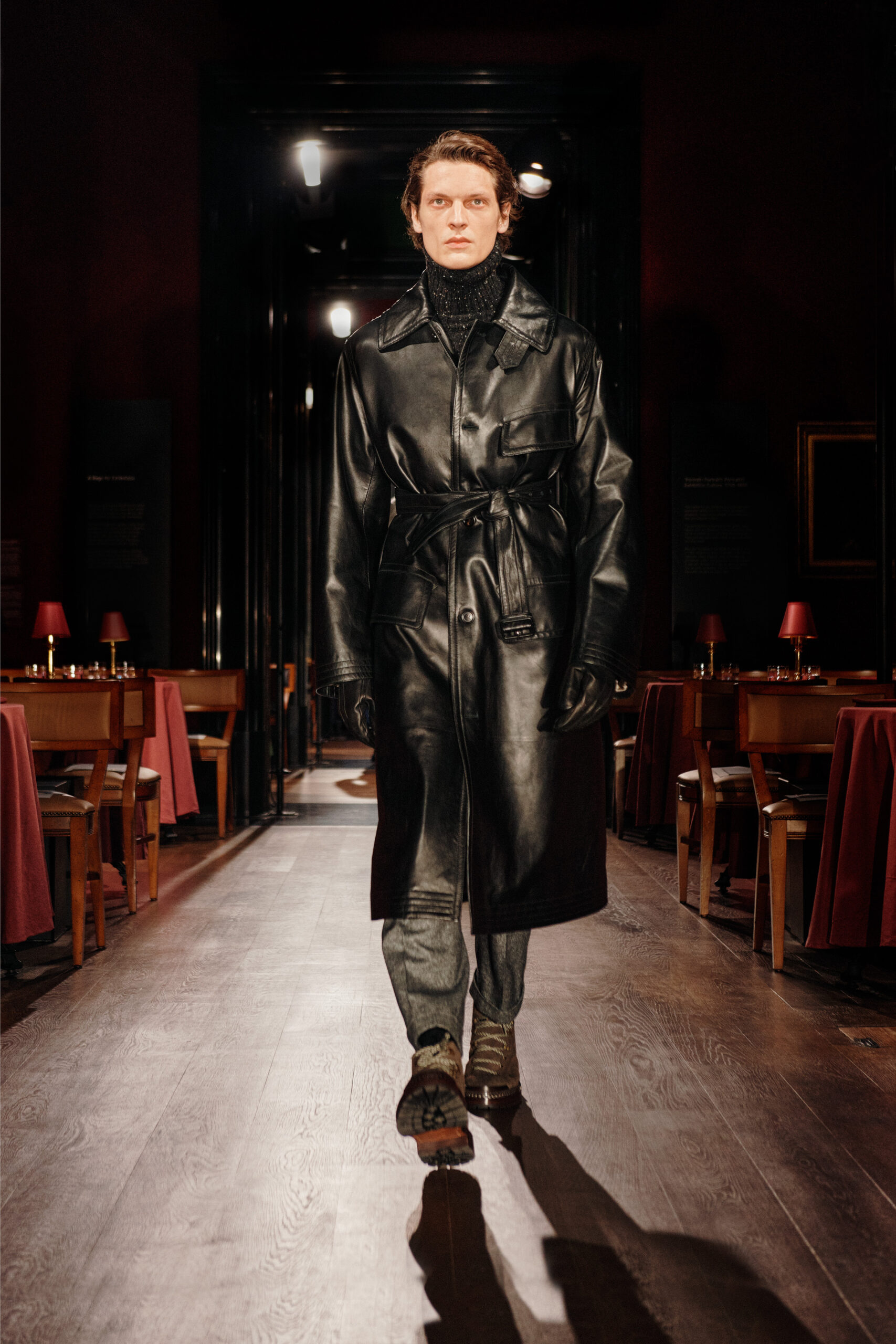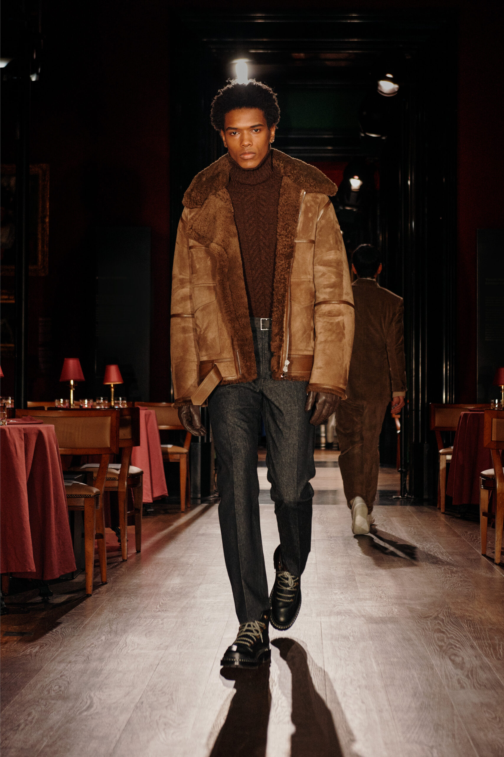 L’outerwear fait une déclaration audacieuse avec le manteau de voiture – une signature de la maison, conçu pour les voyageurs exigeants. Les pièces décontractées luxueuses, telles que les vestes de conduite réversibles ou les twinsets en tricot, arborent des tons aristocratiques de toffee, brun chocolat et crème.