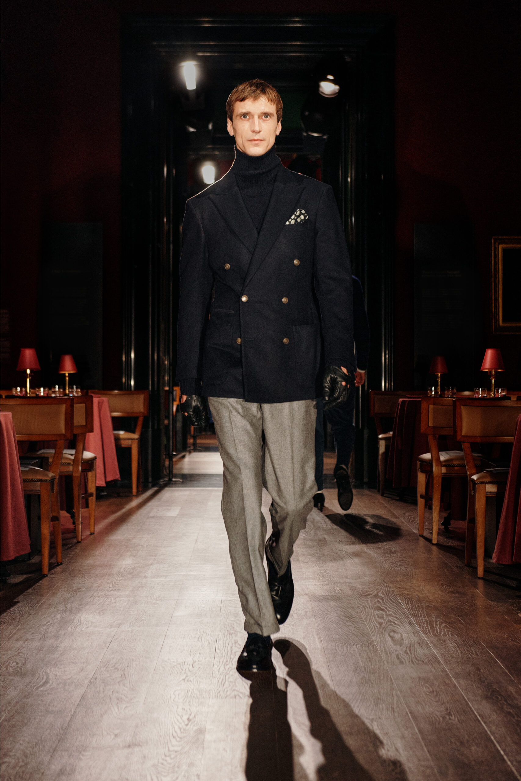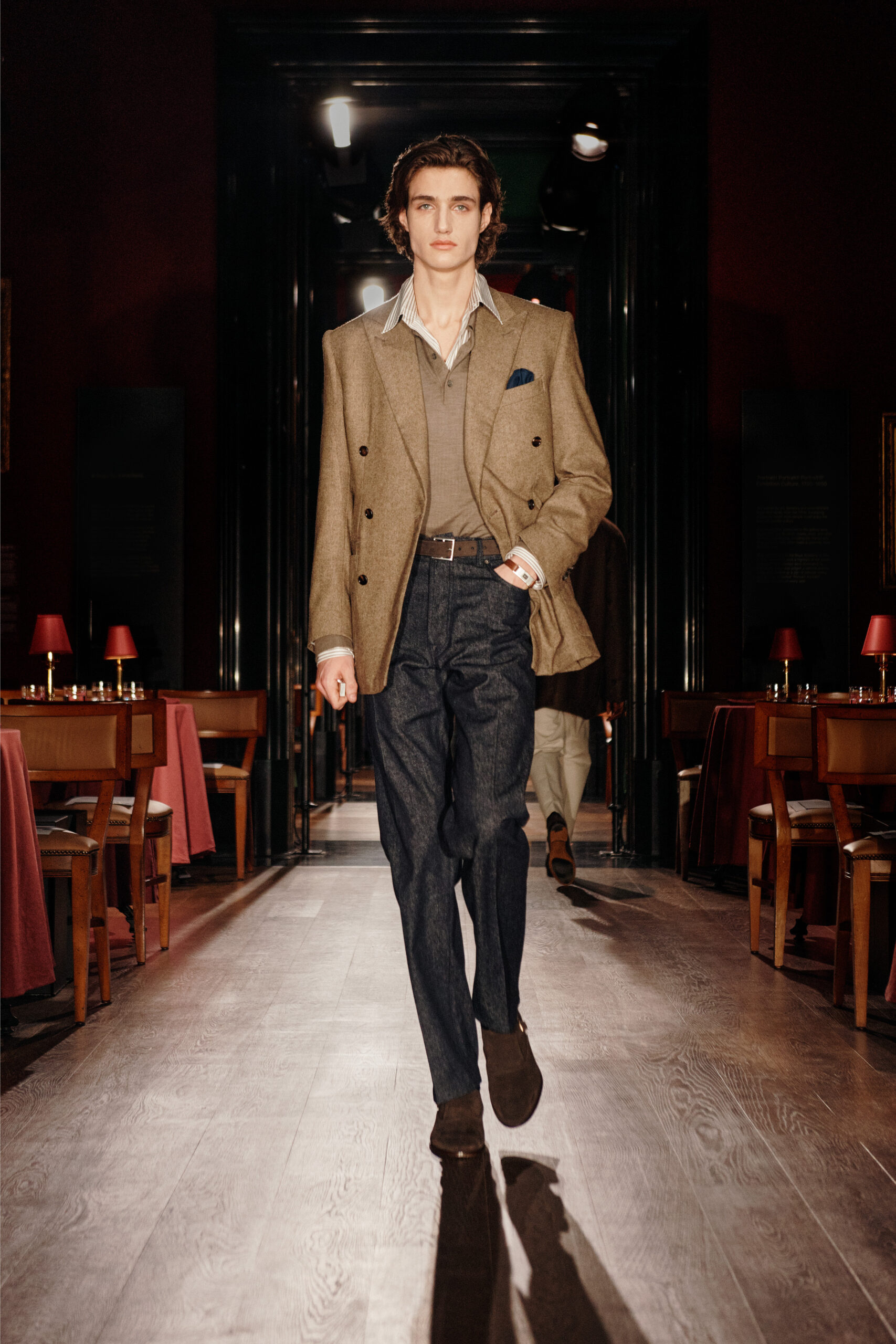 Les blazers élégants, portés de manière informelle avec des pantalons Gurkha en flanelle plissée, des chinos en gabardine, ou encore des pantalons cinq poches en denim de laine et coton, révèlent une silhouette Bourdon, du nom de la boutique phare dunhill de Bourdon House. Cette nouvelle coupe allie lignes anglaises épurées, revers assurés, et une construction légère, dévoilant des intérieurs non doublés et des épaules athlétiques.