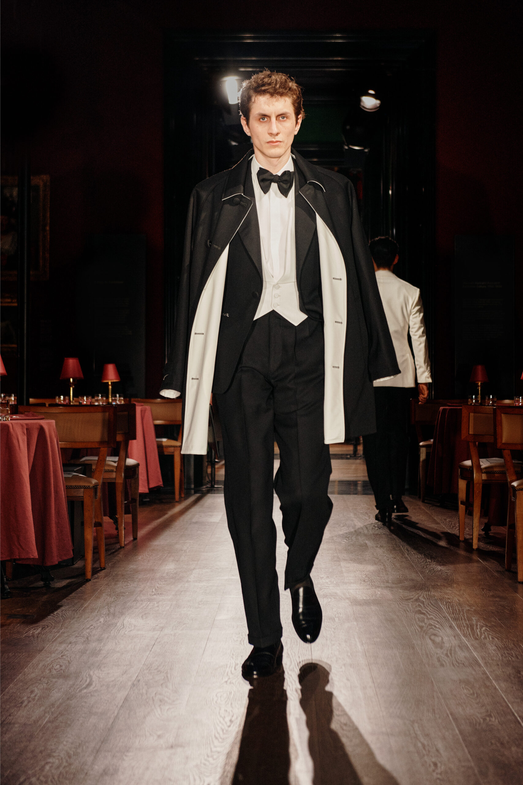 La quête de Holloway pour une excellence dans l’artisanat tailleur anglais se traduit par une offre de costumes sur mesure et de maroquinerie bespoke disponibles dans l’atelier londonien de dunhill, soulignant l’unicité de cette maison de luxe britannique. La collection, infusée d’un récit unique, se pare de tissus exclusivement développés dans les moulins patrimoniaux du Yorkshire, du Sussex, de Somerset et de Biella, offrant une gamme étendue de costumes deux ou trois pièces, de manteaux haut de gamme et de tenues formelles. Des costumes de soirée en velours côtoient des smokings trois pièces, évoquant une formalité décontractée.