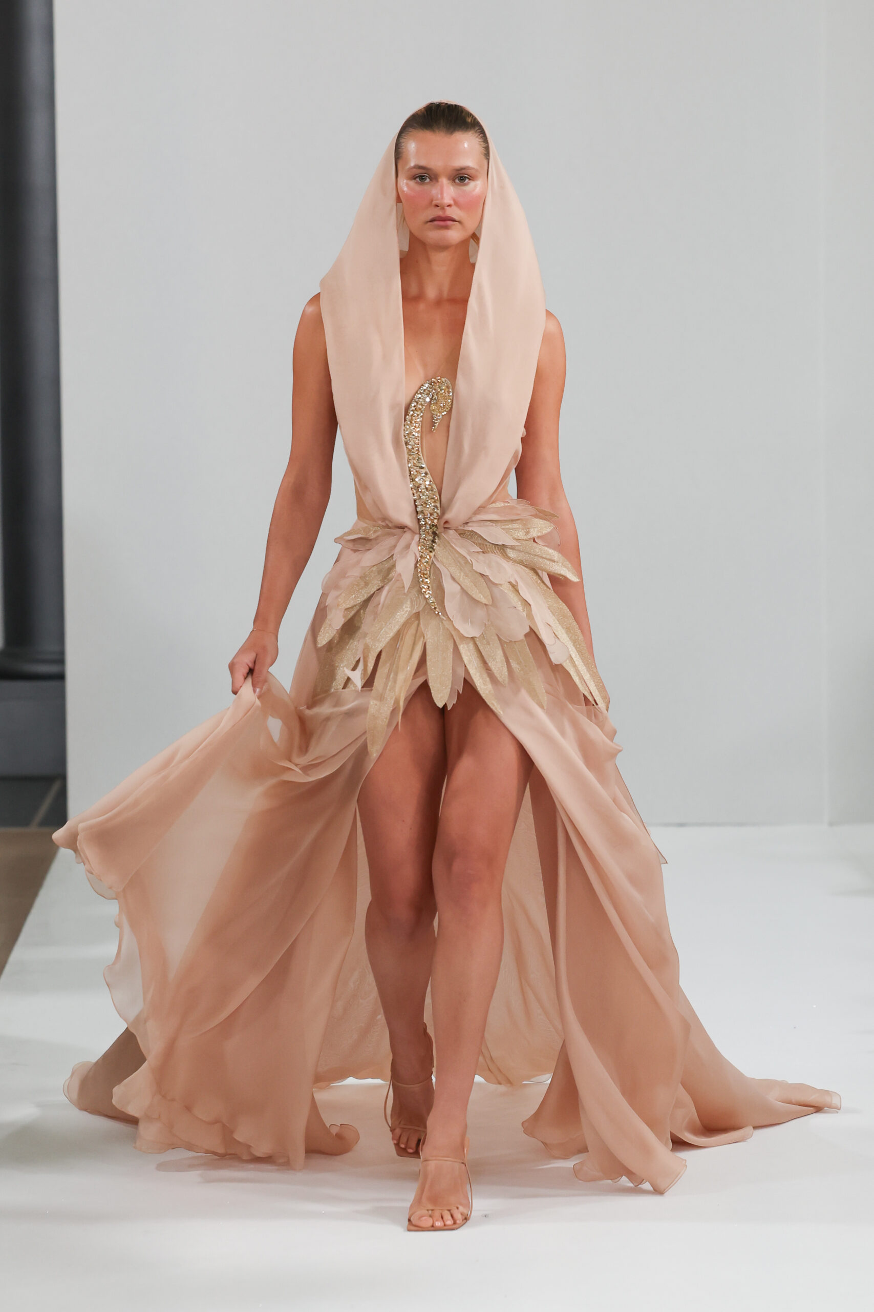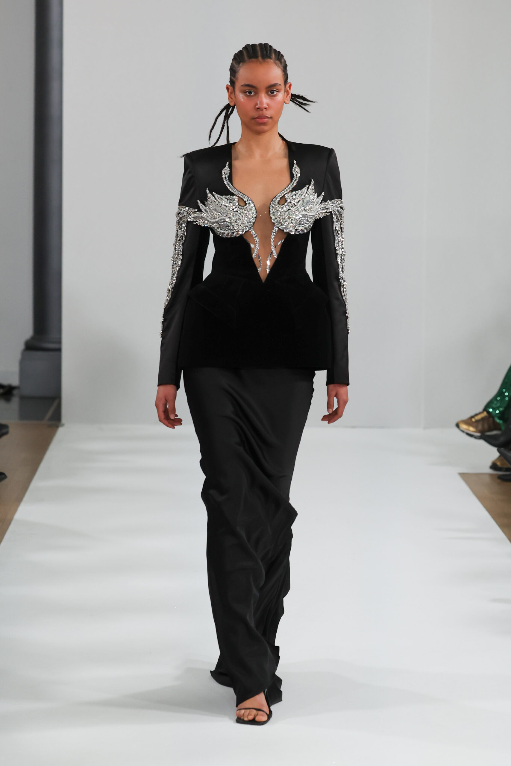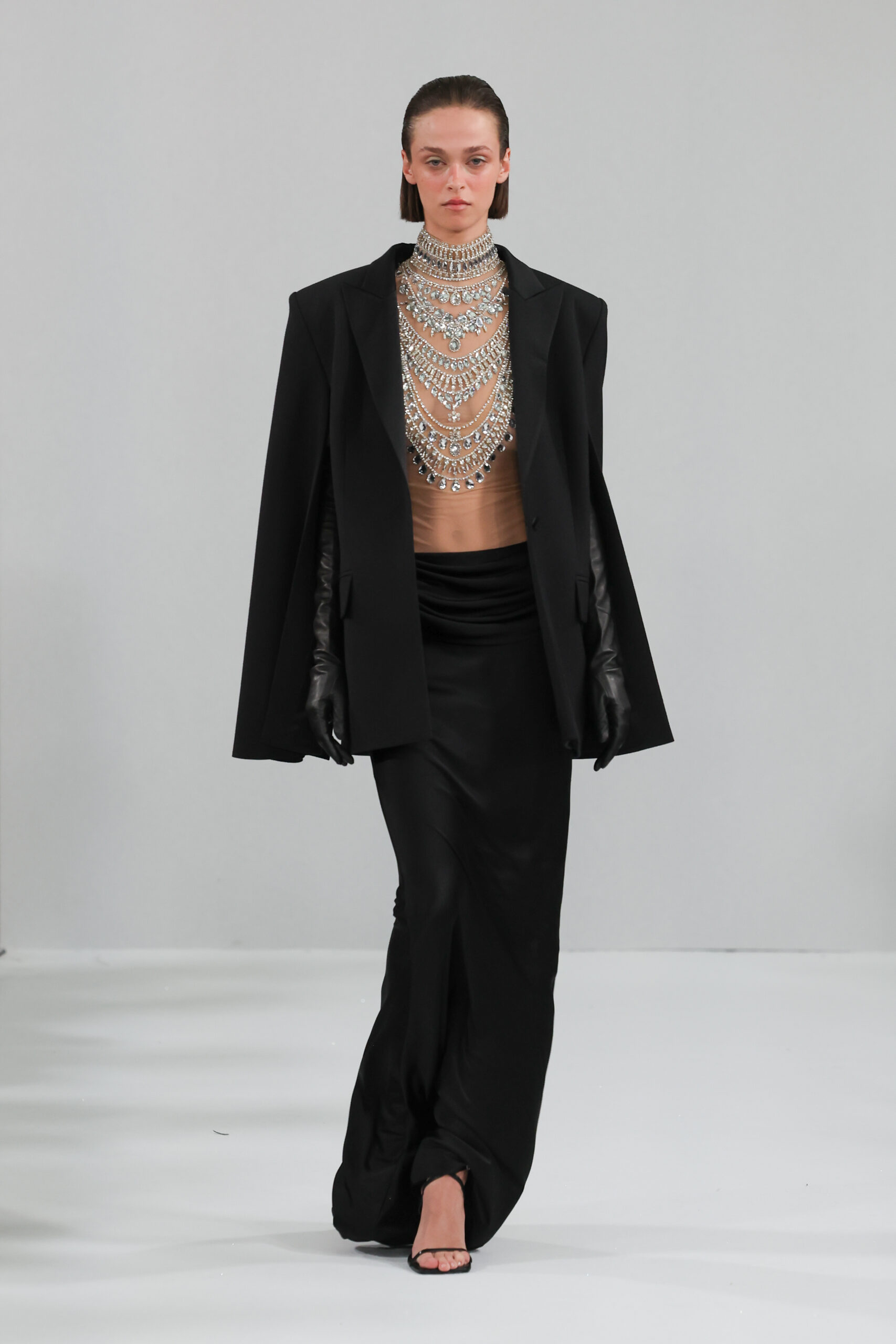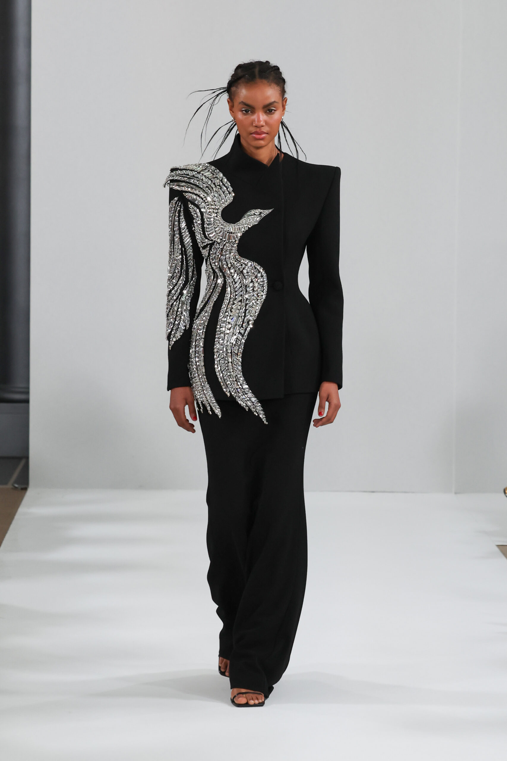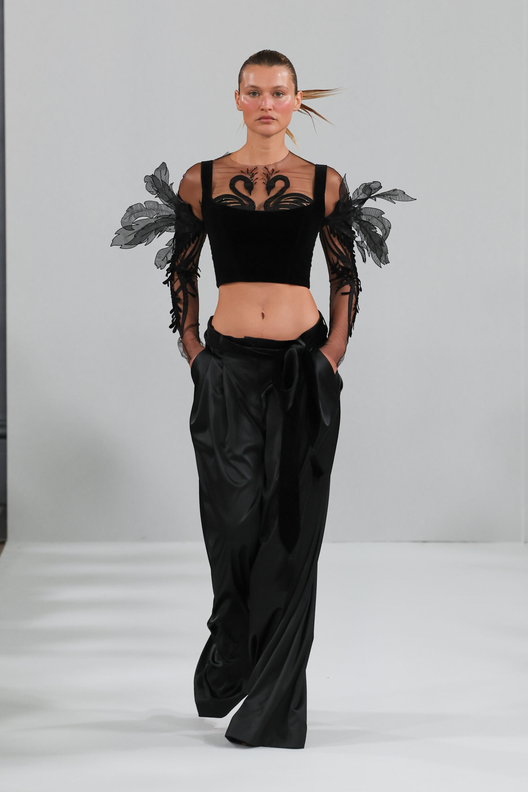 YANINA Couture reste fidèle à son héritage en utilisant des tissus traditionnels tels que le velours, la mousseline de soie et l’organza, tout en introduisant des innovations, notamment dans les techniques de broderie de plumes. Les silhouettes, qui épousent les formes féminines, sont mises en valeur par des tailleurs noirs stricts et ajustés, des robes élégantes et des manteaux à plumes uniques, témoignant d’une maîtrise artisanale exceptionnelle.
