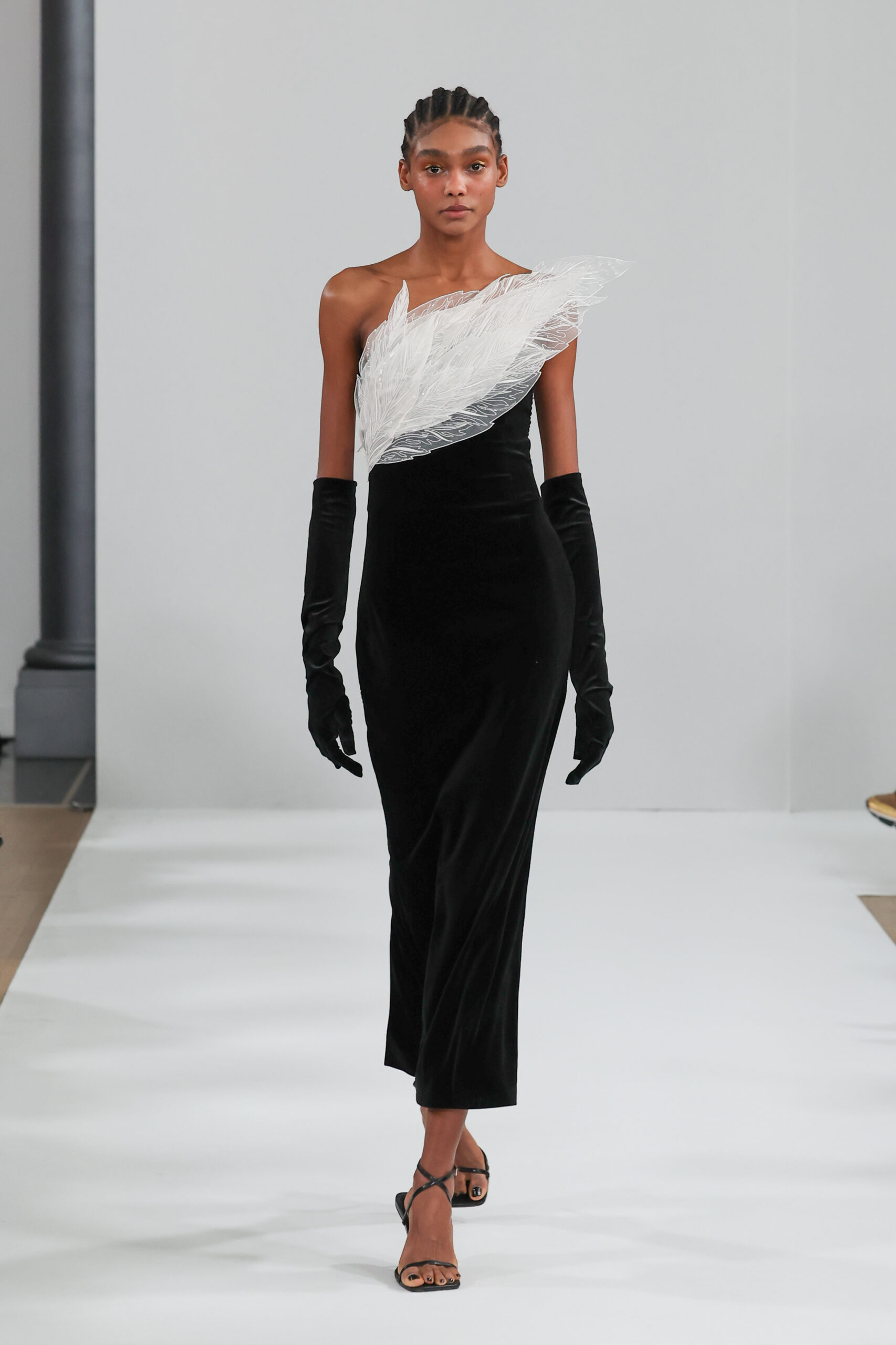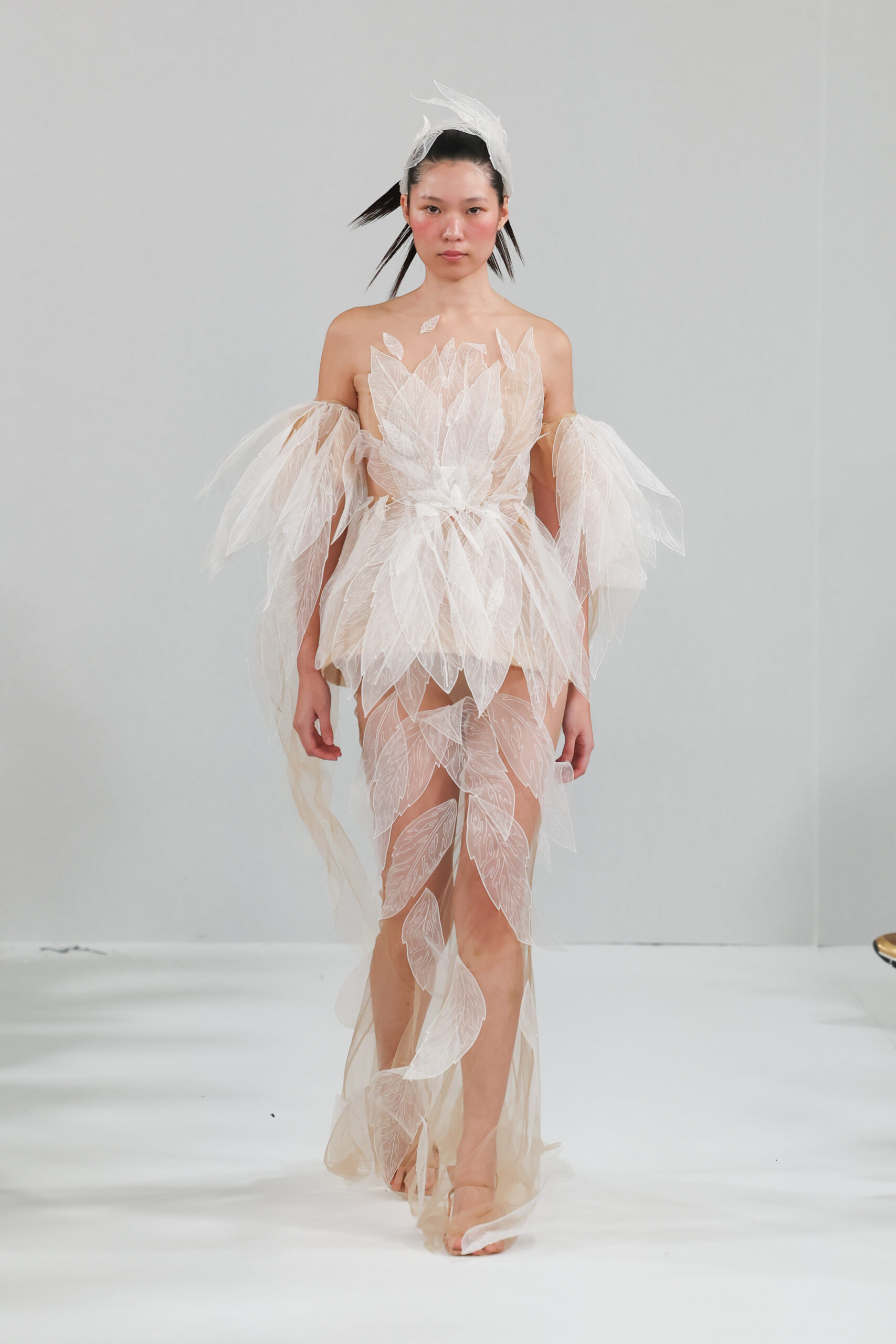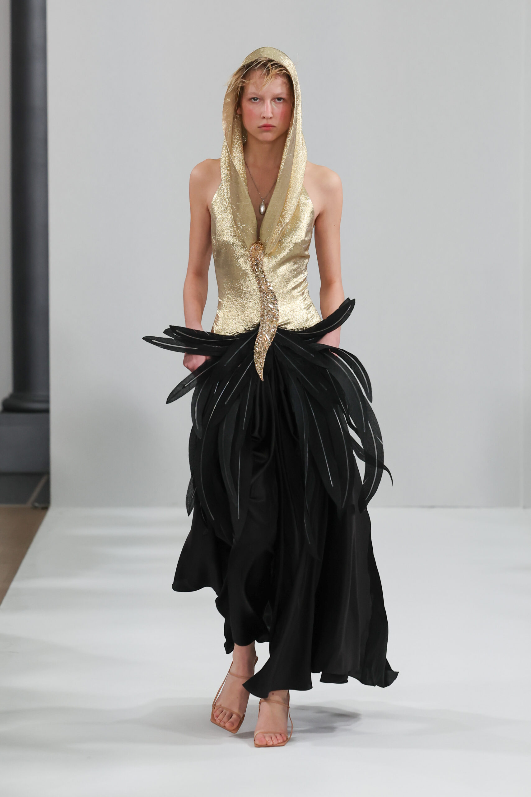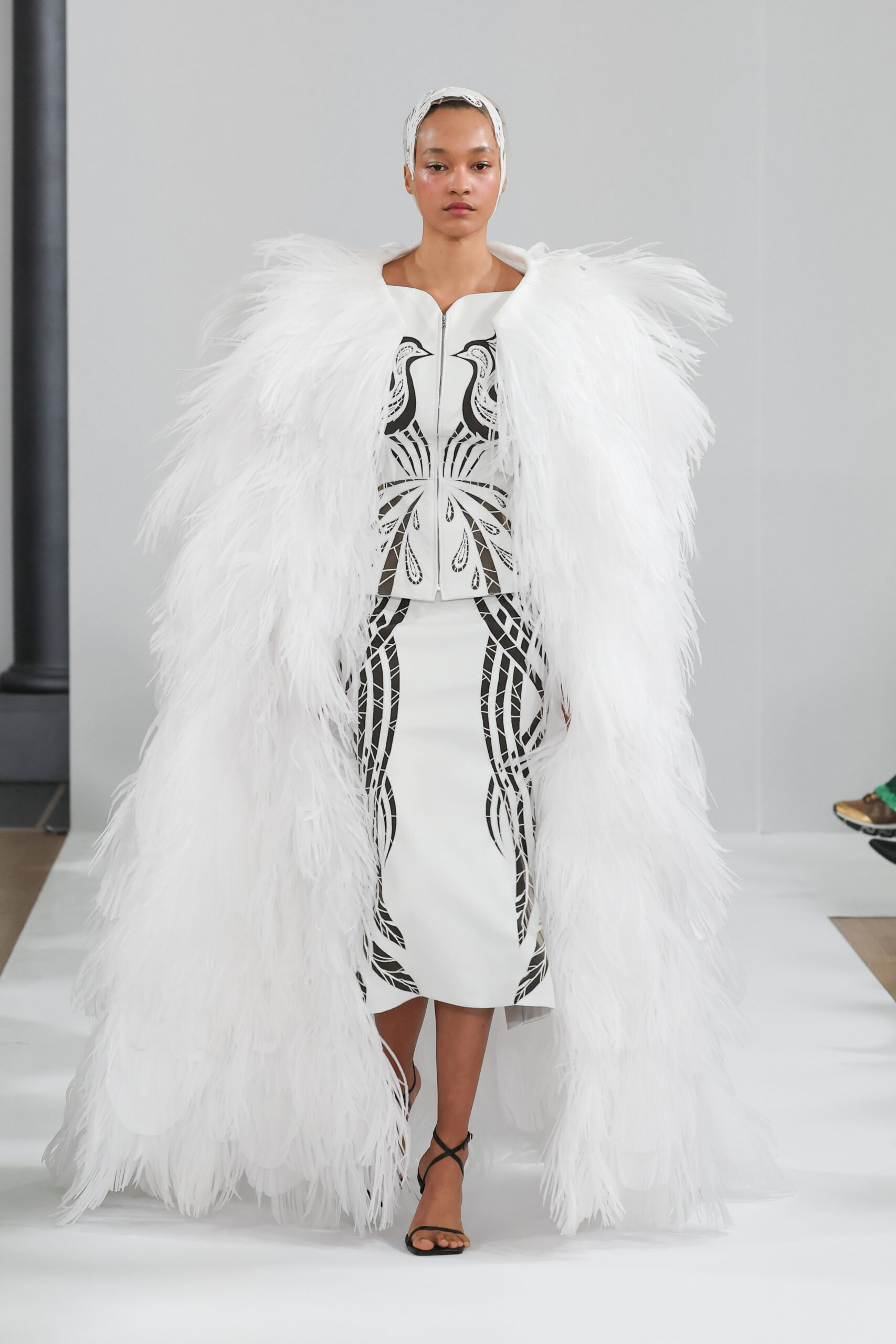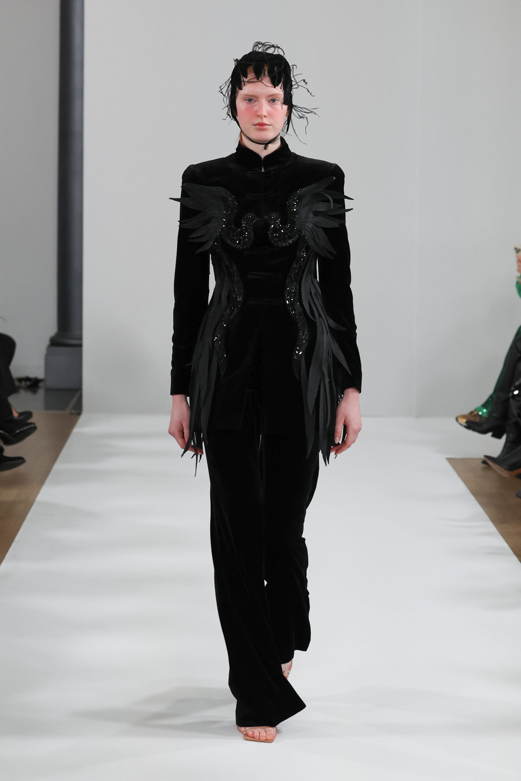 YANINA Couture reste fidèle à son héritage en utilisant des tissus traditionnels tels que le velours, la mousseline de soie et l’organza, tout en introduisant des innovations, notamment dans les techniques de broderie de plumes. Les silhouettes, qui épousent les formes féminines, sont mises en valeur par des tailleurs noirs stricts et ajustés, des robes élégantes et des manteaux à plumes uniques, témoignant d’une maîtrise artisanale exceptionnelle.