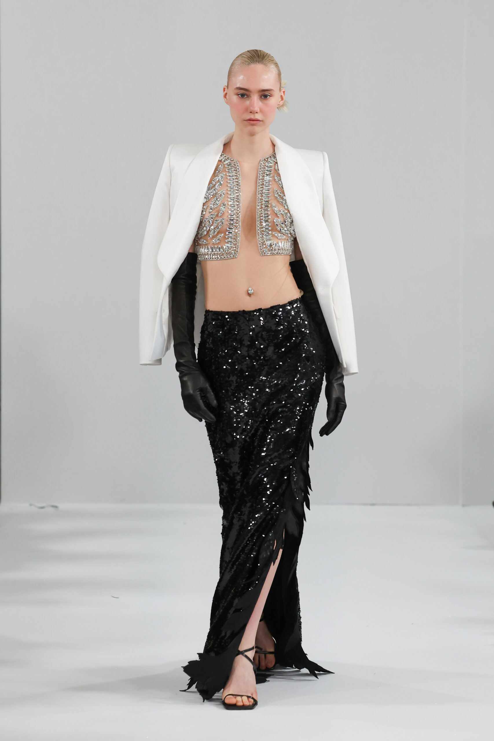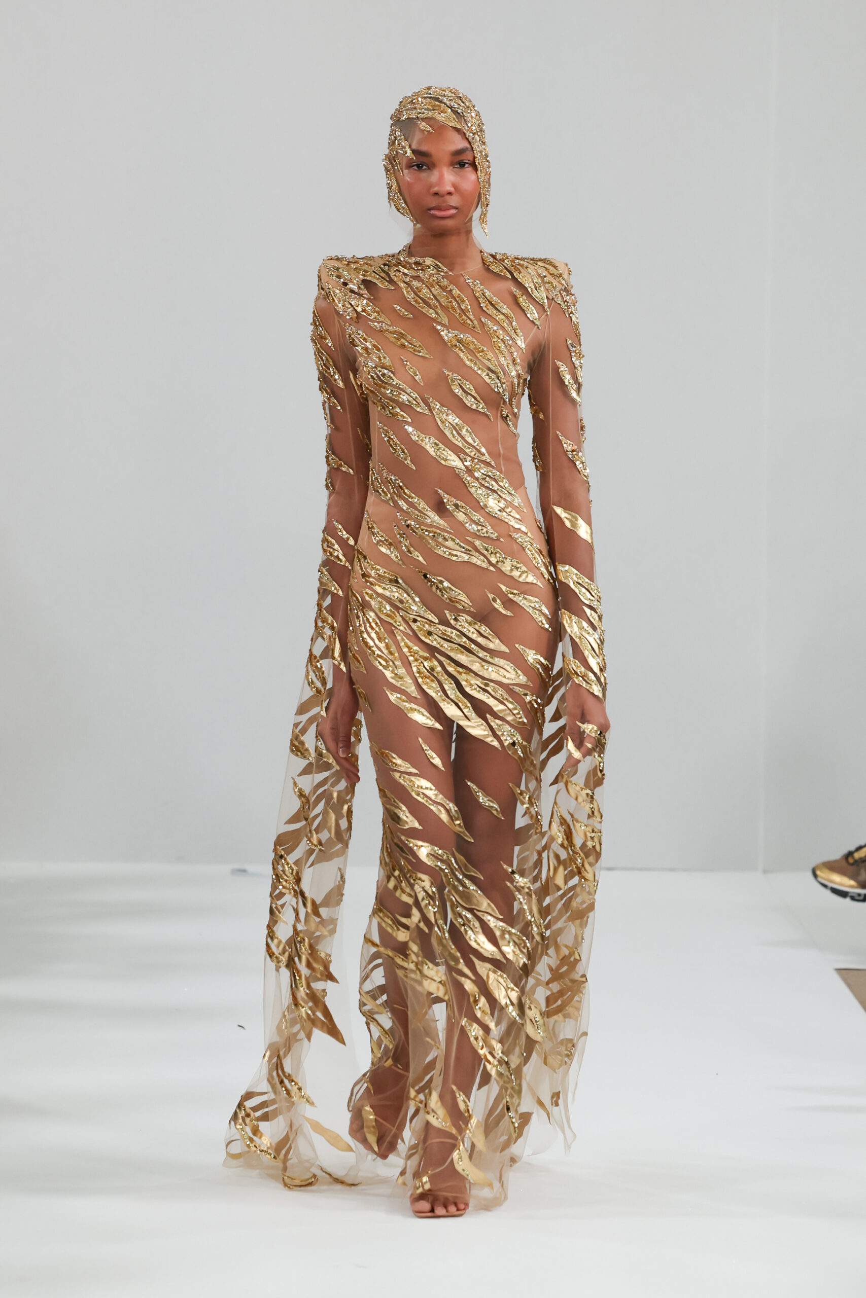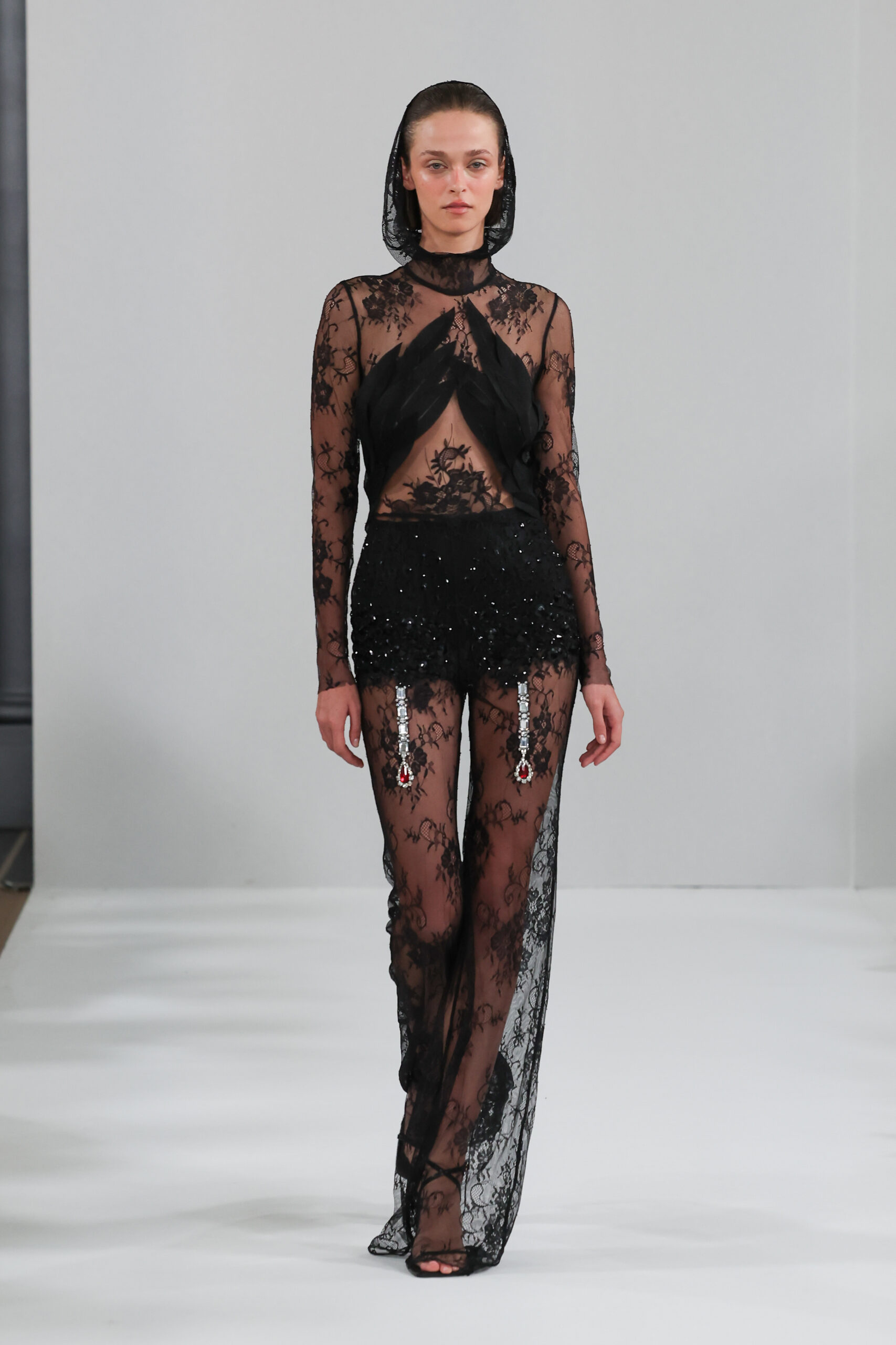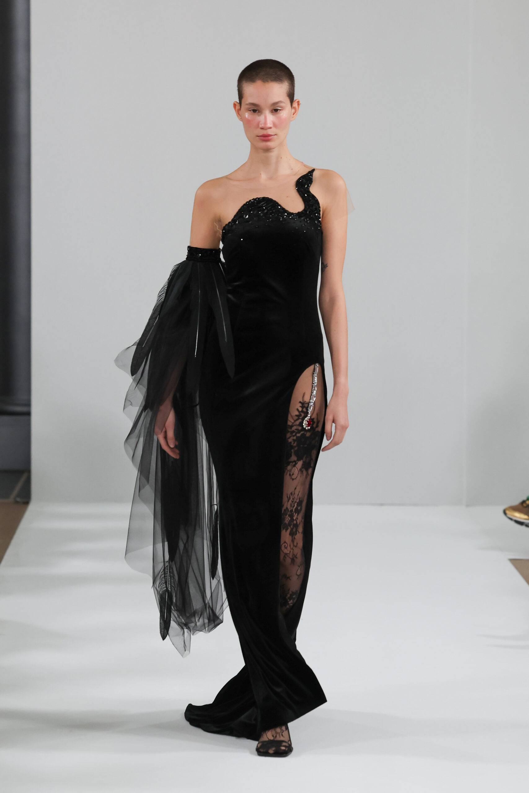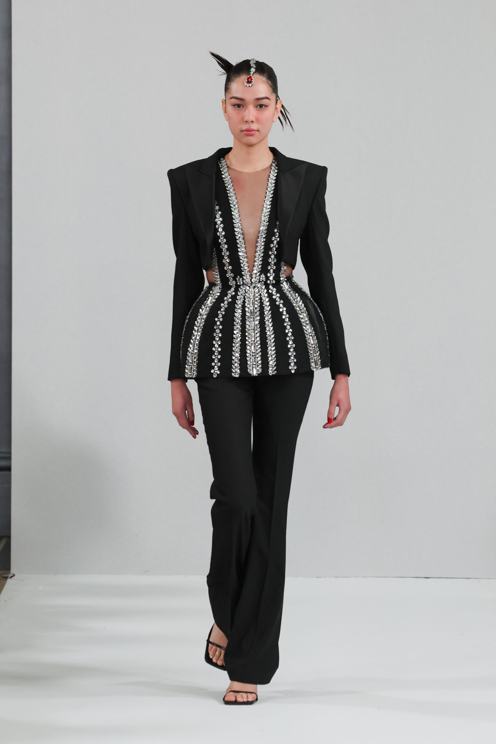 YANINA Couture reste fidèle à son héritage en utilisant des tissus traditionnels tels que le velours, la mousseline de soie et l’organza, tout en introduisant des innovations, notamment dans les techniques de broderie de plumes. Les silhouettes, qui épousent les formes féminines, sont mises en valeur par des tailleurs noirs stricts et ajustés, des robes élégantes et des manteaux à plumes uniques, témoignant d’une maîtrise artisanale exceptionnelle.