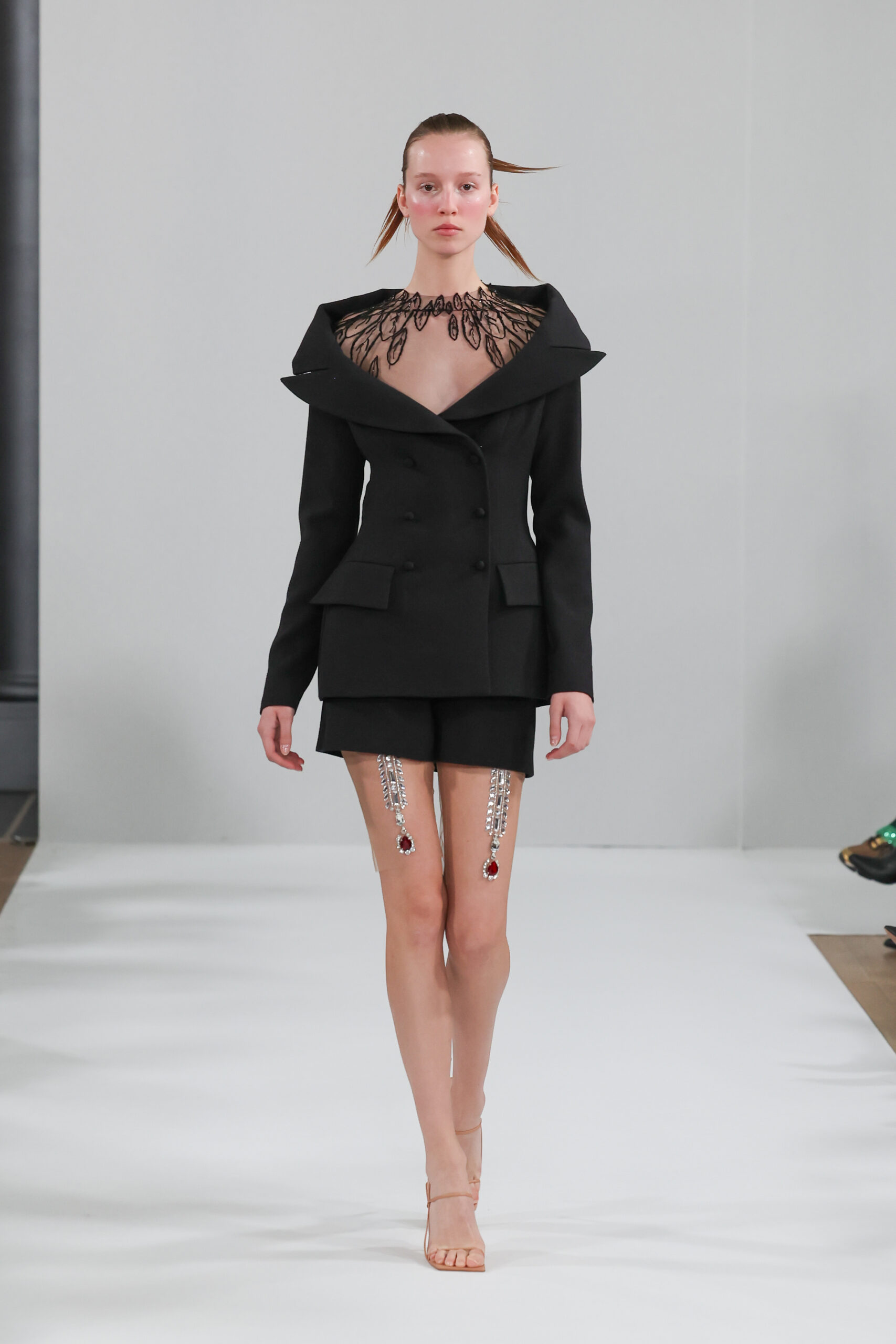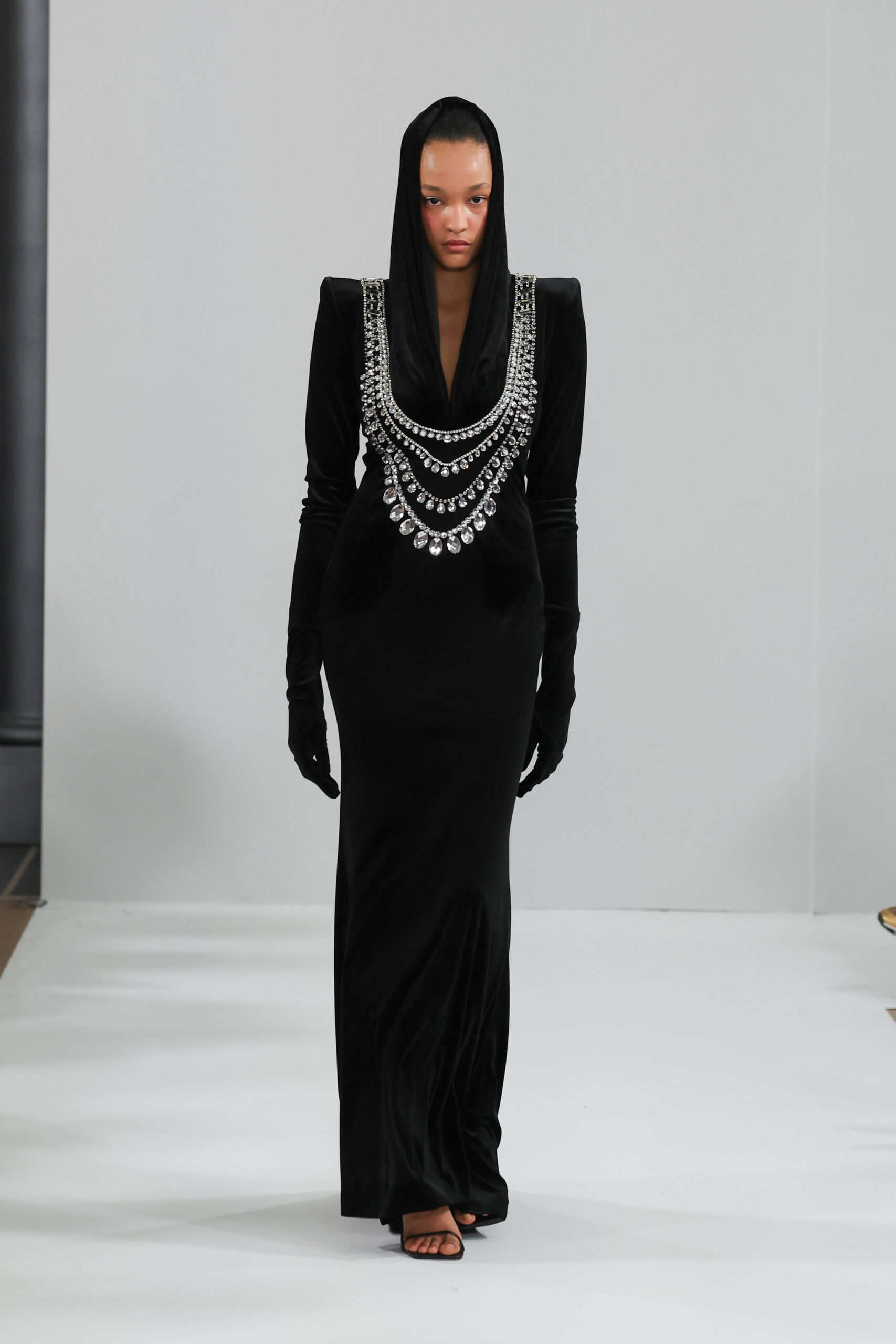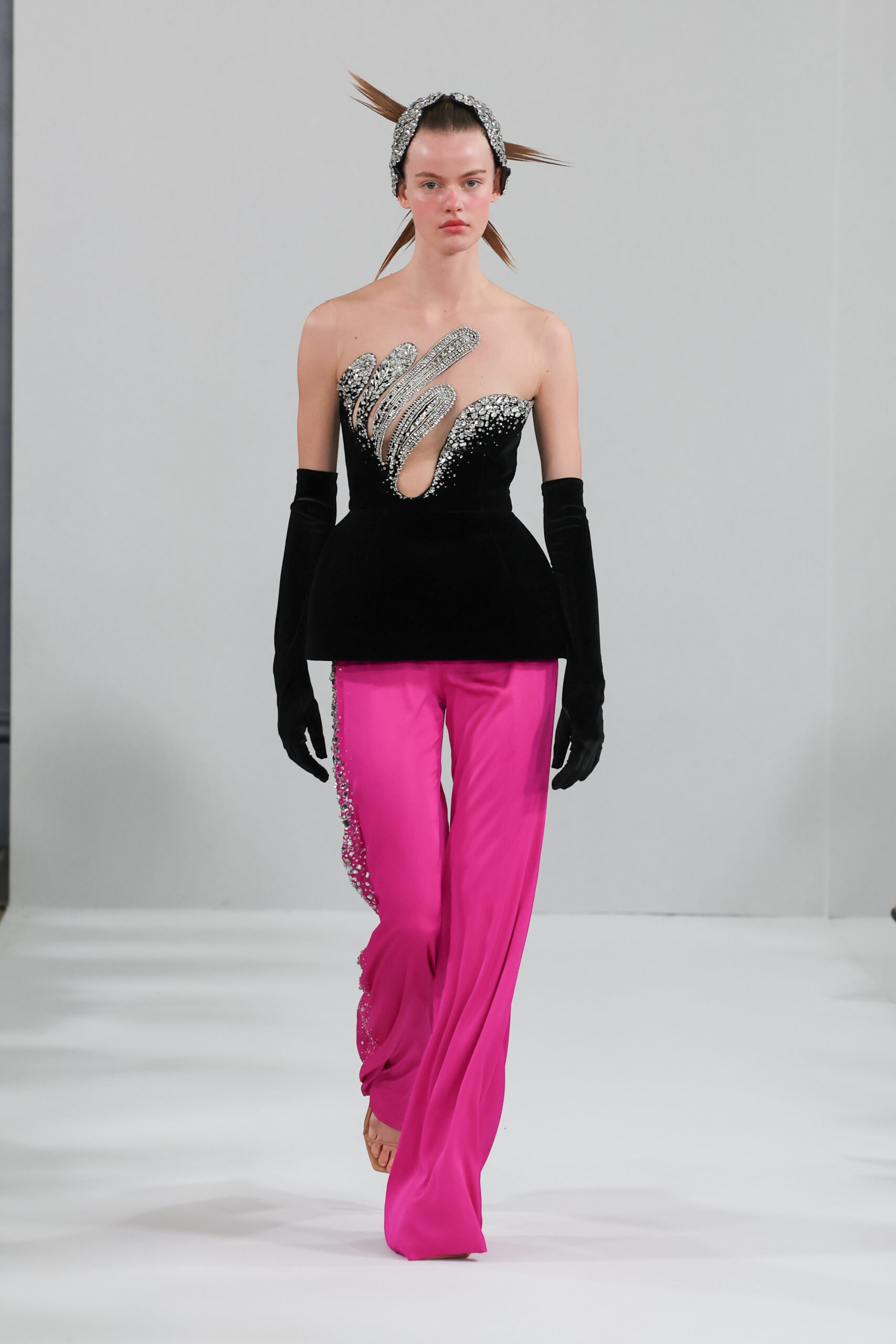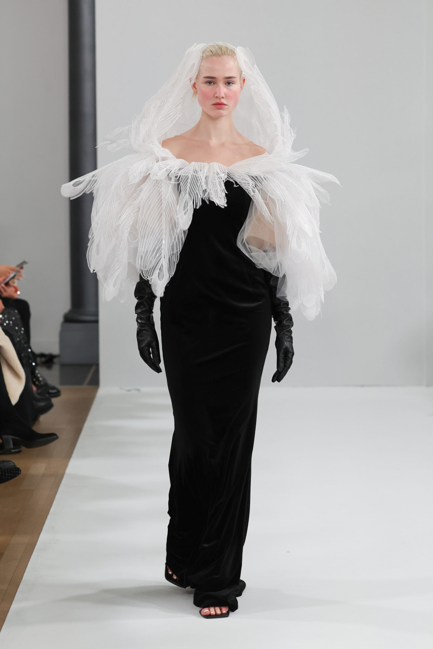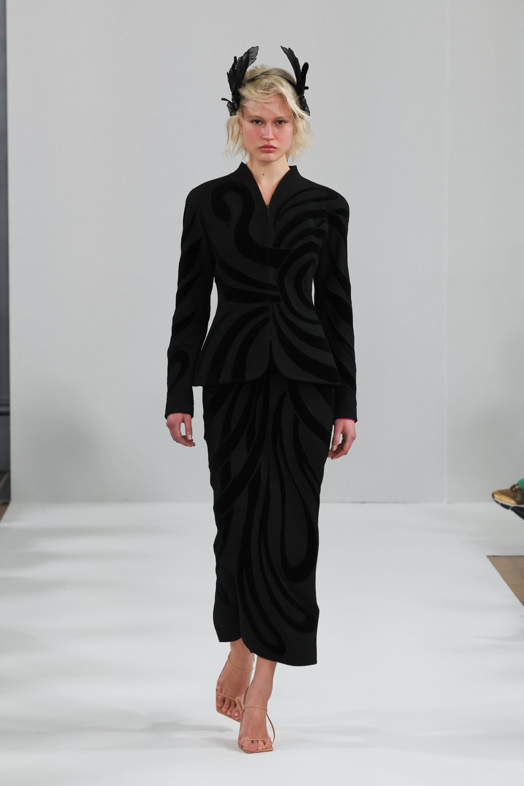 YANINA Couture reste fidèle à son héritage en utilisant des tissus traditionnels tels que le velours, la mousseline de soie et l’organza, tout en introduisant des innovations, notamment dans les techniques de broderie de plumes. Les silhouettes, qui épousent les formes féminines, sont mises en valeur par des tailleurs noirs stricts et ajustés, des robes élégantes et des manteaux à plumes uniques, témoignant d’une maîtrise artisanale exceptionnelle.